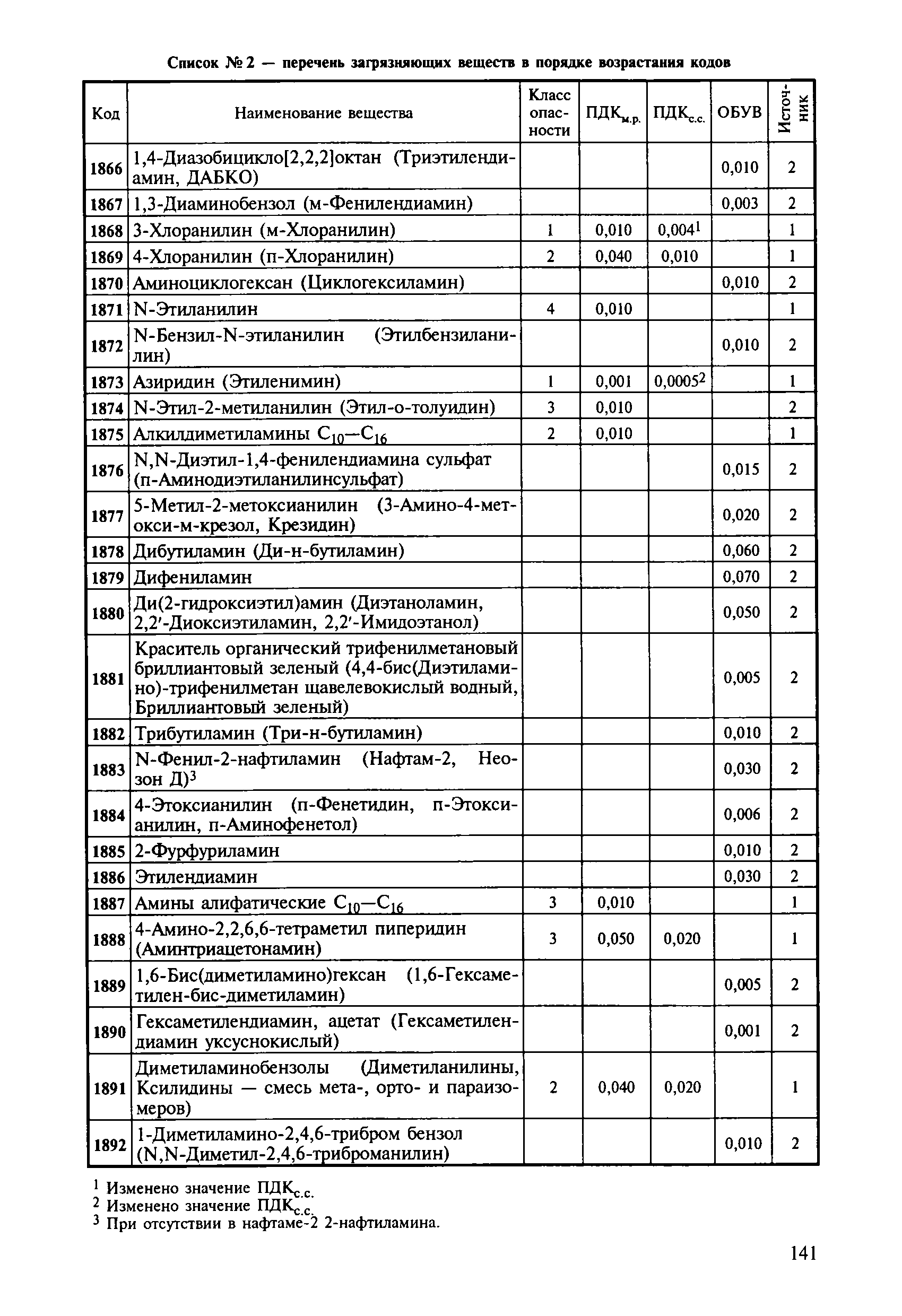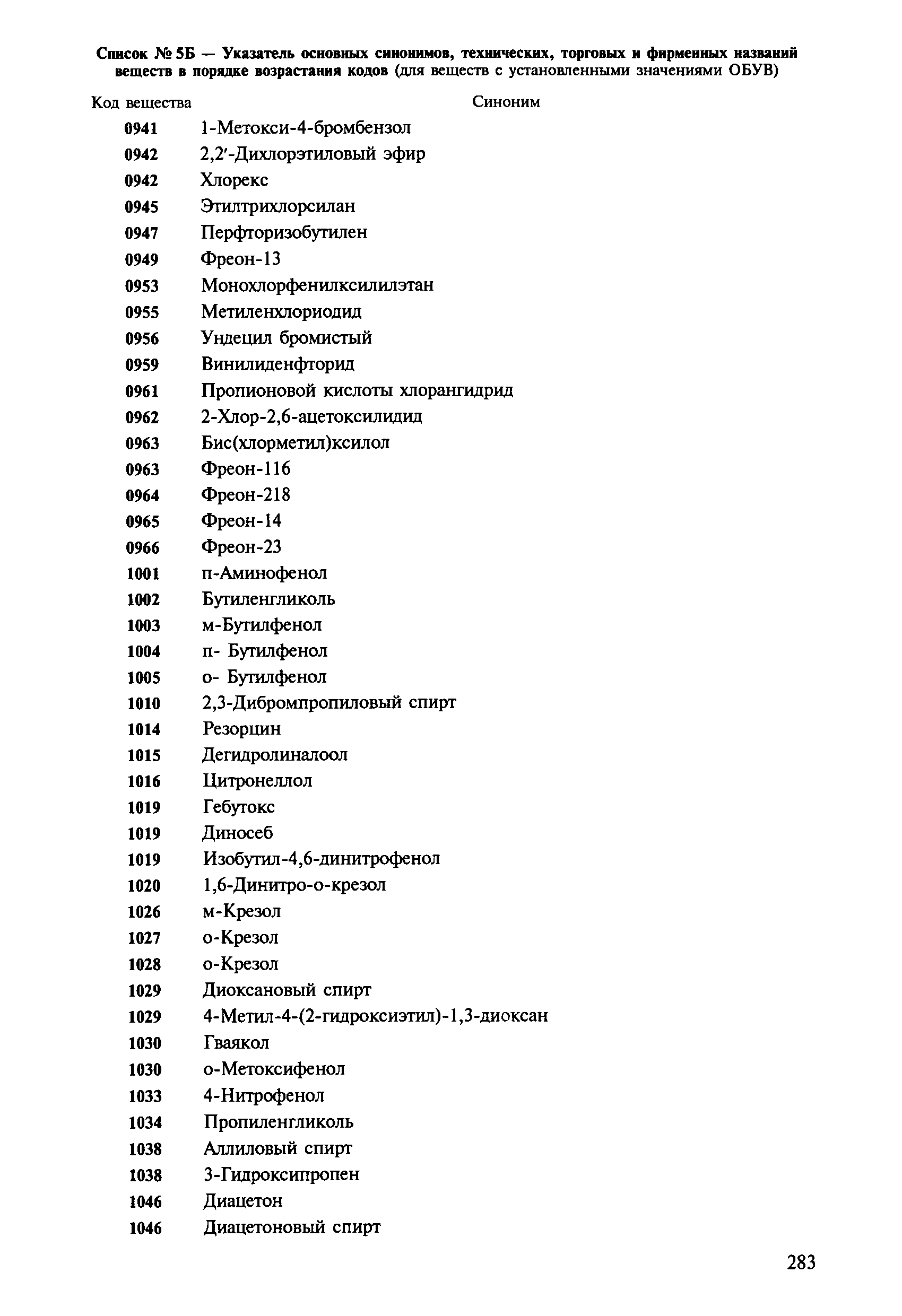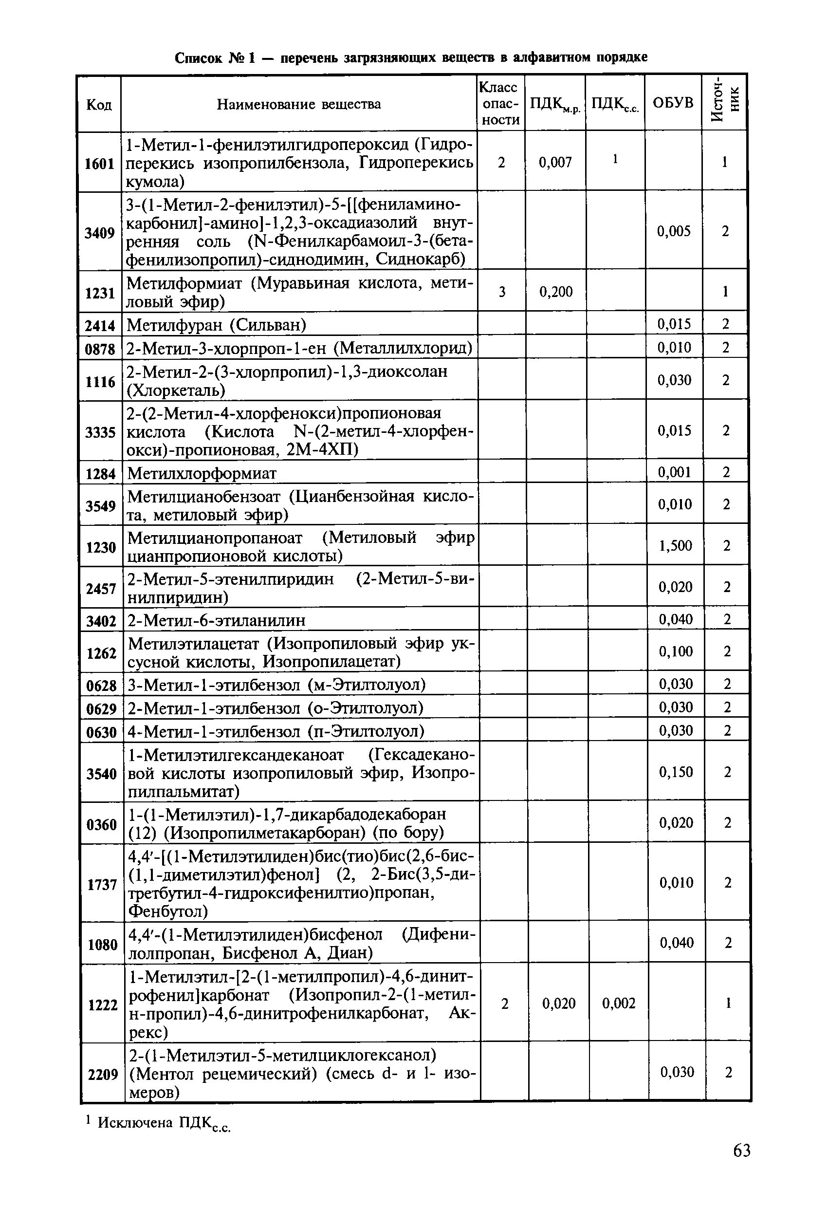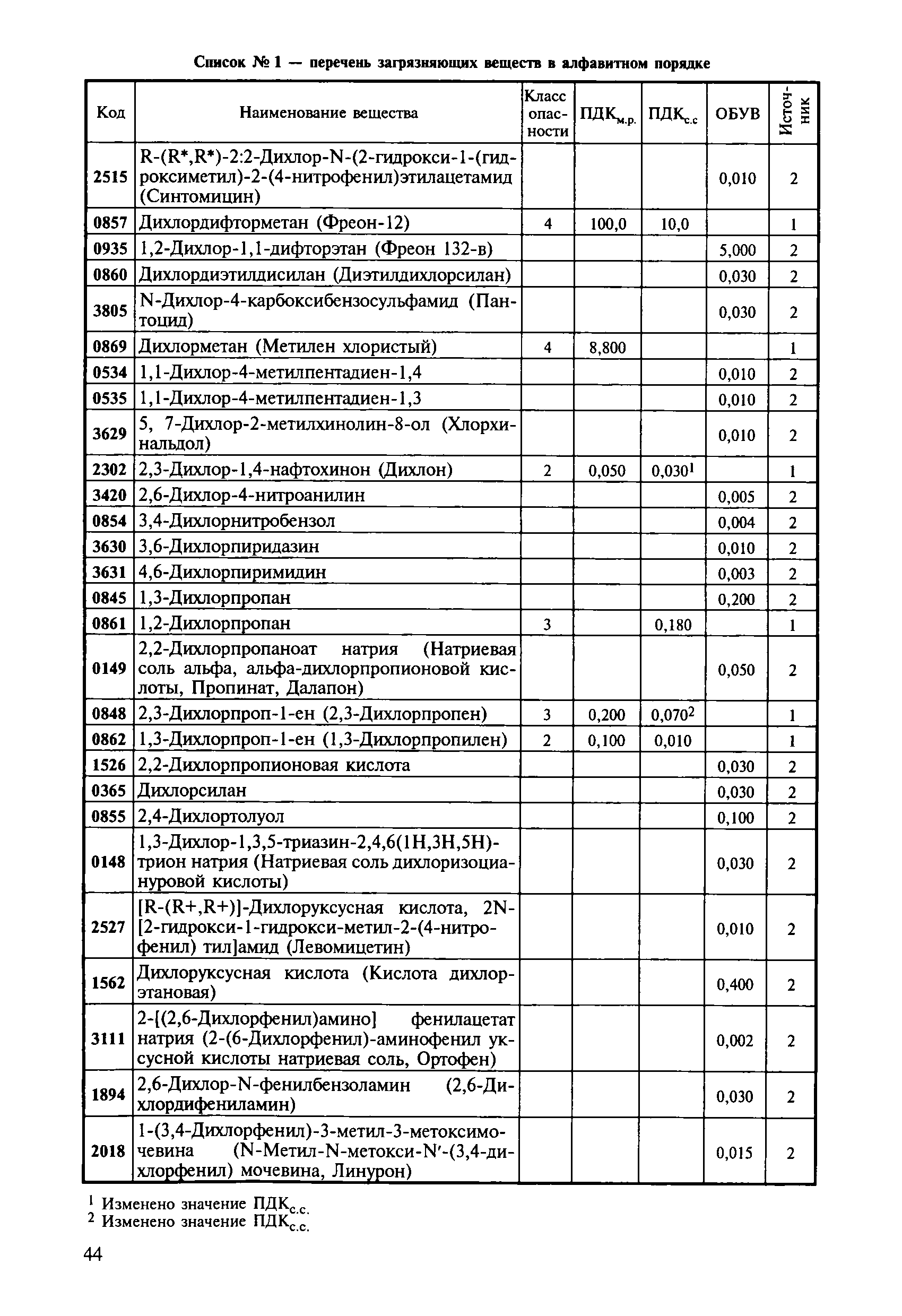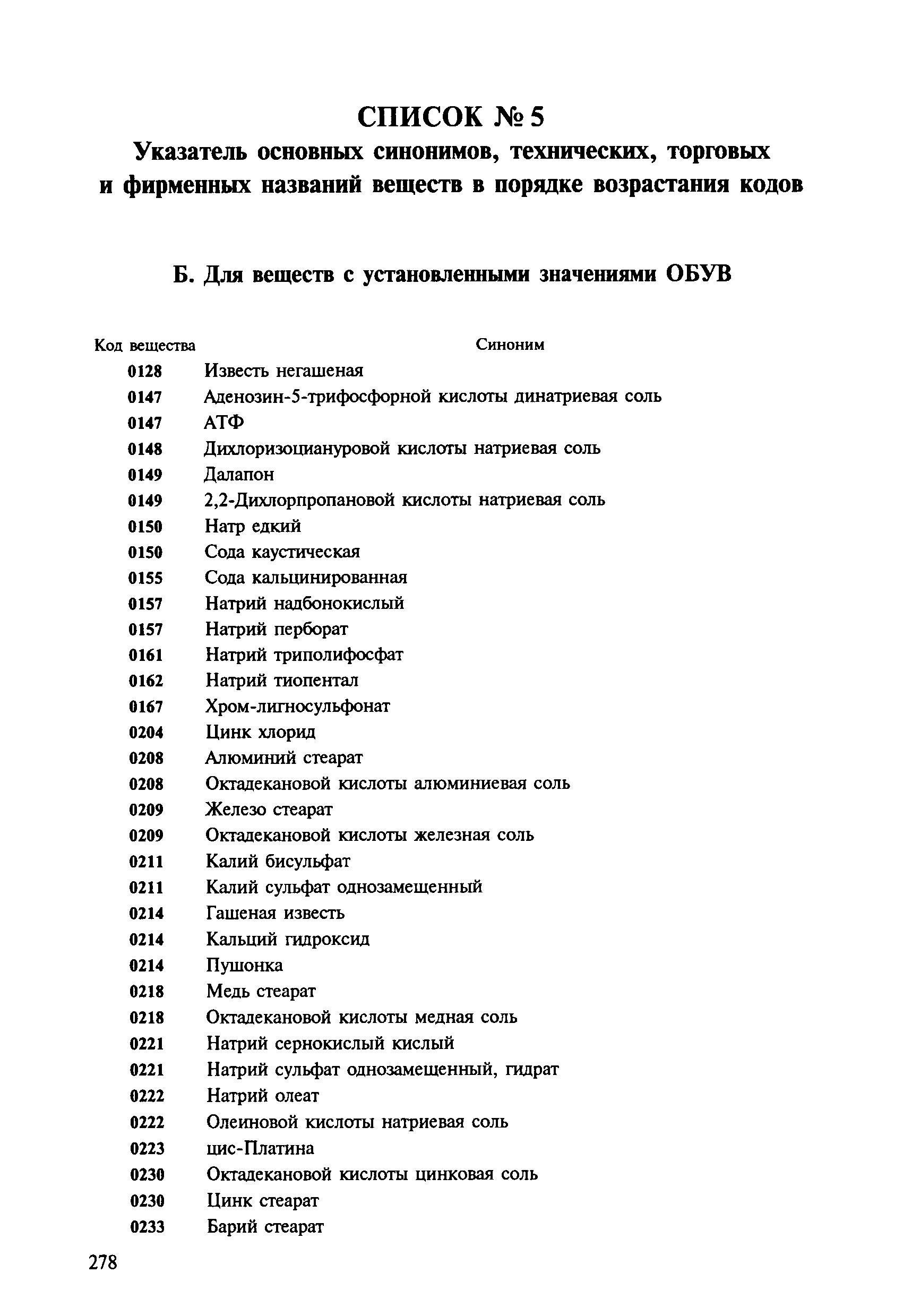 | Оглавление: | Список № 1 Перечень загрязняющих веществ в алфавитном порядке Список № 2 Перечень загрязняющих веществ в порядке возрастания кодов Список № 3 Перечень ЛОС в порядке возрастания кодов Список № 4 Указатель основных синонимов, технических, торговых и фирменных названий веществ в алфавитном порядке А. Для веществ с установленными значениями ПДК Б. Для веществ с установленными значениями ОБУВ Список № 5 Указатель основных синонимов, технических, торговых и фирменных названий веществ в порядке возрастания кодов А. Для веществ с установленными значениями ПДК Б. Для веществ с установленными значениями ОБУВ |