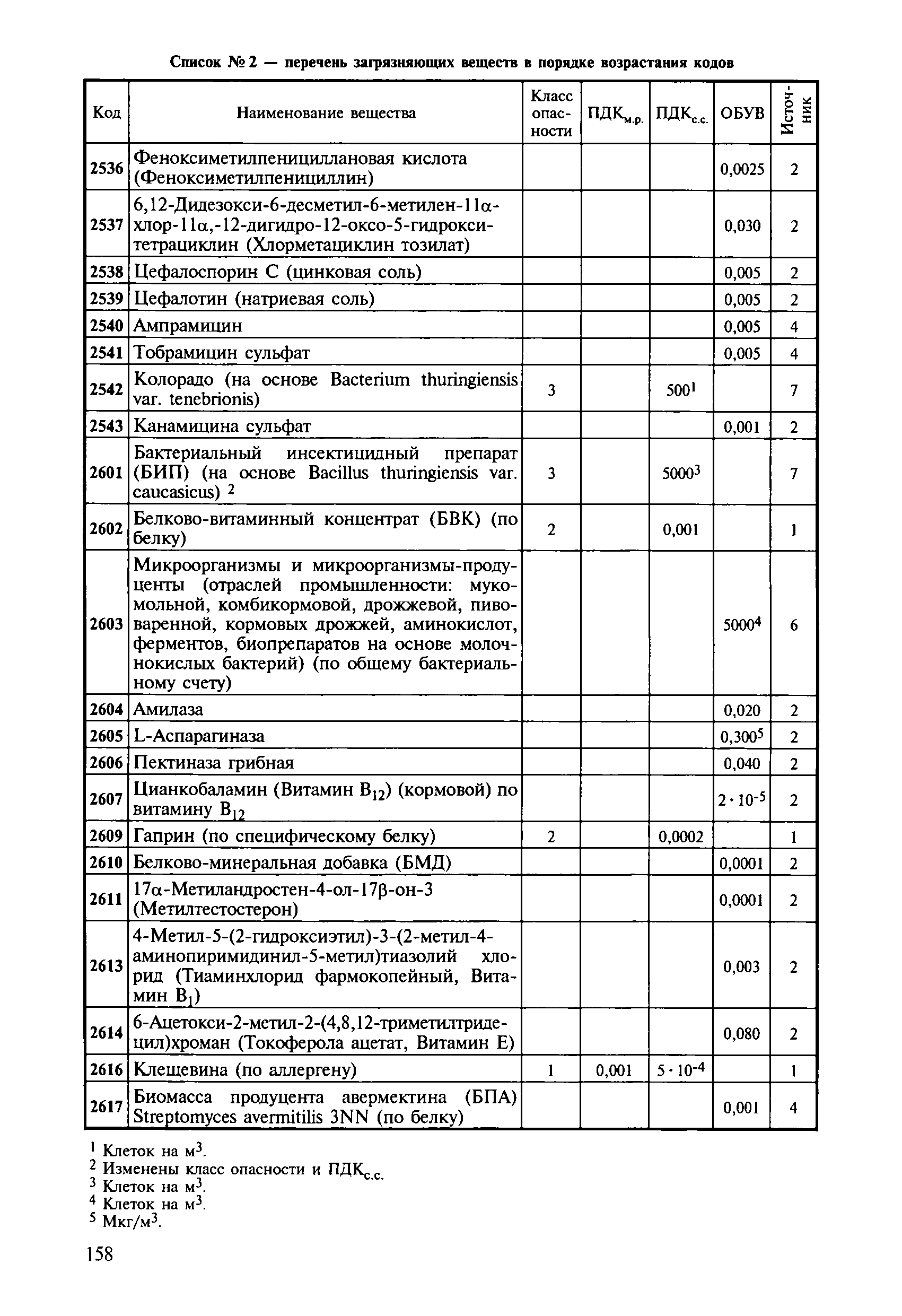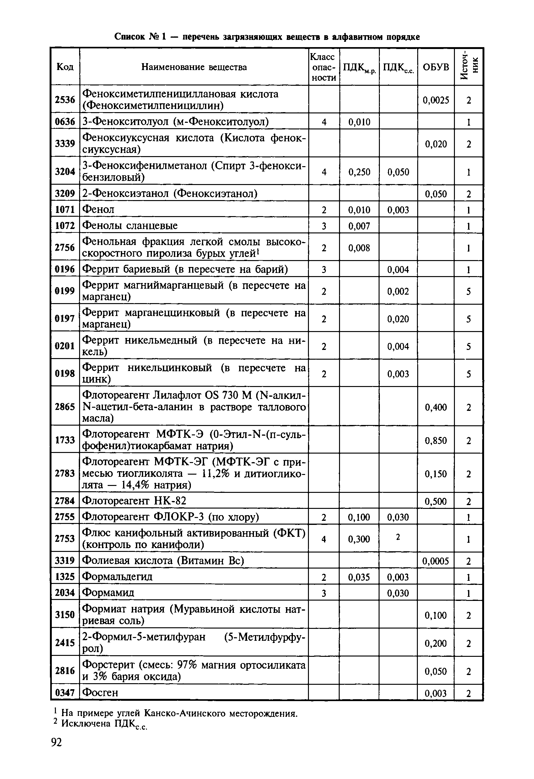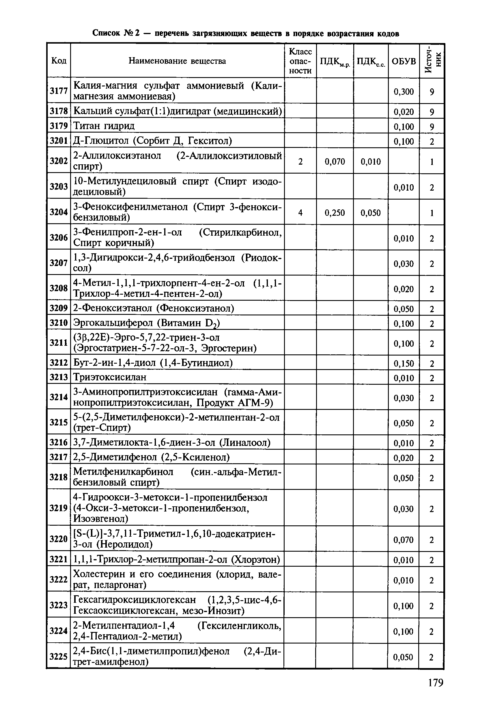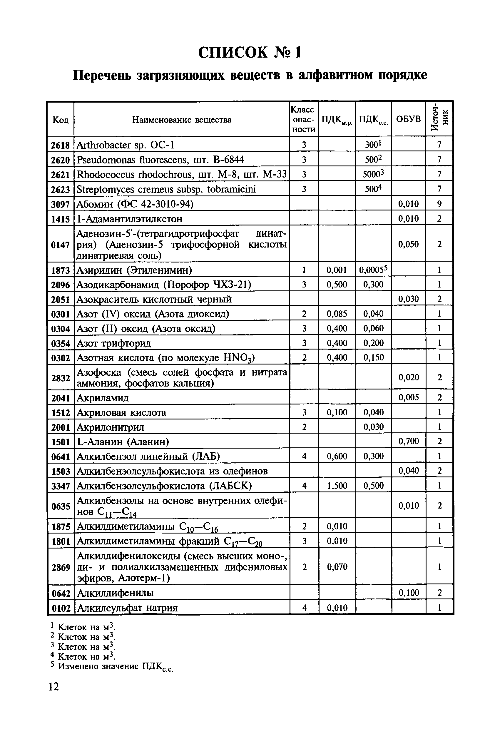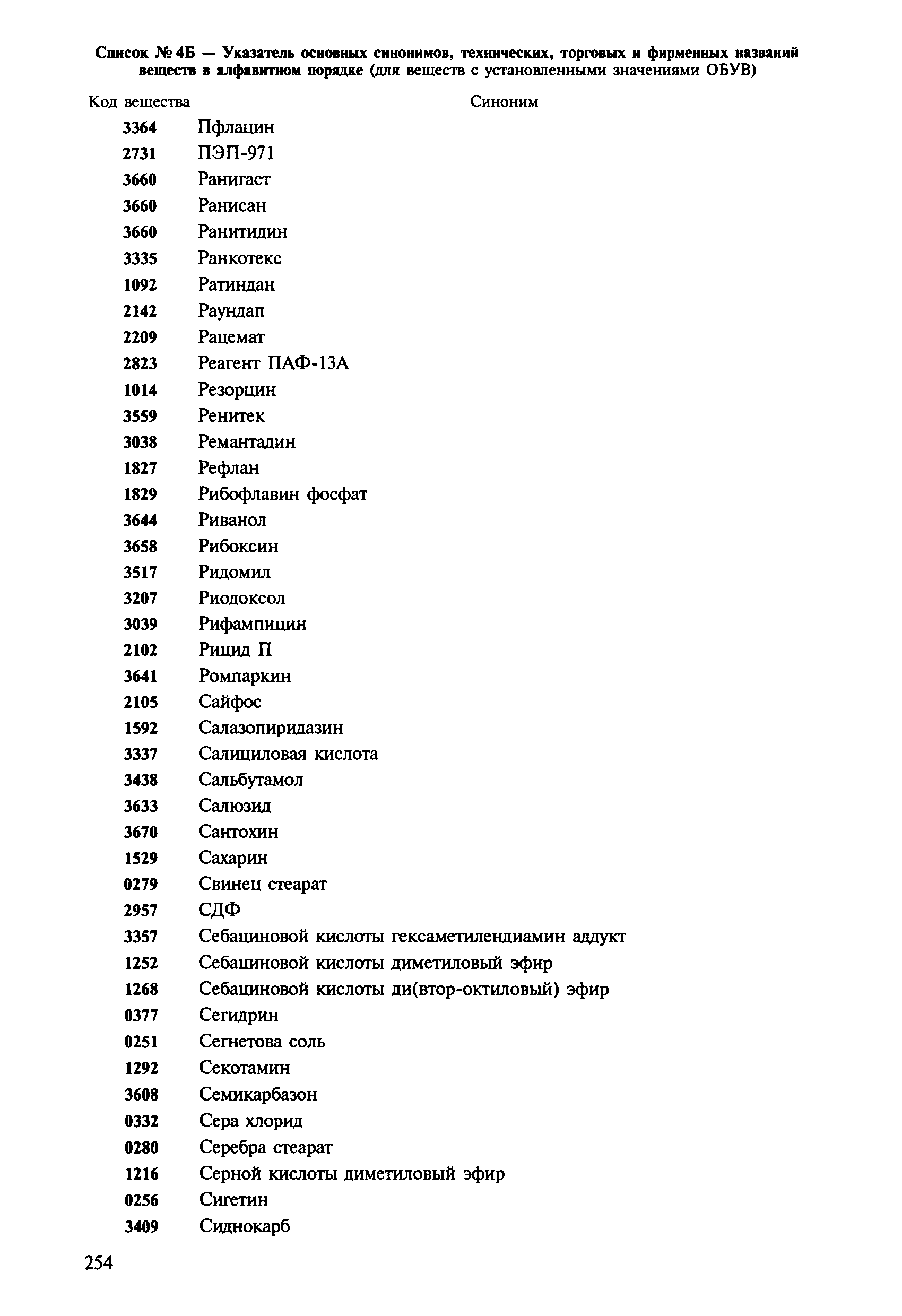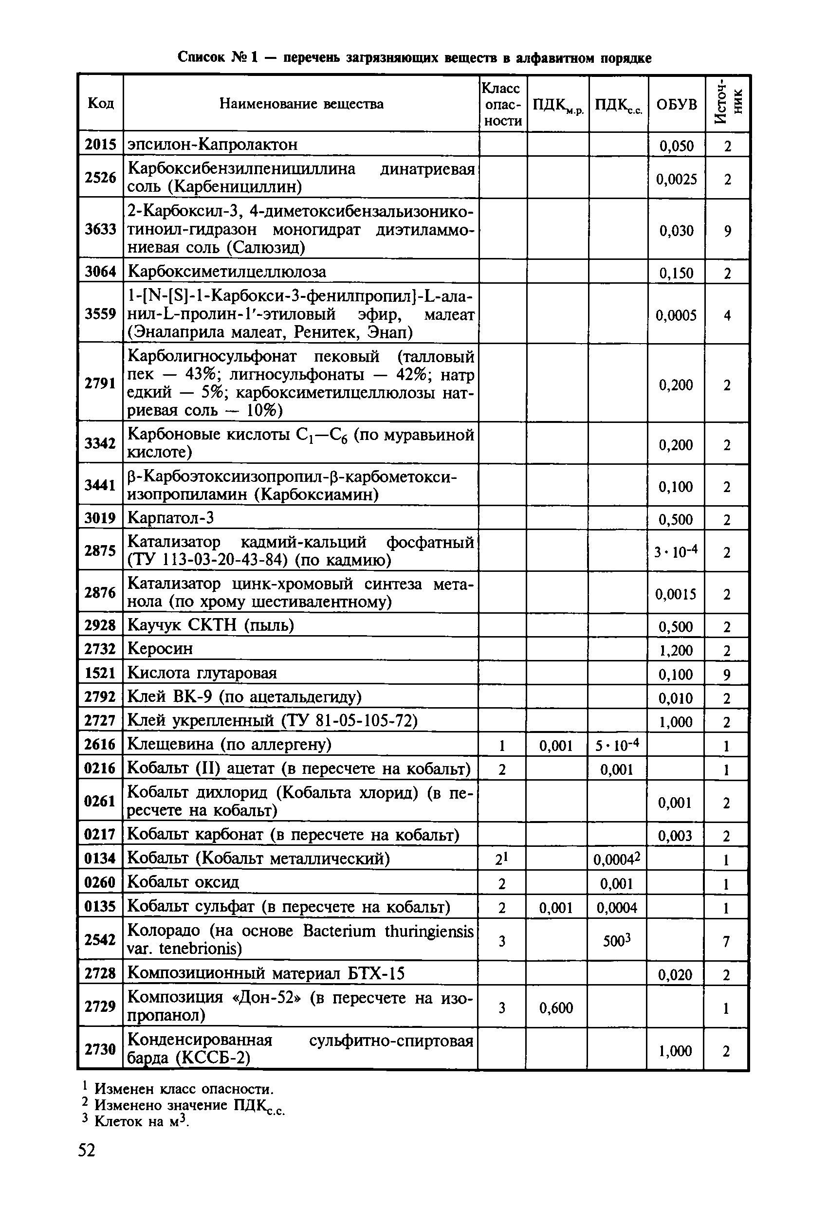 | Оглавление: | Список № 1 Перечень загрязняющих веществ в алфавитном порядке Список № 2 Перечень загрязняющих веществ в порядке возрастания кодов Список № 3 Перечень ЛОС в порядке возрастания кодов Список № 4 Указатель основных синонимов, технических, торговых и фирменных названий веществ в алфавитном порядке А. Для веществ с установленными значениями ПДК Б. Для веществ с установленными значениями ОБУВ Список № 5 Указатель основных синонимов, технических, торговых и фирменных названий веществ в порядке возрастания кодов А. Для веществ с установленными значениями ПДК Б. Для веществ с установленными значениями ОБУВ |
