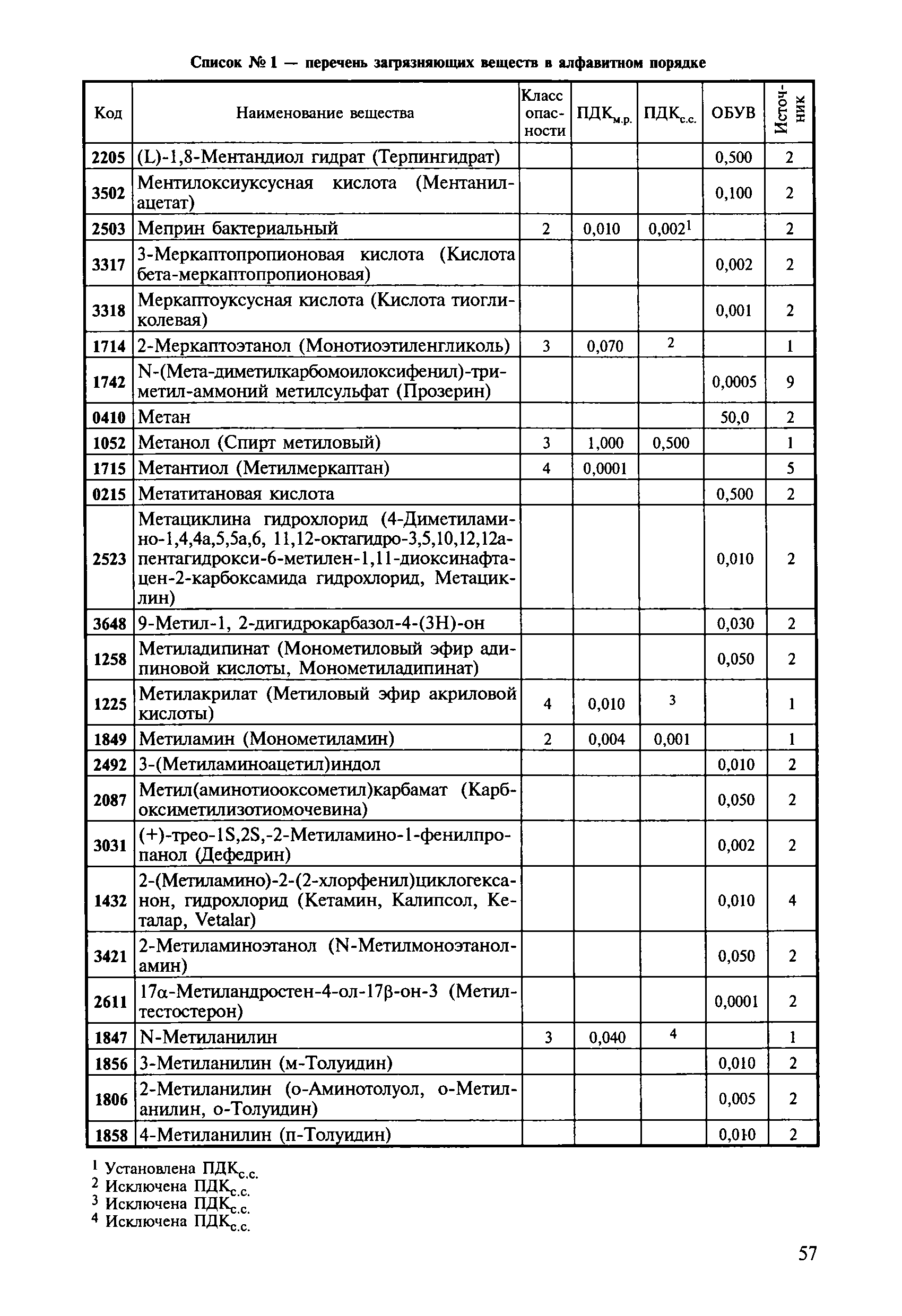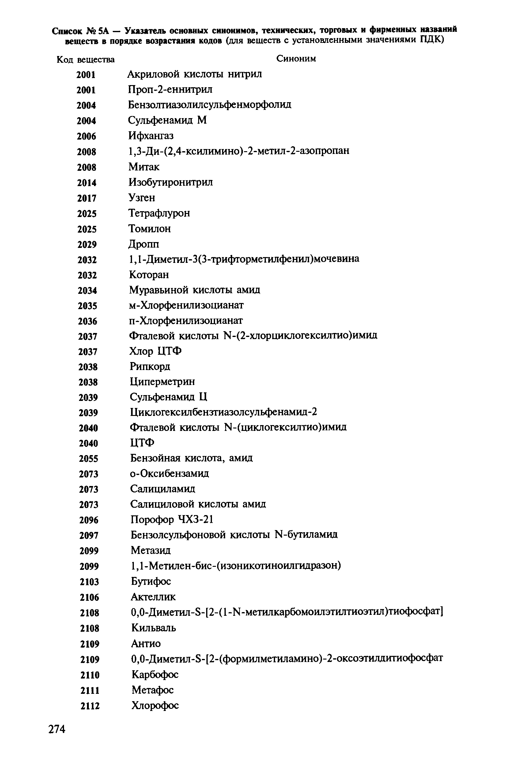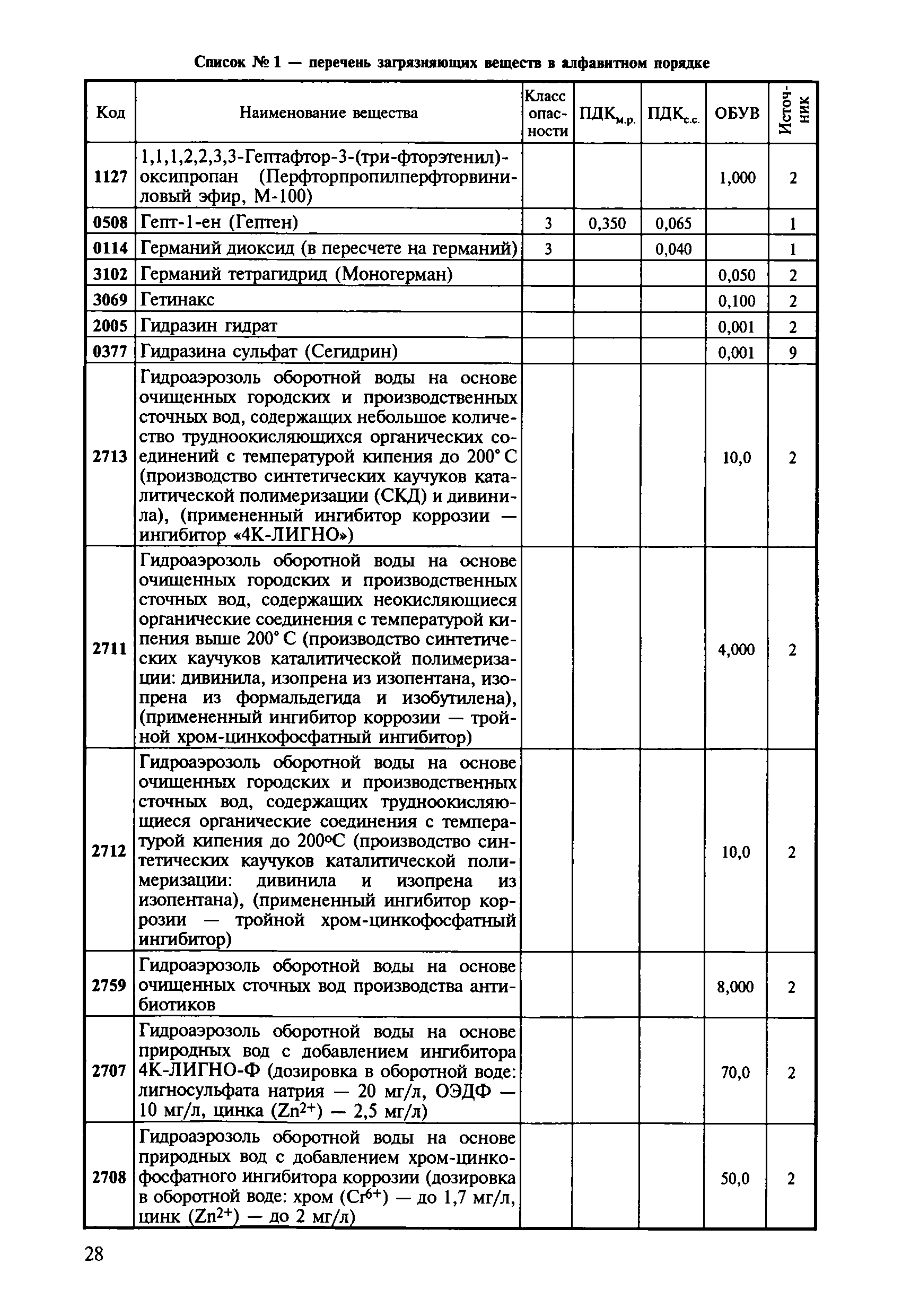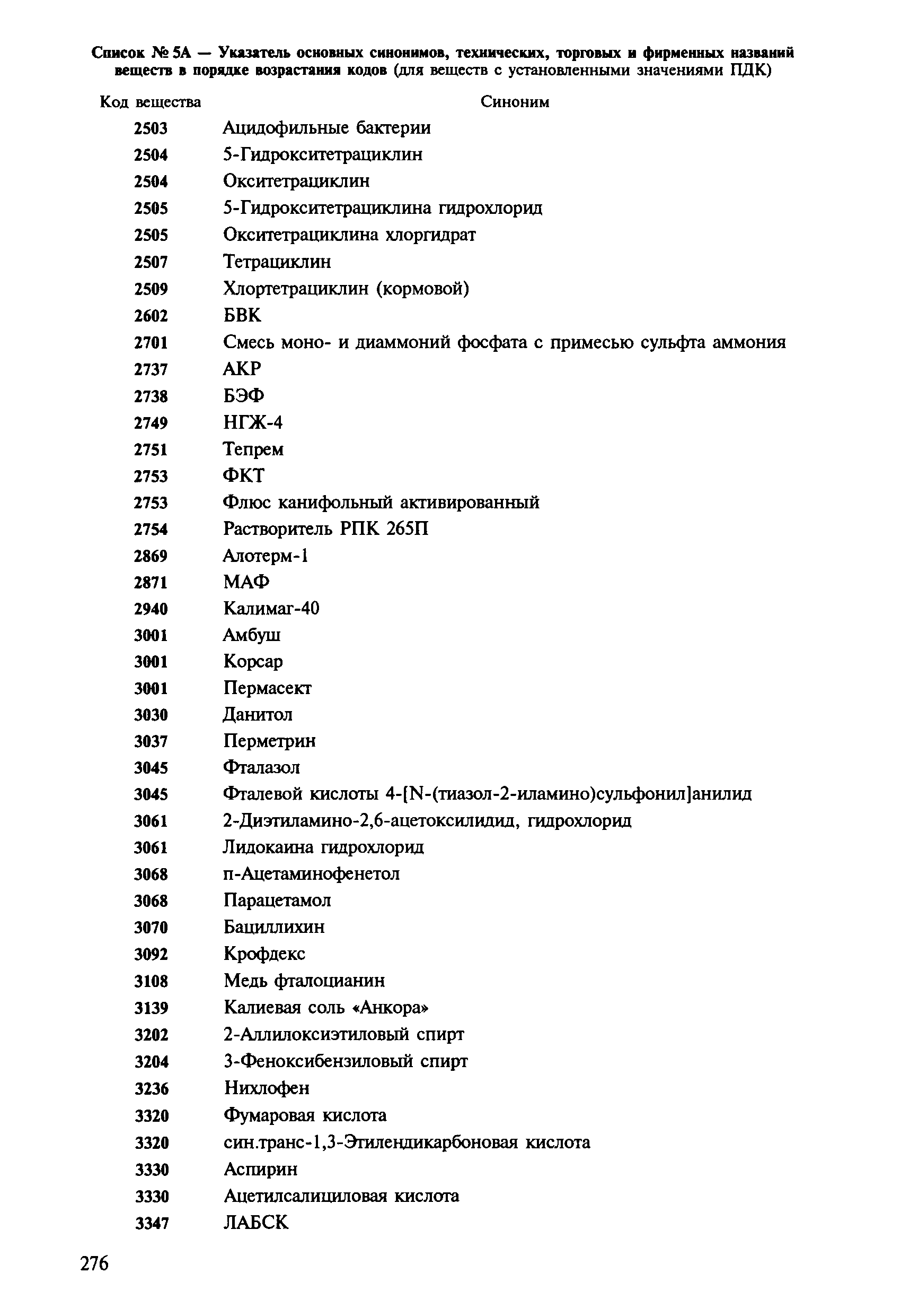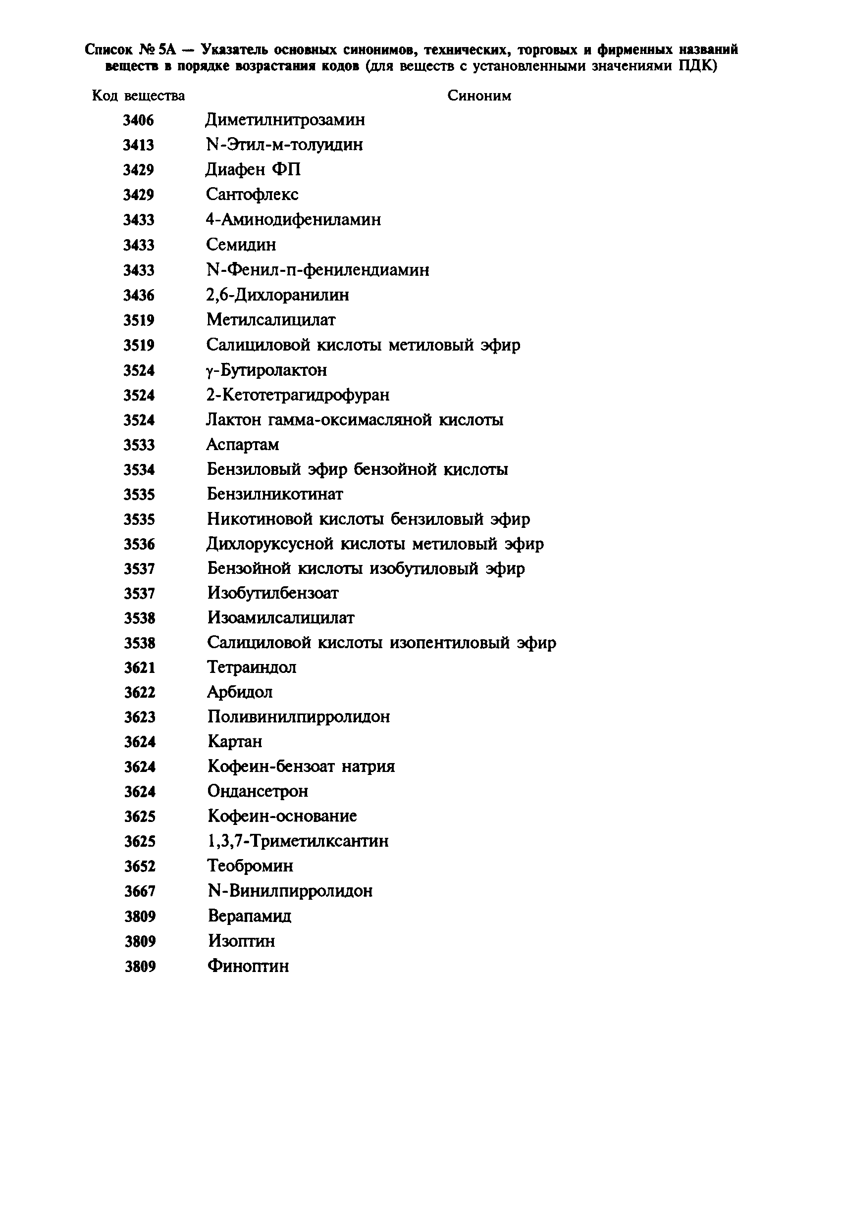 | Оглавление: | Список № 1 Перечень загрязняющих веществ в алфавитном порядке Список № 2 Перечень загрязняющих веществ в порядке возрастания кодов Список № 3 Перечень ЛОС в порядке возрастания кодов Список № 4 Указатель основных синонимов, технических, торговых и фирменных названий веществ в алфавитном порядке А. Для веществ с установленными значениями ПДК Б. Для веществ с установленными значениями ОБУВ Список № 5 Указатель основных синонимов, технических, торговых и фирменных названий веществ в порядке возрастания кодов А. Для веществ с установленными значениями ПДК Б. Для веществ с установленными значениями ОБУВ |