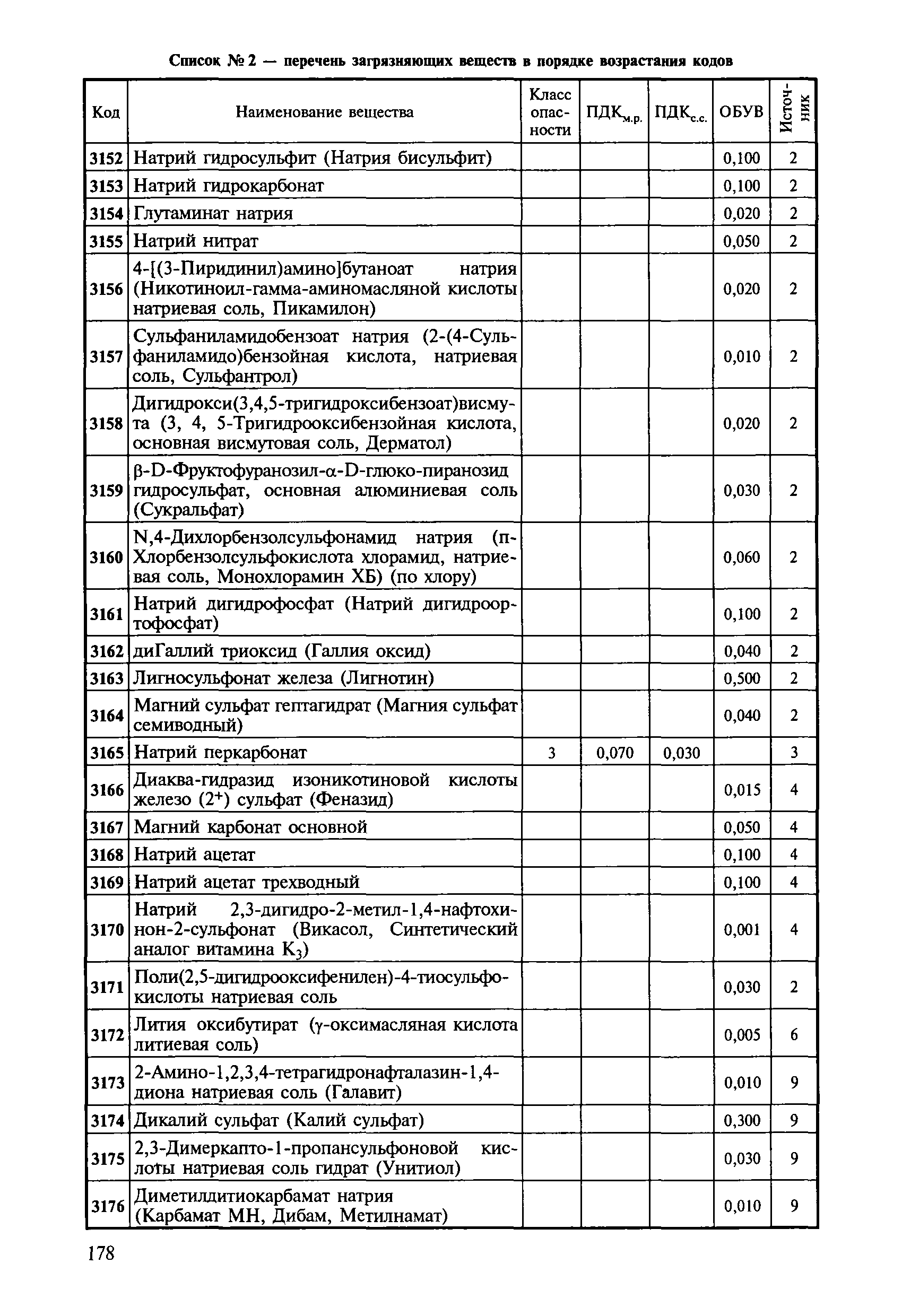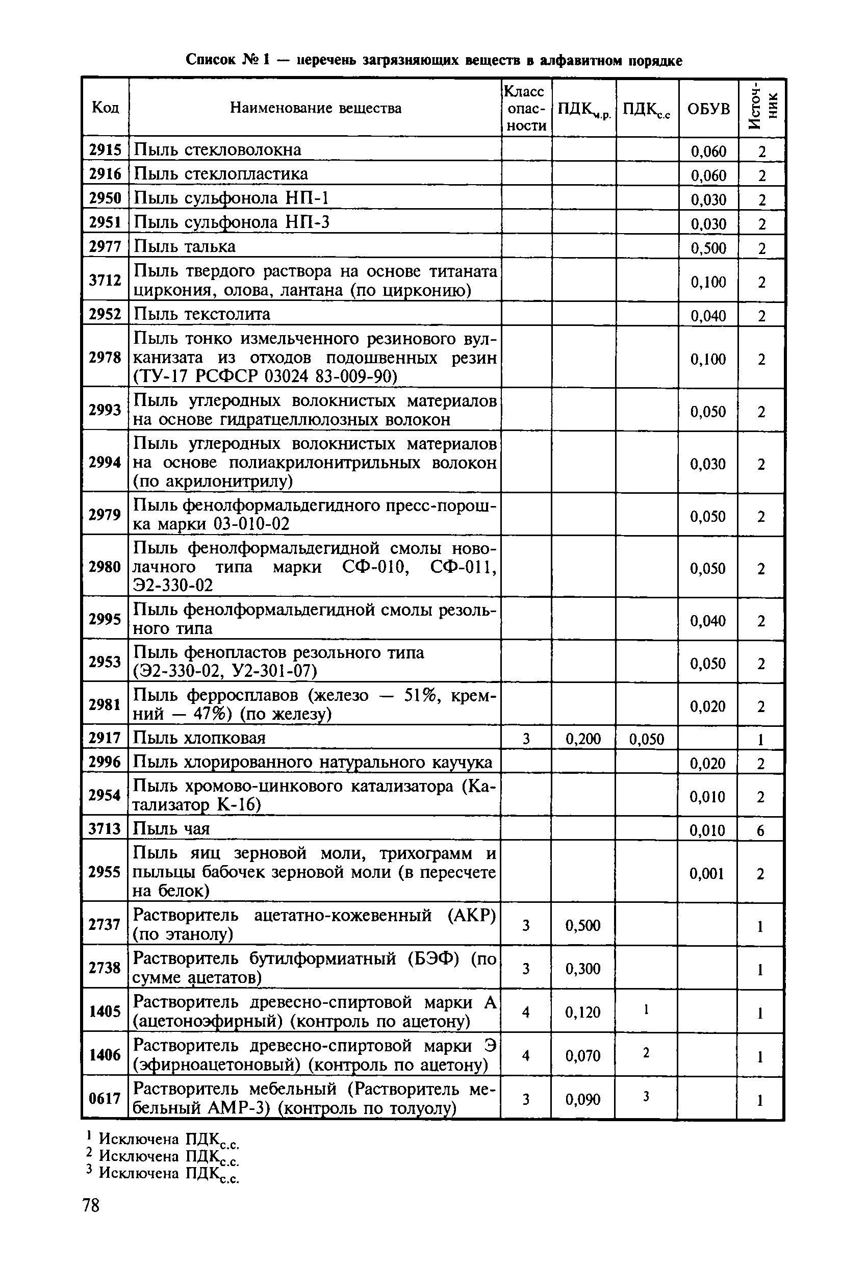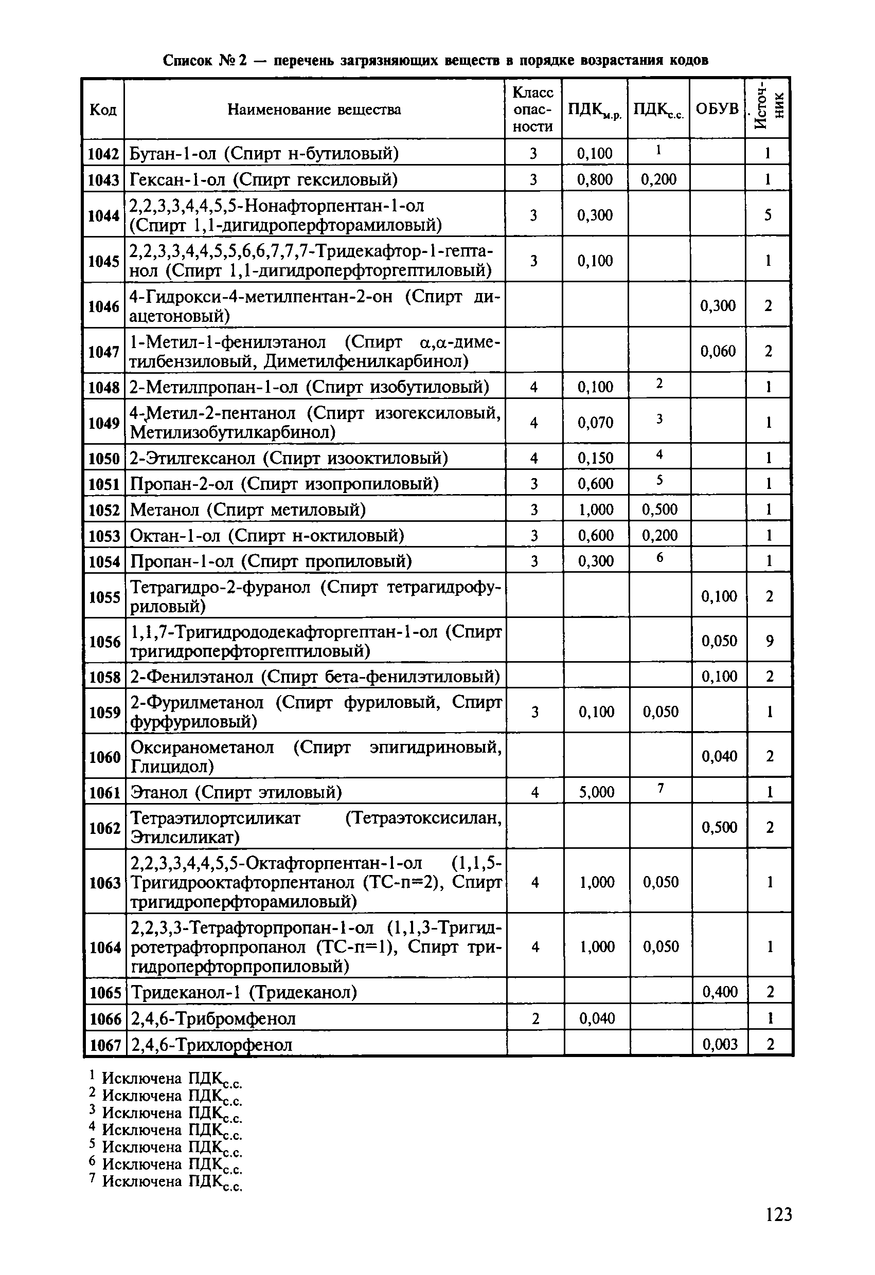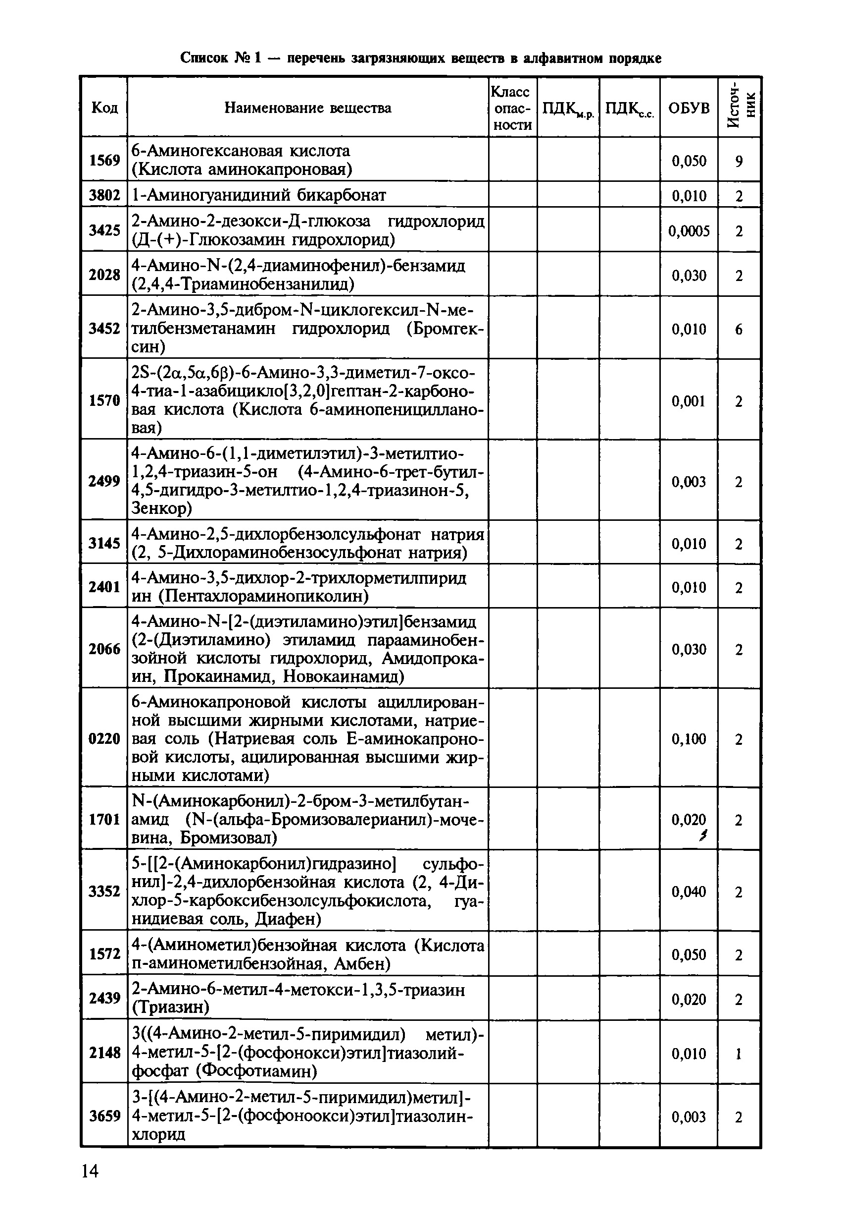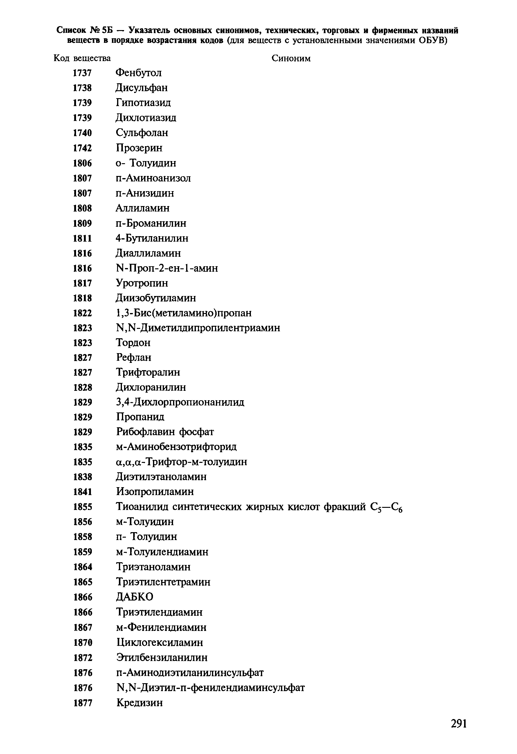 | Оглавление: | Список № 1 Перечень загрязняющих веществ в алфавитном порядке Список № 2 Перечень загрязняющих веществ в порядке возрастания кодов Список № 3 Перечень ЛОС в порядке возрастания кодов Список № 4 Указатель основных синонимов, технических, торговых и фирменных названий веществ в алфавитном порядке А. Для веществ с установленными значениями ПДК Б. Для веществ с установленными значениями ОБУВ Список № 5 Указатель основных синонимов, технических, торговых и фирменных названий веществ в порядке возрастания кодов А. Для веществ с установленными значениями ПДК Б. Для веществ с установленными значениями ОБУВ |