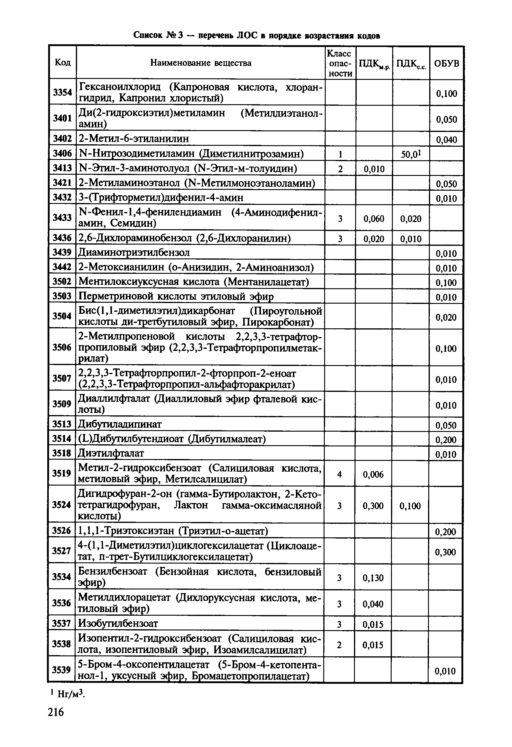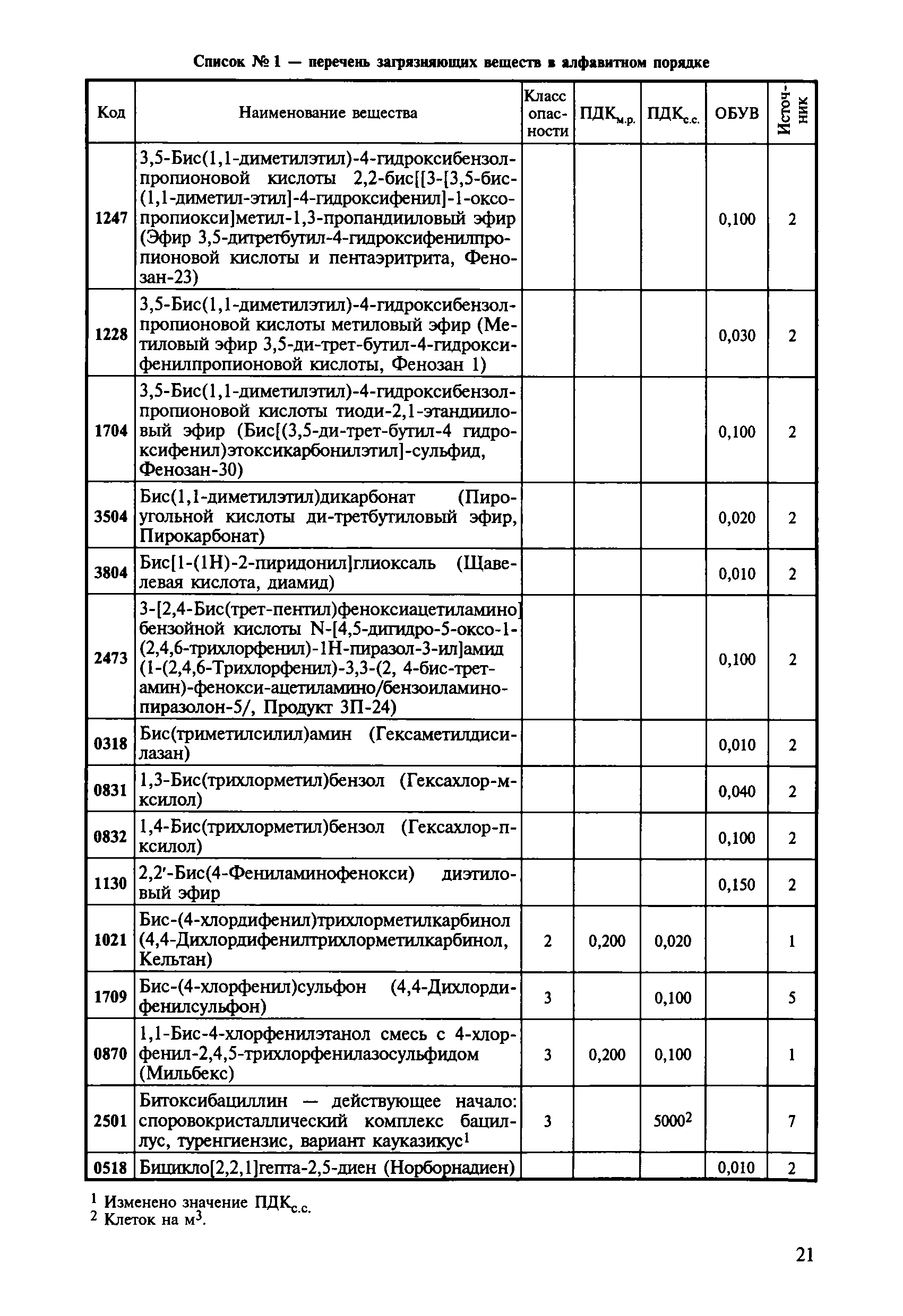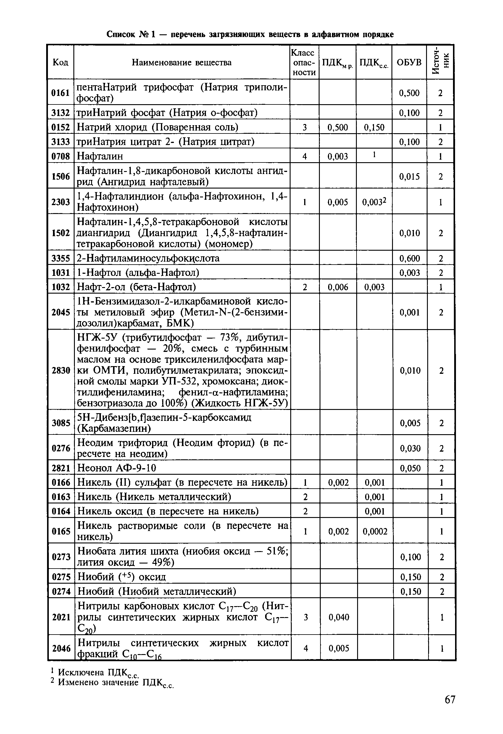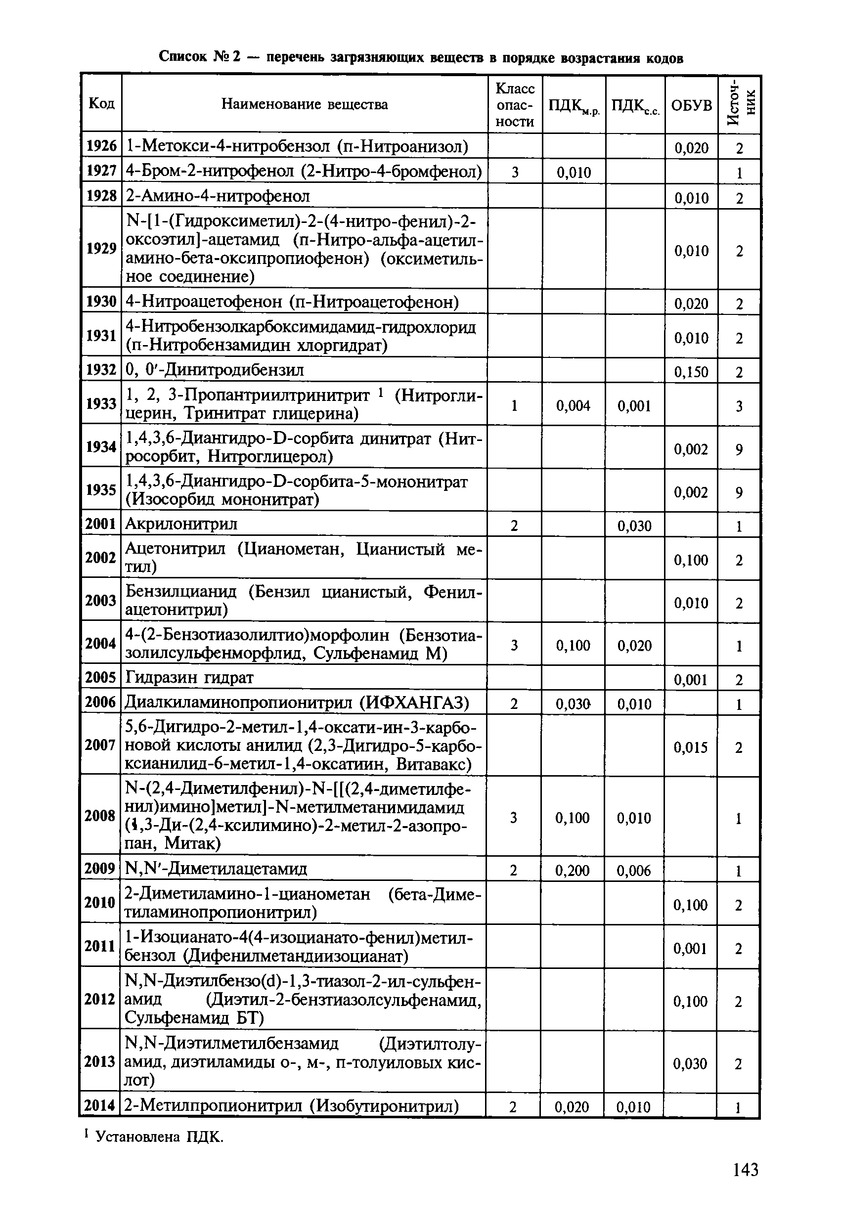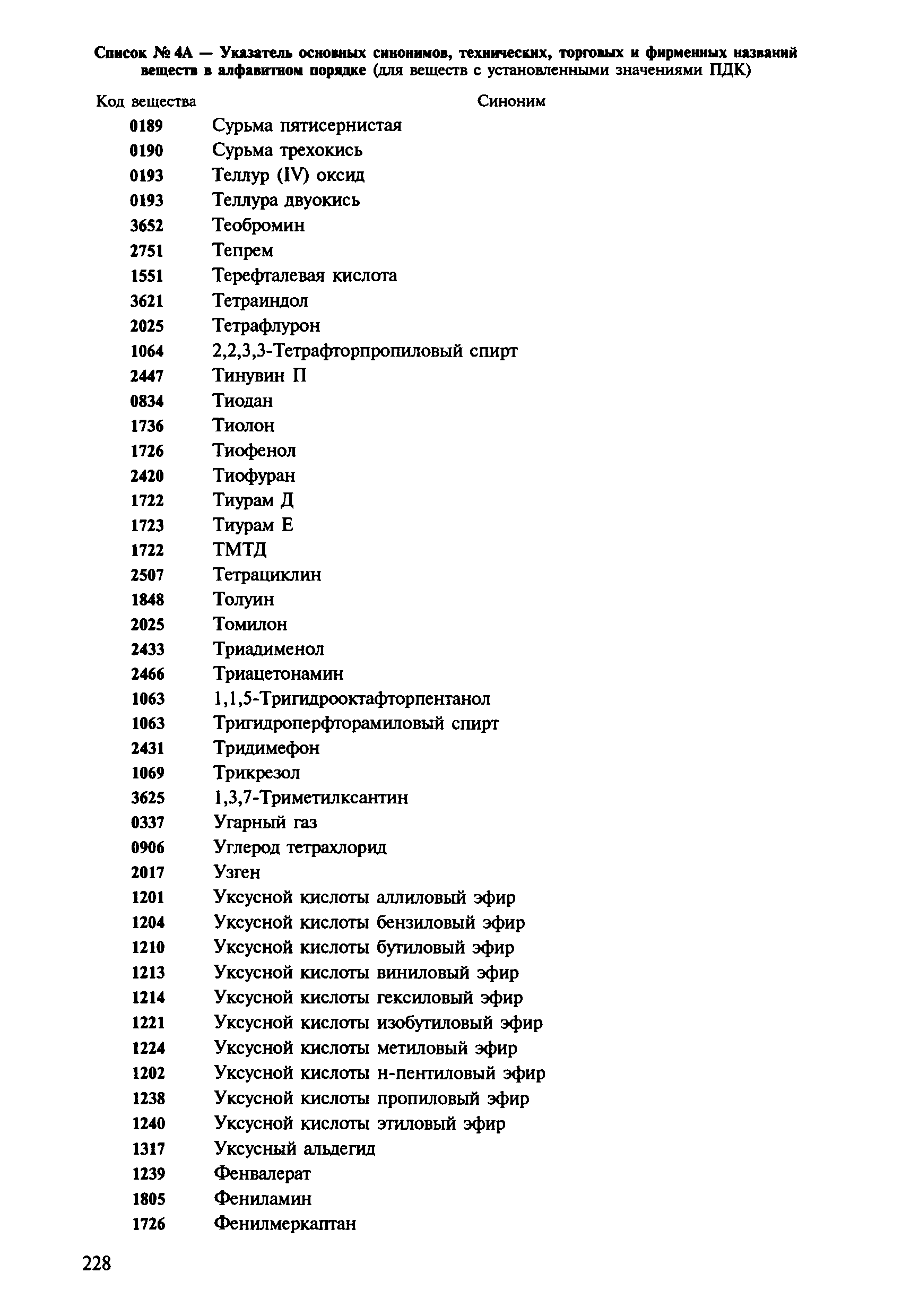 | Оглавление: | Список № 1 Перечень загрязняющих веществ в алфавитном порядке Список № 2 Перечень загрязняющих веществ в порядке возрастания кодов Список № 3 Перечень ЛОС в порядке возрастания кодов Список № 4 Указатель основных синонимов, технических, торговых и фирменных названий веществ в алфавитном порядке А. Для веществ с установленными значениями ПДК Б. Для веществ с установленными значениями ОБУВ Список № 5 Указатель основных синонимов, технических, торговых и фирменных названий веществ в порядке возрастания кодов А. Для веществ с установленными значениями ПДК Б. Для веществ с установленными значениями ОБУВ |