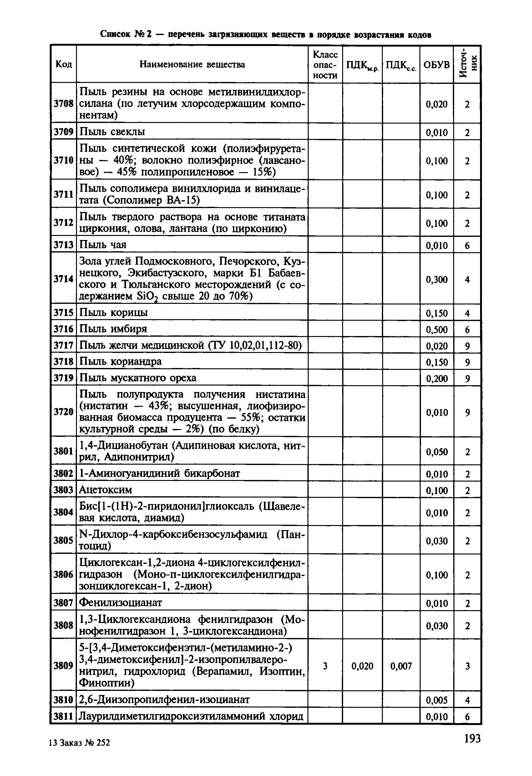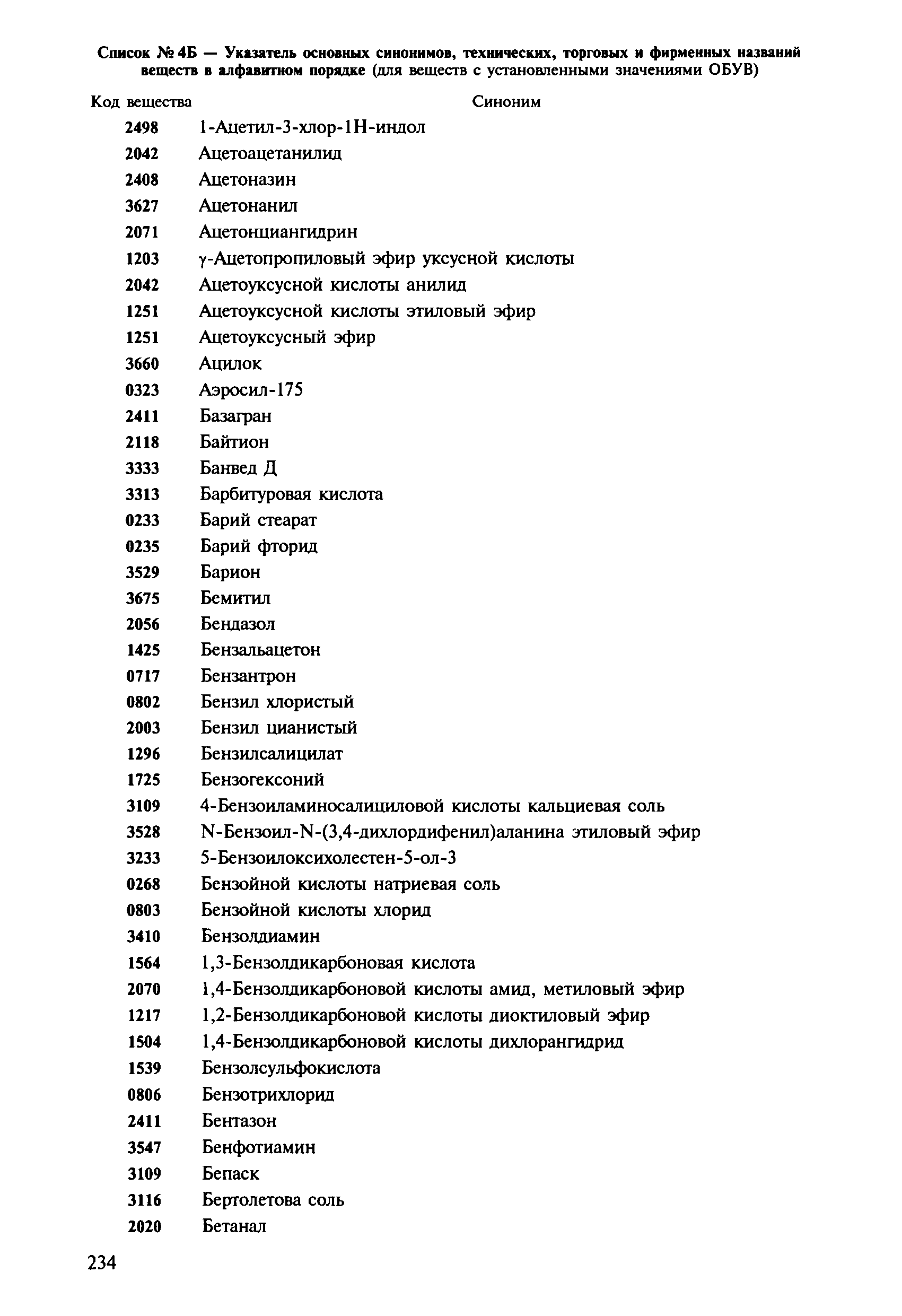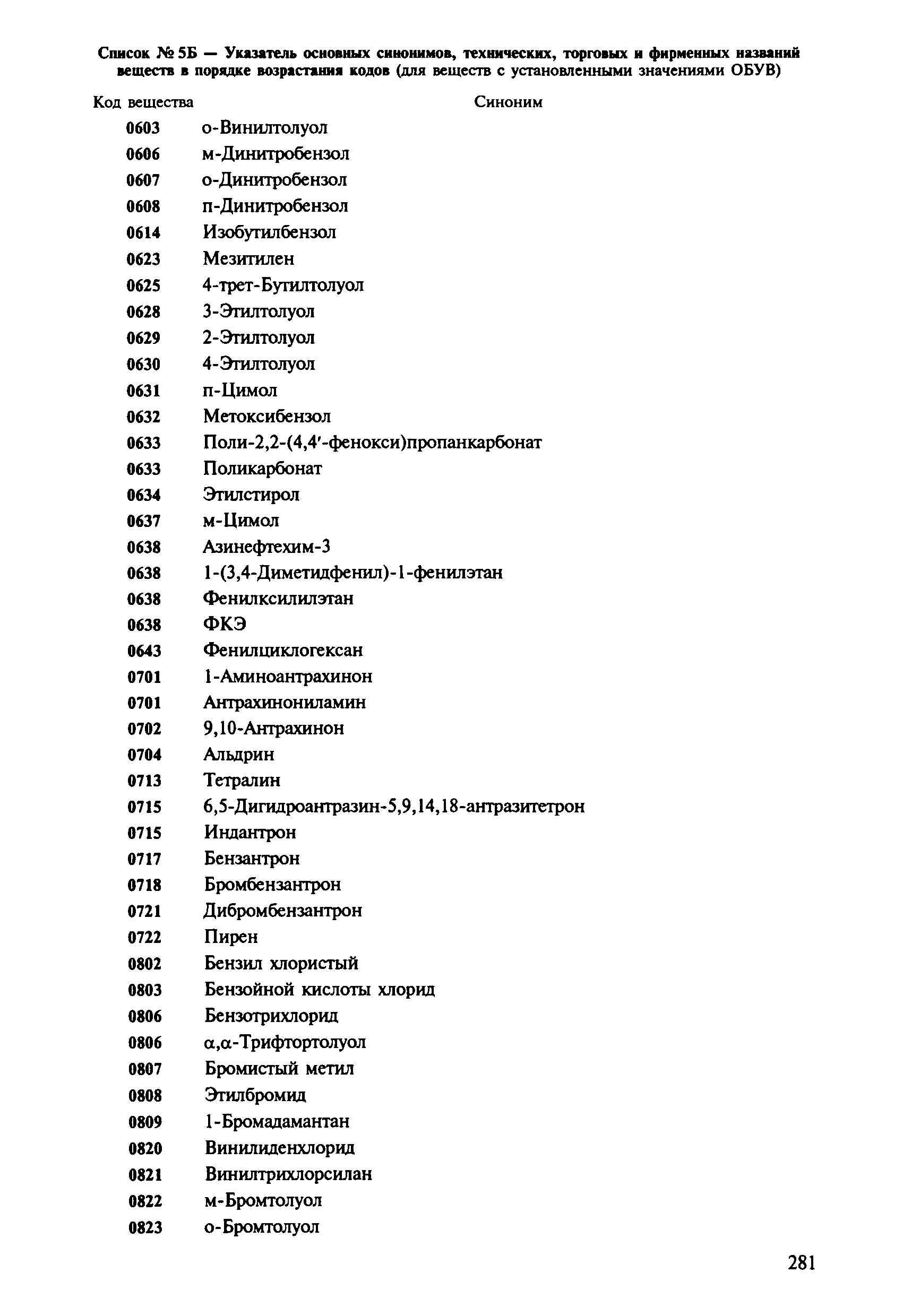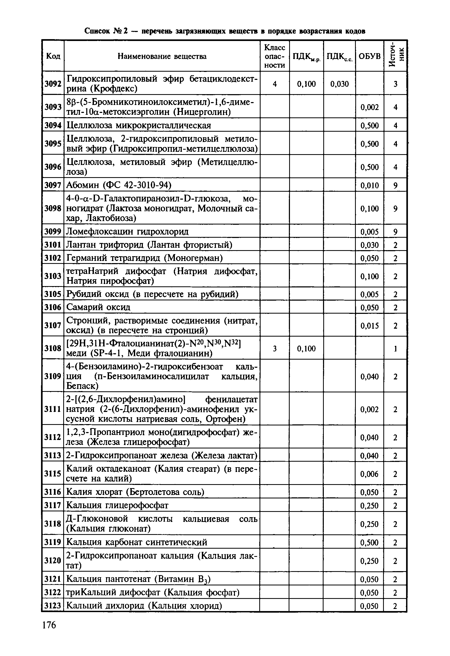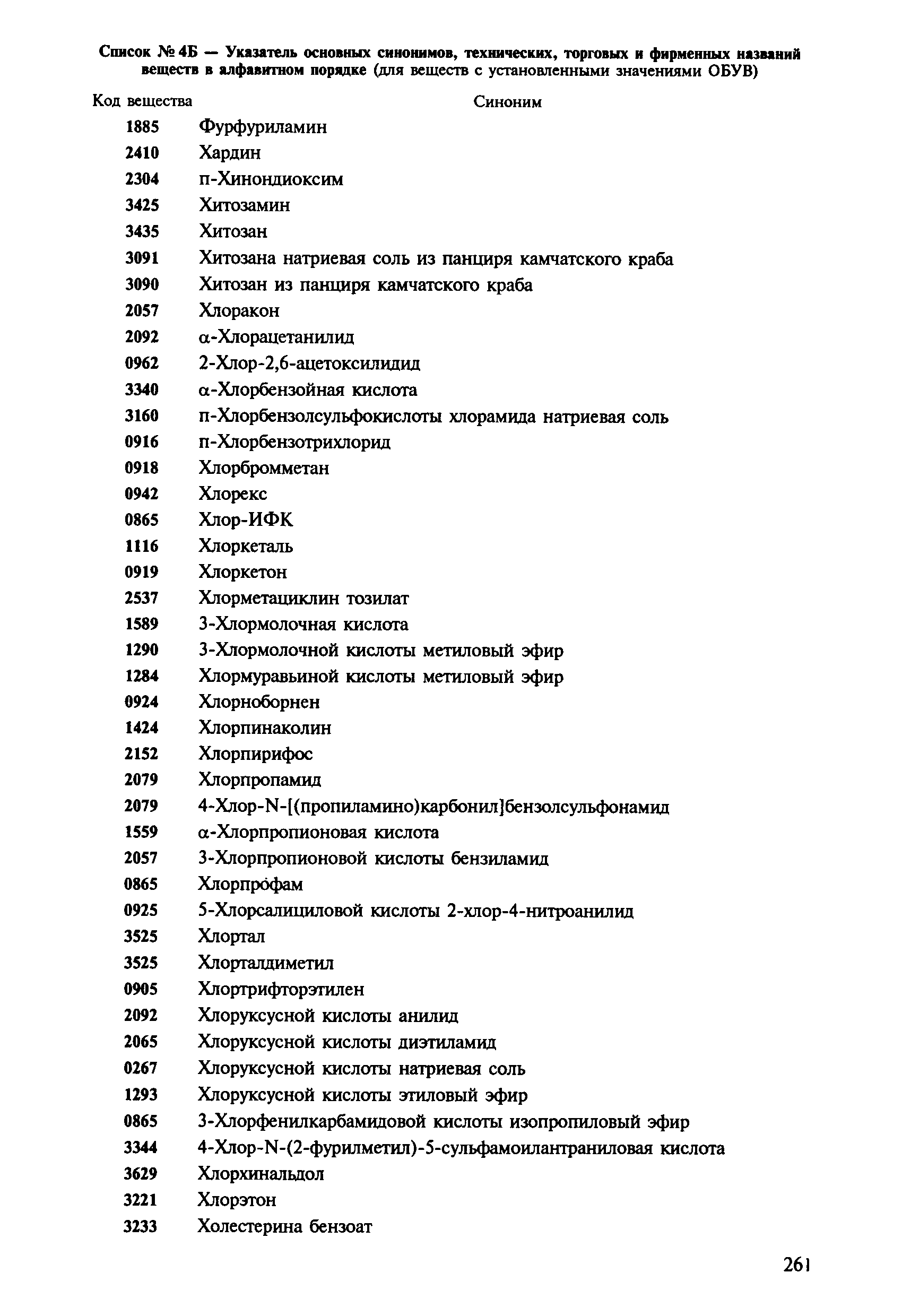 | Оглавление: | Список № 1 Перечень загрязняющих веществ в алфавитном порядке Список № 2 Перечень загрязняющих веществ в порядке возрастания кодов Список № 3 Перечень ЛОС в порядке возрастания кодов Список № 4 Указатель основных синонимов, технических, торговых и фирменных названий веществ в алфавитном порядке А. Для веществ с установленными значениями ПДК Б. Для веществ с установленными значениями ОБУВ Список № 5 Указатель основных синонимов, технических, торговых и фирменных названий веществ в порядке возрастания кодов А. Для веществ с установленными значениями ПДК Б. Для веществ с установленными значениями ОБУВ |