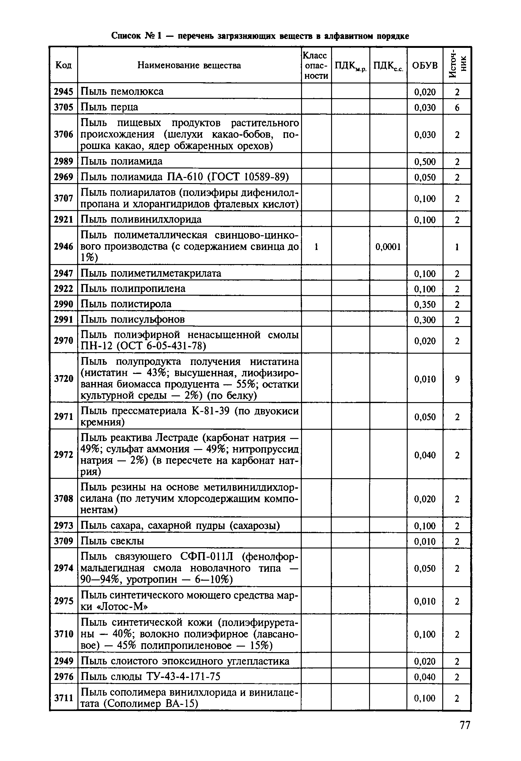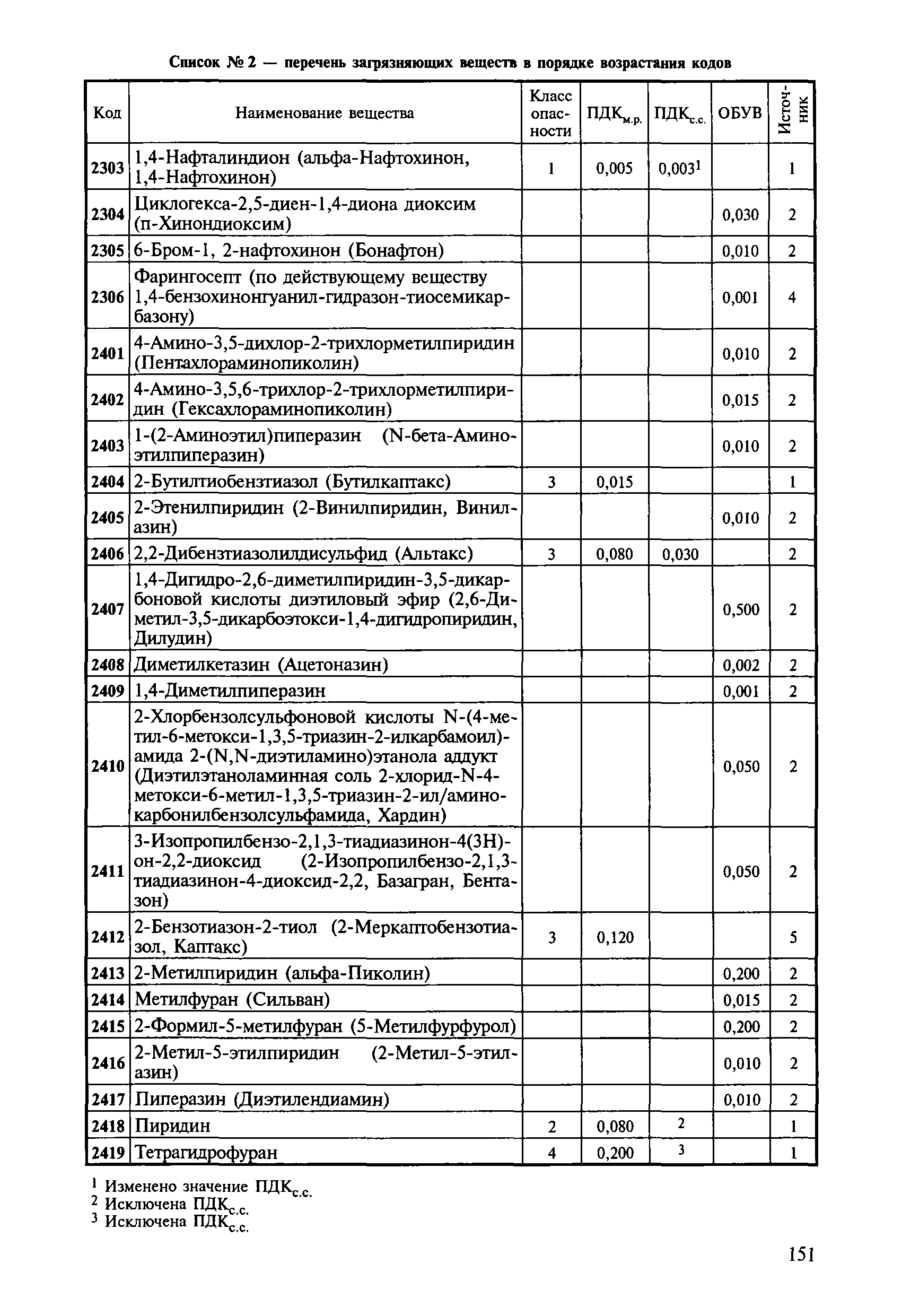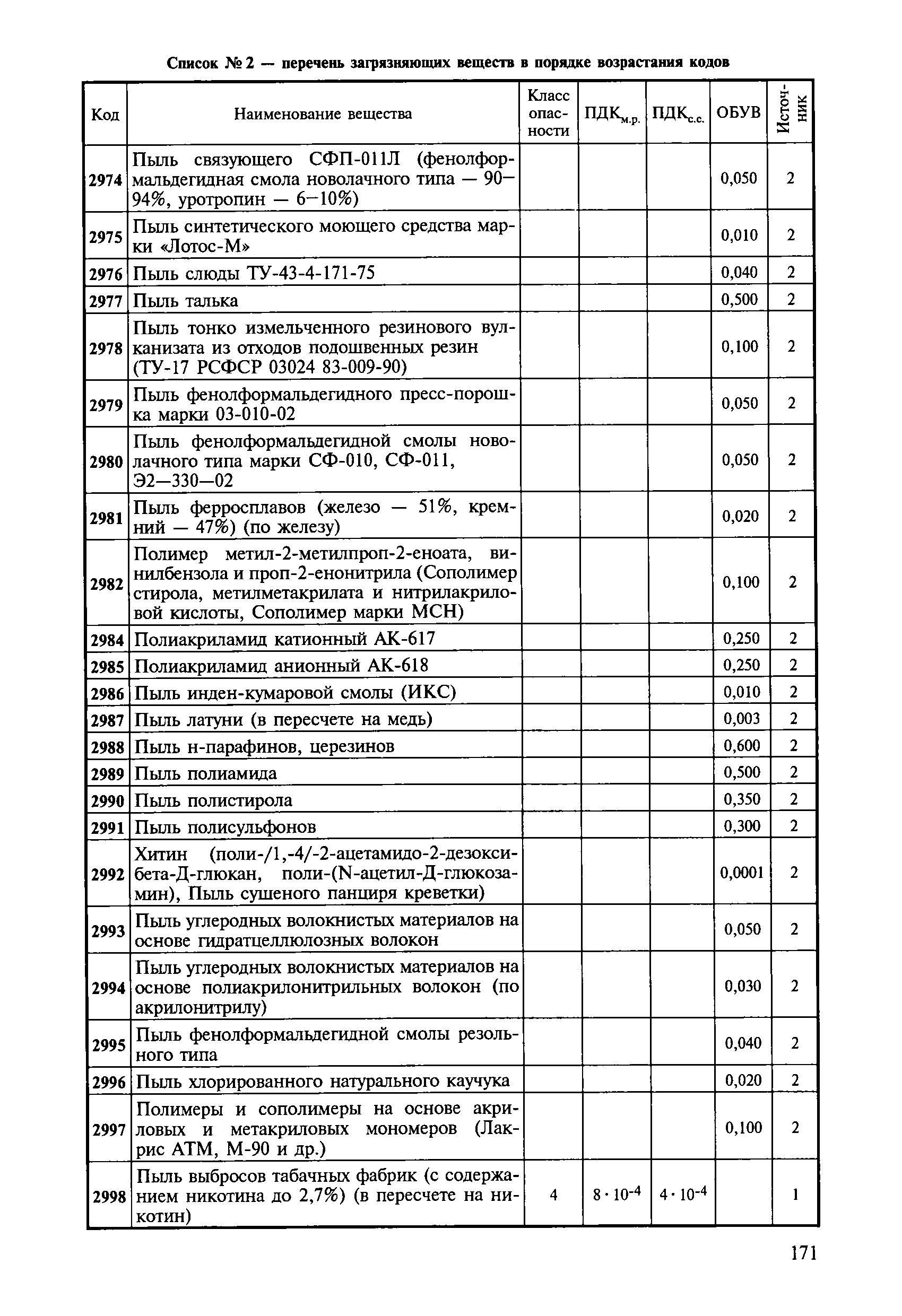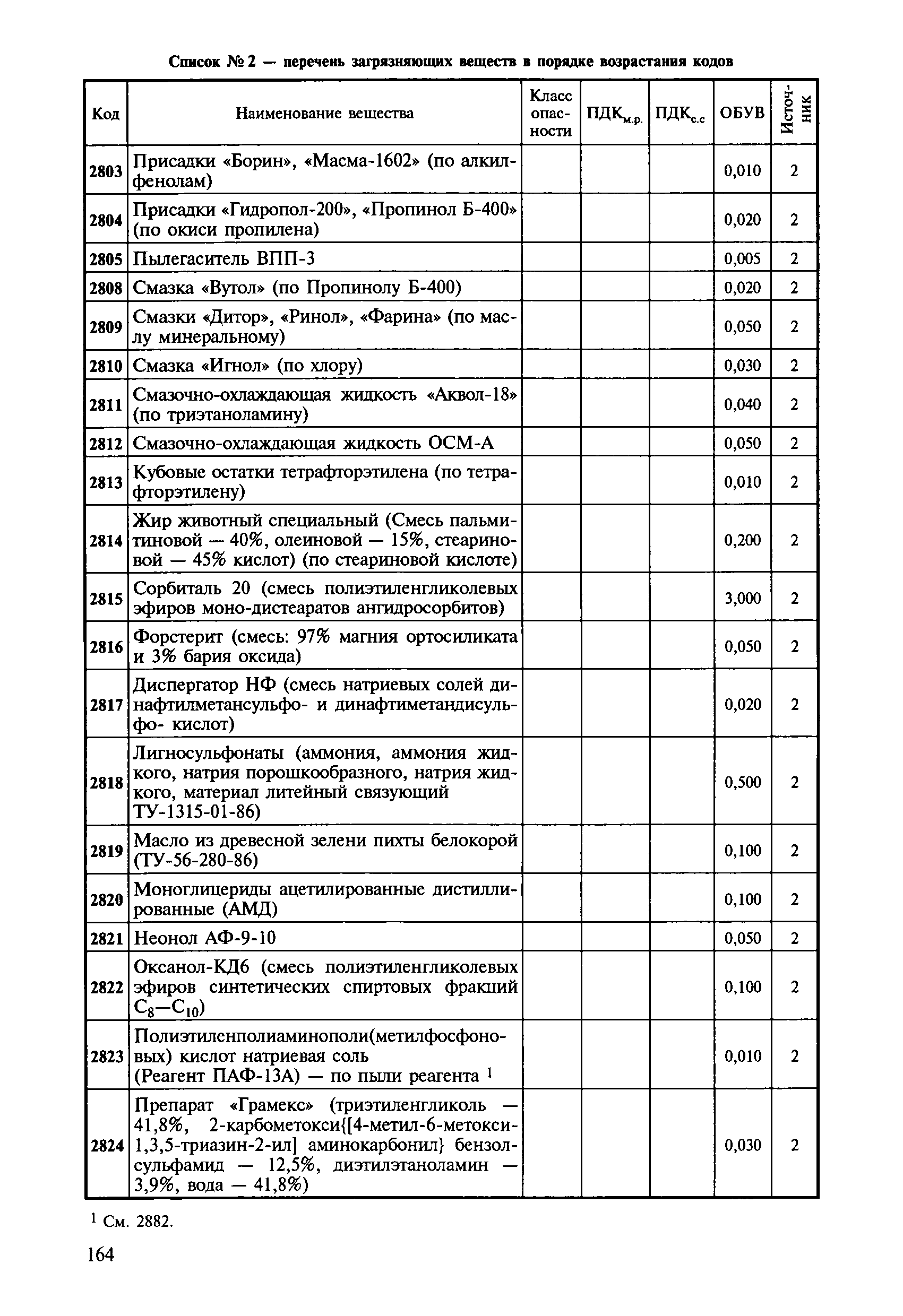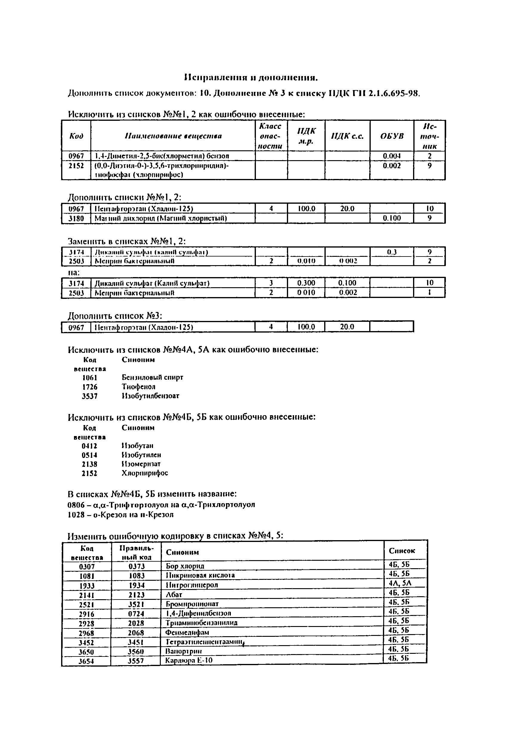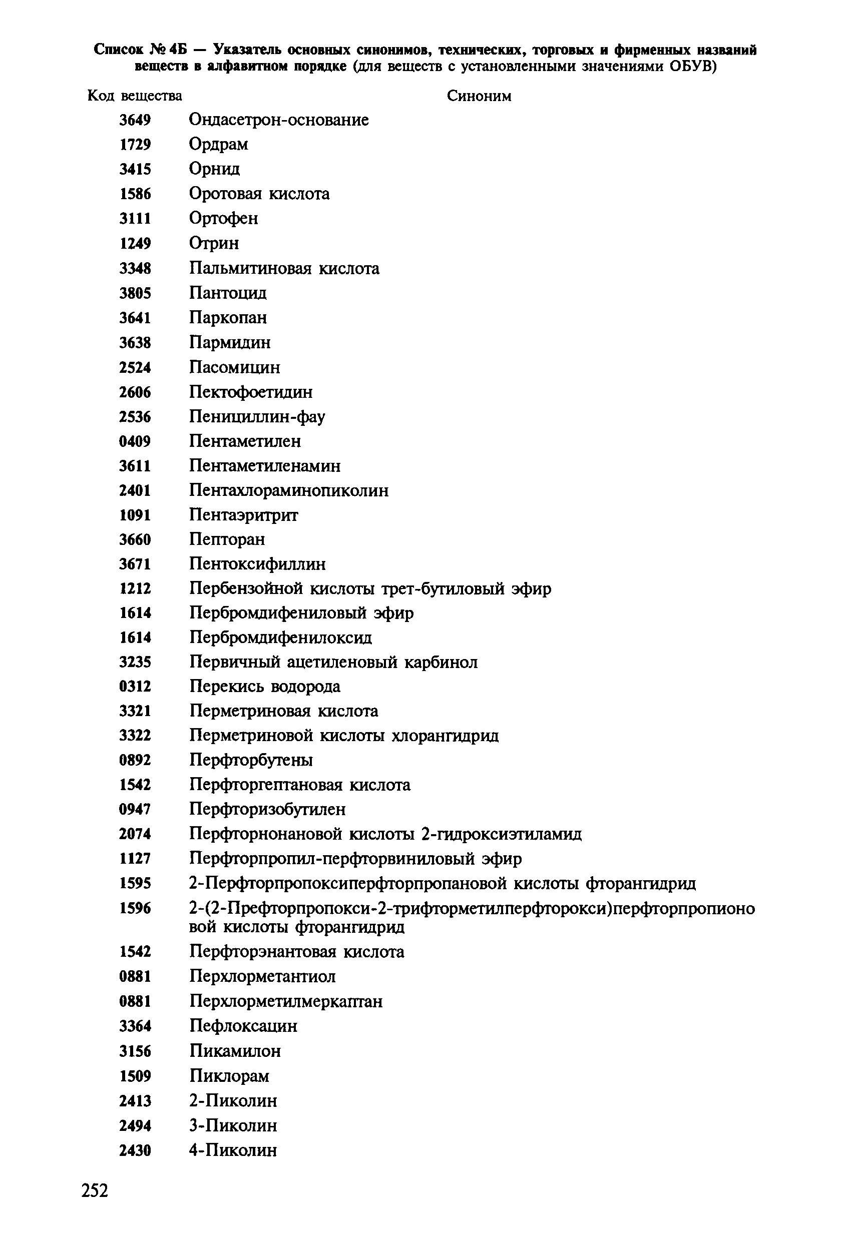 | Оглавление: | Список № 1 Перечень загрязняющих веществ в алфавитном порядке Список № 2 Перечень загрязняющих веществ в порядке возрастания кодов Список № 3 Перечень ЛОС в порядке возрастания кодов Список № 4 Указатель основных синонимов, технических, торговых и фирменных названий веществ в алфавитном порядке А. Для веществ с установленными значениями ПДК Б. Для веществ с установленными значениями ОБУВ Список № 5 Указатель основных синонимов, технических, торговых и фирменных названий веществ в порядке возрастания кодов А. Для веществ с установленными значениями ПДК Б. Для веществ с установленными значениями ОБУВ |