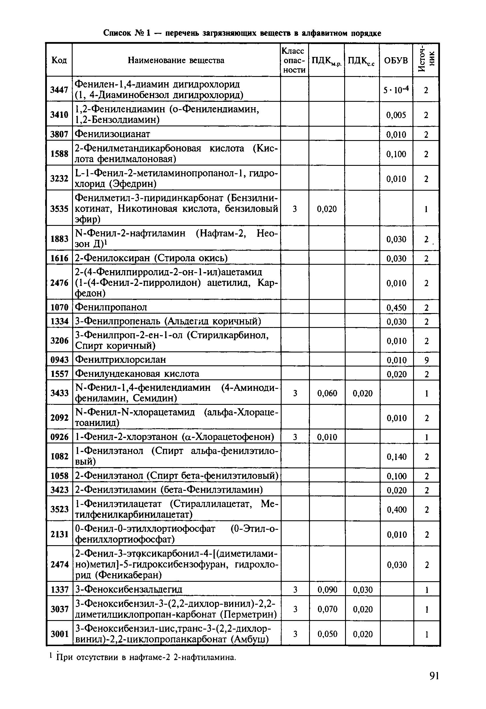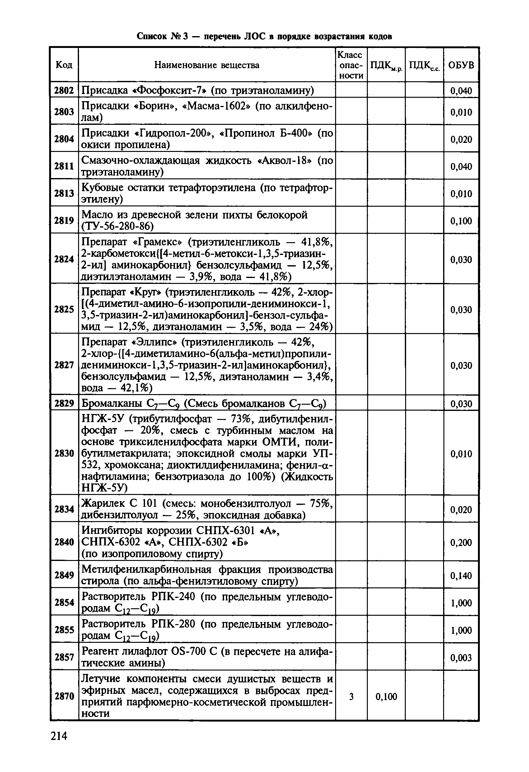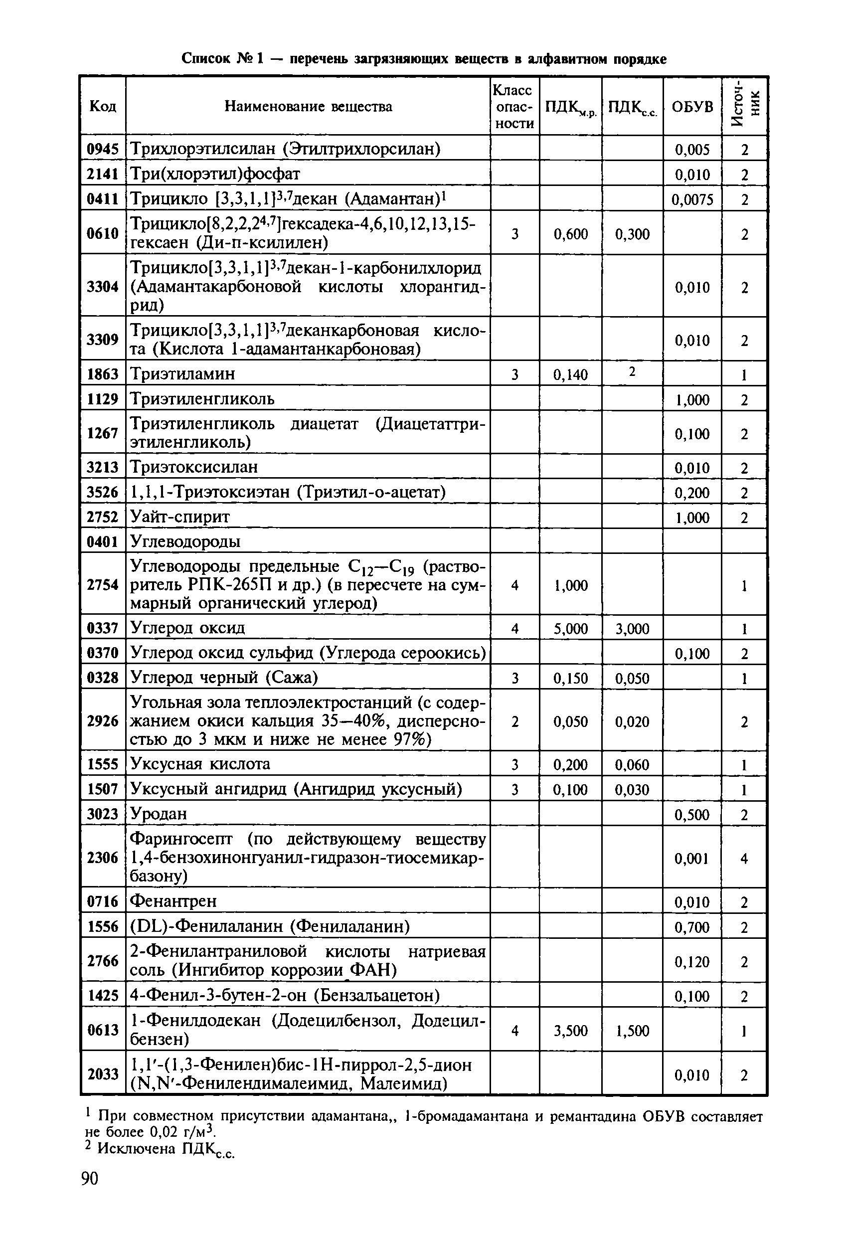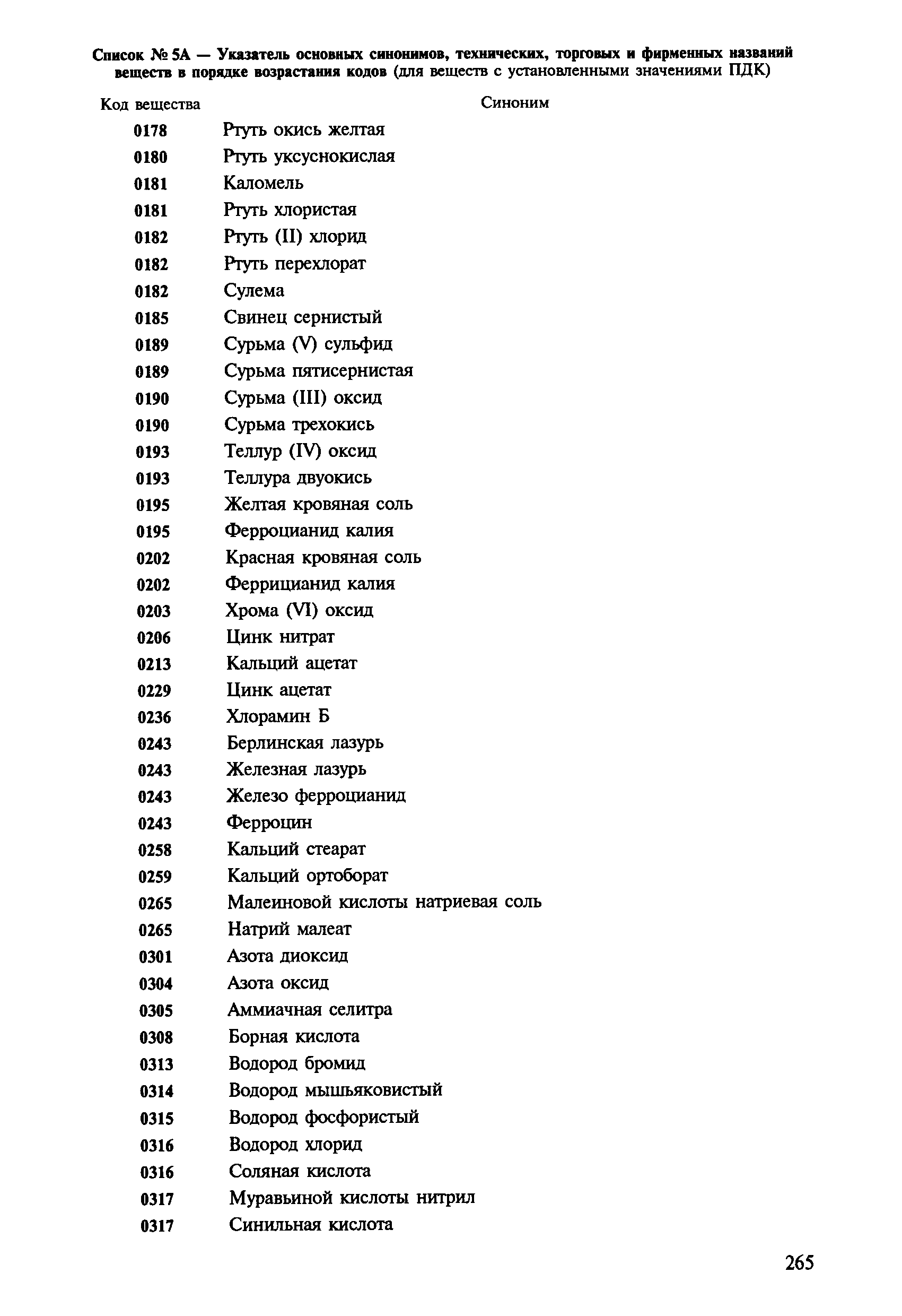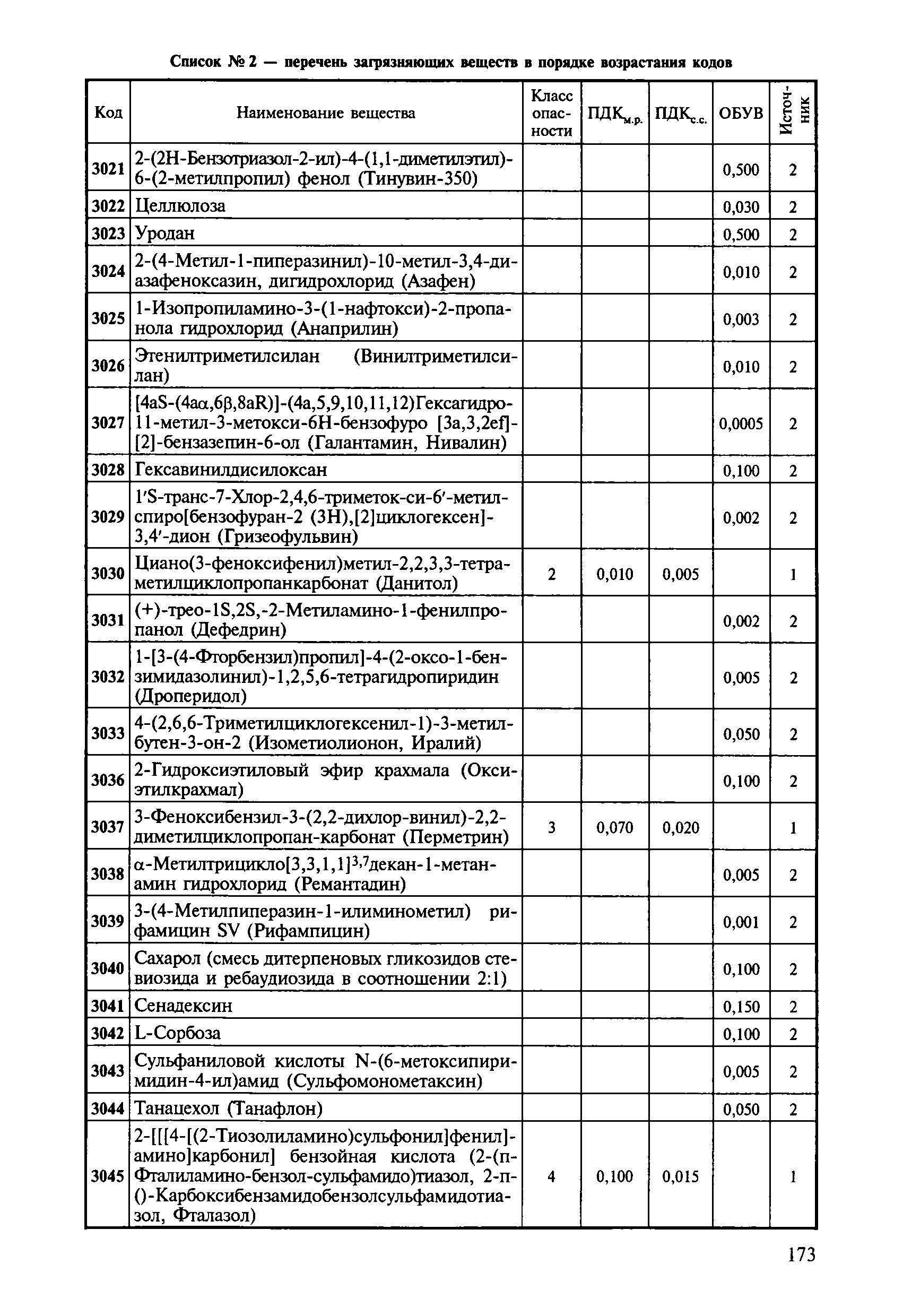 | Оглавление: | Список № 1 Перечень загрязняющих веществ в алфавитном порядке Список № 2 Перечень загрязняющих веществ в порядке возрастания кодов Список № 3 Перечень ЛОС в порядке возрастания кодов Список № 4 Указатель основных синонимов, технических, торговых и фирменных названий веществ в алфавитном порядке А. Для веществ с установленными значениями ПДК Б. Для веществ с установленными значениями ОБУВ Список № 5 Указатель основных синонимов, технических, торговых и фирменных названий веществ в порядке возрастания кодов А. Для веществ с установленными значениями ПДК Б. Для веществ с установленными значениями ОБУВ |