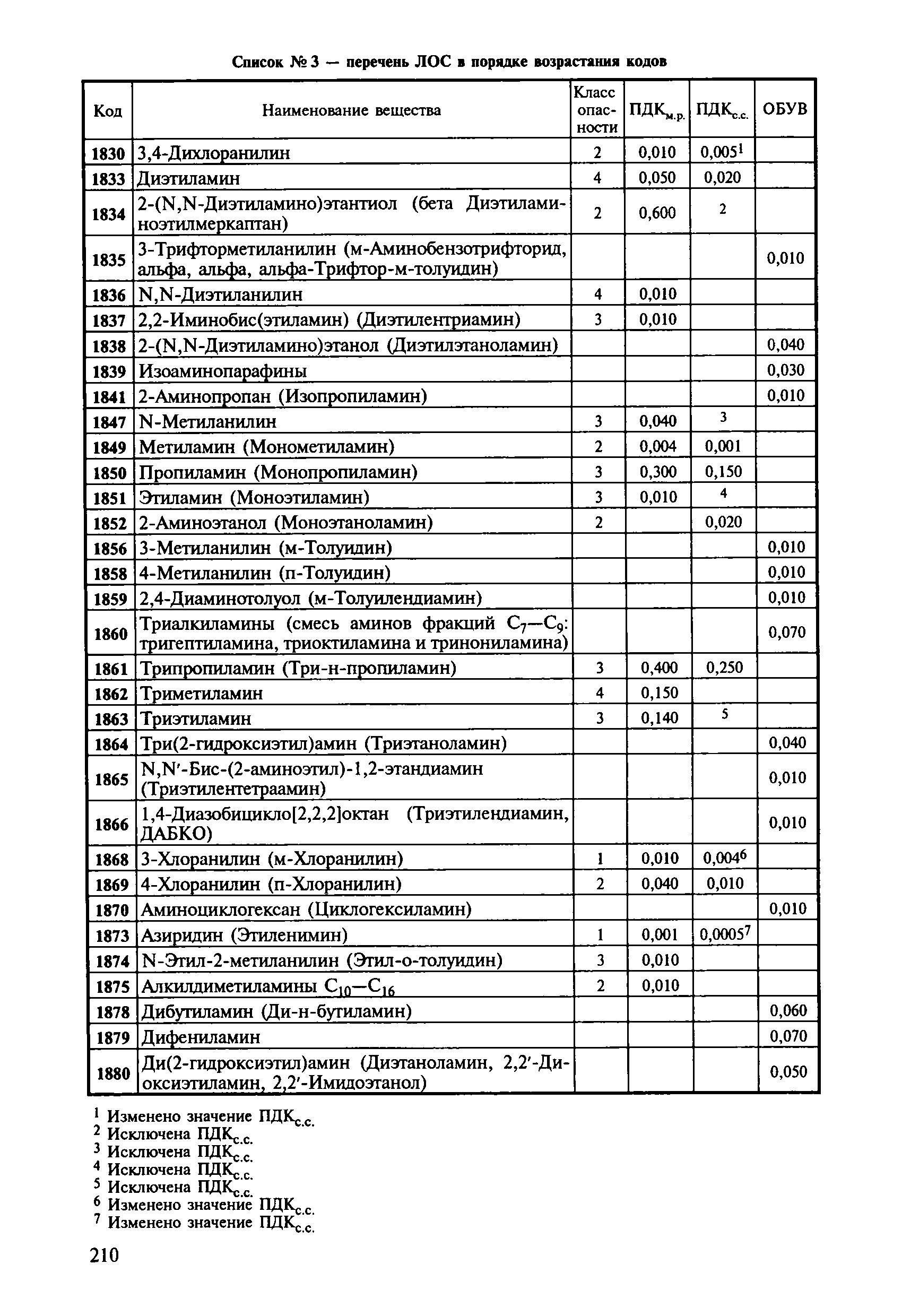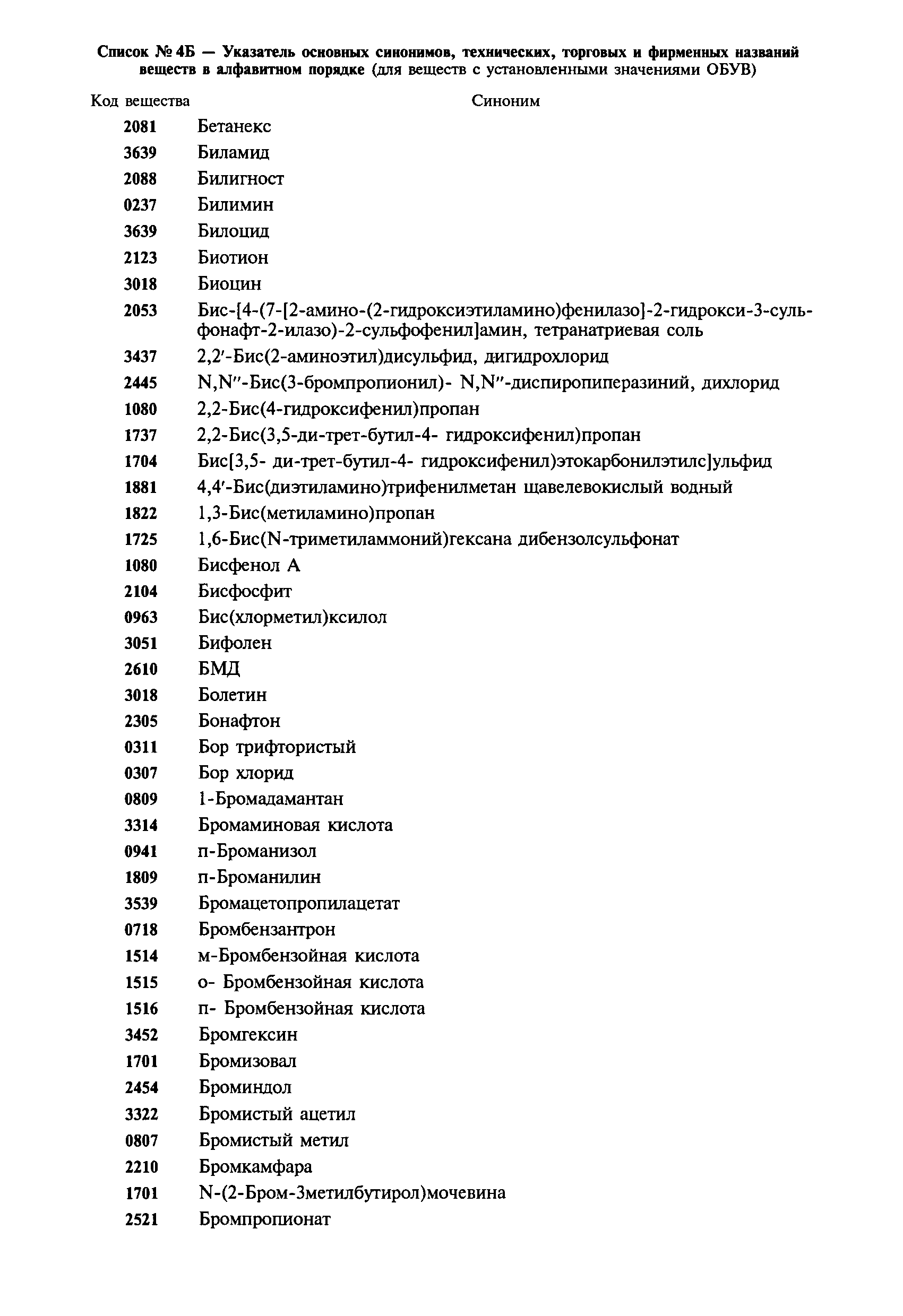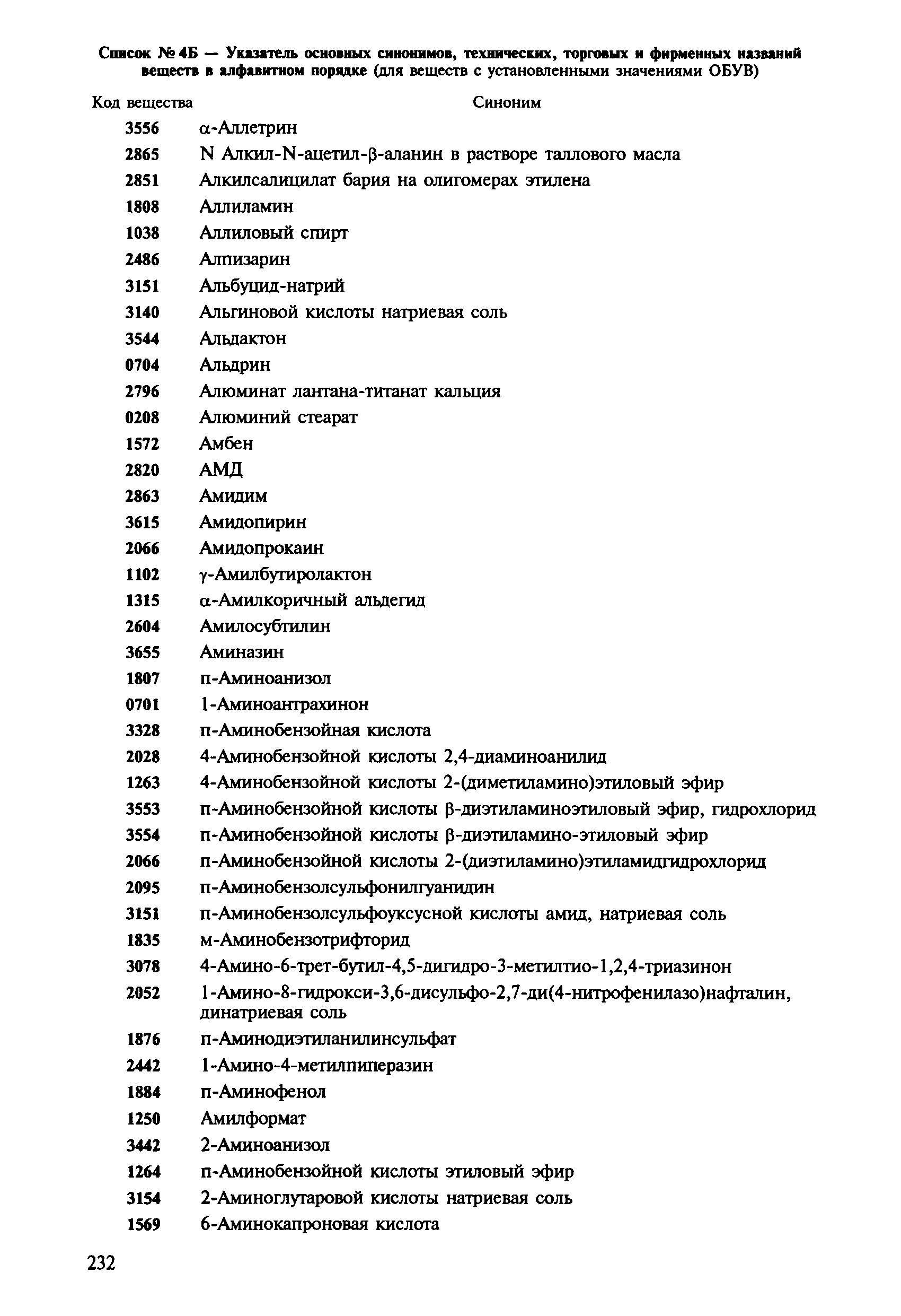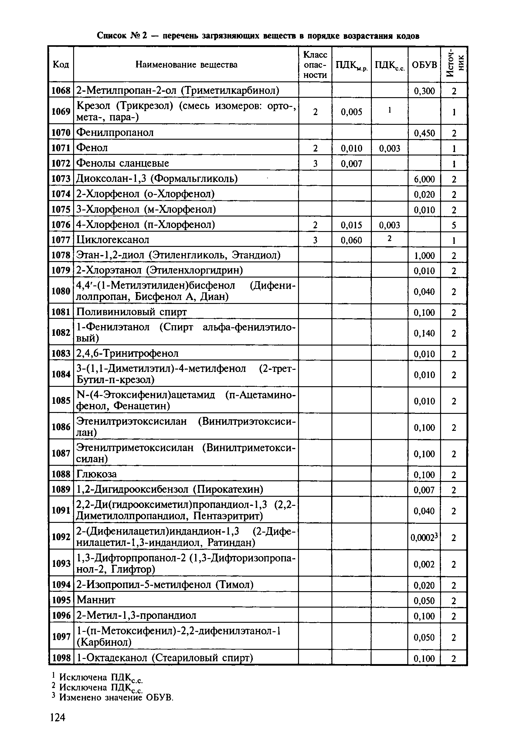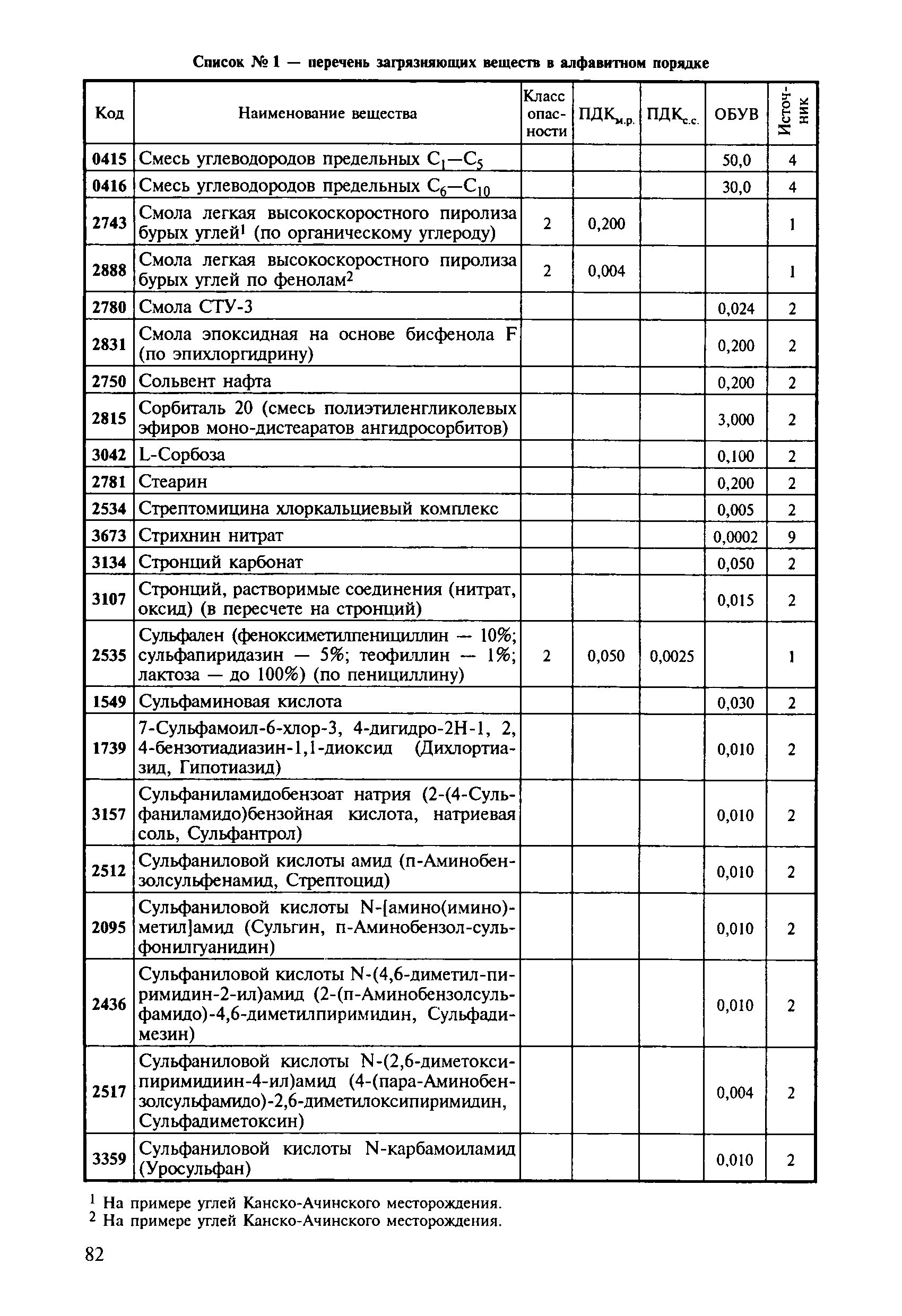 | Оглавление: | Список № 1 Перечень загрязняющих веществ в алфавитном порядке Список № 2 Перечень загрязняющих веществ в порядке возрастания кодов Список № 3 Перечень ЛОС в порядке возрастания кодов Список № 4 Указатель основных синонимов, технических, торговых и фирменных названий веществ в алфавитном порядке А. Для веществ с установленными значениями ПДК Б. Для веществ с установленными значениями ОБУВ Список № 5 Указатель основных синонимов, технических, торговых и фирменных названий веществ в порядке возрастания кодов А. Для веществ с установленными значениями ПДК Б. Для веществ с установленными значениями ОБУВ |