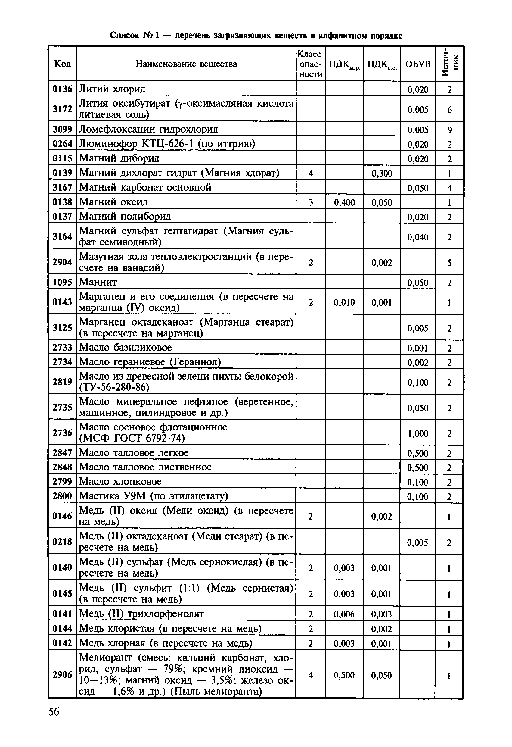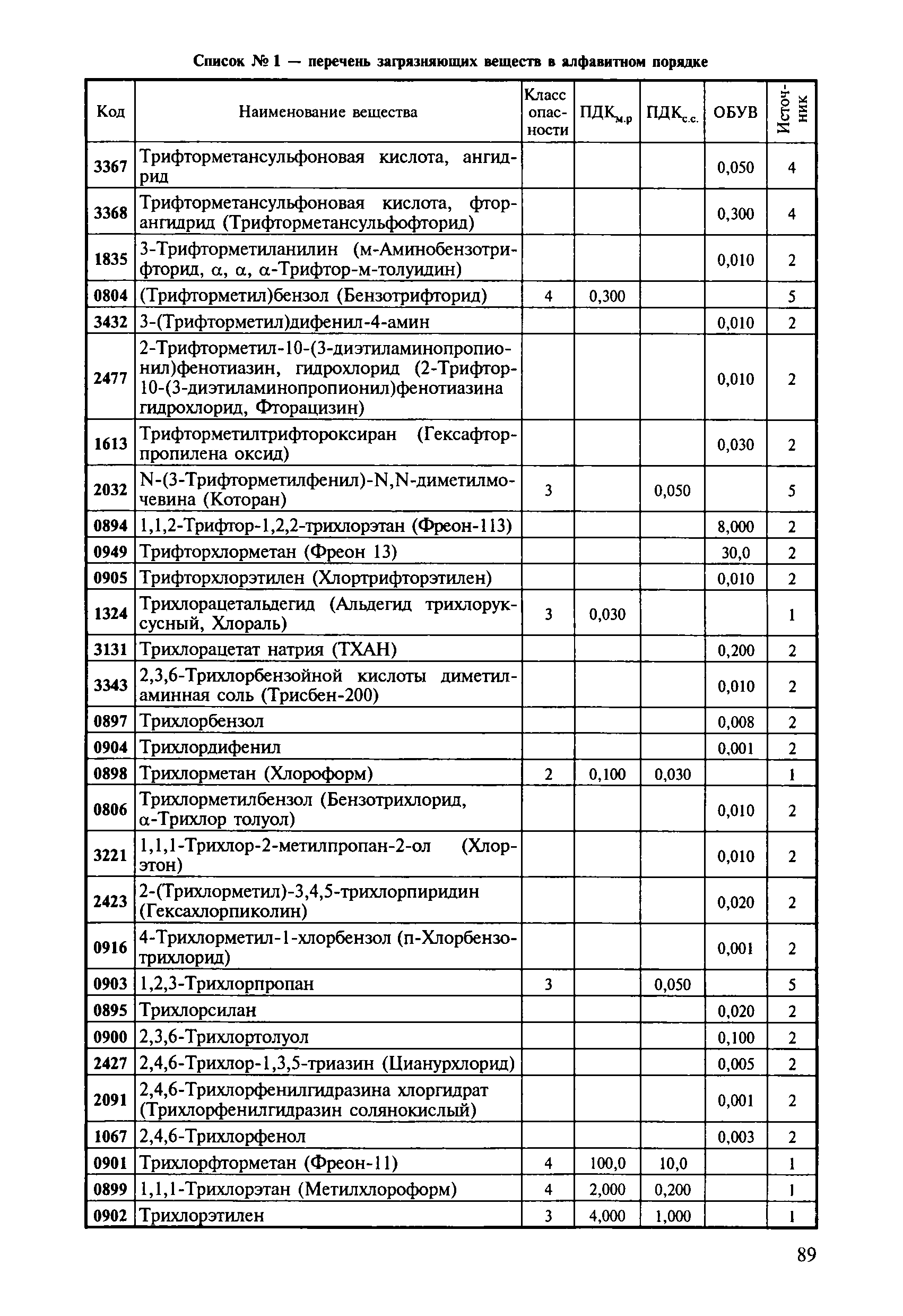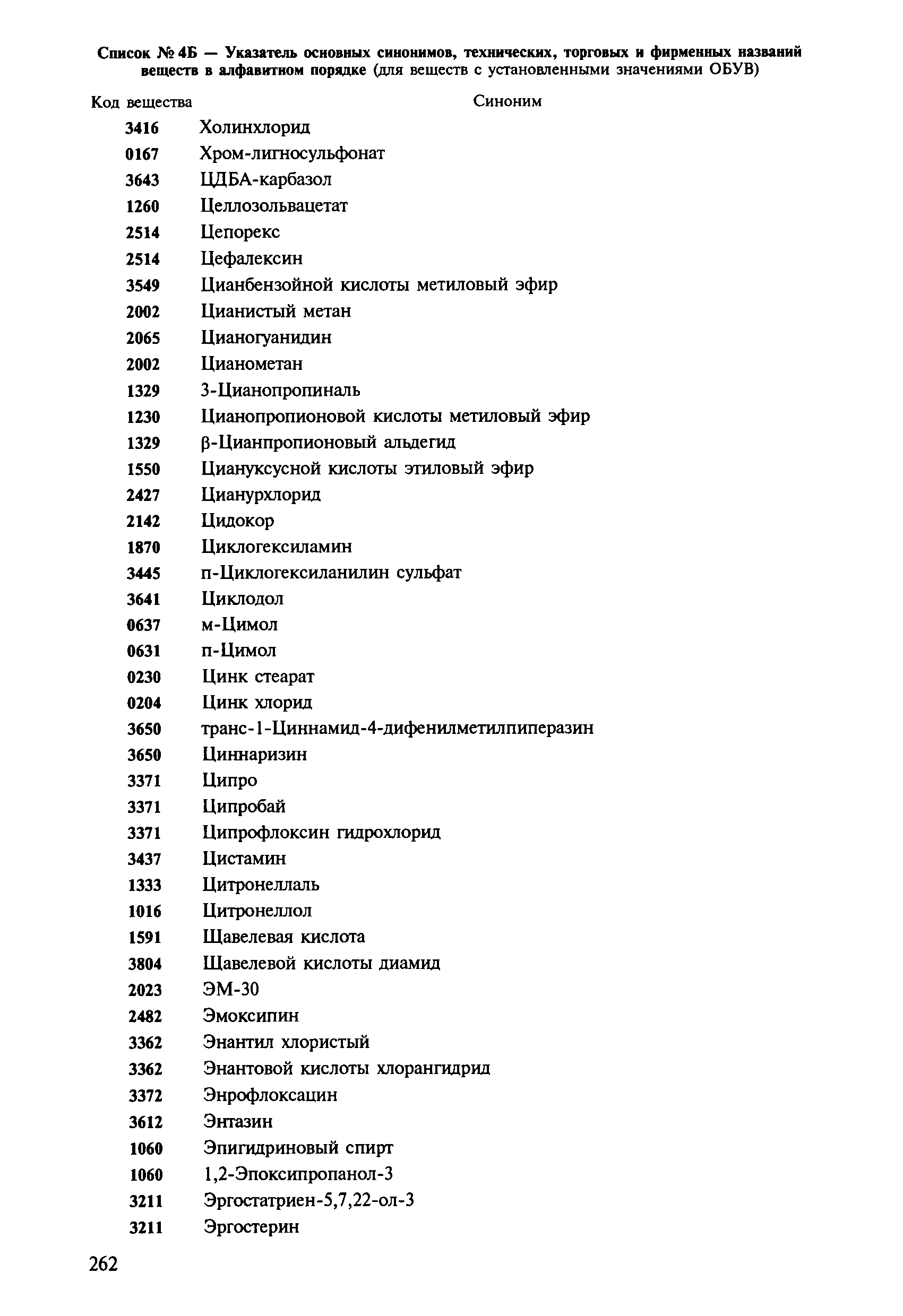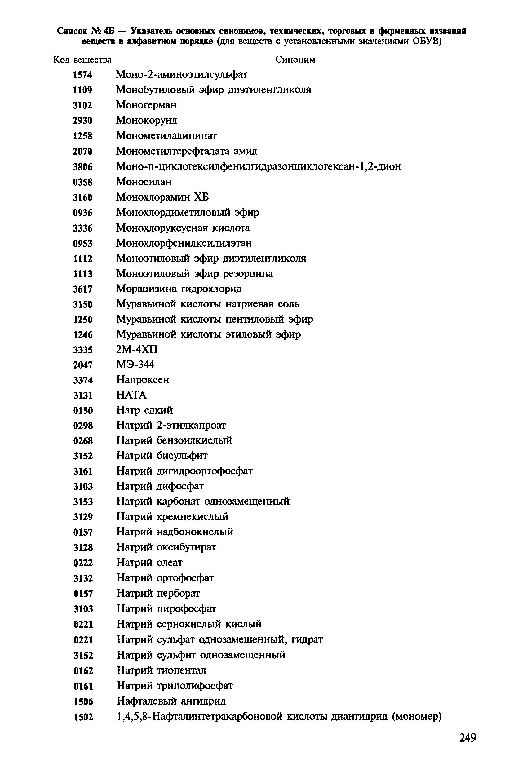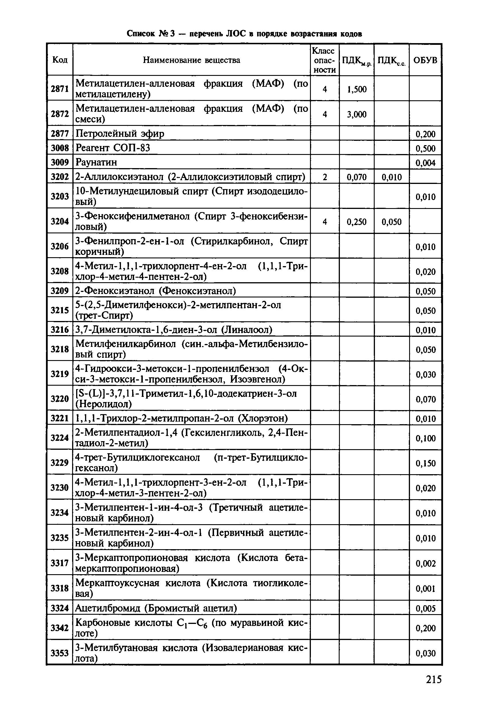| Оглавление: | Список № 1 Перечень загрязняющих веществ в алфавитном порядке Список № 2 Перечень загрязняющих веществ в порядке возрастания кодов Список № 3 Перечень ЛОС в порядке возрастания кодов Список № 4 Указатель основных синонимов, технических, торговых и фирменных названий веществ в алфавитном порядке А. Для веществ с установленными значениями ПДК Б. Для веществ с установленными значениями ОБУВ Список № 5 Указатель основных синонимов, технических, торговых и фирменных названий веществ в порядке возрастания кодов А. Для веществ с установленными значениями ПДК Б. Для веществ с установленными значениями ОБУВ |