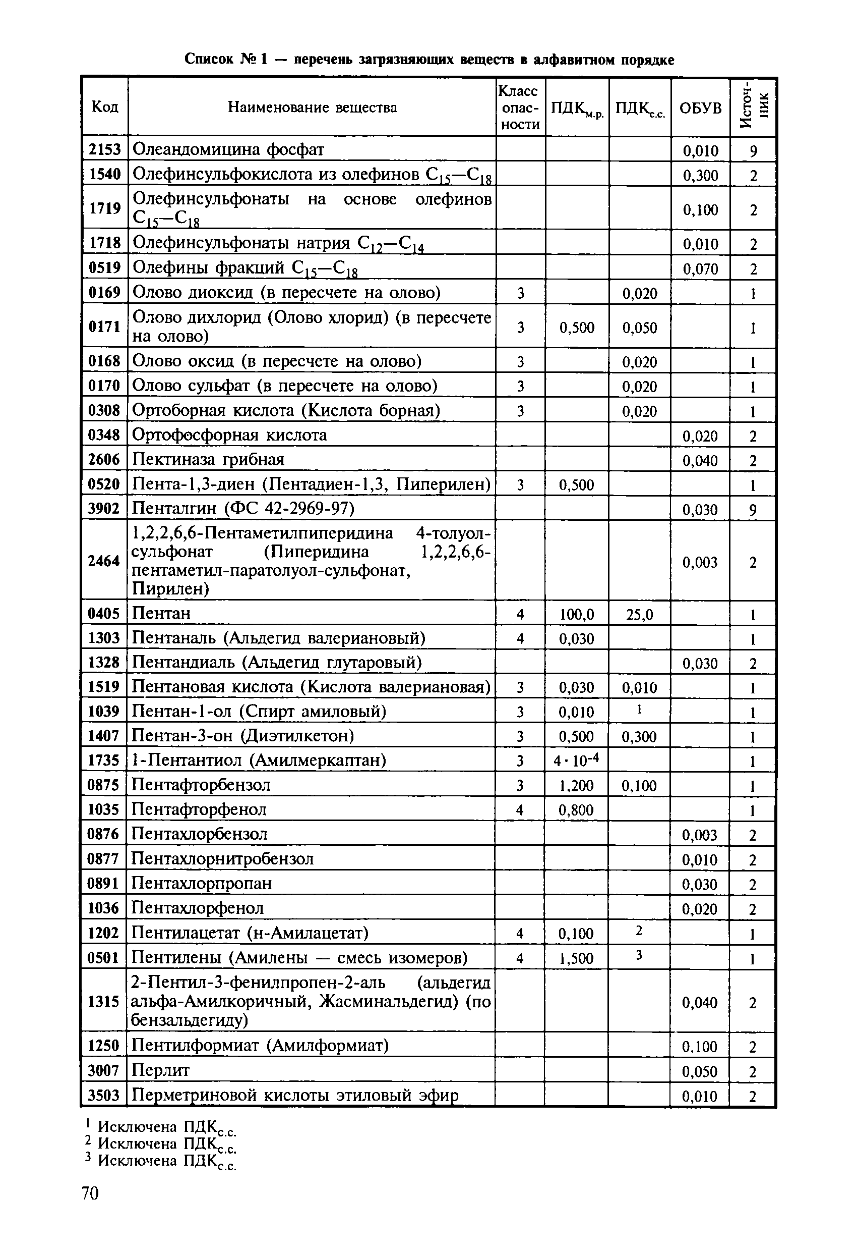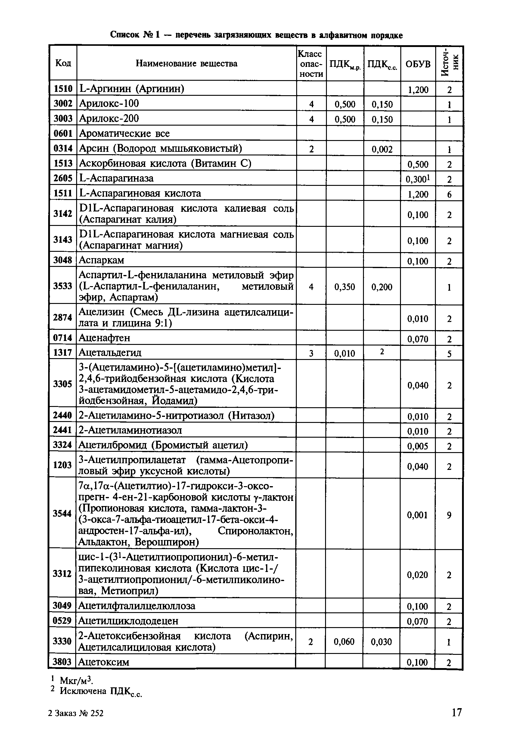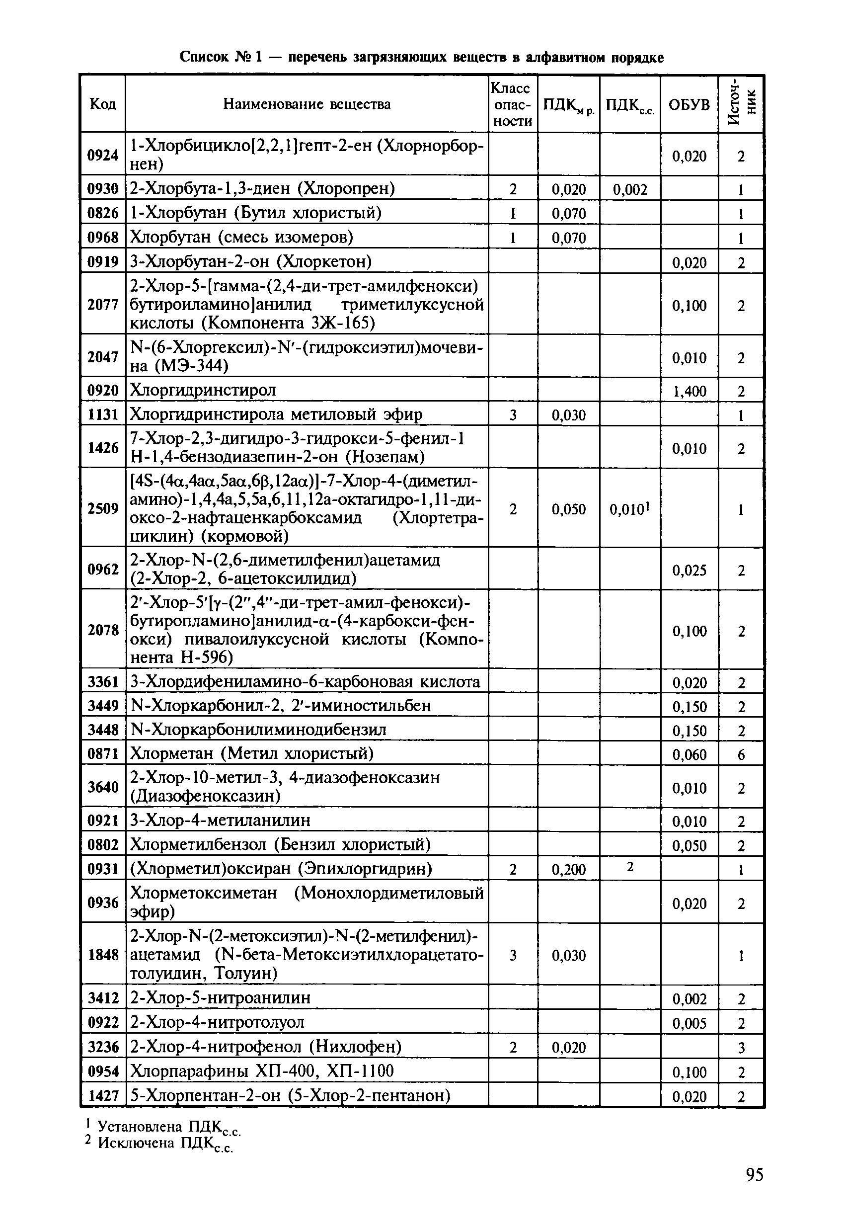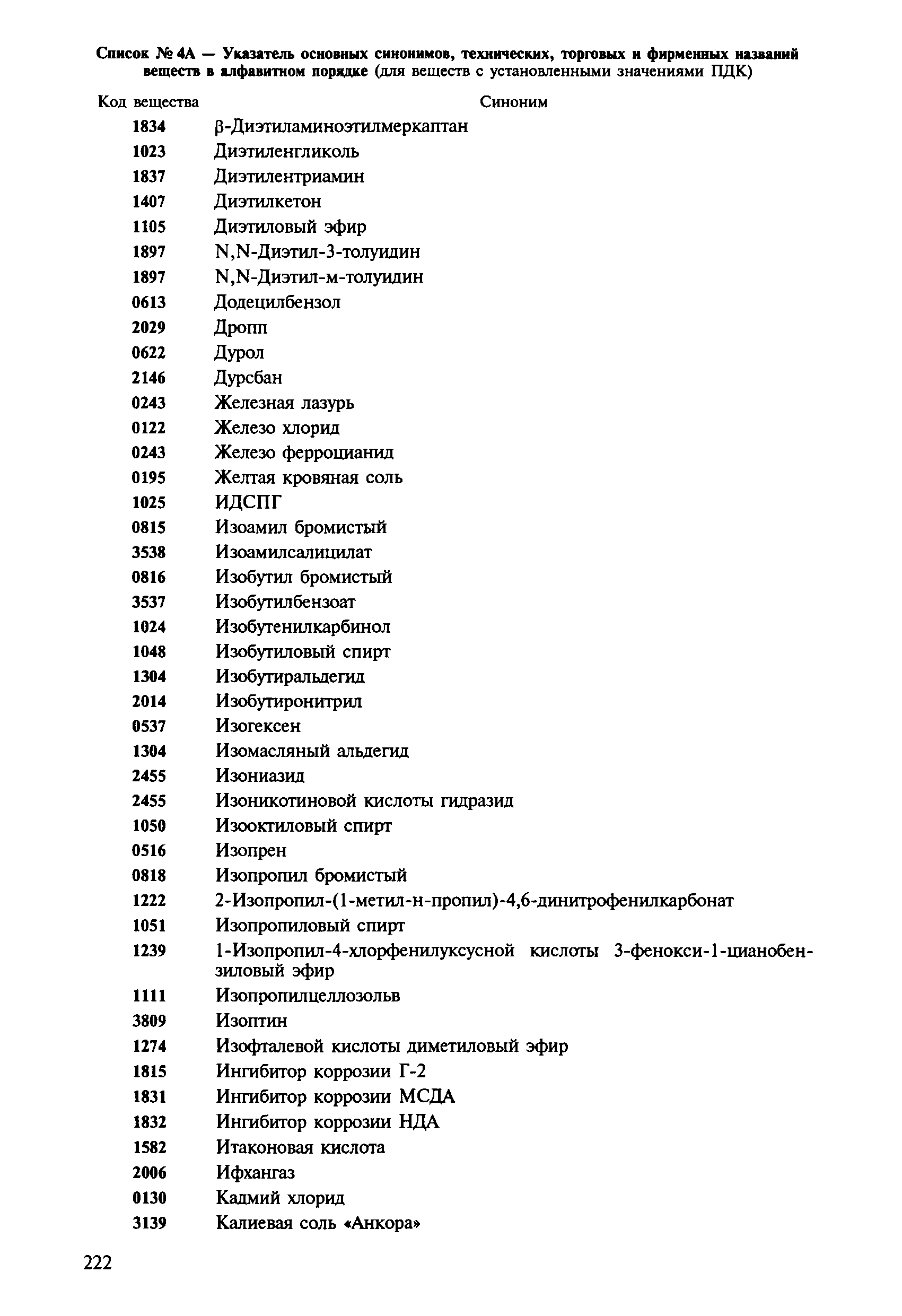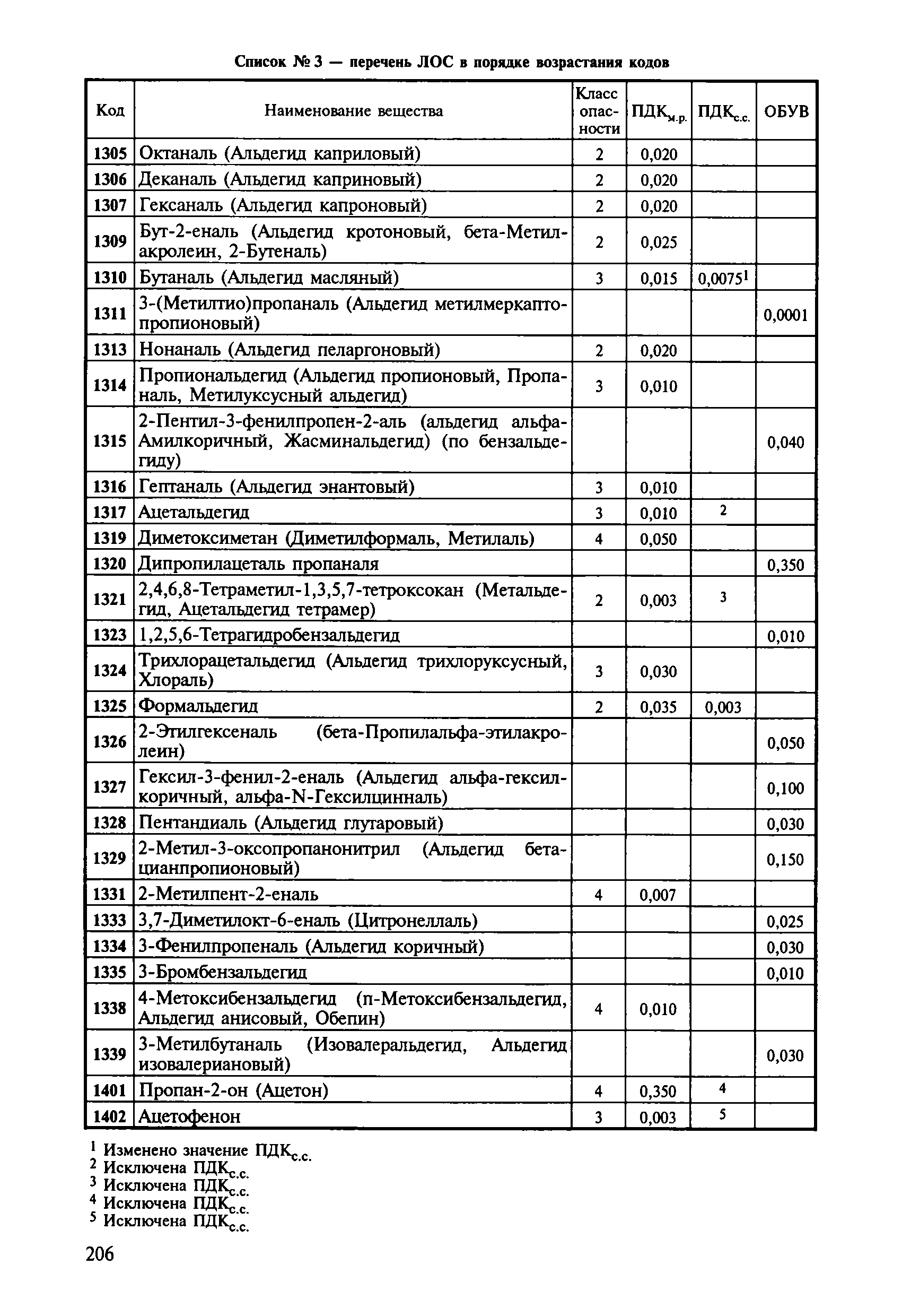 | Оглавление: | Список № 1 Перечень загрязняющих веществ в алфавитном порядке Список № 2 Перечень загрязняющих веществ в порядке возрастания кодов Список № 3 Перечень ЛОС в порядке возрастания кодов Список № 4 Указатель основных синонимов, технических, торговых и фирменных названий веществ в алфавитном порядке А. Для веществ с установленными значениями ПДК Б. Для веществ с установленными значениями ОБУВ Список № 5 Указатель основных синонимов, технических, торговых и фирменных названий веществ в порядке возрастания кодов А. Для веществ с установленными значениями ПДК Б. Для веществ с установленными значениями ОБУВ |