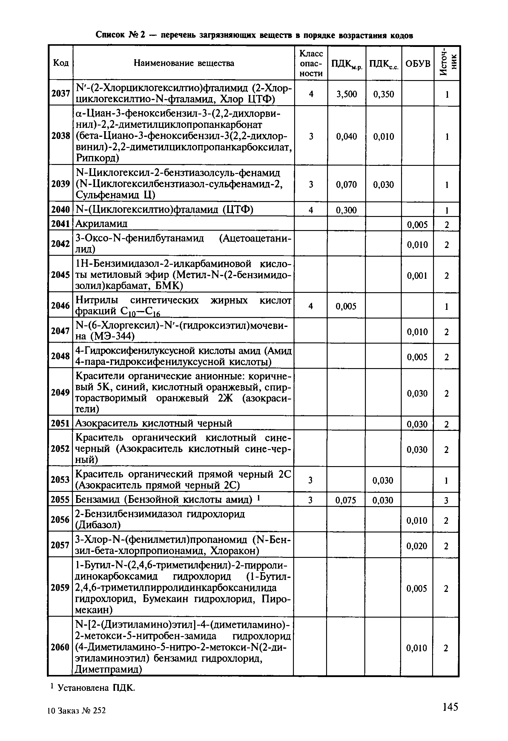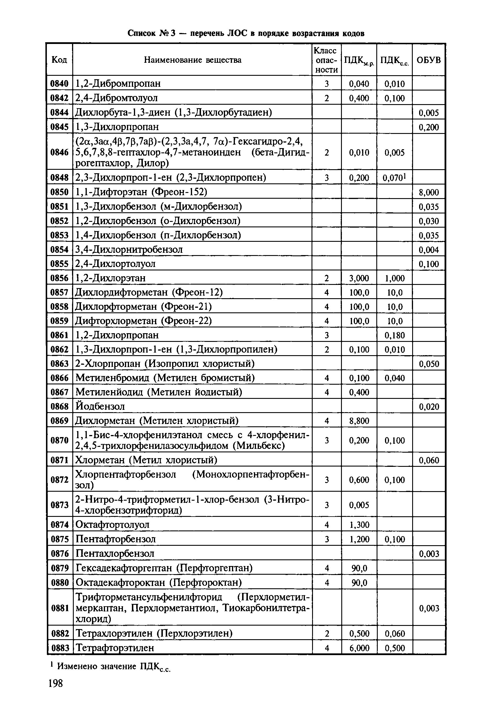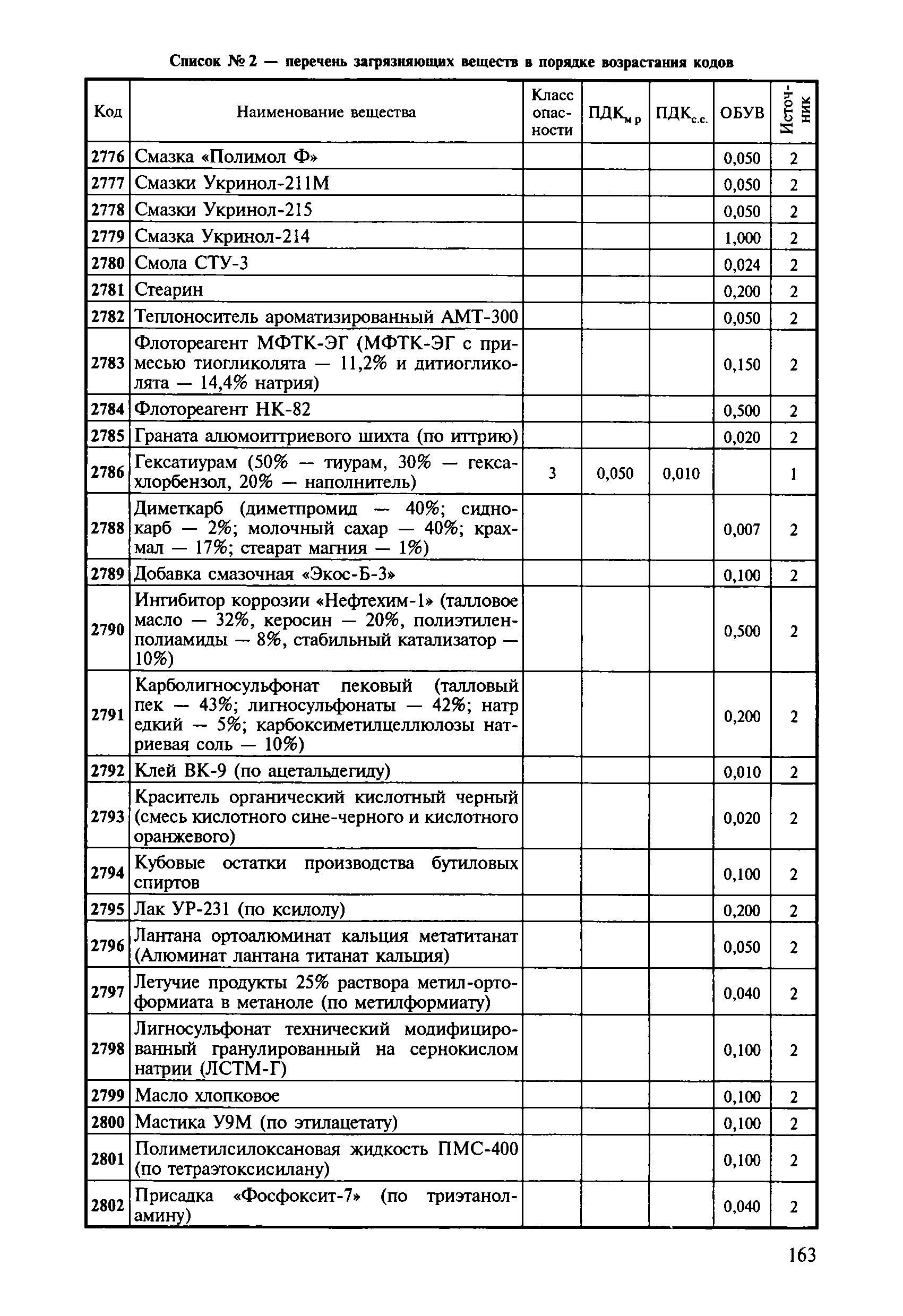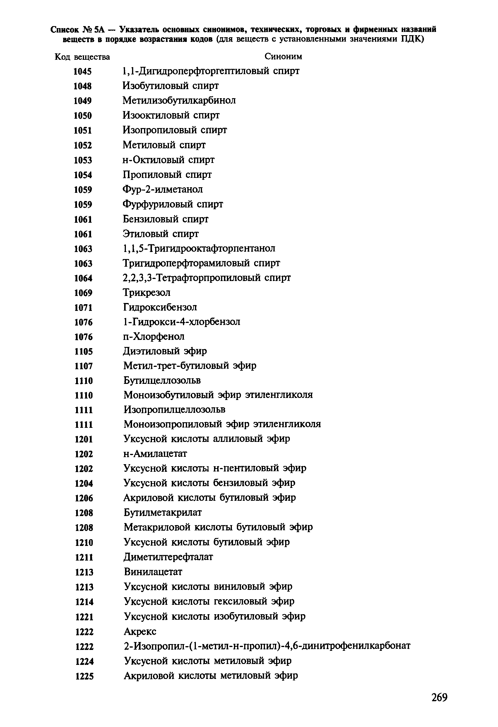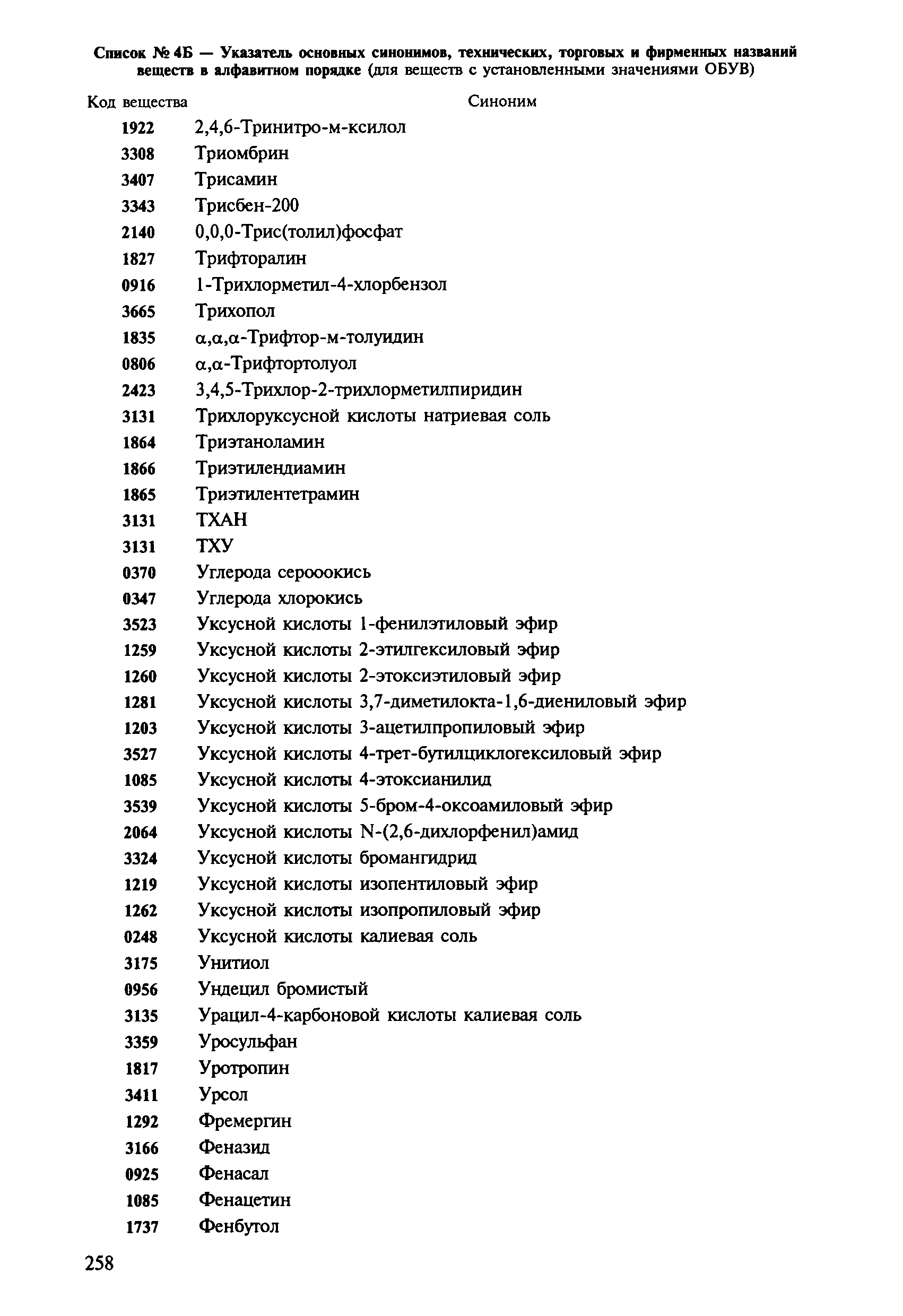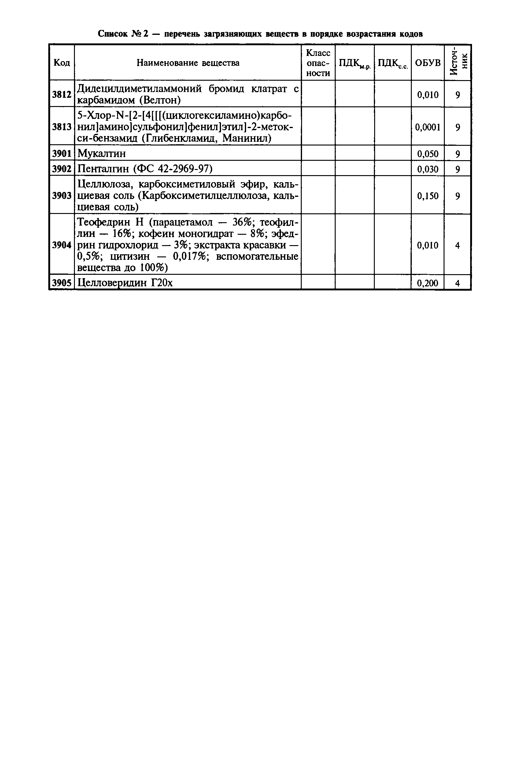 | Оглавление: | Список № 1 Перечень загрязняющих веществ в алфавитном порядке Список № 2 Перечень загрязняющих веществ в порядке возрастания кодов Список № 3 Перечень ЛОС в порядке возрастания кодов Список № 4 Указатель основных синонимов, технических, торговых и фирменных названий веществ в алфавитном порядке А. Для веществ с установленными значениями ПДК Б. Для веществ с установленными значениями ОБУВ Список № 5 Указатель основных синонимов, технических, торговых и фирменных названий веществ в порядке возрастания кодов А. Для веществ с установленными значениями ПДК Б. Для веществ с установленными значениями ОБУВ |