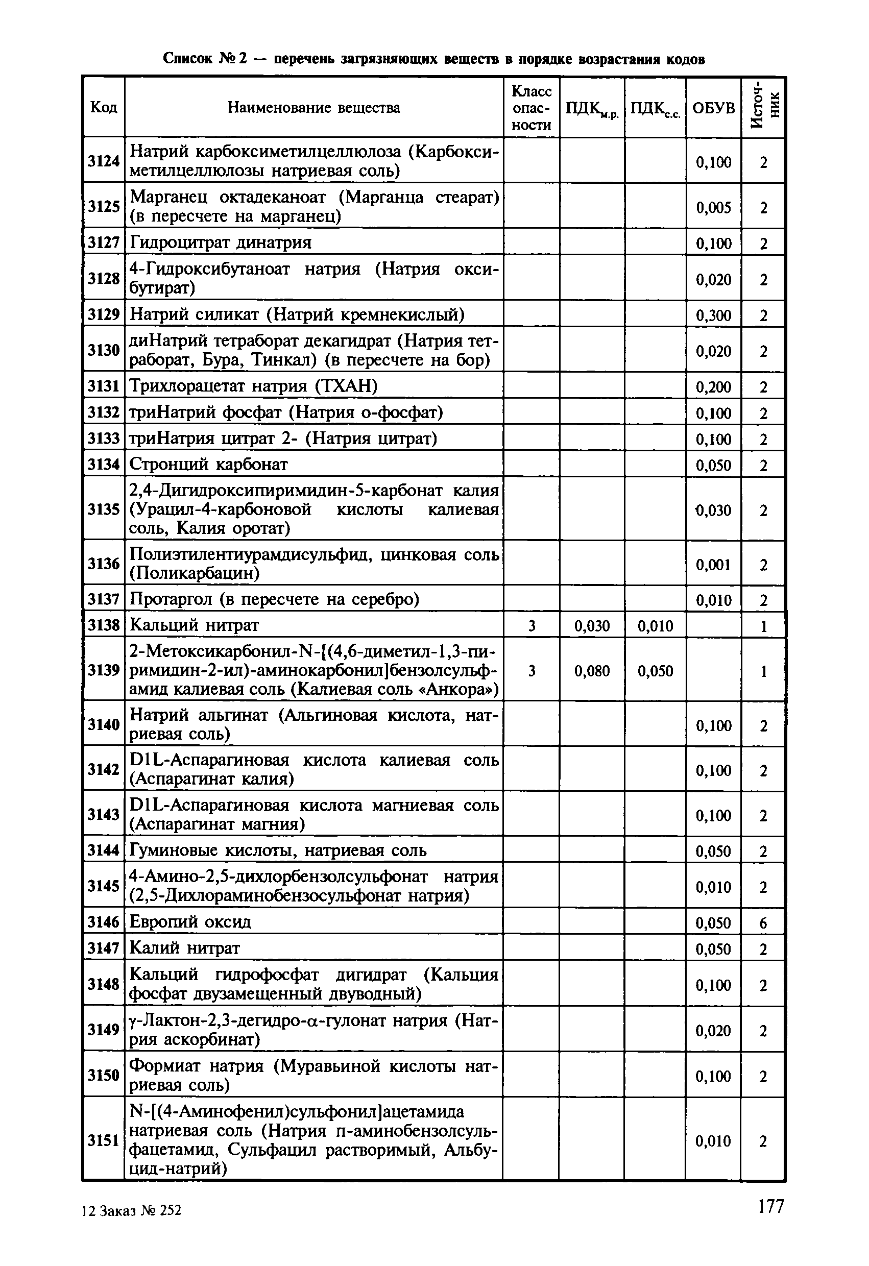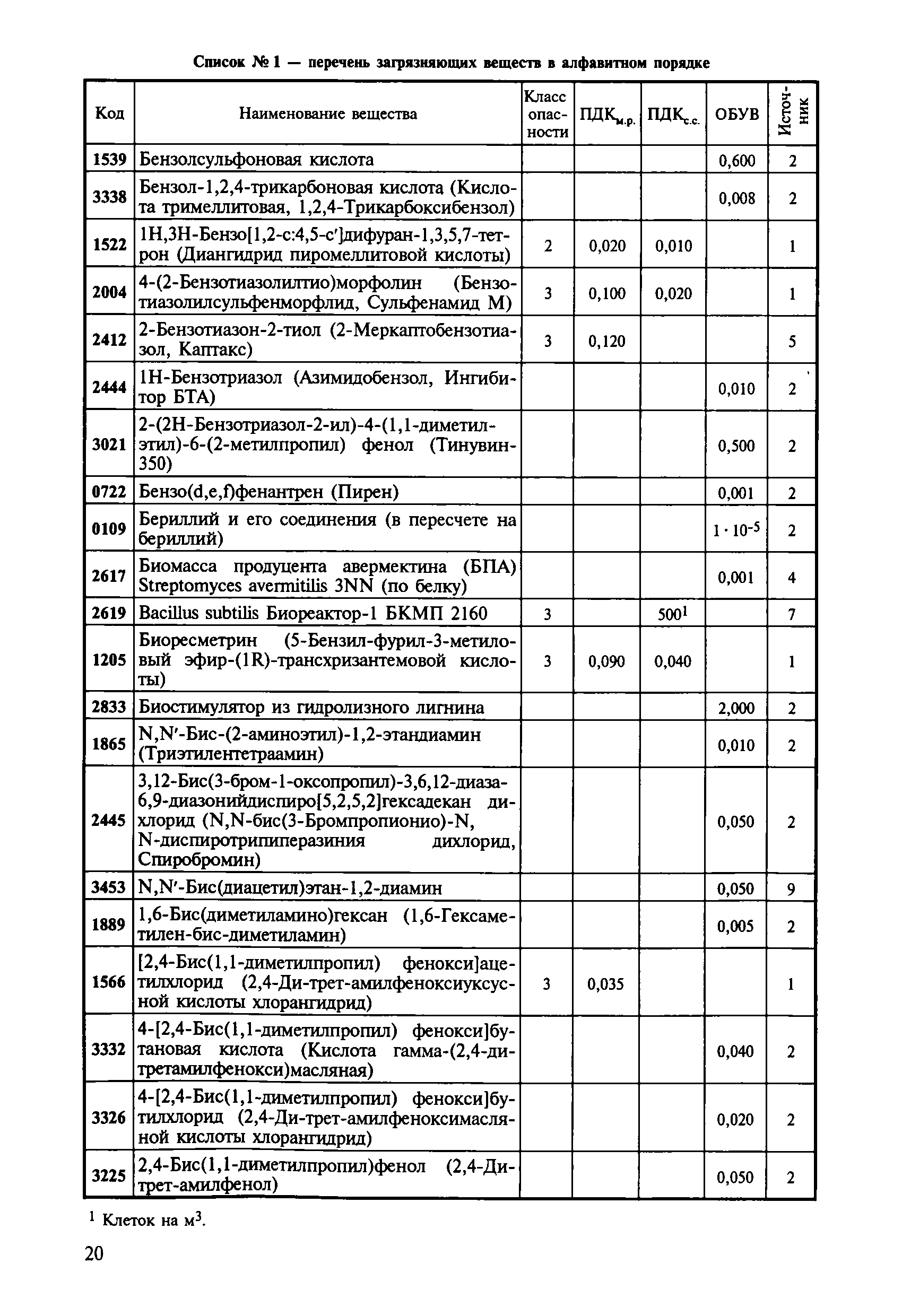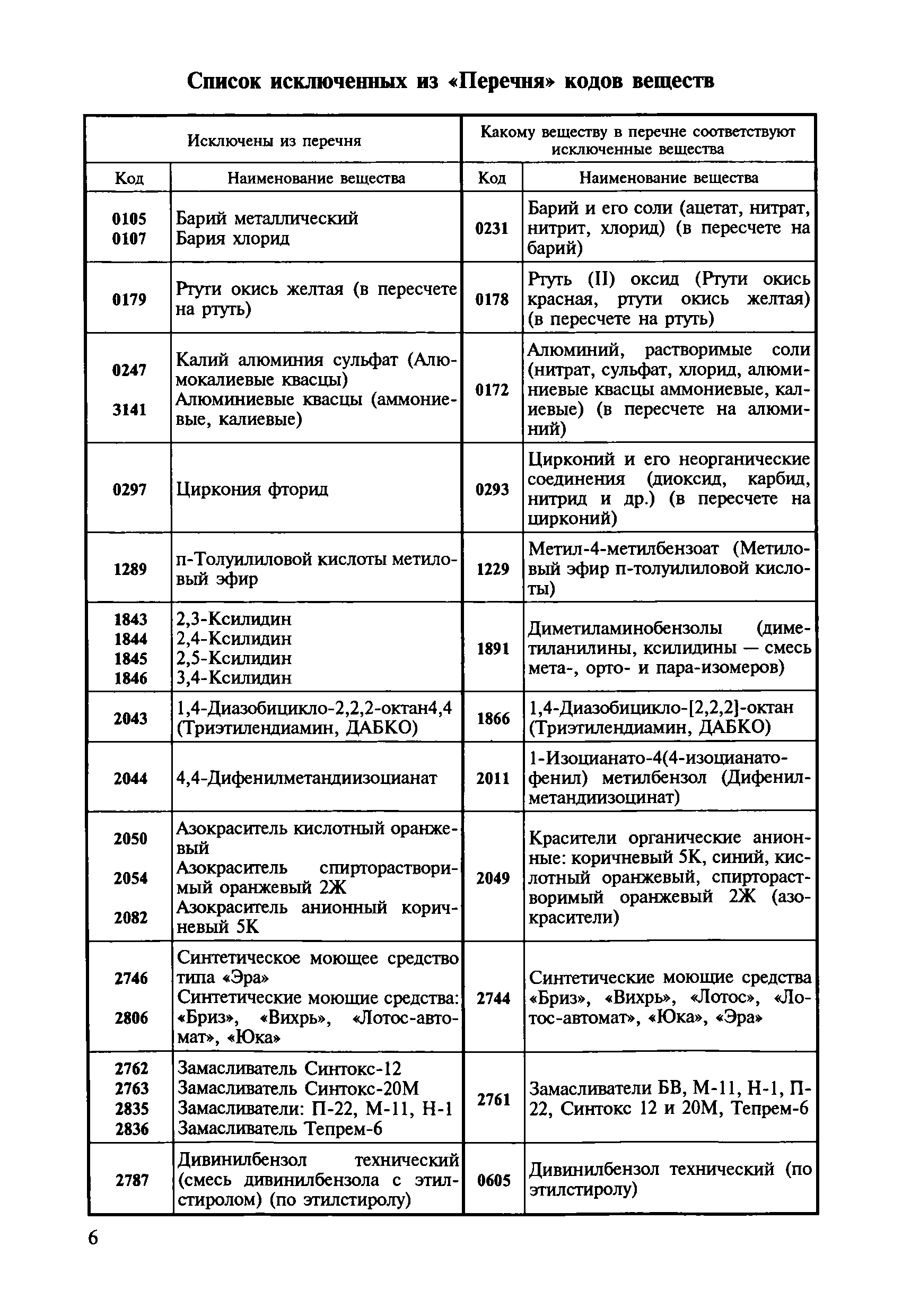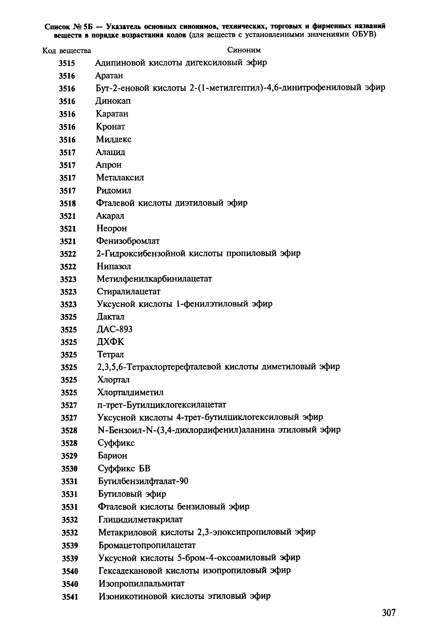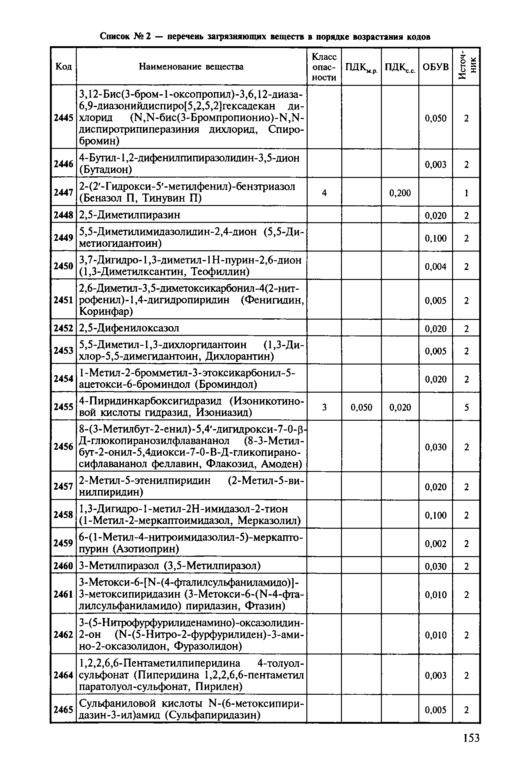 | Оглавление: | Список № 1 Перечень загрязняющих веществ в алфавитном порядке Список № 2 Перечень загрязняющих веществ в порядке возрастания кодов Список № 3 Перечень ЛОС в порядке возрастания кодов Список № 4 Указатель основных синонимов, технических, торговых и фирменных названий веществ в алфавитном порядке А. Для веществ с установленными значениями ПДК Б. Для веществ с установленными значениями ОБУВ Список № 5 Указатель основных синонимов, технических, торговых и фирменных названий веществ в порядке возрастания кодов А. Для веществ с установленными значениями ПДК Б. Для веществ с установленными значениями ОБУВ |
