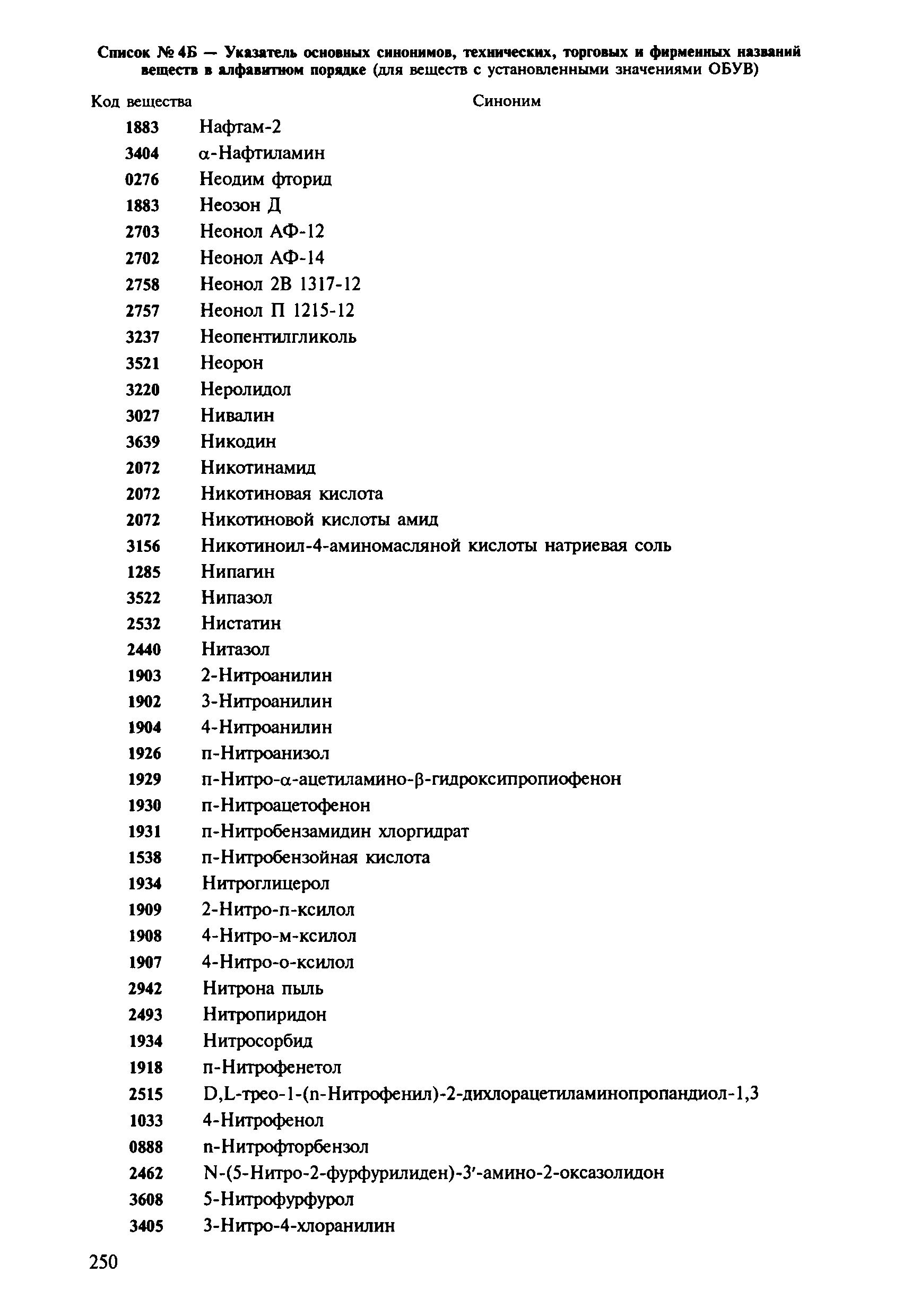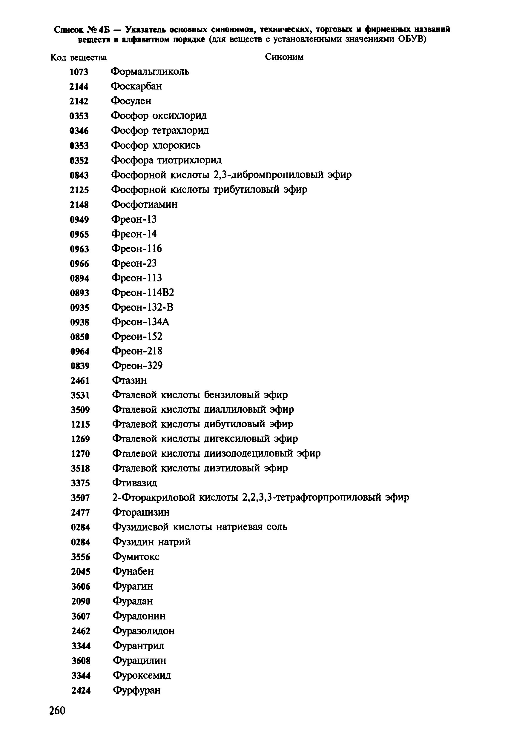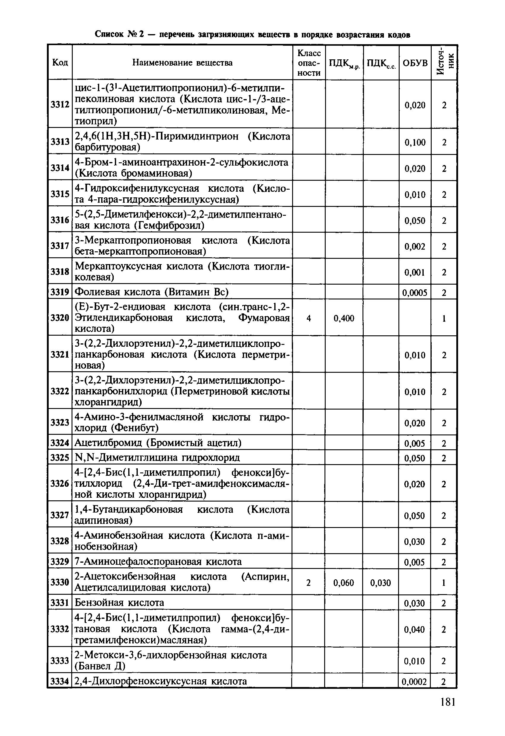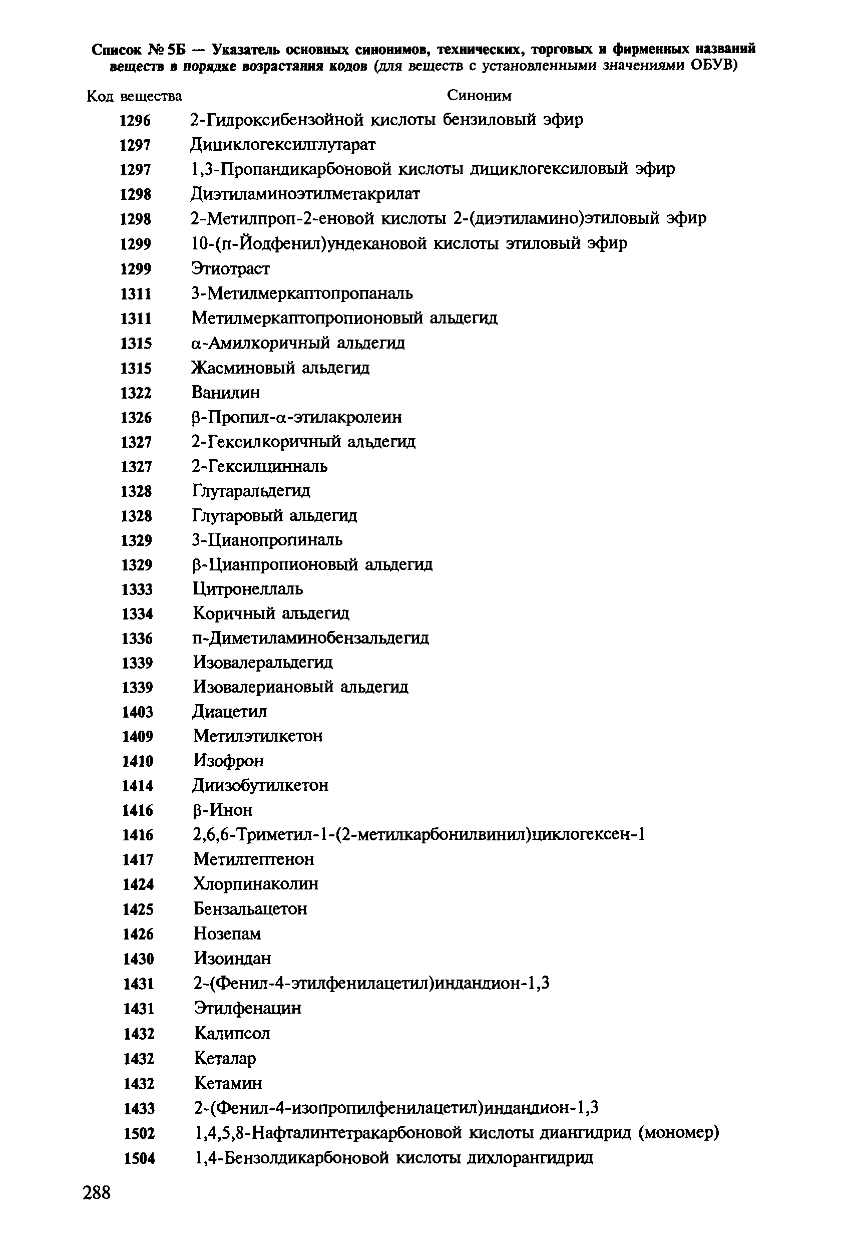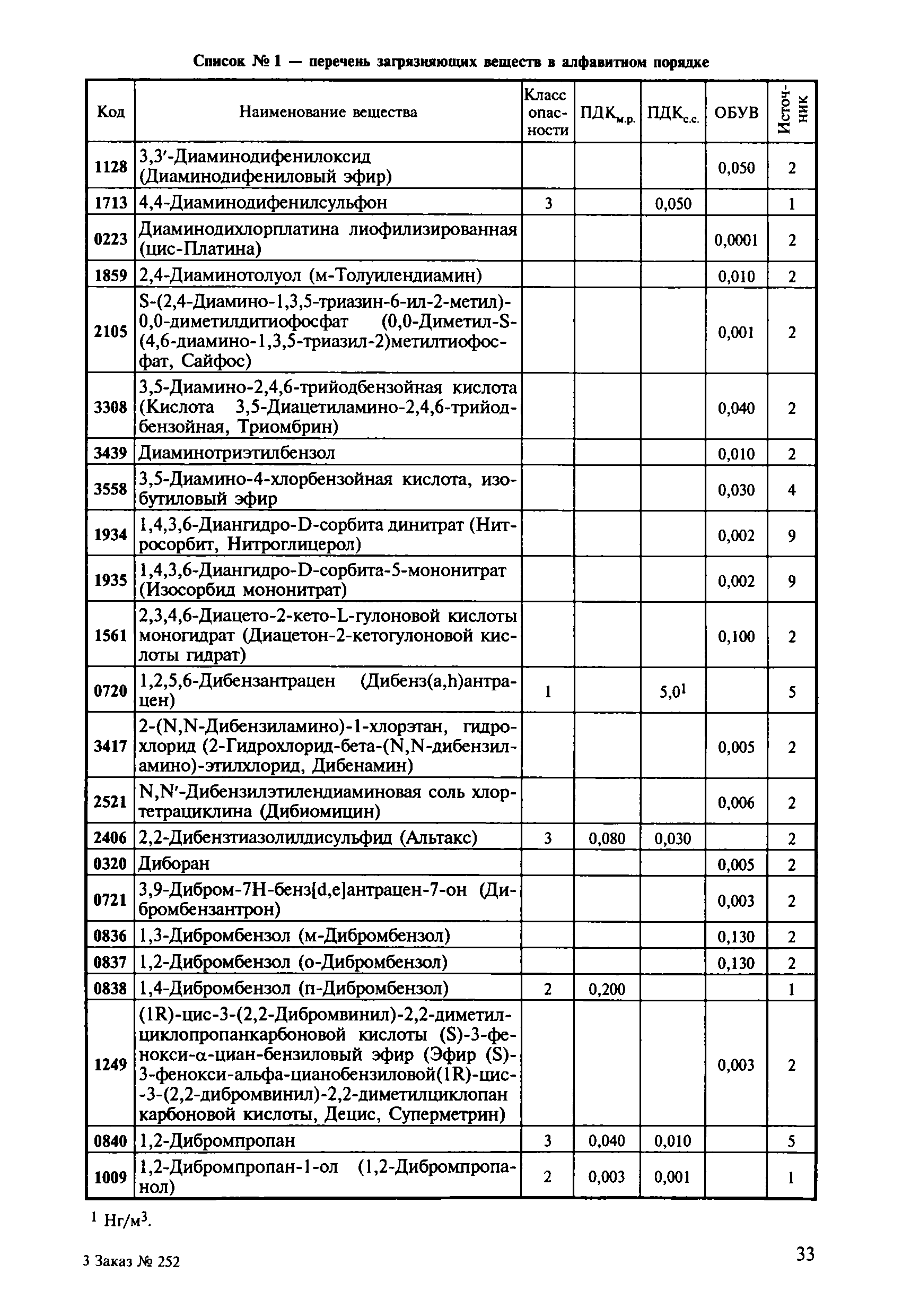 | Оглавление: | Список № 1 Перечень загрязняющих веществ в алфавитном порядке Список № 2 Перечень загрязняющих веществ в порядке возрастания кодов Список № 3 Перечень ЛОС в порядке возрастания кодов Список № 4 Указатель основных синонимов, технических, торговых и фирменных названий веществ в алфавитном порядке А. Для веществ с установленными значениями ПДК Б. Для веществ с установленными значениями ОБУВ Список № 5 Указатель основных синонимов, технических, торговых и фирменных названий веществ в порядке возрастания кодов А. Для веществ с установленными значениями ПДК Б. Для веществ с установленными значениями ОБУВ |