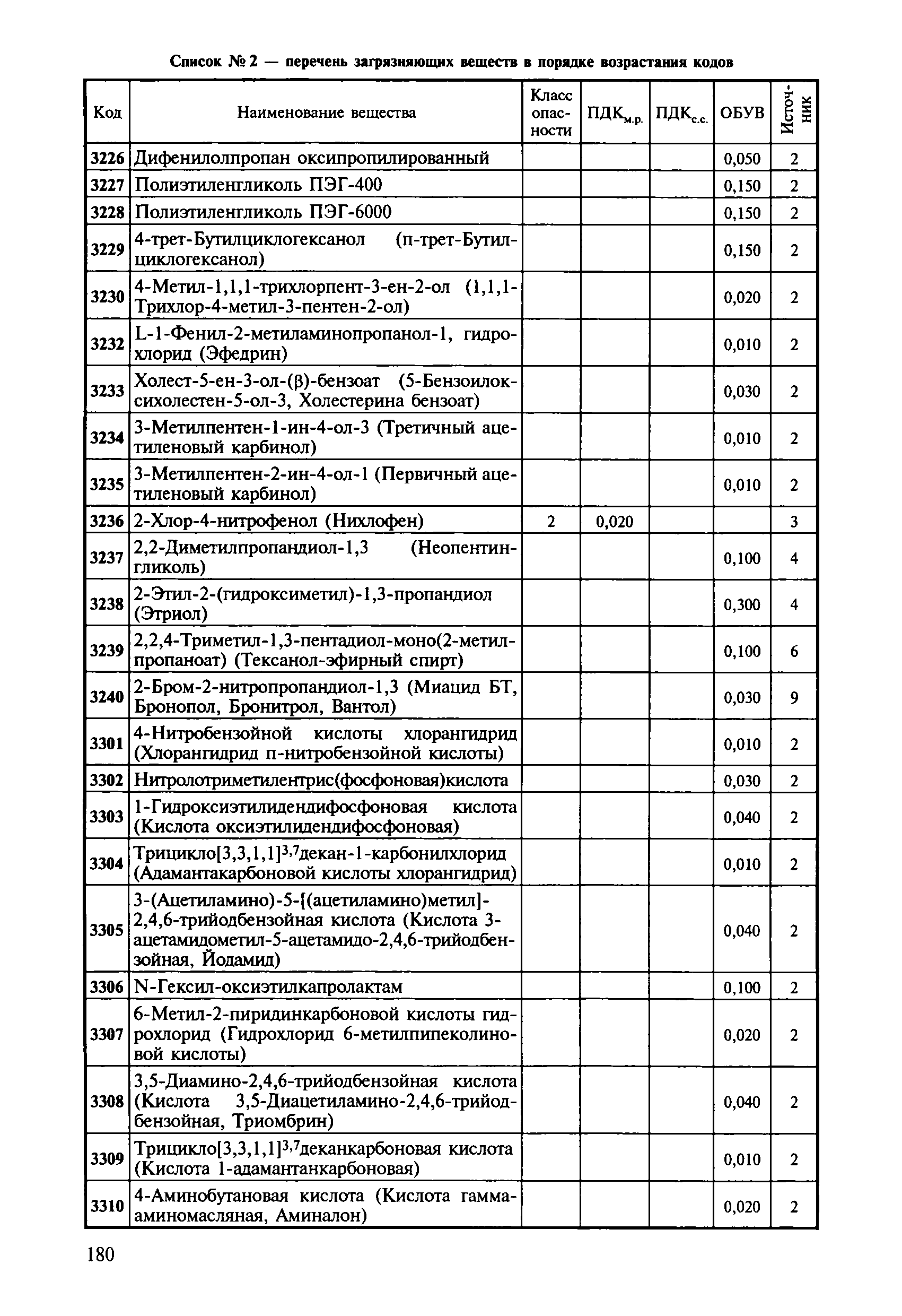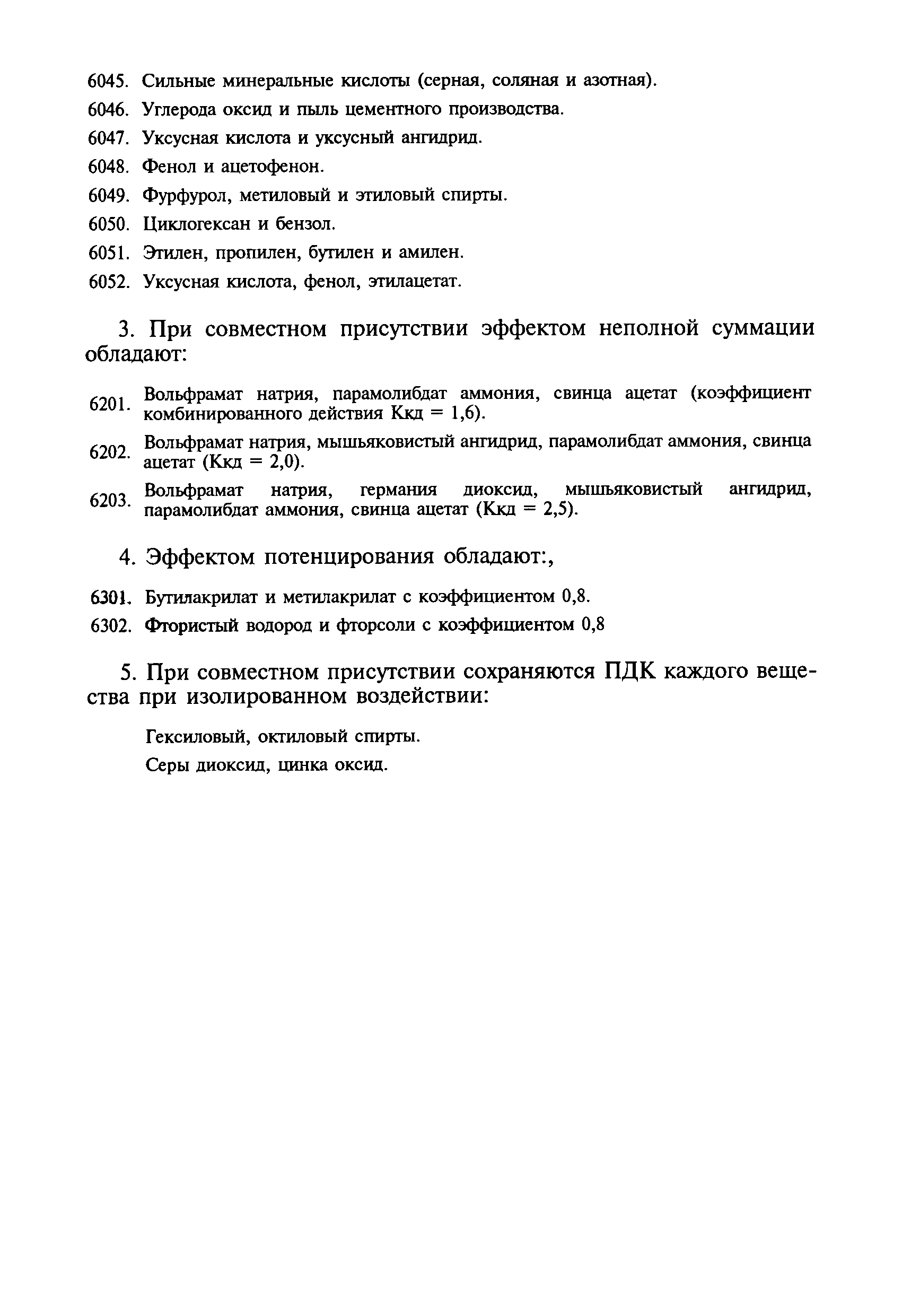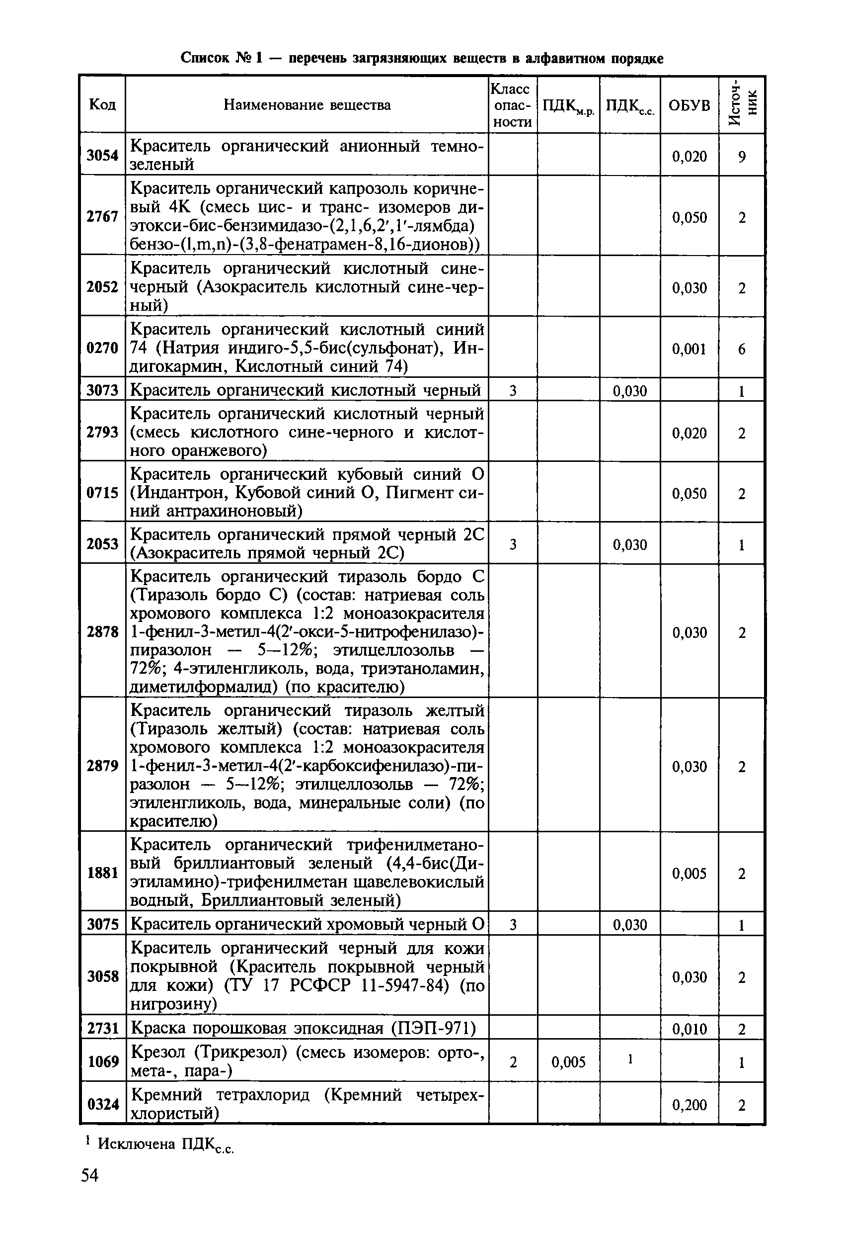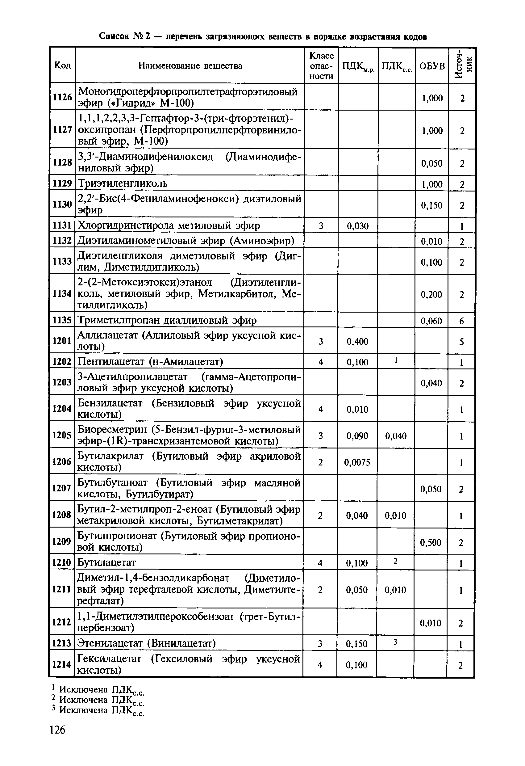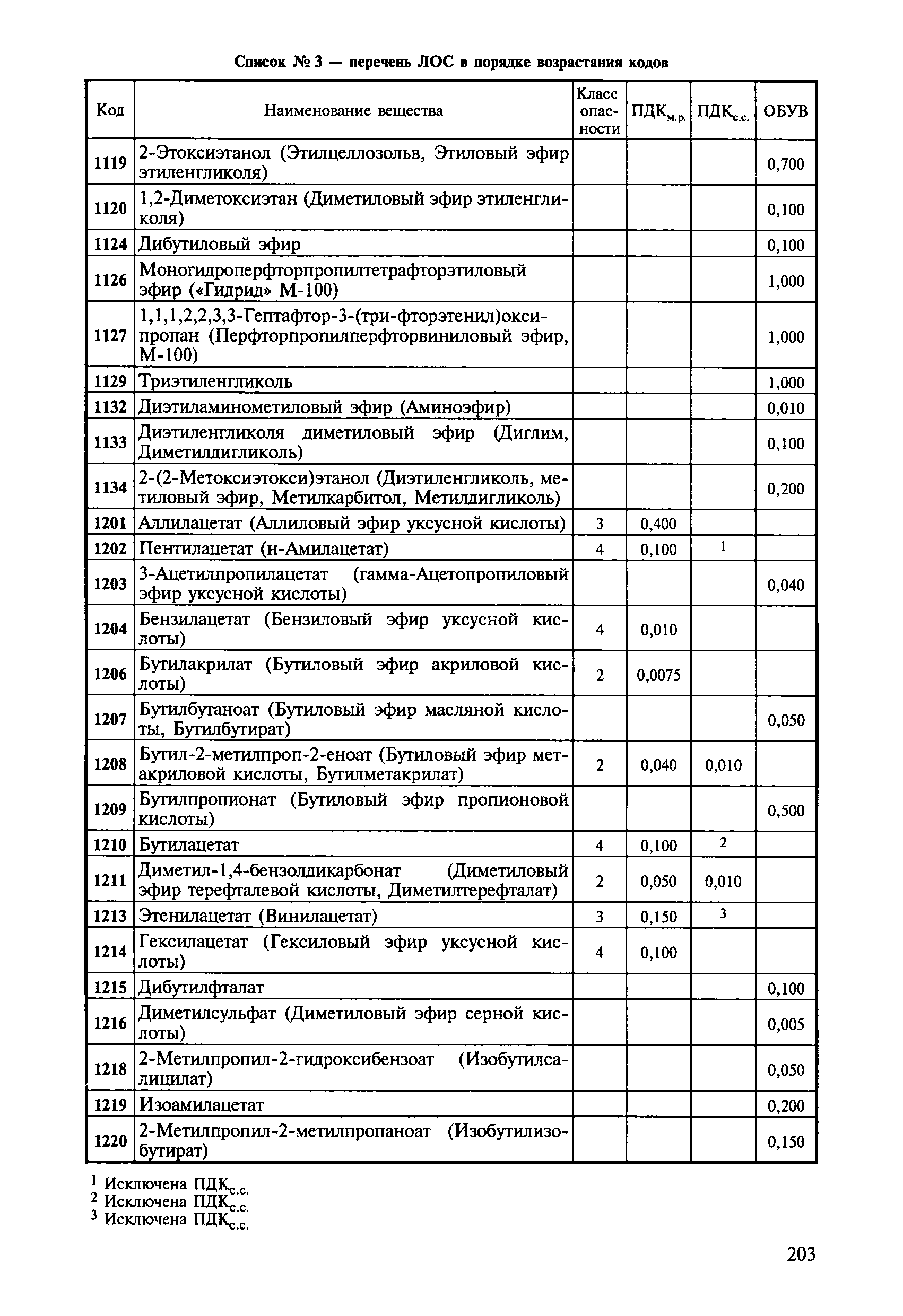 | Оглавление: | Список № 1 Перечень загрязняющих веществ в алфавитном порядке Список № 2 Перечень загрязняющих веществ в порядке возрастания кодов Список № 3 Перечень ЛОС в порядке возрастания кодов Список № 4 Указатель основных синонимов, технических, торговых и фирменных названий веществ в алфавитном порядке А. Для веществ с установленными значениями ПДК Б. Для веществ с установленными значениями ОБУВ Список № 5 Указатель основных синонимов, технических, торговых и фирменных названий веществ в порядке возрастания кодов А. Для веществ с установленными значениями ПДК Б. Для веществ с установленными значениями ОБУВ |
