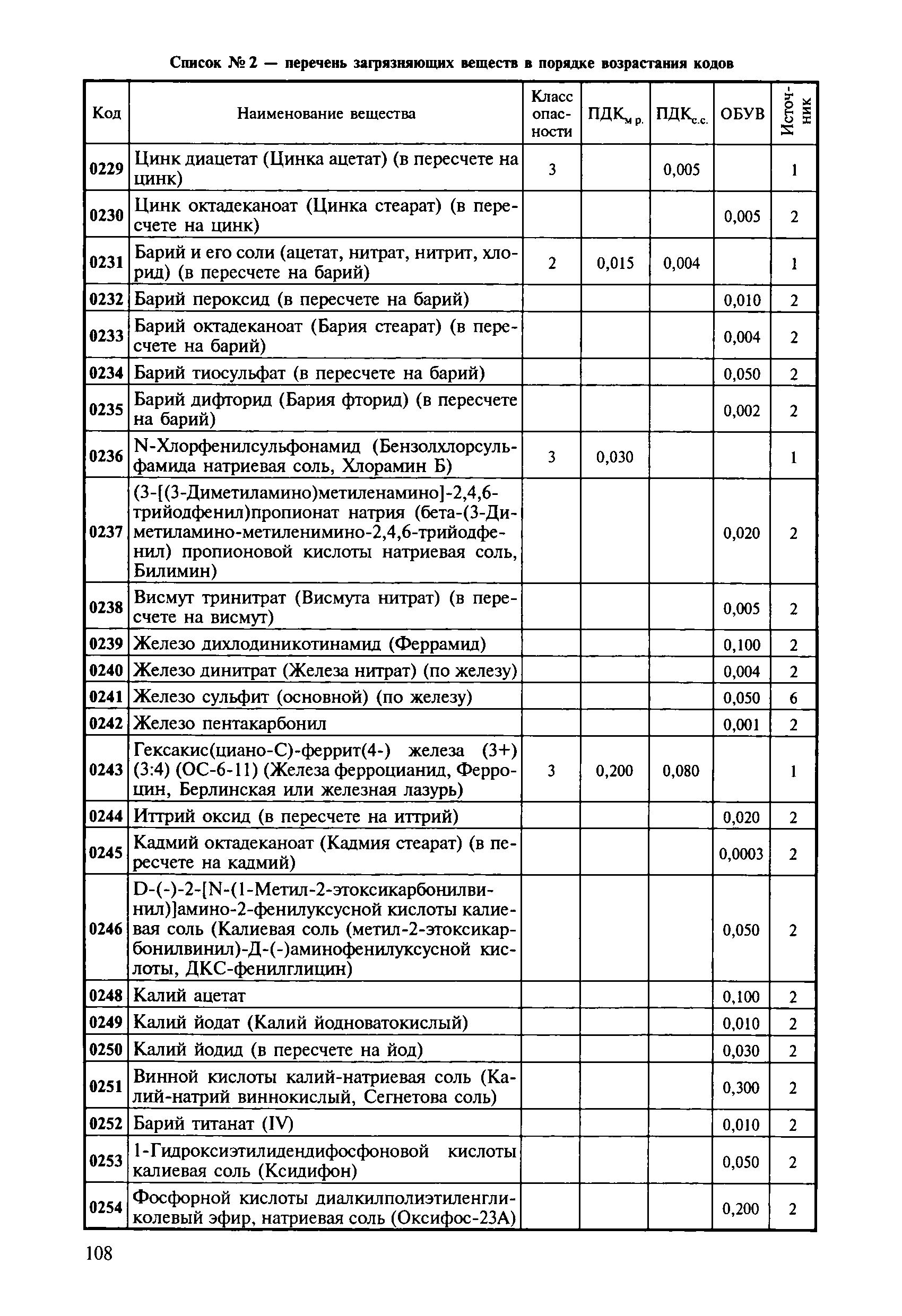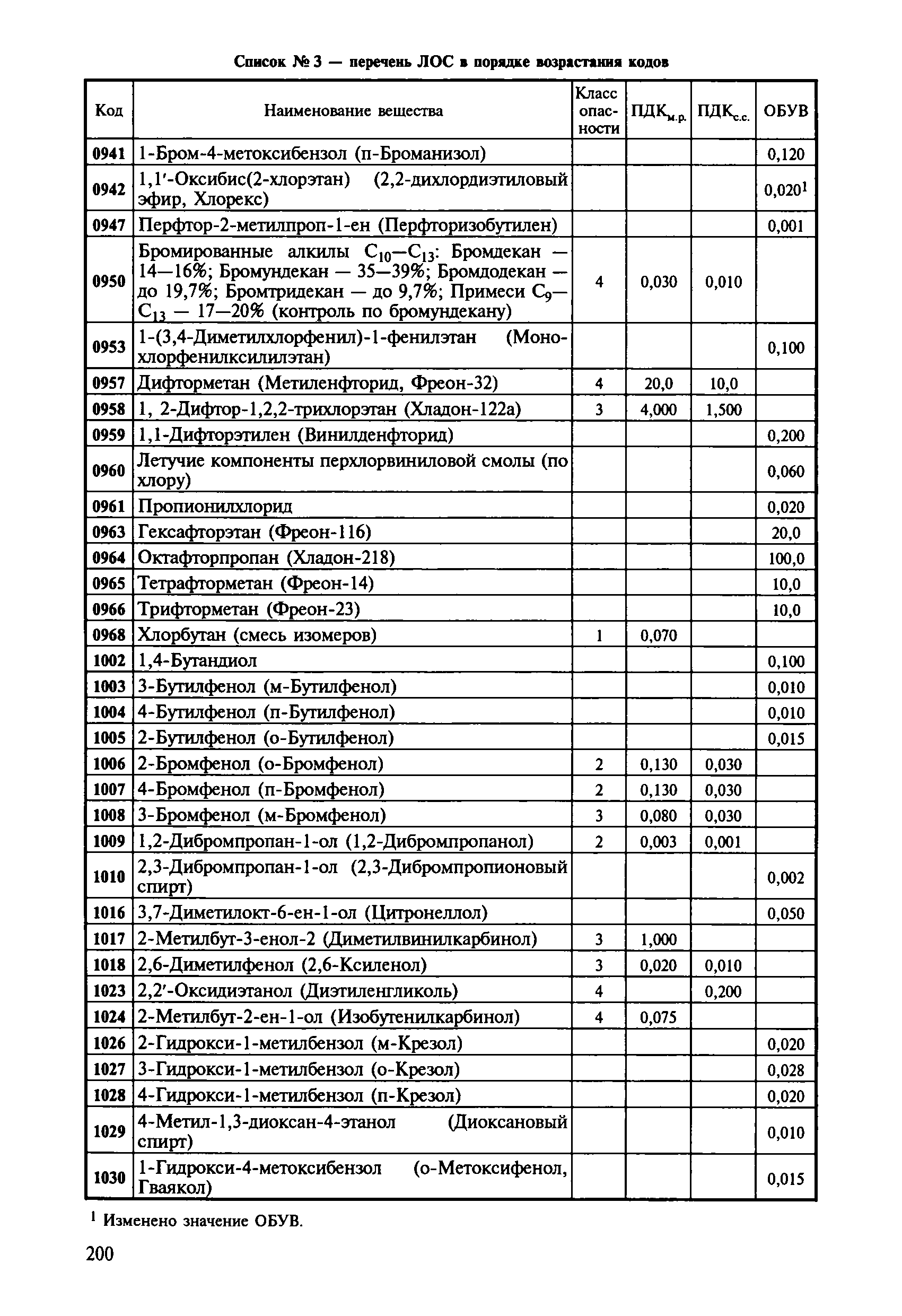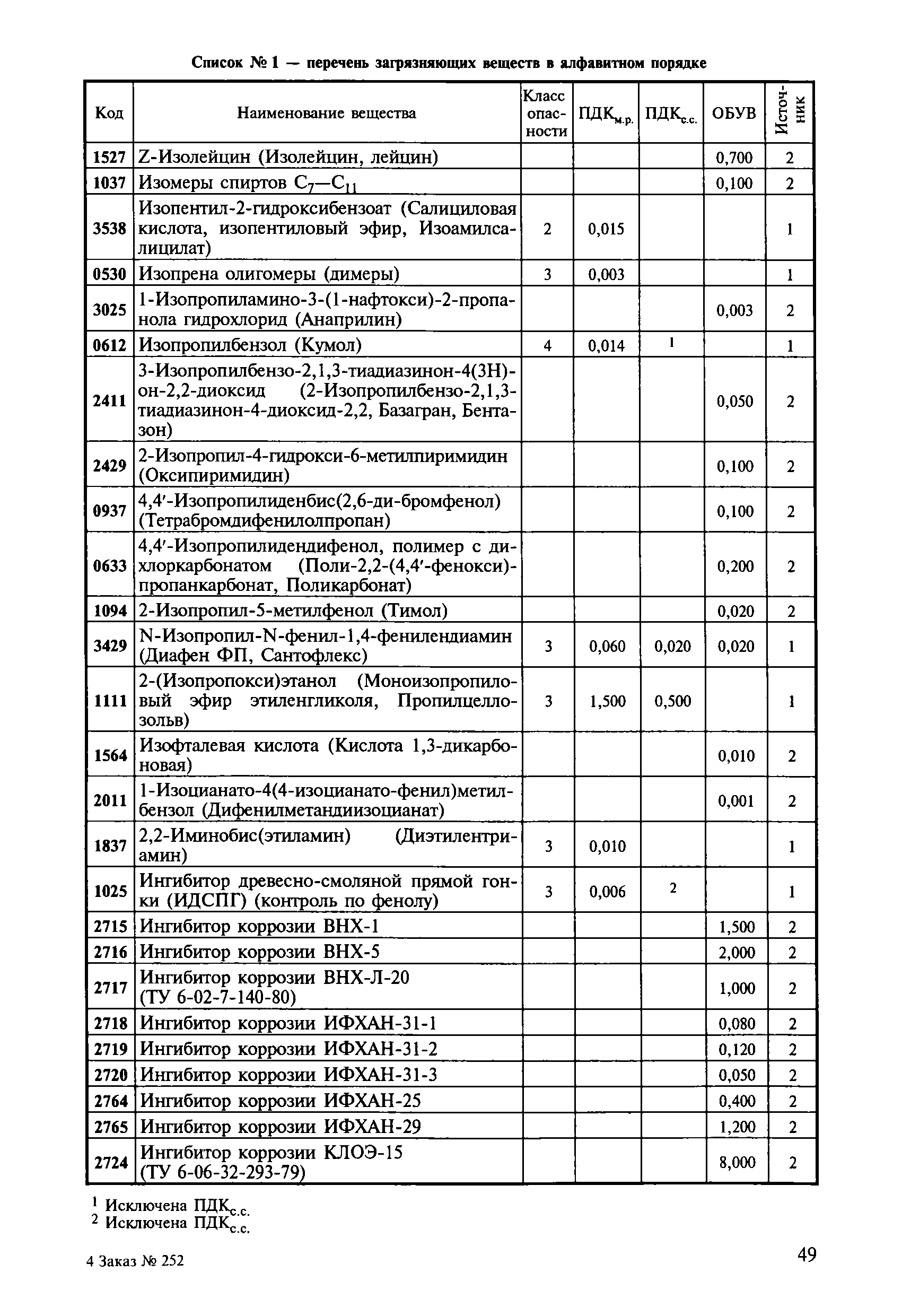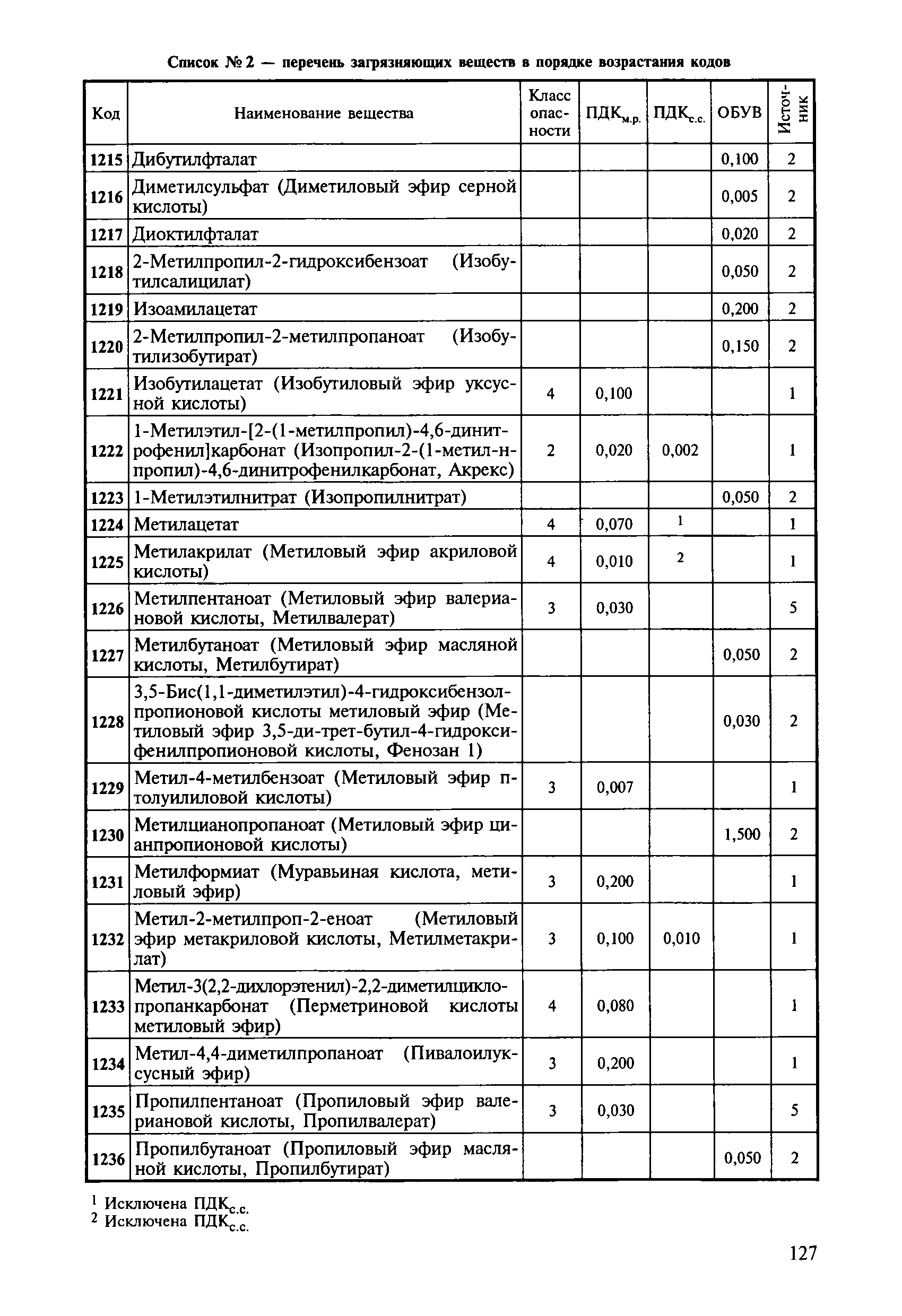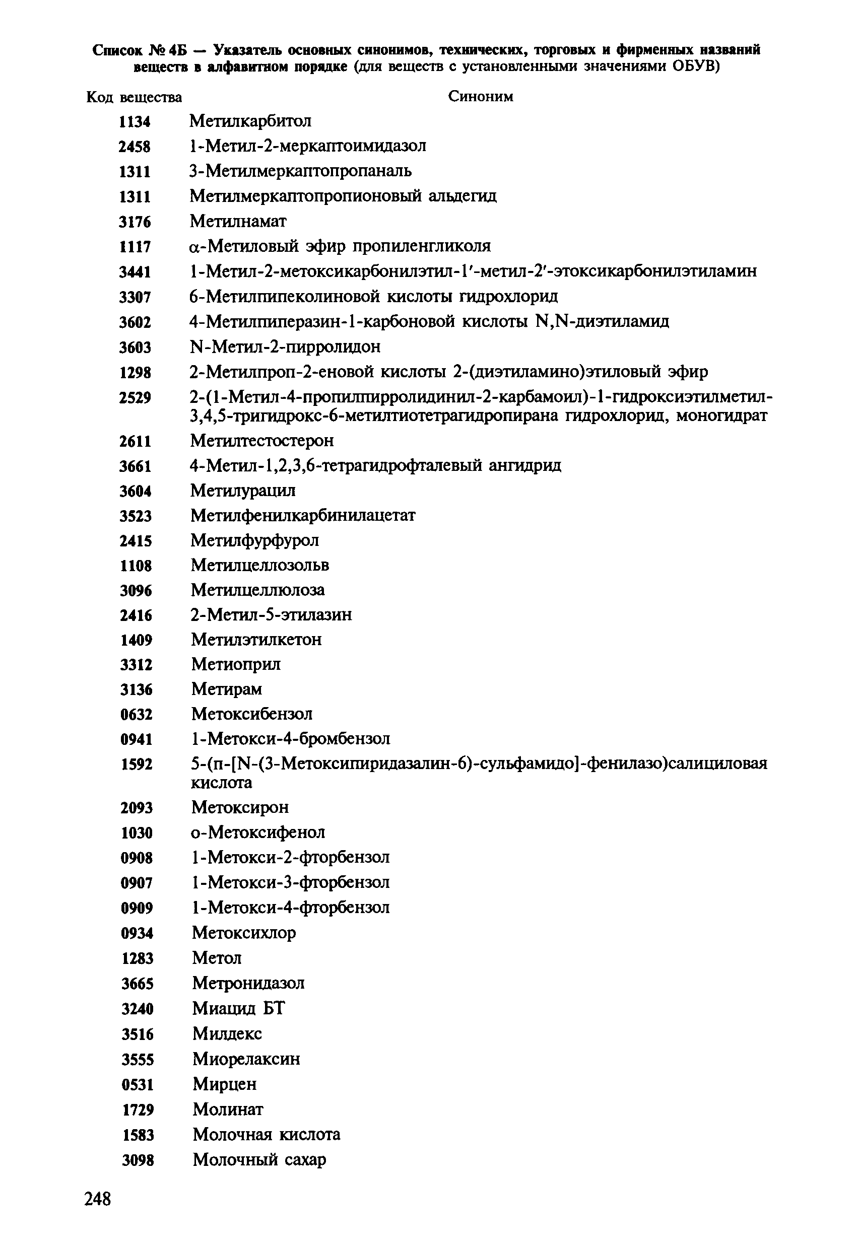 | Оглавление: | Список № 1 Перечень загрязняющих веществ в алфавитном порядке Список № 2 Перечень загрязняющих веществ в порядке возрастания кодов Список № 3 Перечень ЛОС в порядке возрастания кодов Список № 4 Указатель основных синонимов, технических, торговых и фирменных названий веществ в алфавитном порядке А. Для веществ с установленными значениями ПДК Б. Для веществ с установленными значениями ОБУВ Список № 5 Указатель основных синонимов, технических, торговых и фирменных названий веществ в порядке возрастания кодов А. Для веществ с установленными значениями ПДК Б. Для веществ с установленными значениями ОБУВ |