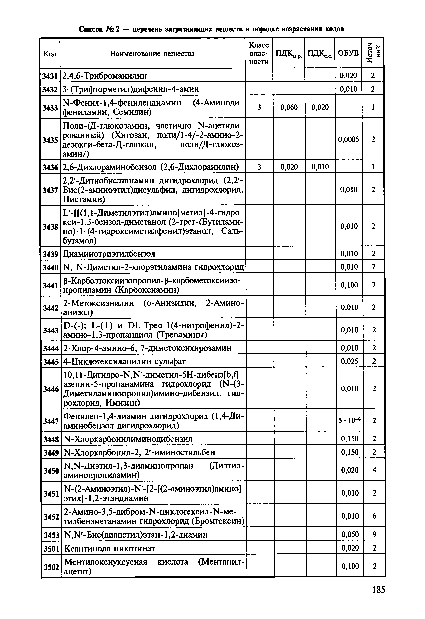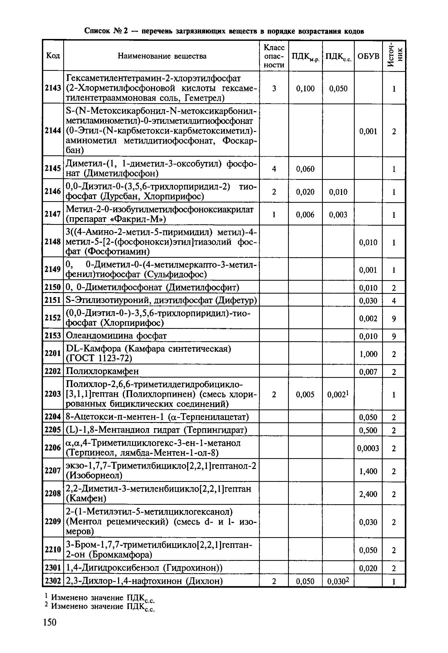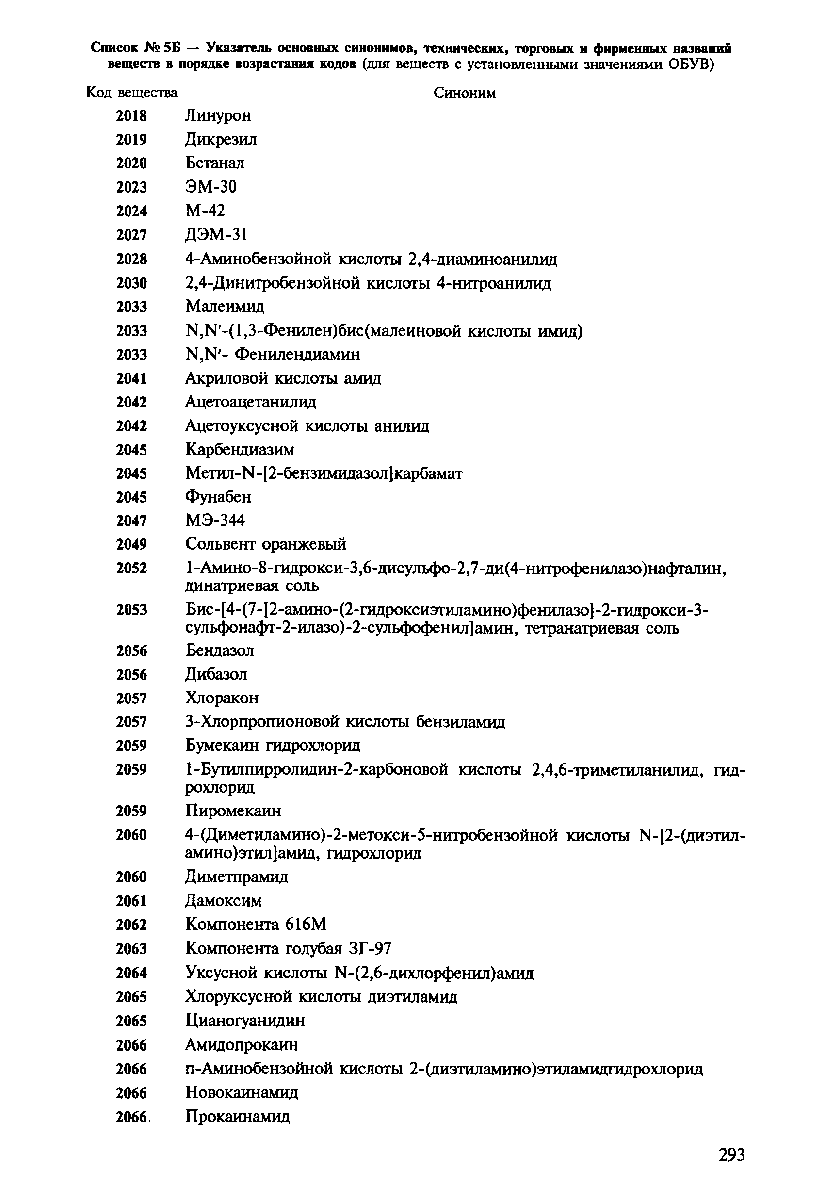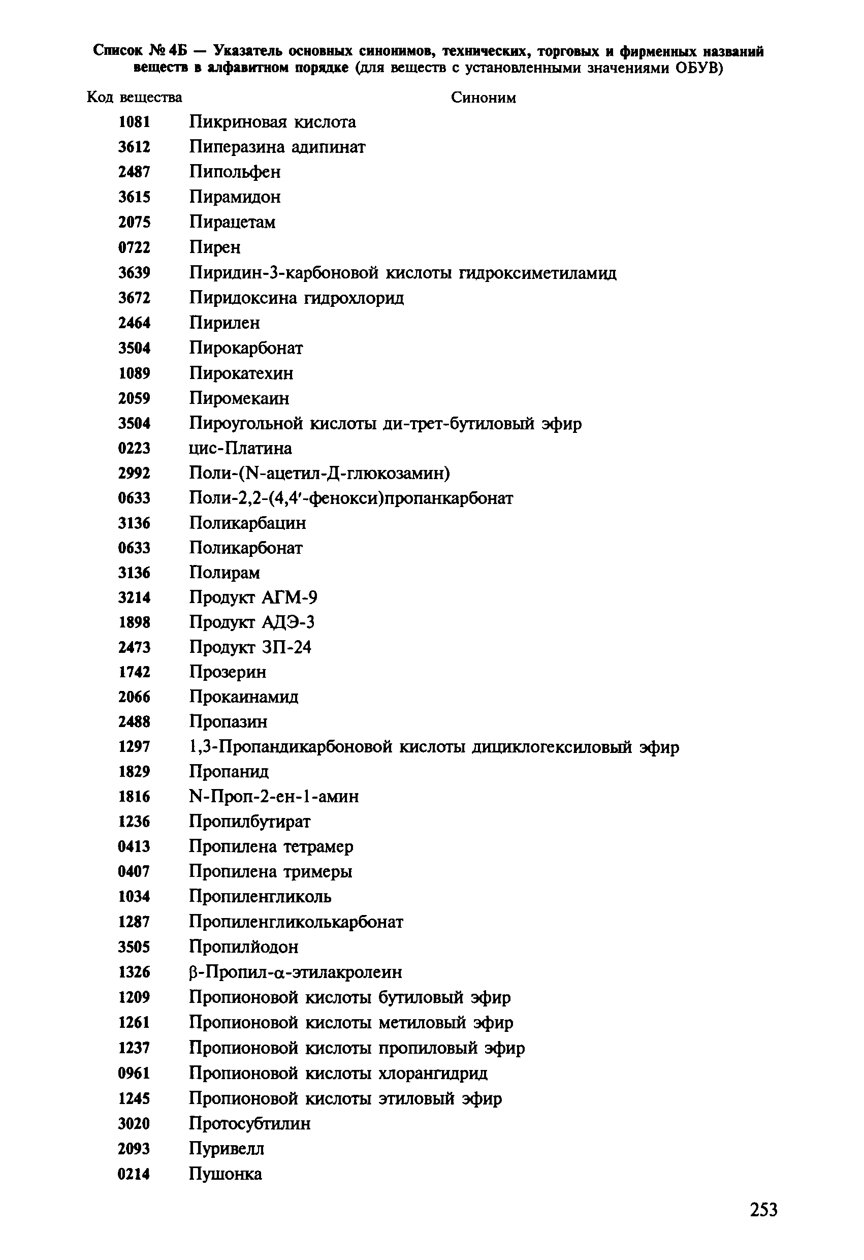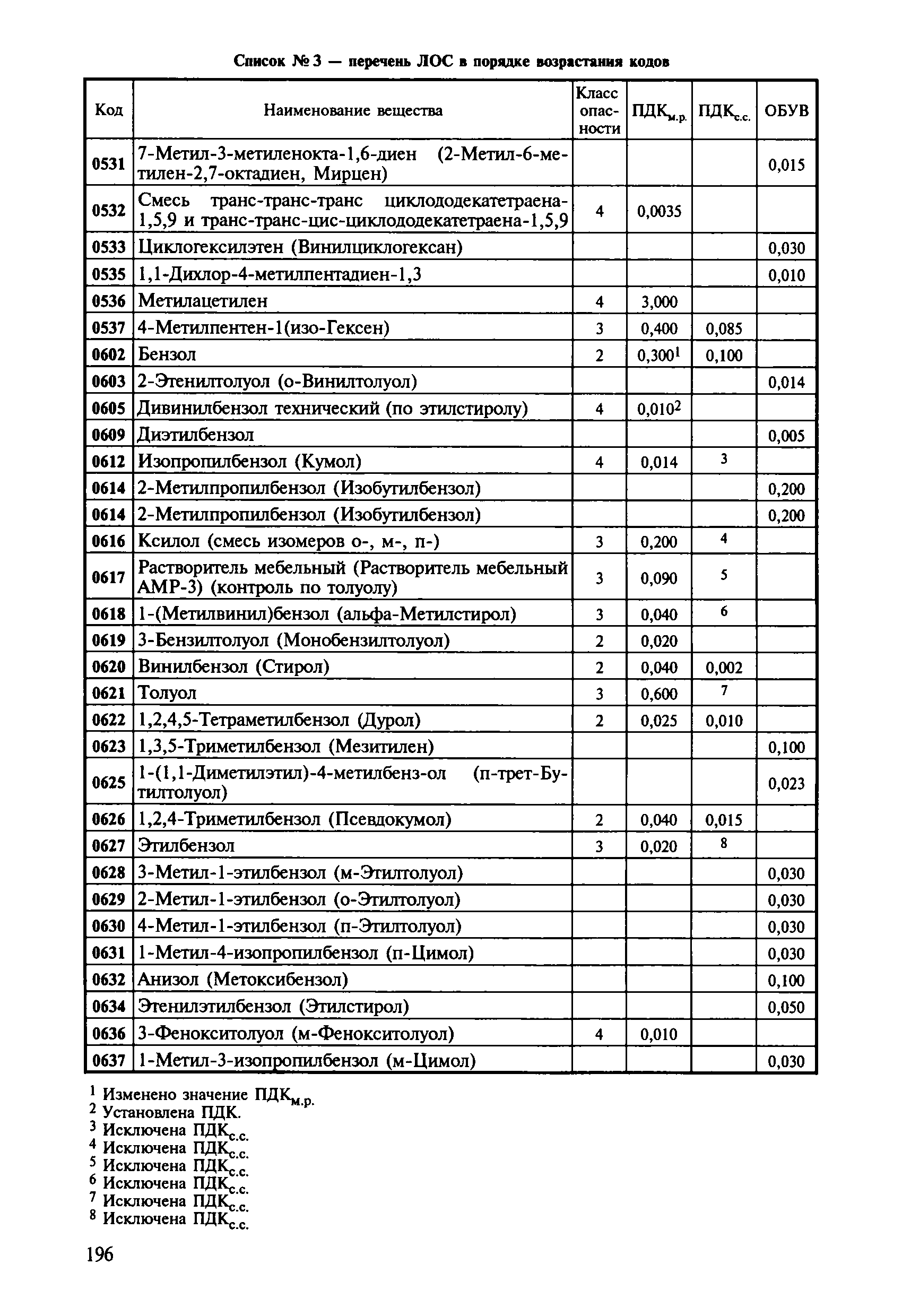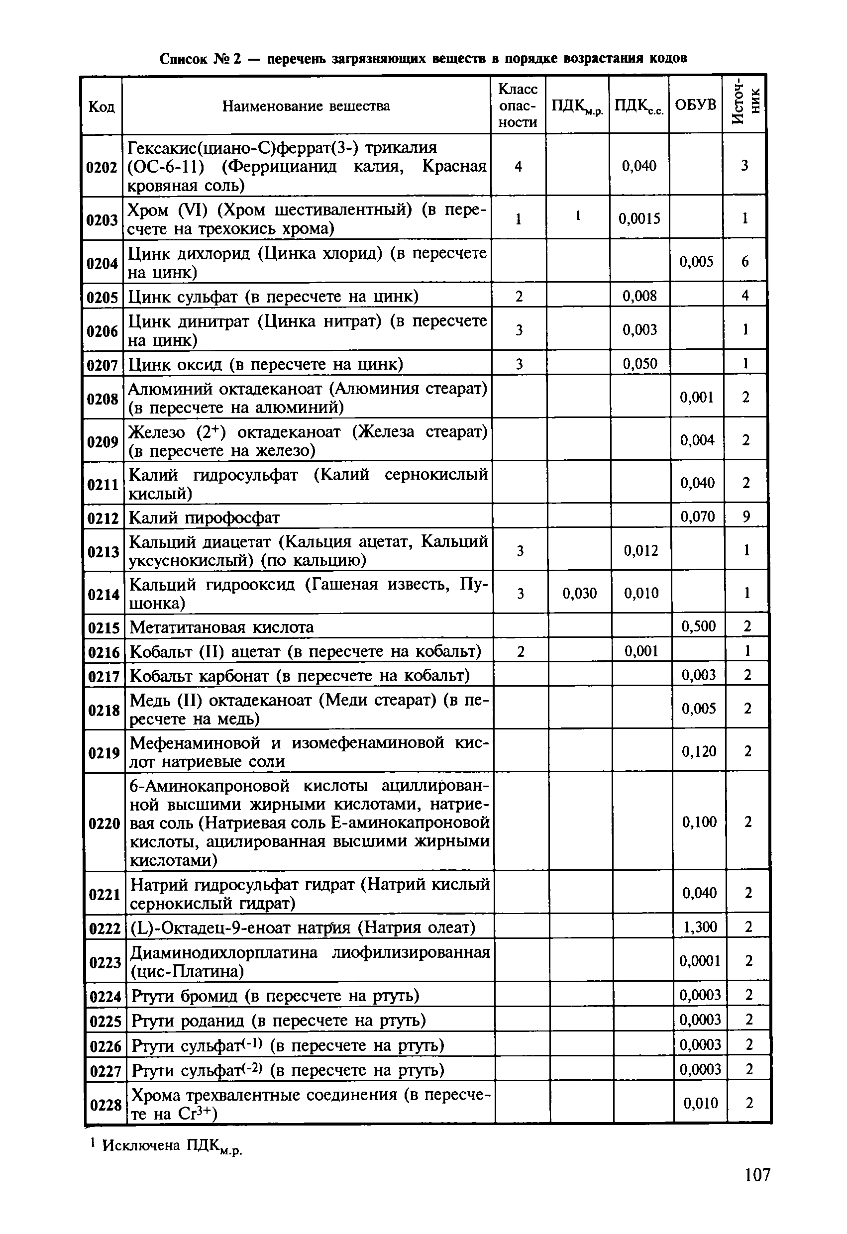 | Оглавление: | Список № 1 Перечень загрязняющих веществ в алфавитном порядке Список № 2 Перечень загрязняющих веществ в порядке возрастания кодов Список № 3 Перечень ЛОС в порядке возрастания кодов Список № 4 Указатель основных синонимов, технических, торговых и фирменных названий веществ в алфавитном порядке А. Для веществ с установленными значениями ПДК Б. Для веществ с установленными значениями ОБУВ Список № 5 Указатель основных синонимов, технических, торговых и фирменных названий веществ в порядке возрастания кодов А. Для веществ с установленными значениями ПДК Б. Для веществ с установленными значениями ОБУВ |