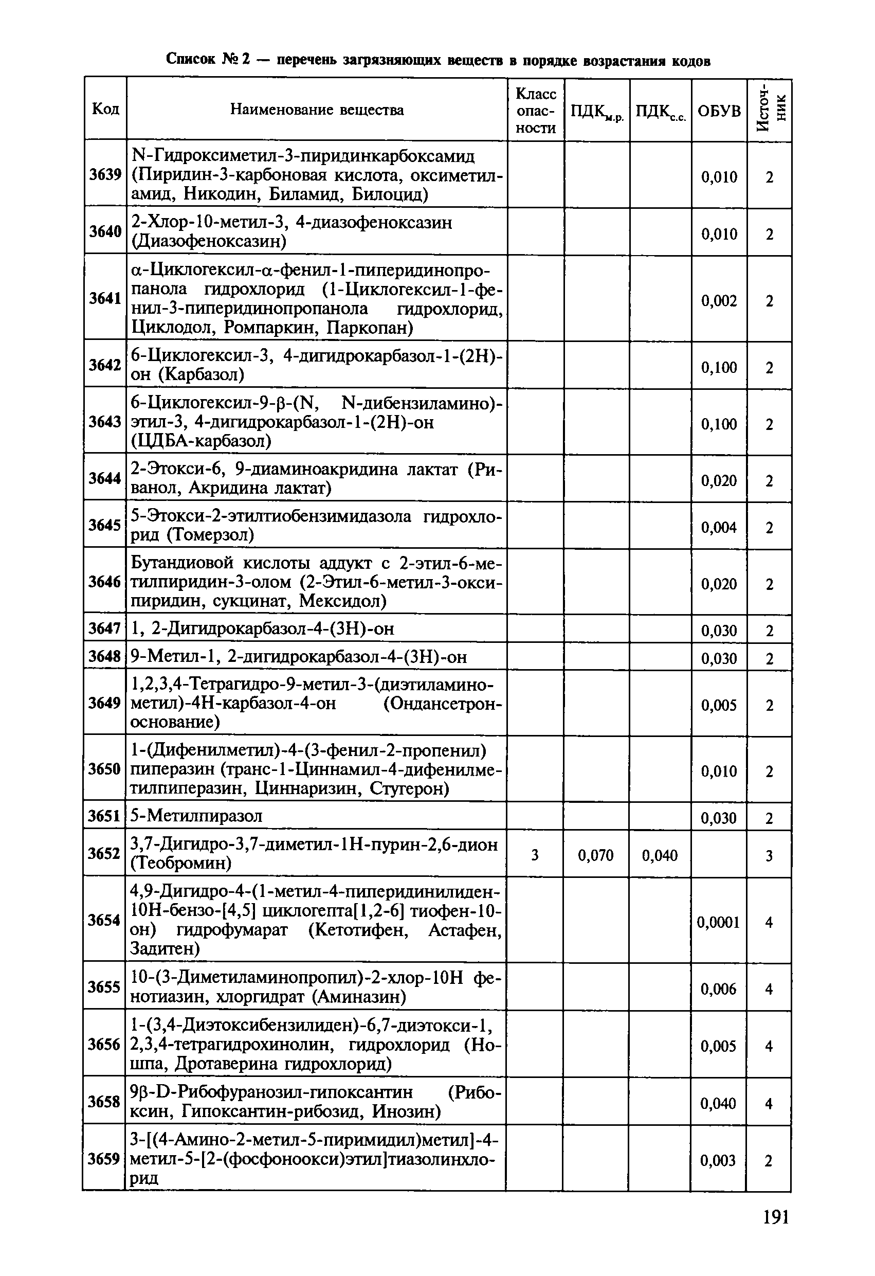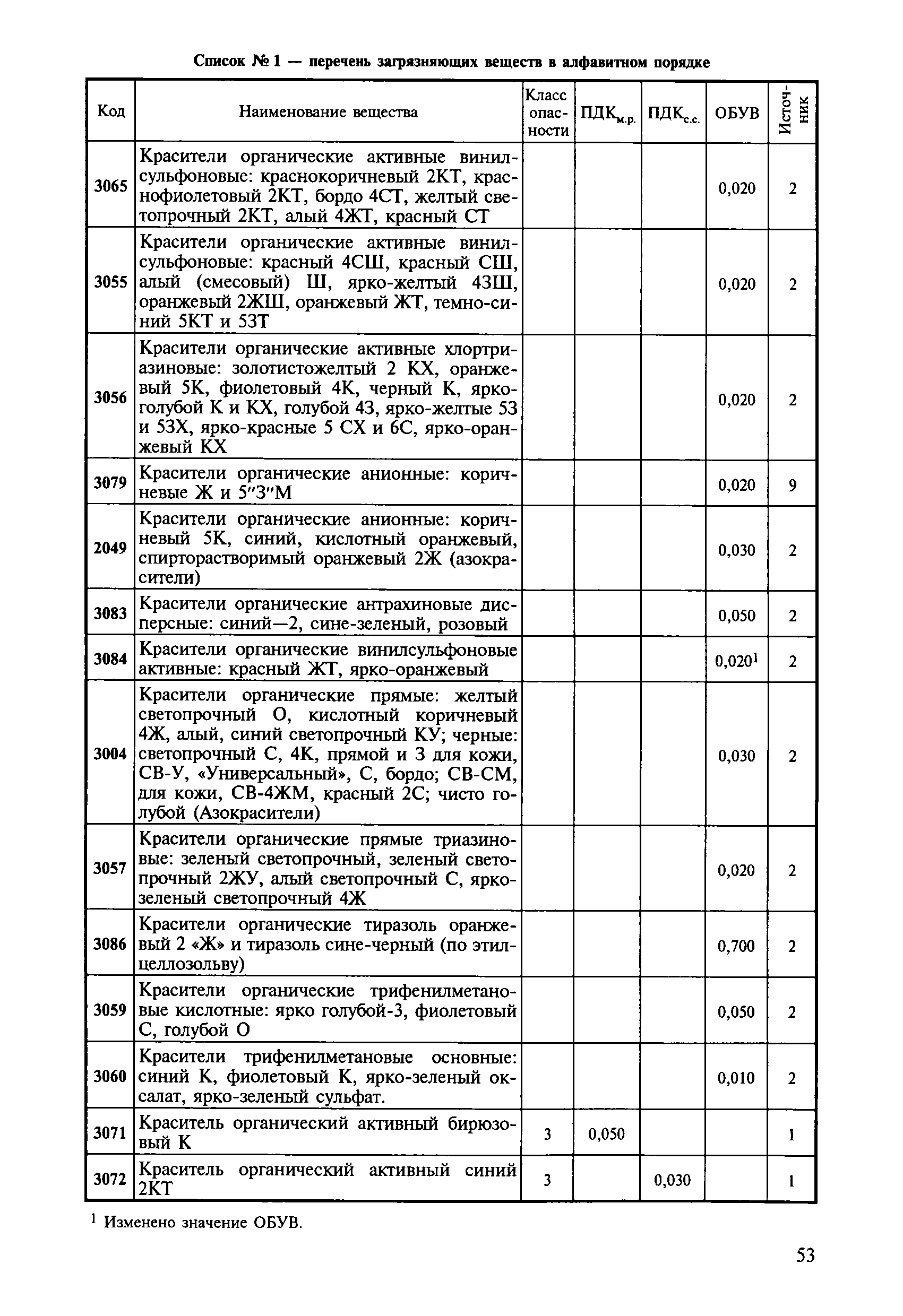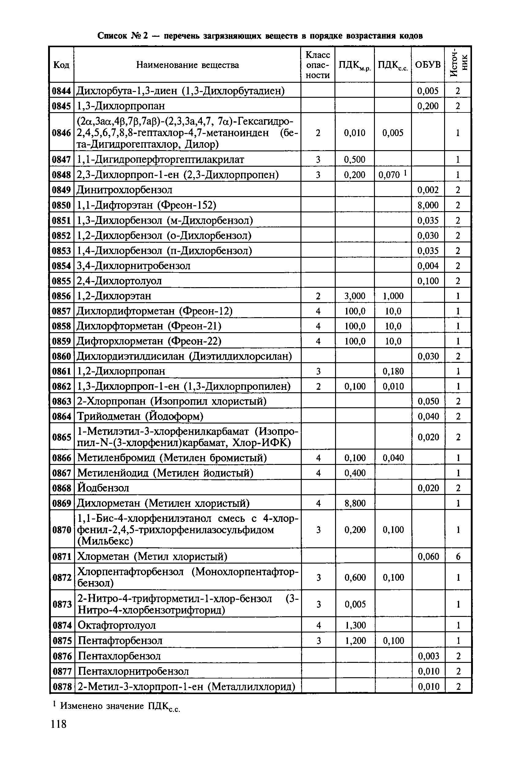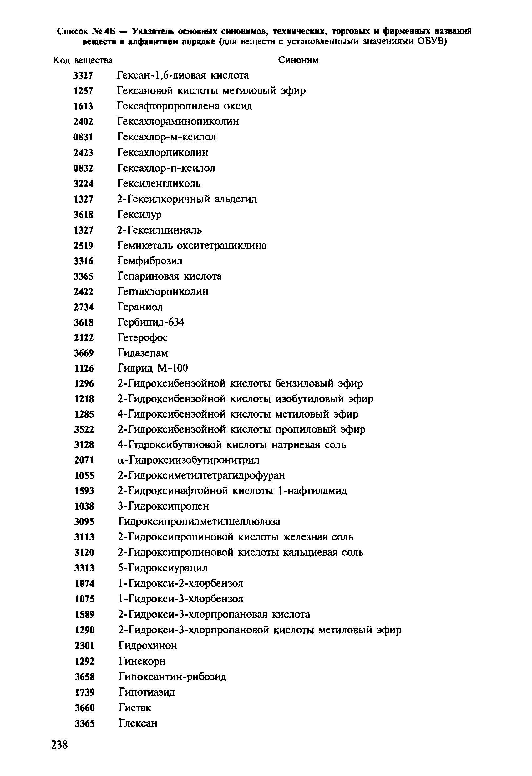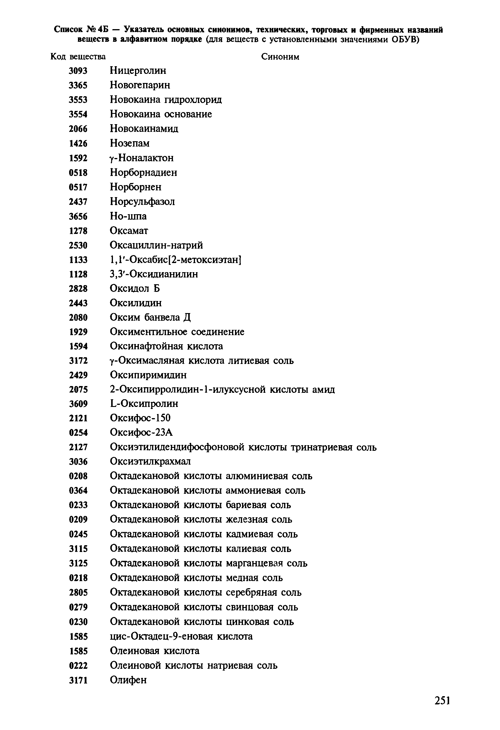 | Оглавление: | Список № 1 Перечень загрязняющих веществ в алфавитном порядке Список № 2 Перечень загрязняющих веществ в порядке возрастания кодов Список № 3 Перечень ЛОС в порядке возрастания кодов Список № 4 Указатель основных синонимов, технических, торговых и фирменных названий веществ в алфавитном порядке А. Для веществ с установленными значениями ПДК Б. Для веществ с установленными значениями ОБУВ Список № 5 Указатель основных синонимов, технических, торговых и фирменных названий веществ в порядке возрастания кодов А. Для веществ с установленными значениями ПДК Б. Для веществ с установленными значениями ОБУВ |