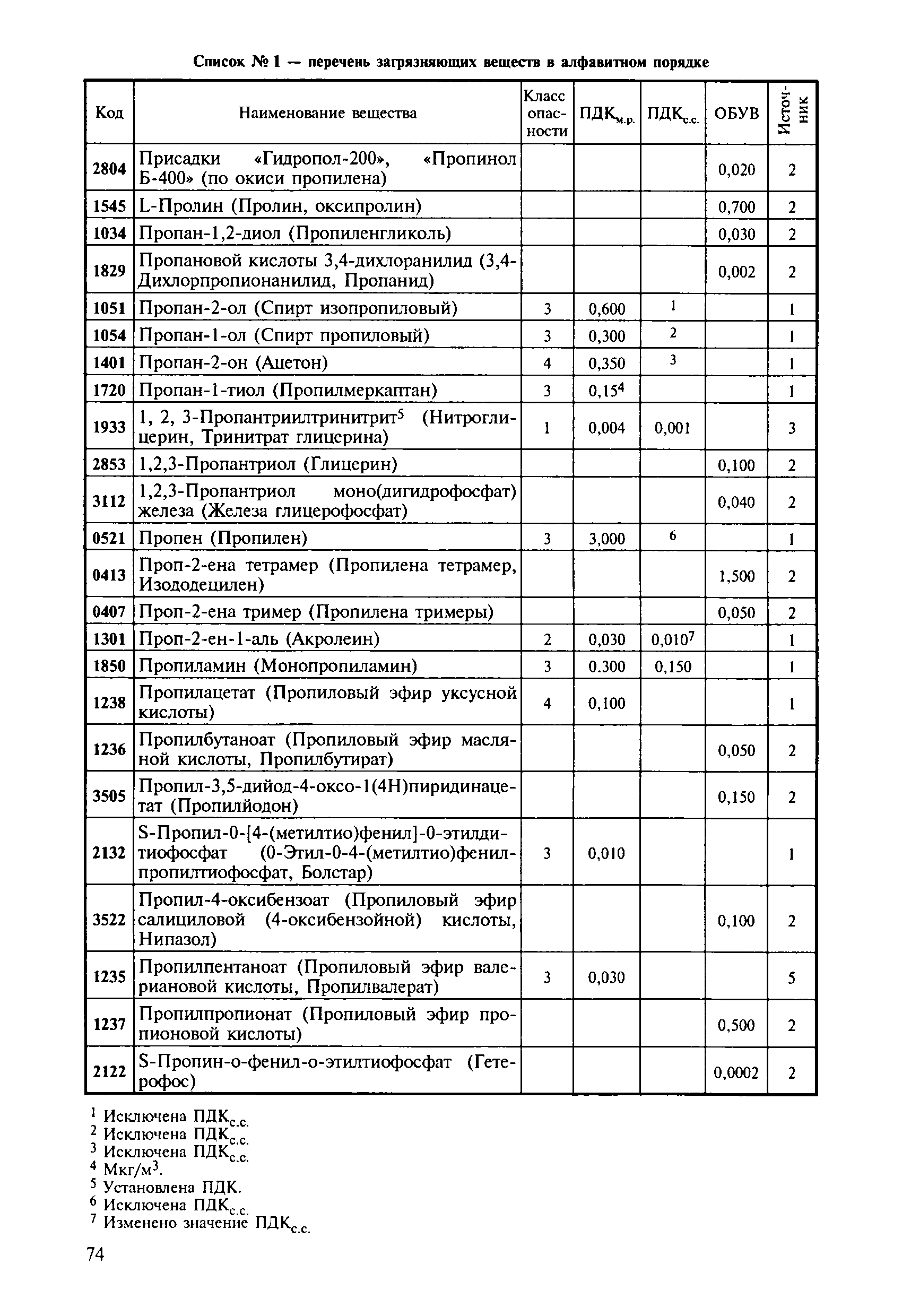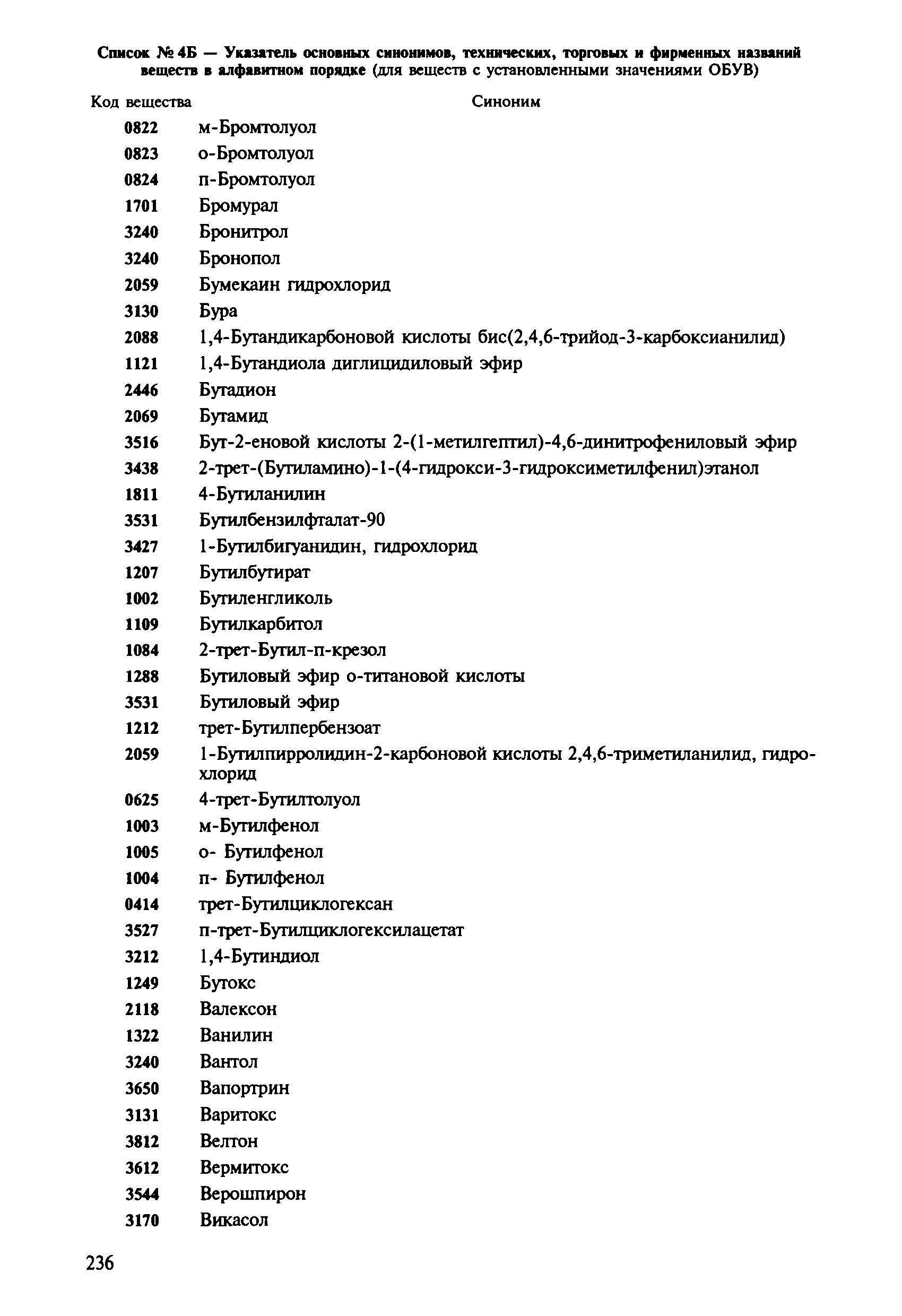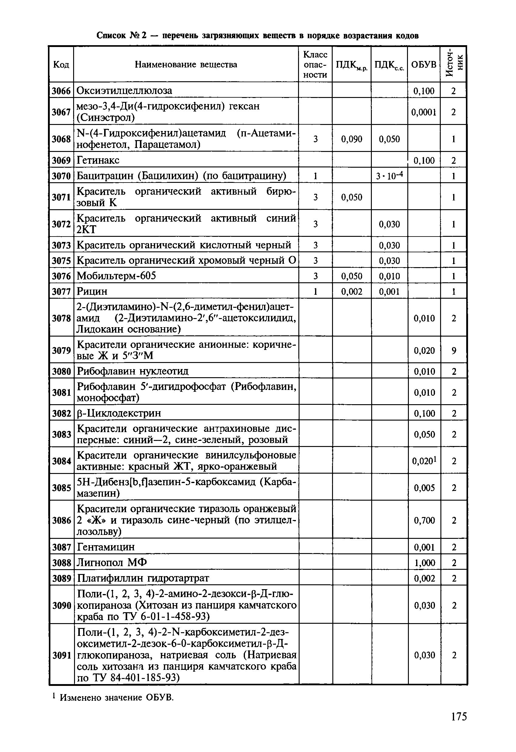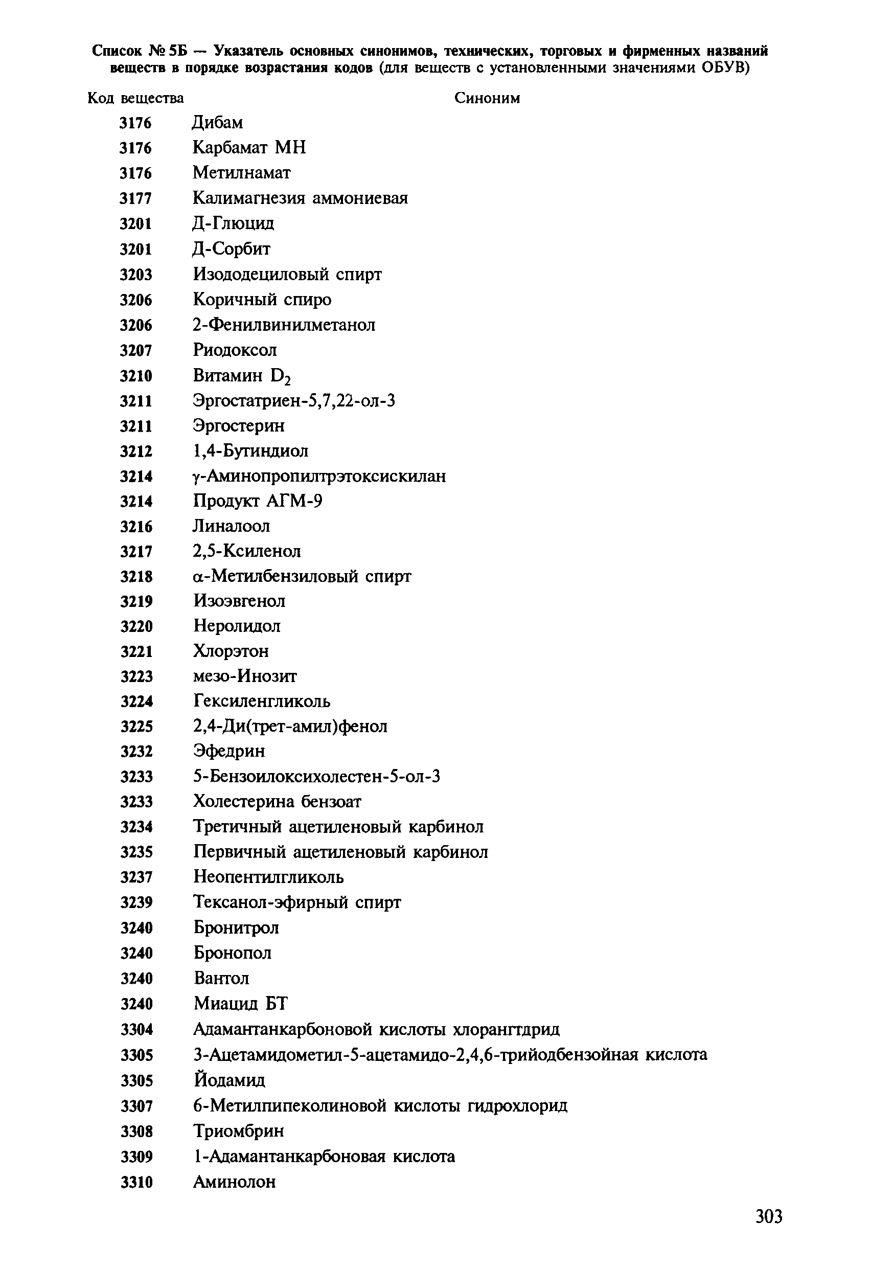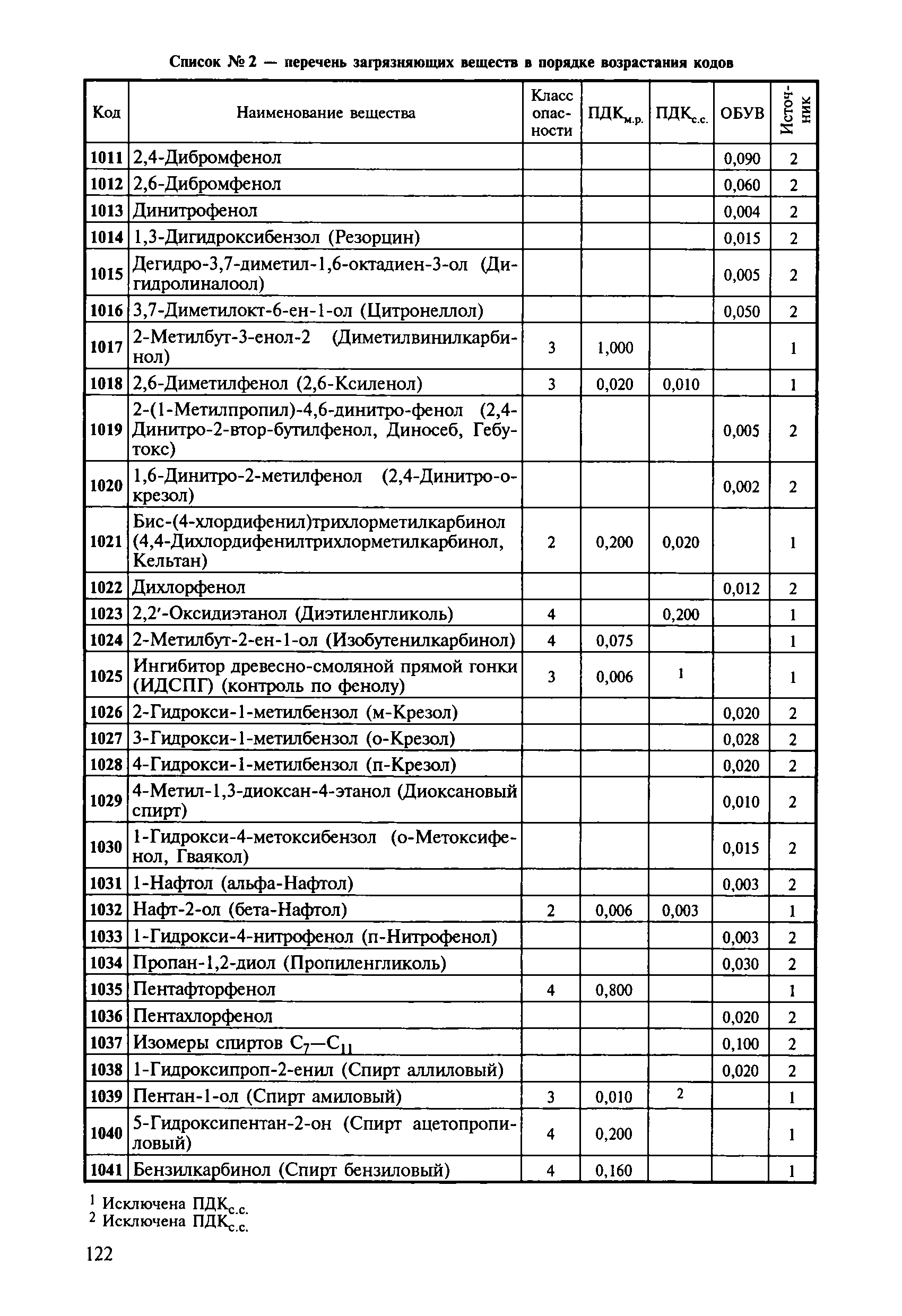 | Оглавление: | Список № 1 Перечень загрязняющих веществ в алфавитном порядке Список № 2 Перечень загрязняющих веществ в порядке возрастания кодов Список № 3 Перечень ЛОС в порядке возрастания кодов Список № 4 Указатель основных синонимов, технических, торговых и фирменных названий веществ в алфавитном порядке А. Для веществ с установленными значениями ПДК Б. Для веществ с установленными значениями ОБУВ Список № 5 Указатель основных синонимов, технических, торговых и фирменных названий веществ в порядке возрастания кодов А. Для веществ с установленными значениями ПДК Б. Для веществ с установленными значениями ОБУВ |