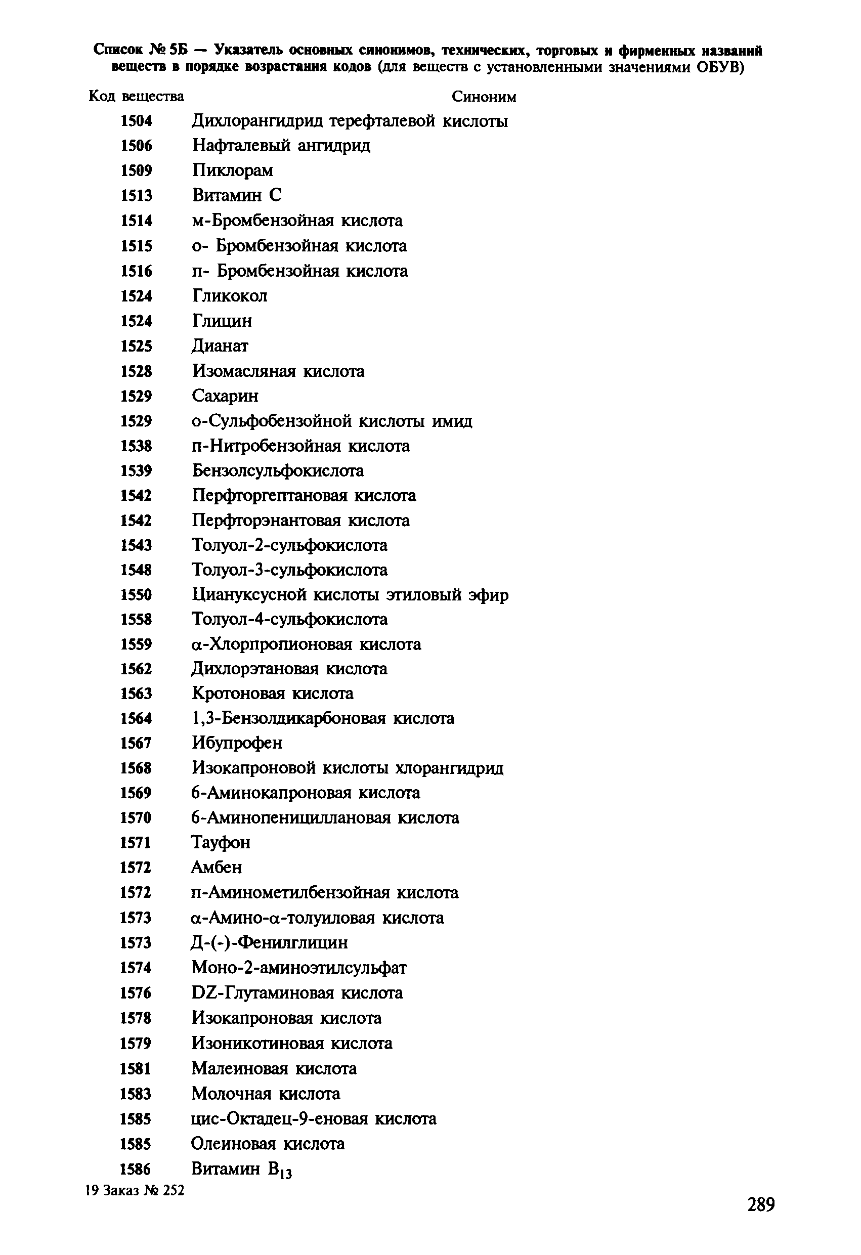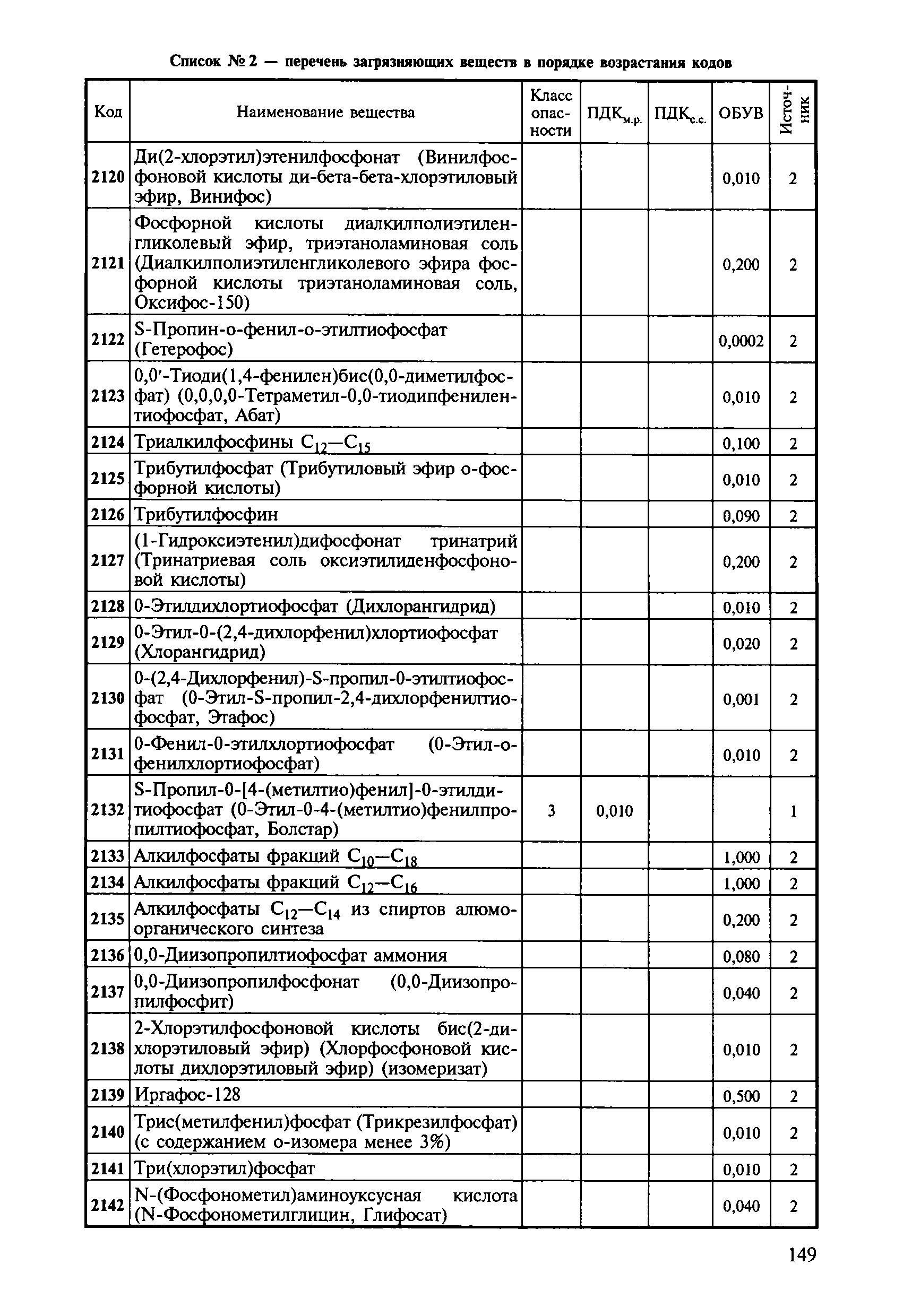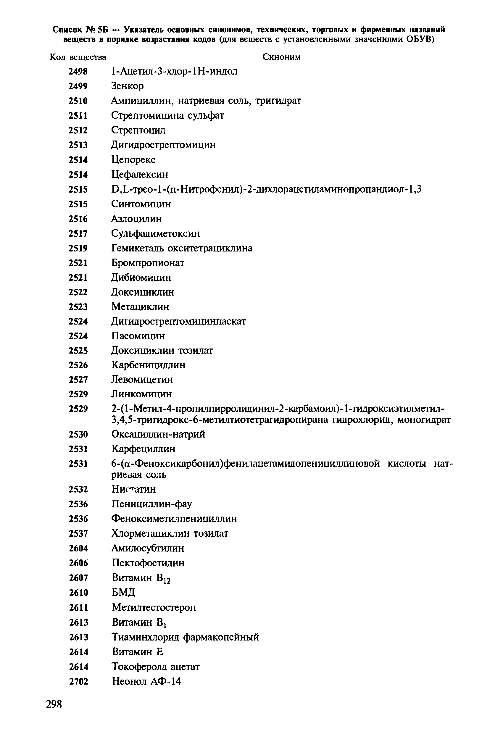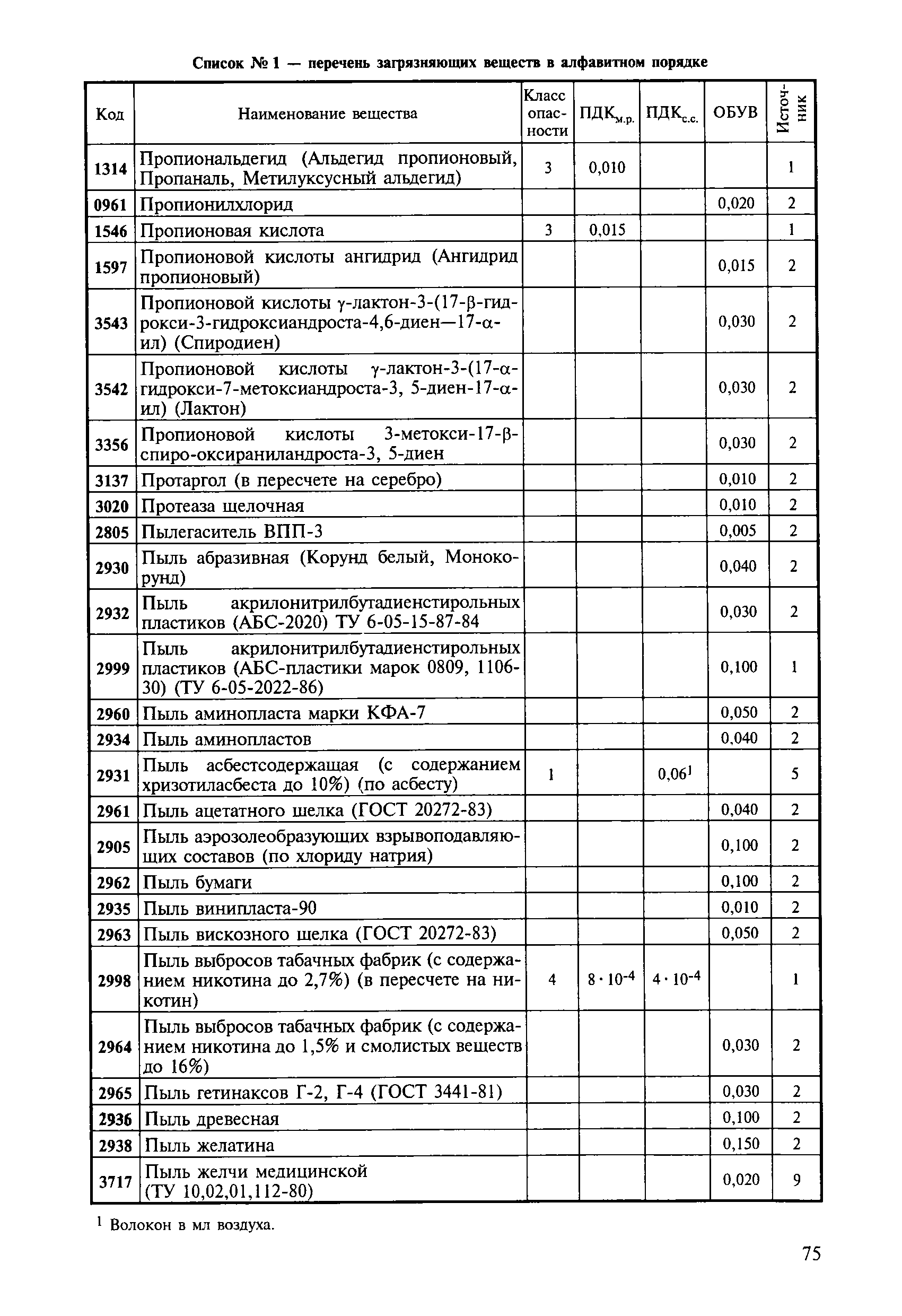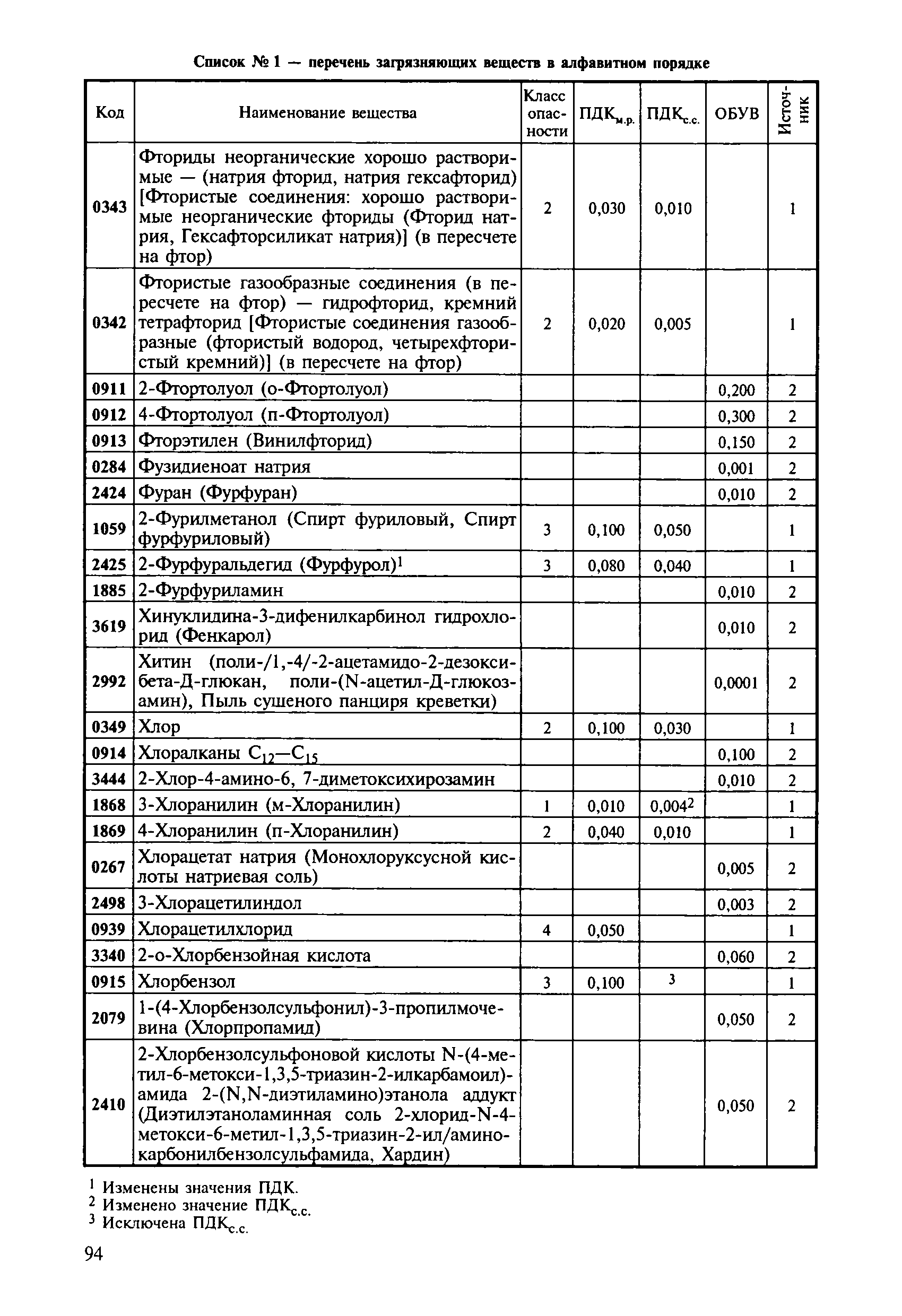 | Оглавление: | Список № 1 Перечень загрязняющих веществ в алфавитном порядке Список № 2 Перечень загрязняющих веществ в порядке возрастания кодов Список № 3 Перечень ЛОС в порядке возрастания кодов Список № 4 Указатель основных синонимов, технических, торговых и фирменных названий веществ в алфавитном порядке А. Для веществ с установленными значениями ПДК Б. Для веществ с установленными значениями ОБУВ Список № 5 Указатель основных синонимов, технических, торговых и фирменных названий веществ в порядке возрастания кодов А. Для веществ с установленными значениями ПДК Б. Для веществ с установленными значениями ОБУВ |