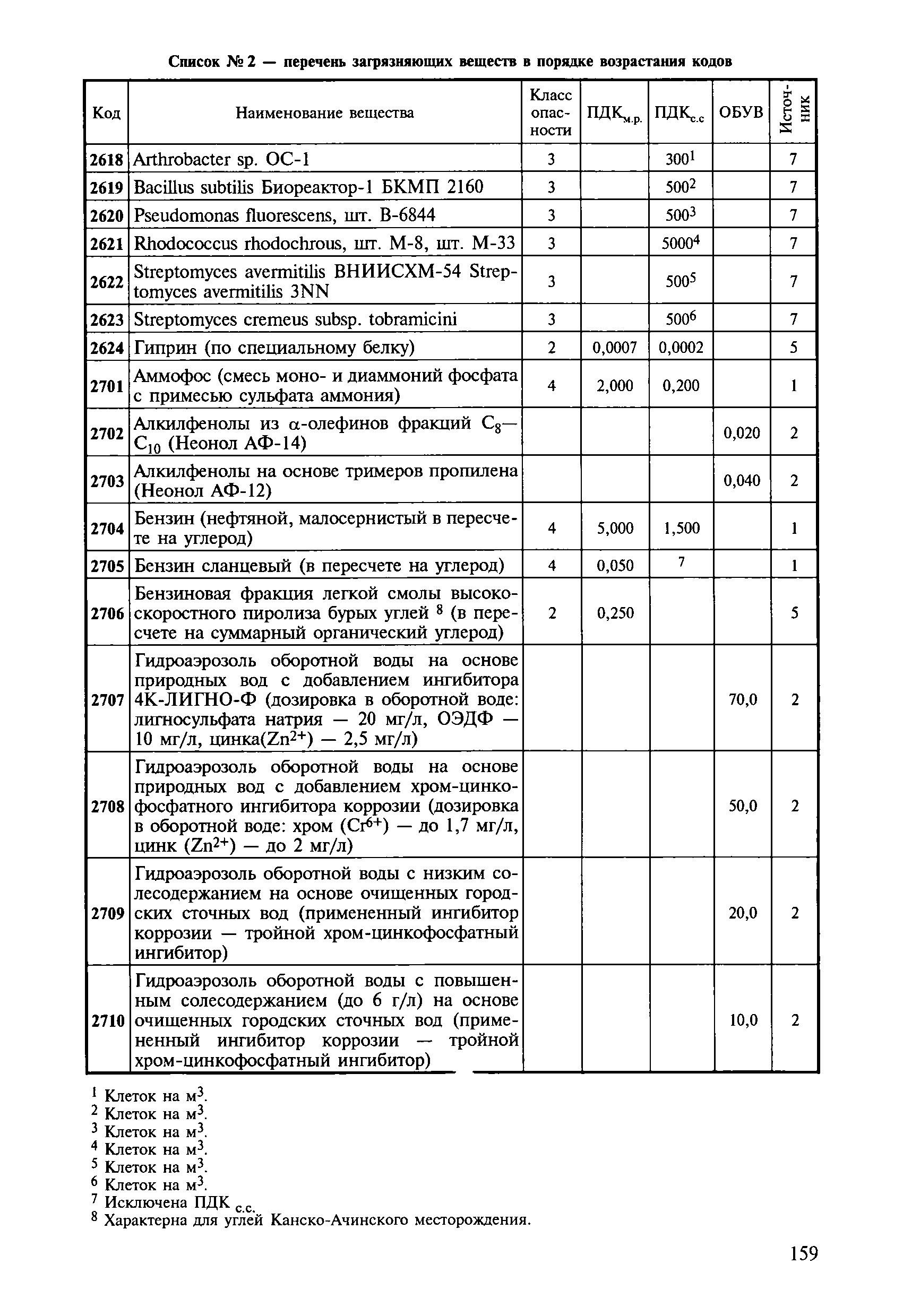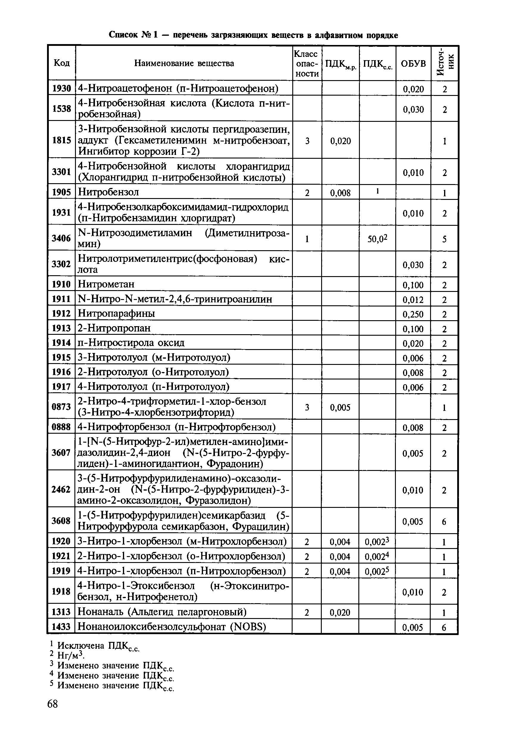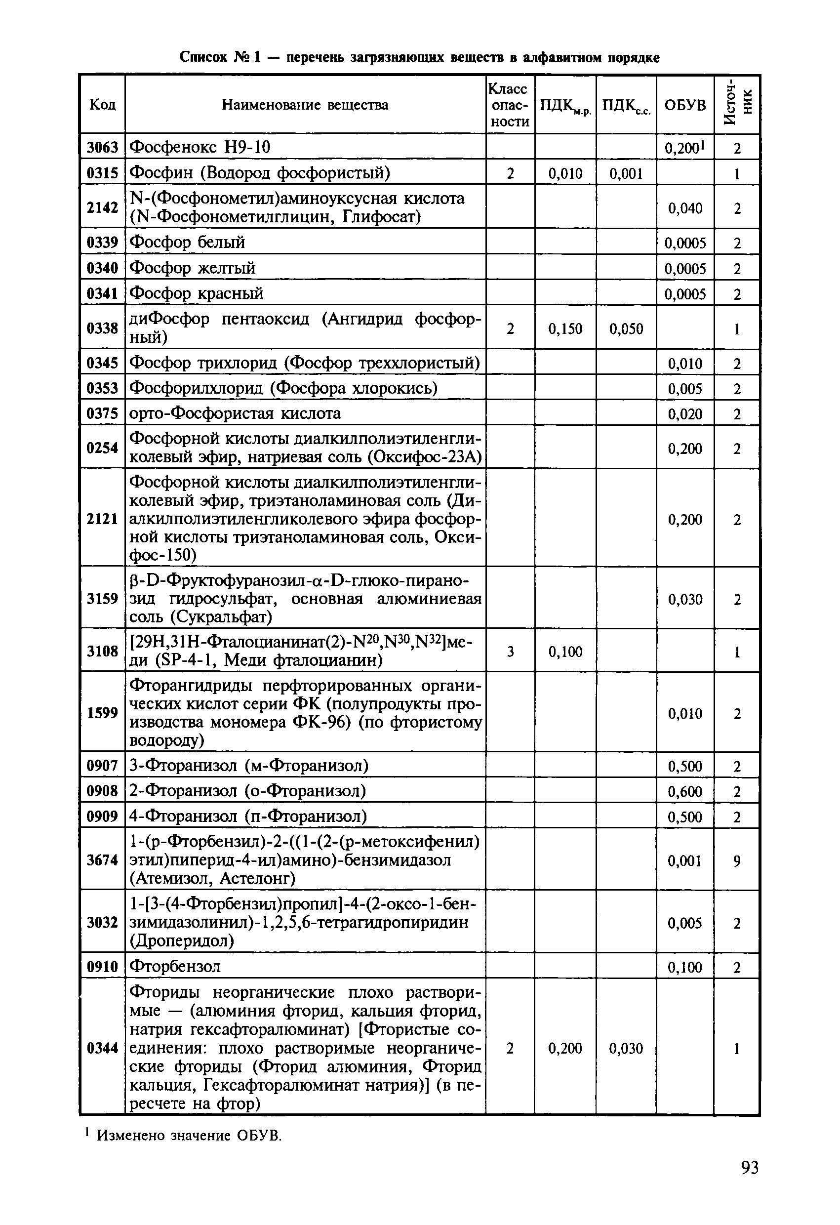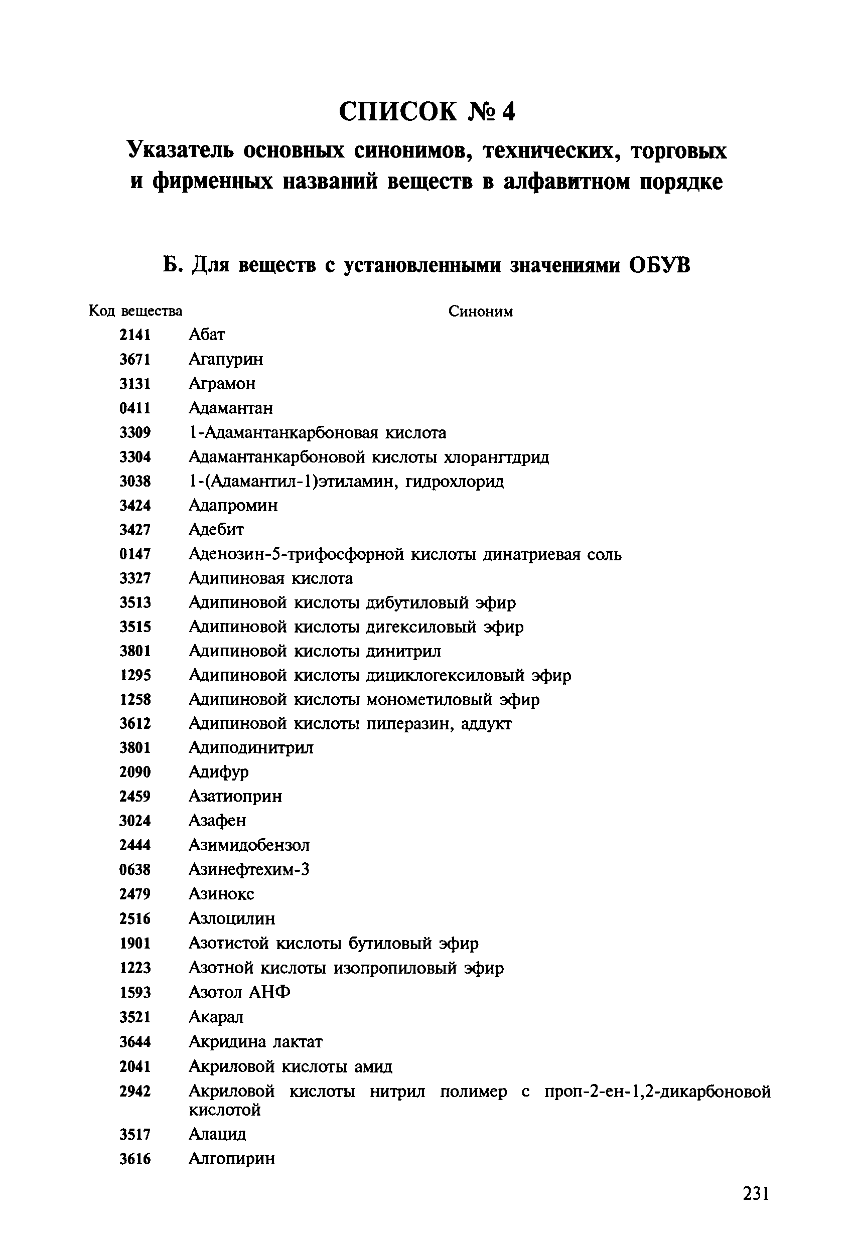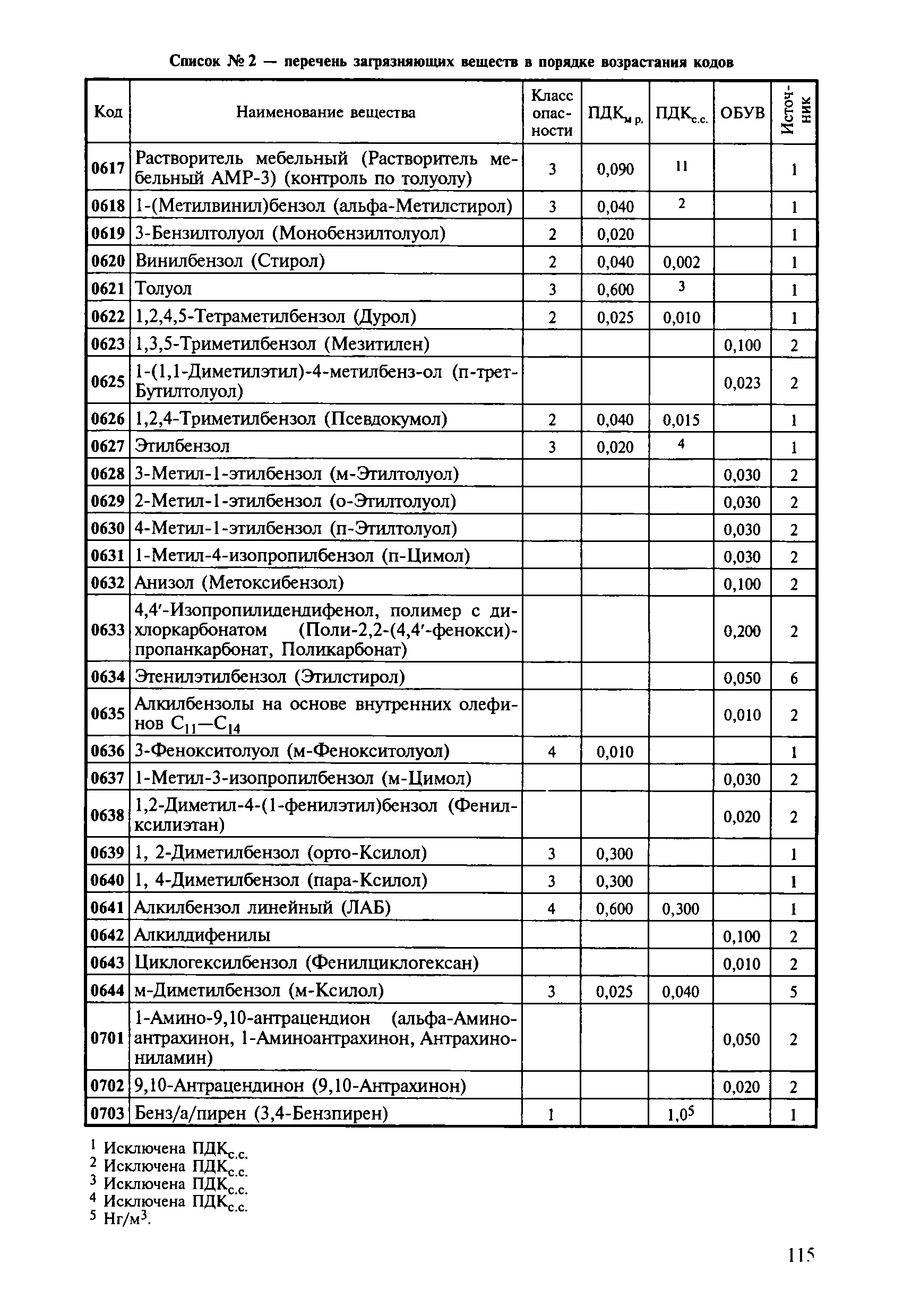 | Оглавление: | Список № 1 Перечень загрязняющих веществ в алфавитном порядке Список № 2 Перечень загрязняющих веществ в порядке возрастания кодов Список № 3 Перечень ЛОС в порядке возрастания кодов Список № 4 Указатель основных синонимов, технических, торговых и фирменных названий веществ в алфавитном порядке А. Для веществ с установленными значениями ПДК Б. Для веществ с установленными значениями ОБУВ Список № 5 Указатель основных синонимов, технических, торговых и фирменных названий веществ в порядке возрастания кодов А. Для веществ с установленными значениями ПДК Б. Для веществ с установленными значениями ОБУВ |
