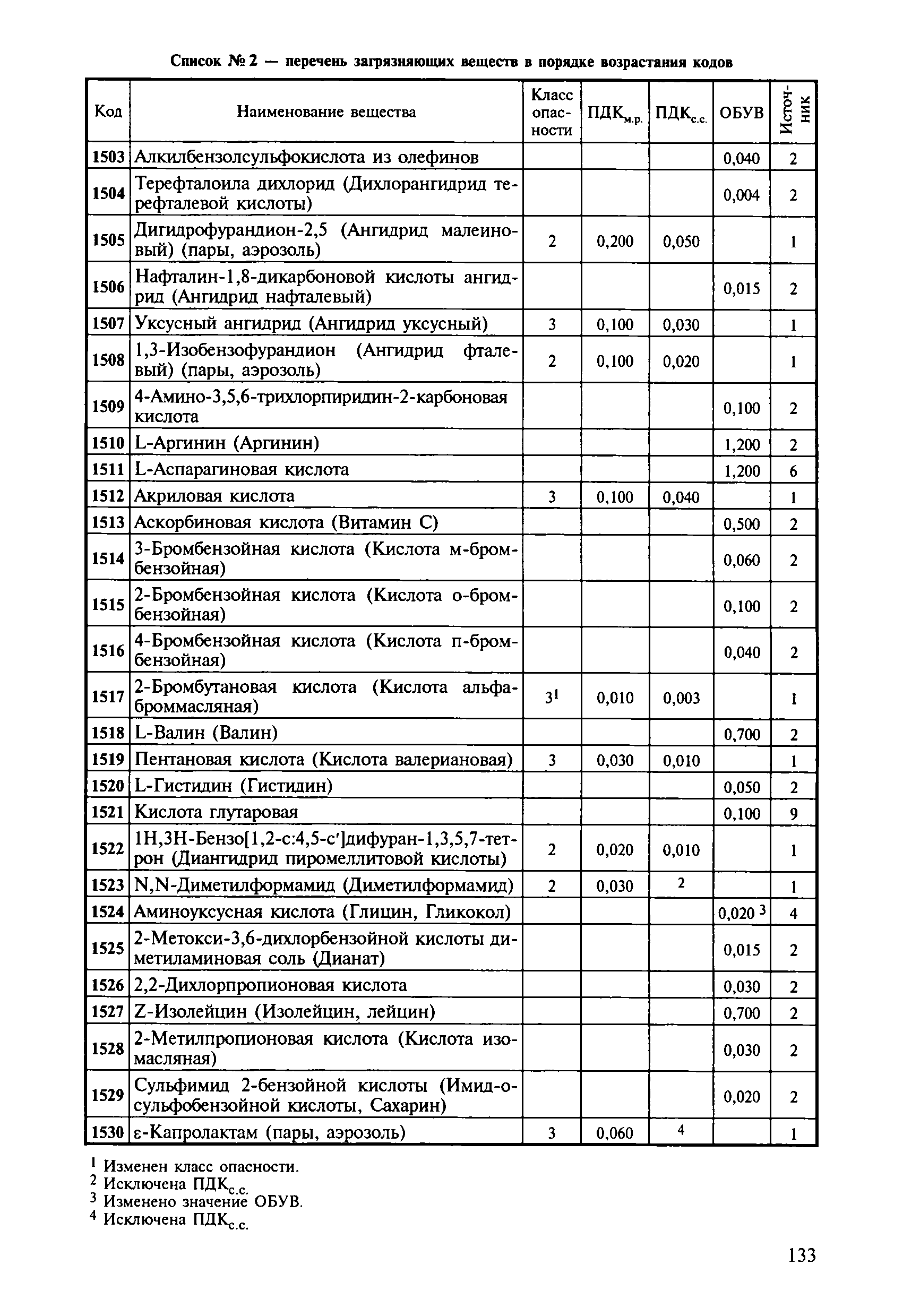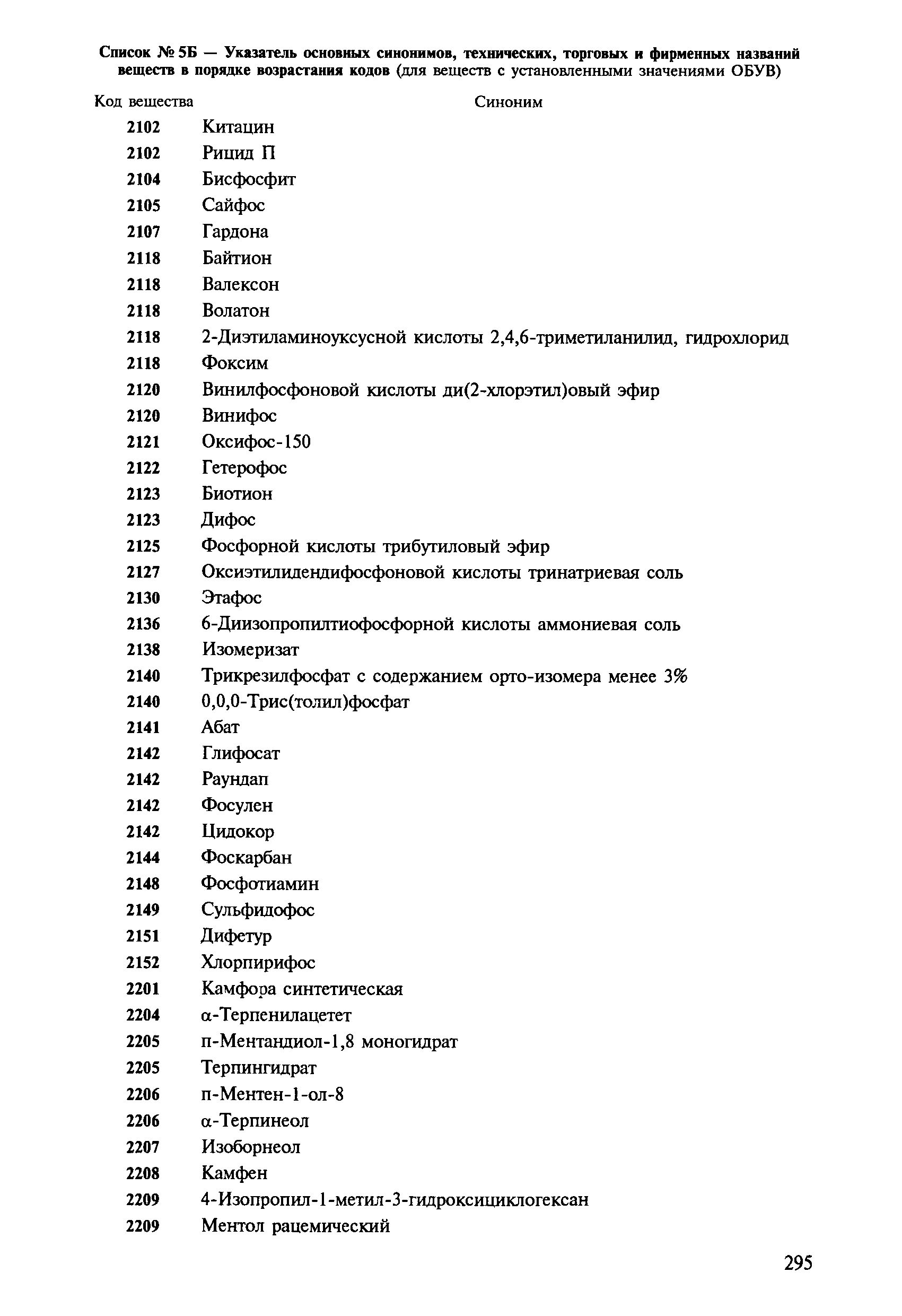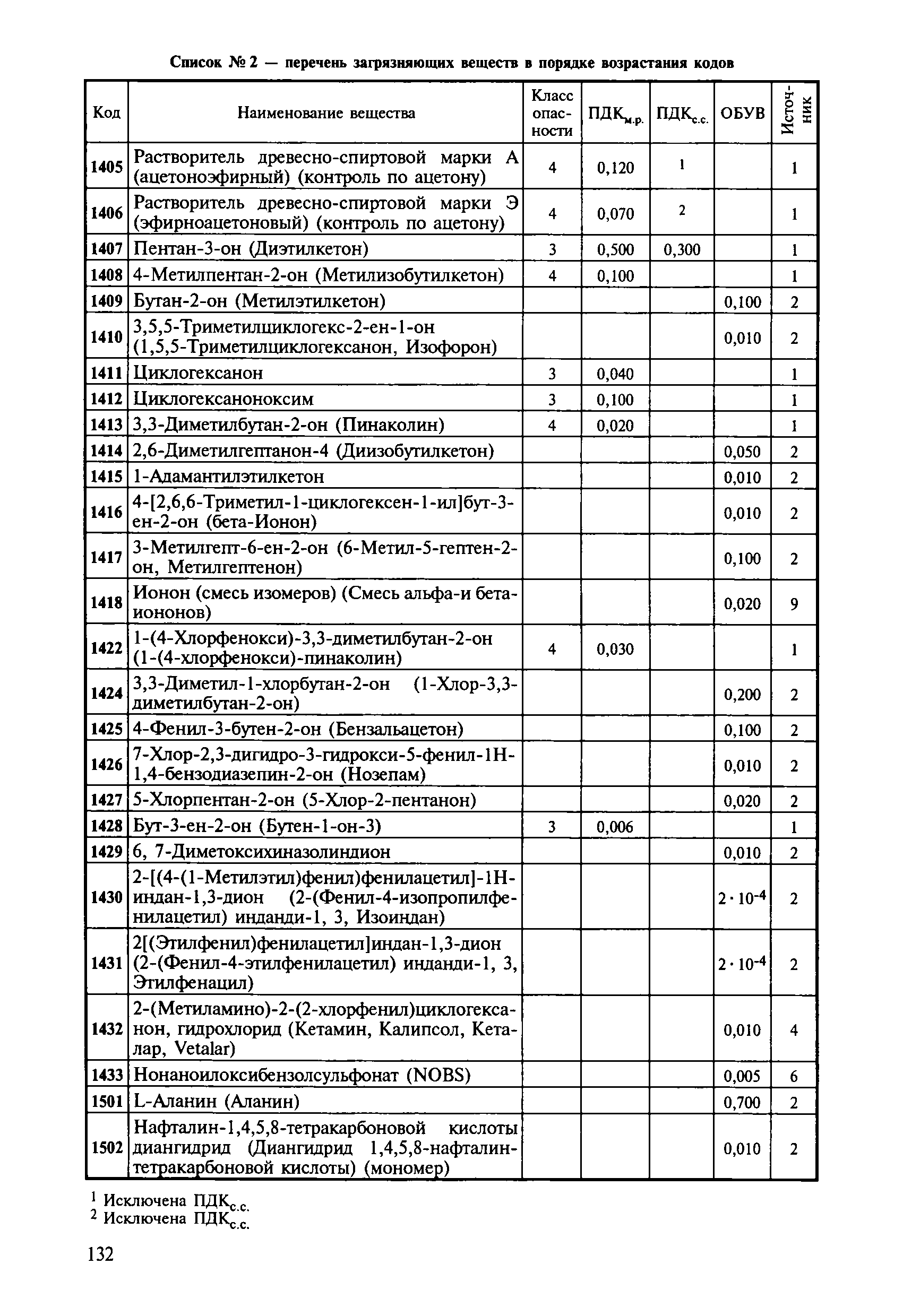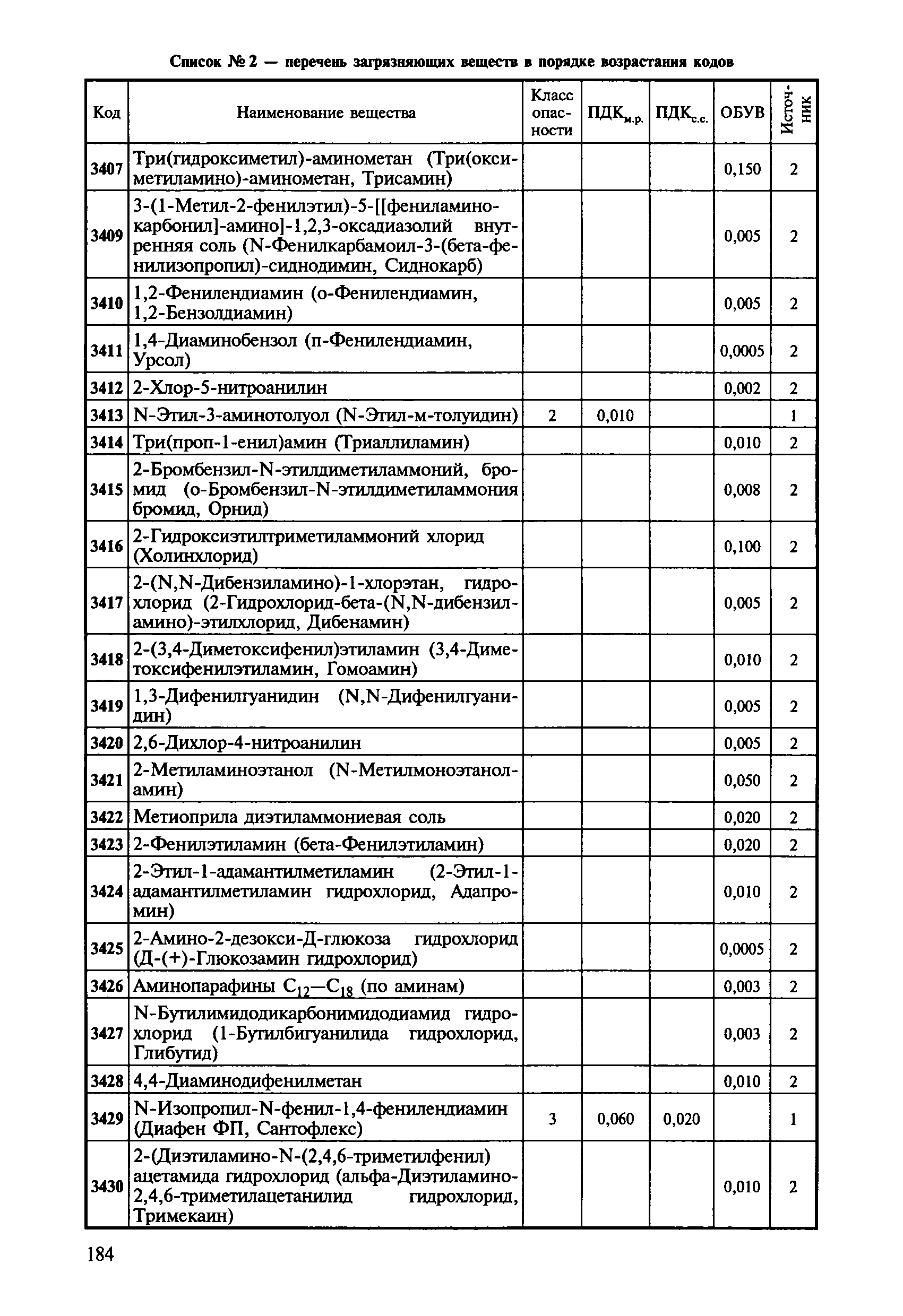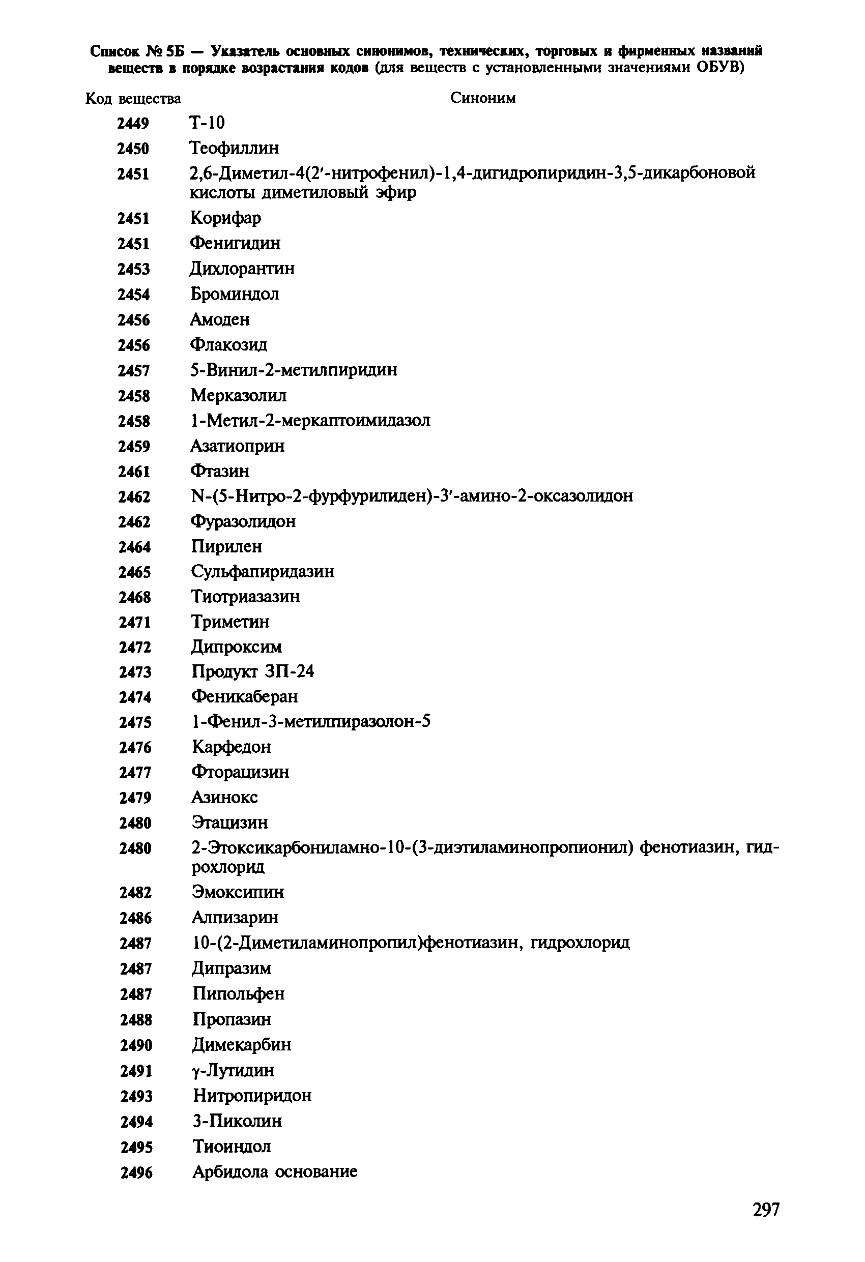 | Оглавление: | Список № 1 Перечень загрязняющих веществ в алфавитном порядке Список № 2 Перечень загрязняющих веществ в порядке возрастания кодов Список № 3 Перечень ЛОС в порядке возрастания кодов Список № 4 Указатель основных синонимов, технических, торговых и фирменных названий веществ в алфавитном порядке А. Для веществ с установленными значениями ПДК Б. Для веществ с установленными значениями ОБУВ Список № 5 Указатель основных синонимов, технических, торговых и фирменных названий веществ в порядке возрастания кодов А. Для веществ с установленными значениями ПДК Б. Для веществ с установленными значениями ОБУВ |