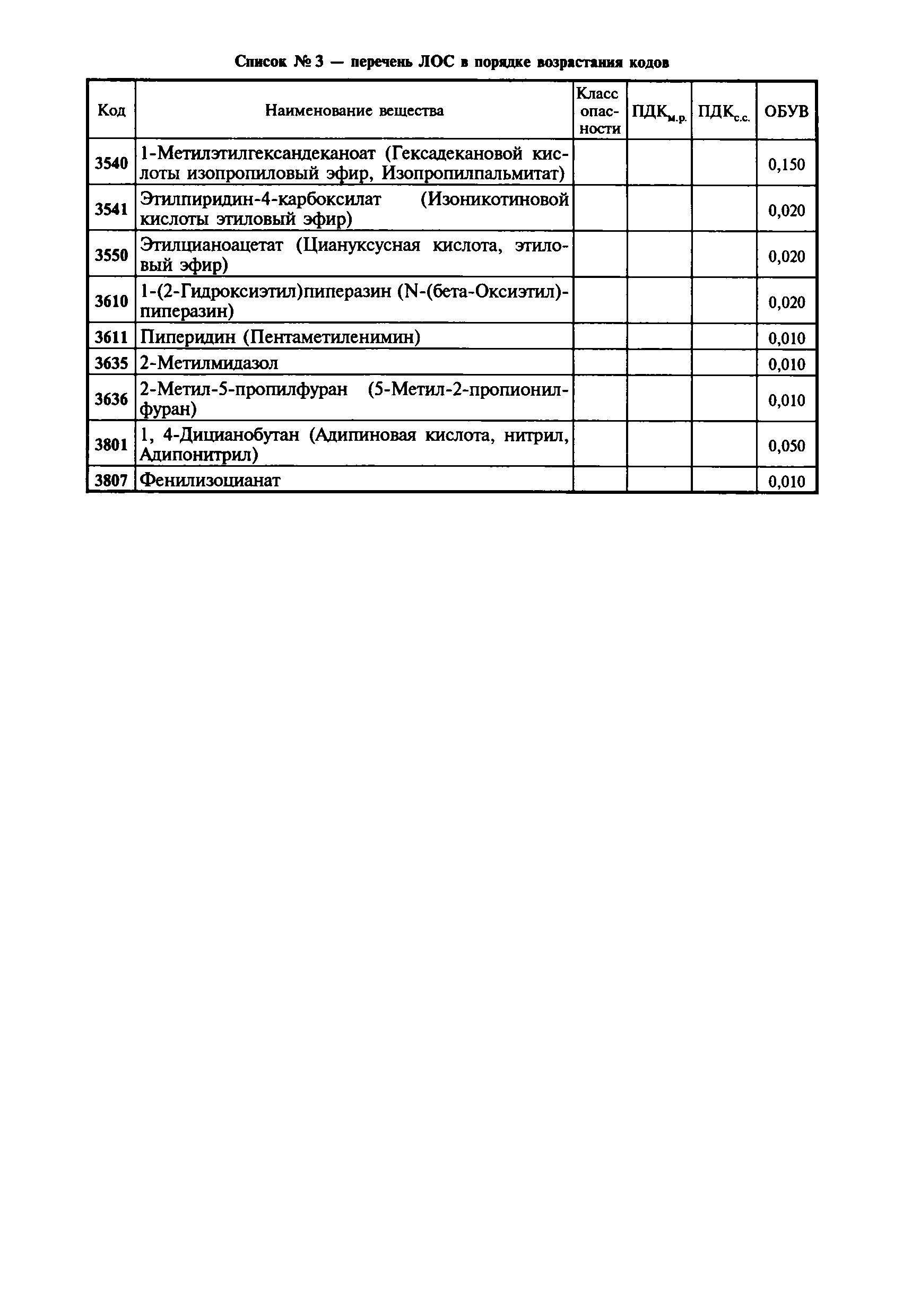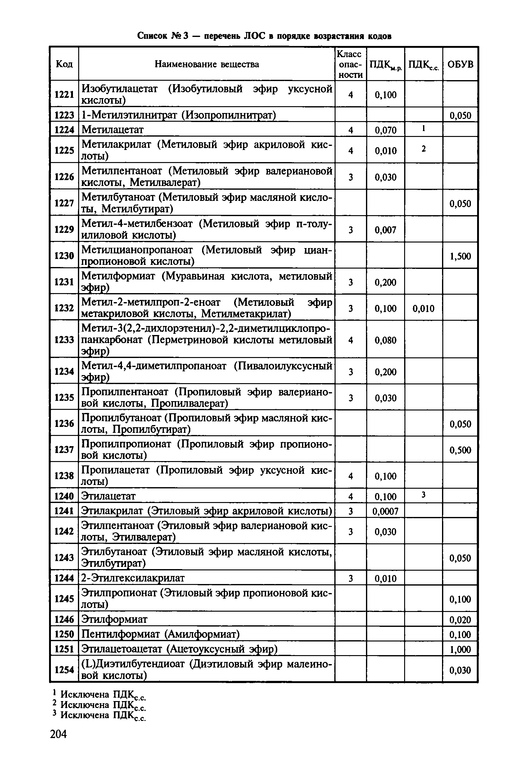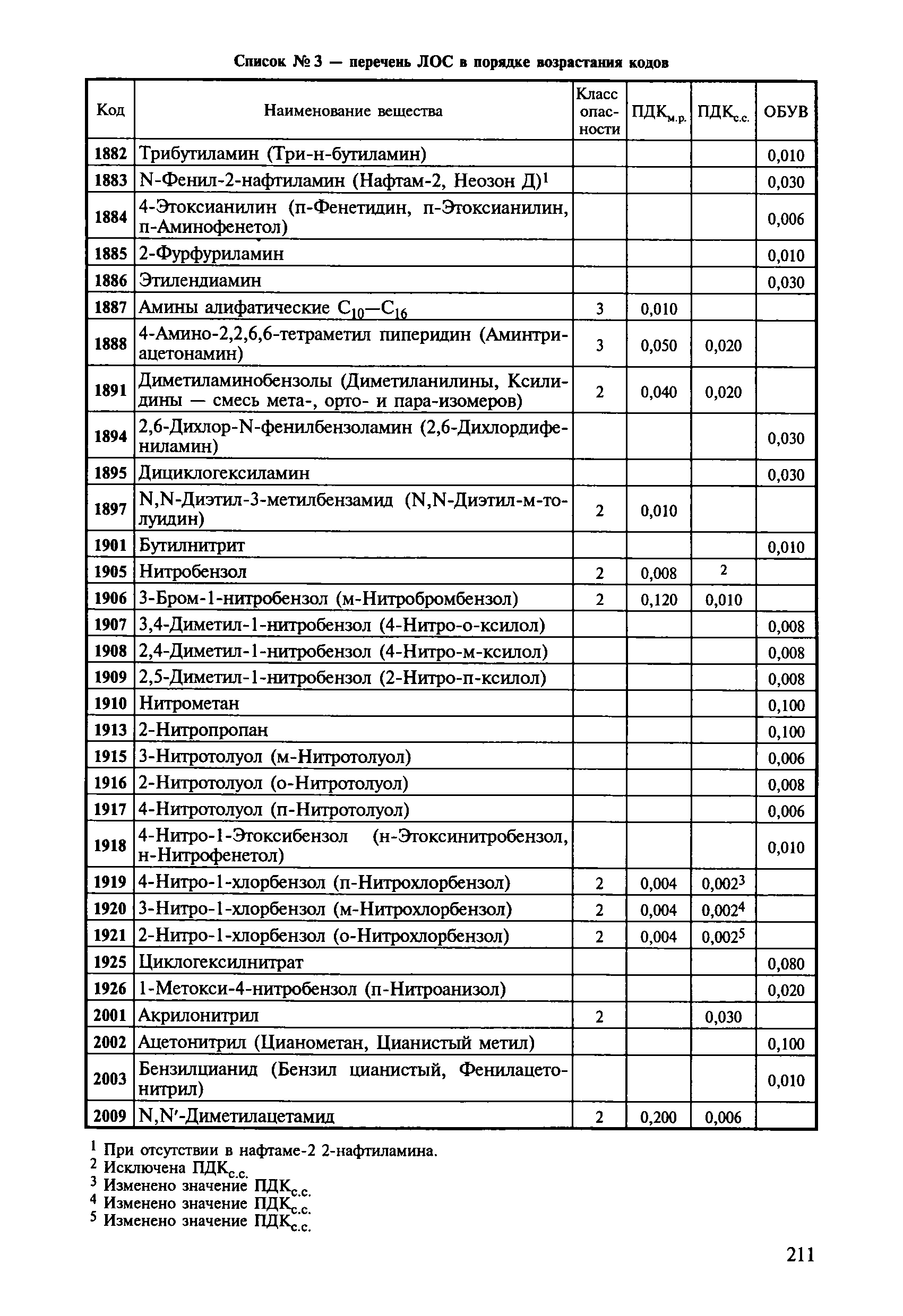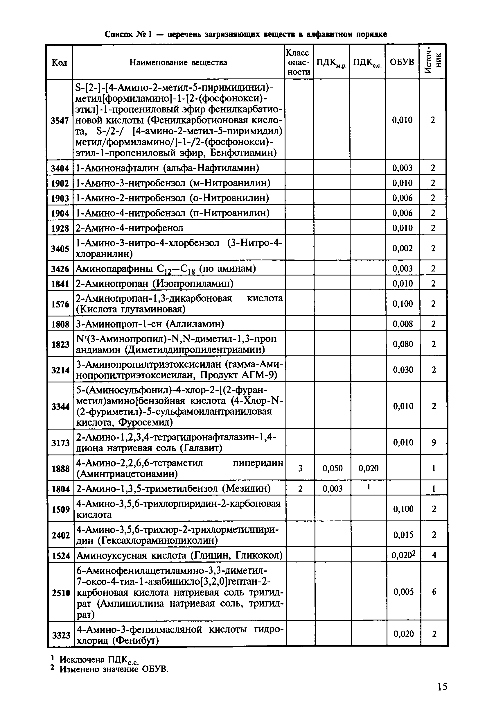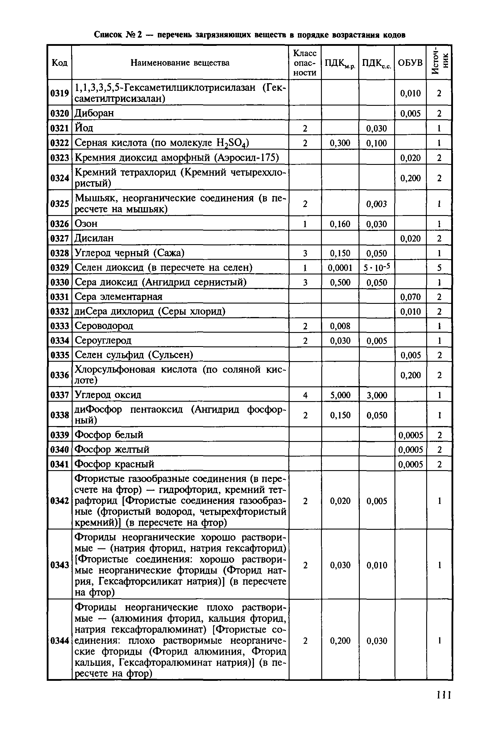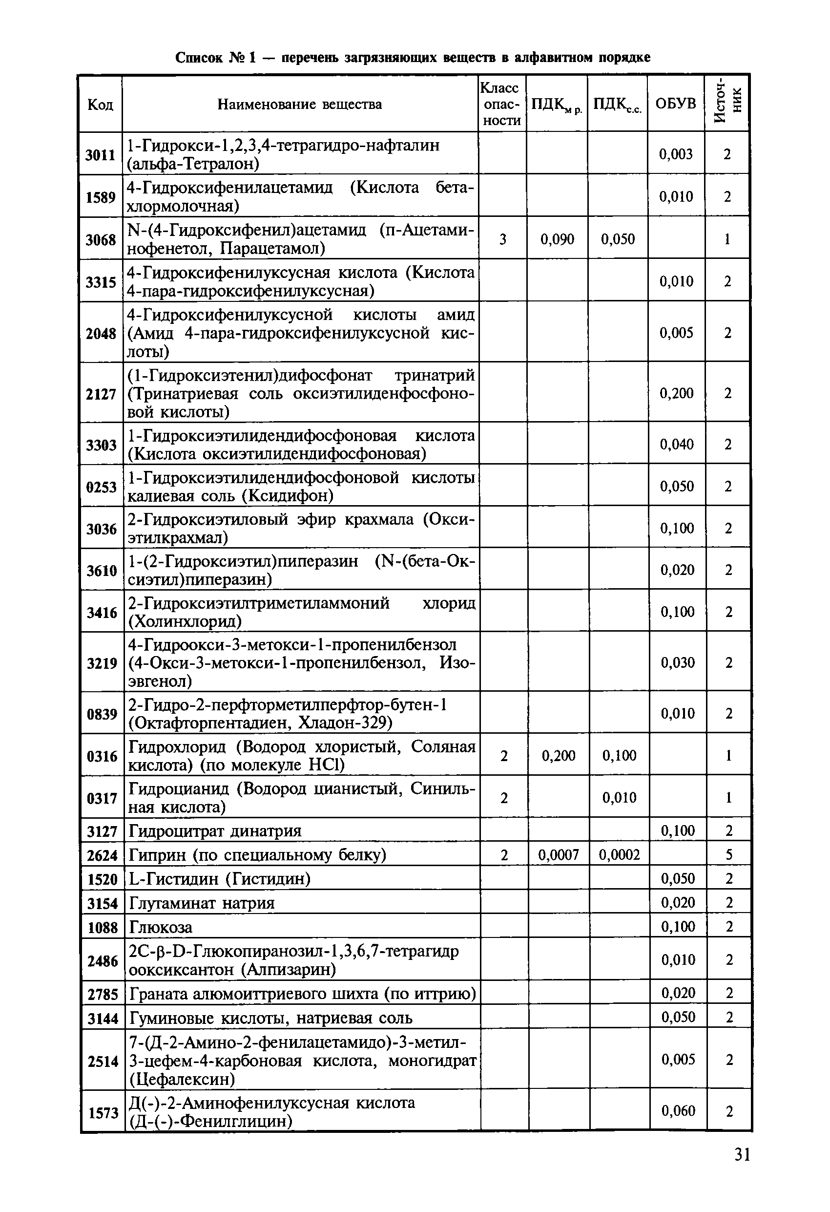 | Оглавление: | Список № 1 Перечень загрязняющих веществ в алфавитном порядке Список № 2 Перечень загрязняющих веществ в порядке возрастания кодов Список № 3 Перечень ЛОС в порядке возрастания кодов Список № 4 Указатель основных синонимов, технических, торговых и фирменных названий веществ в алфавитном порядке А. Для веществ с установленными значениями ПДК Б. Для веществ с установленными значениями ОБУВ Список № 5 Указатель основных синонимов, технических, торговых и фирменных названий веществ в порядке возрастания кодов А. Для веществ с установленными значениями ПДК Б. Для веществ с установленными значениями ОБУВ |