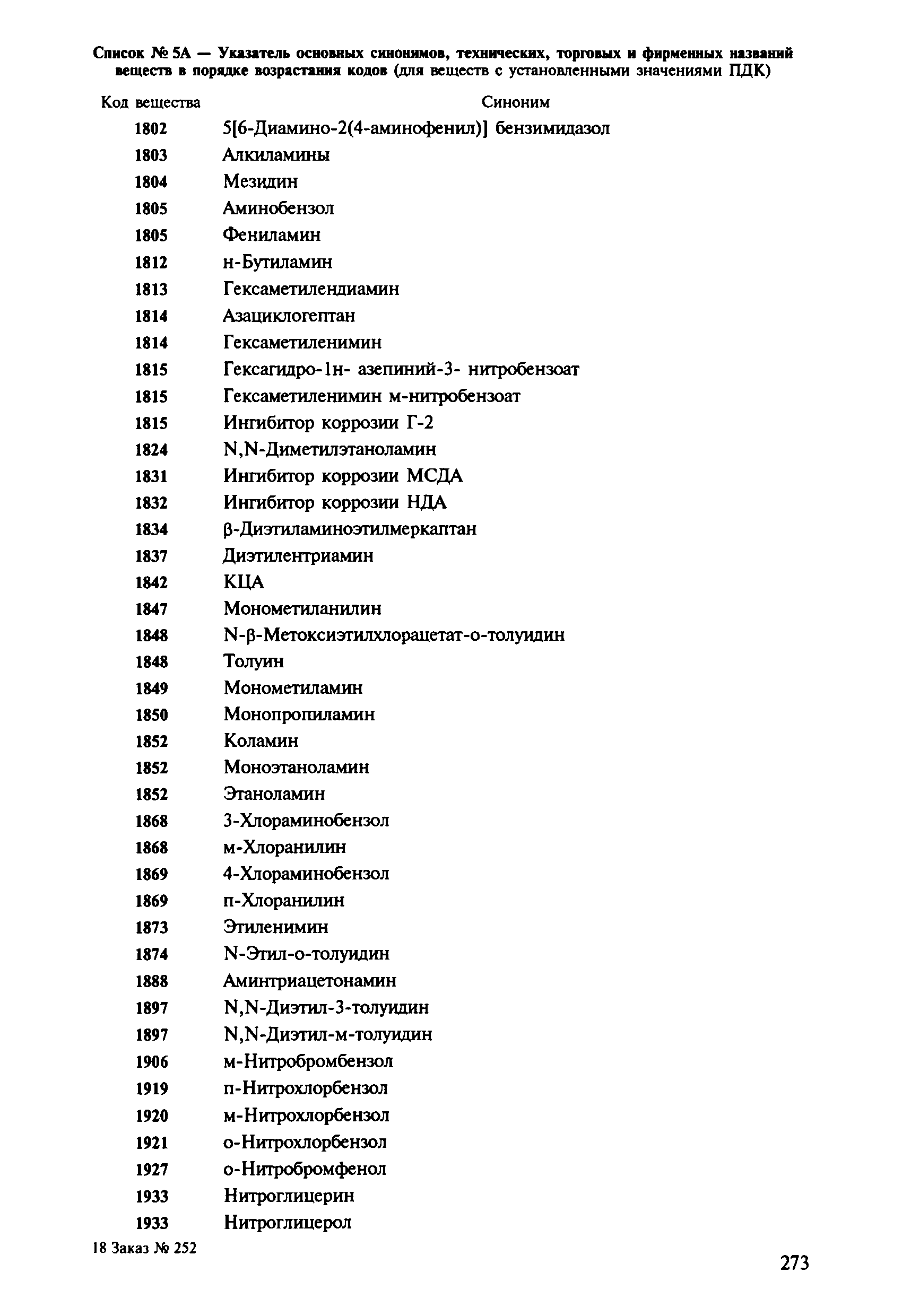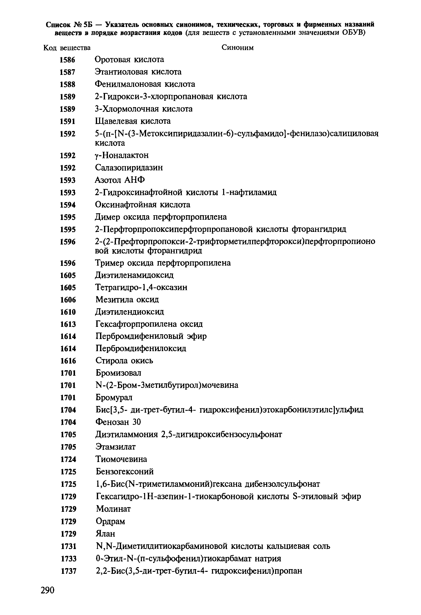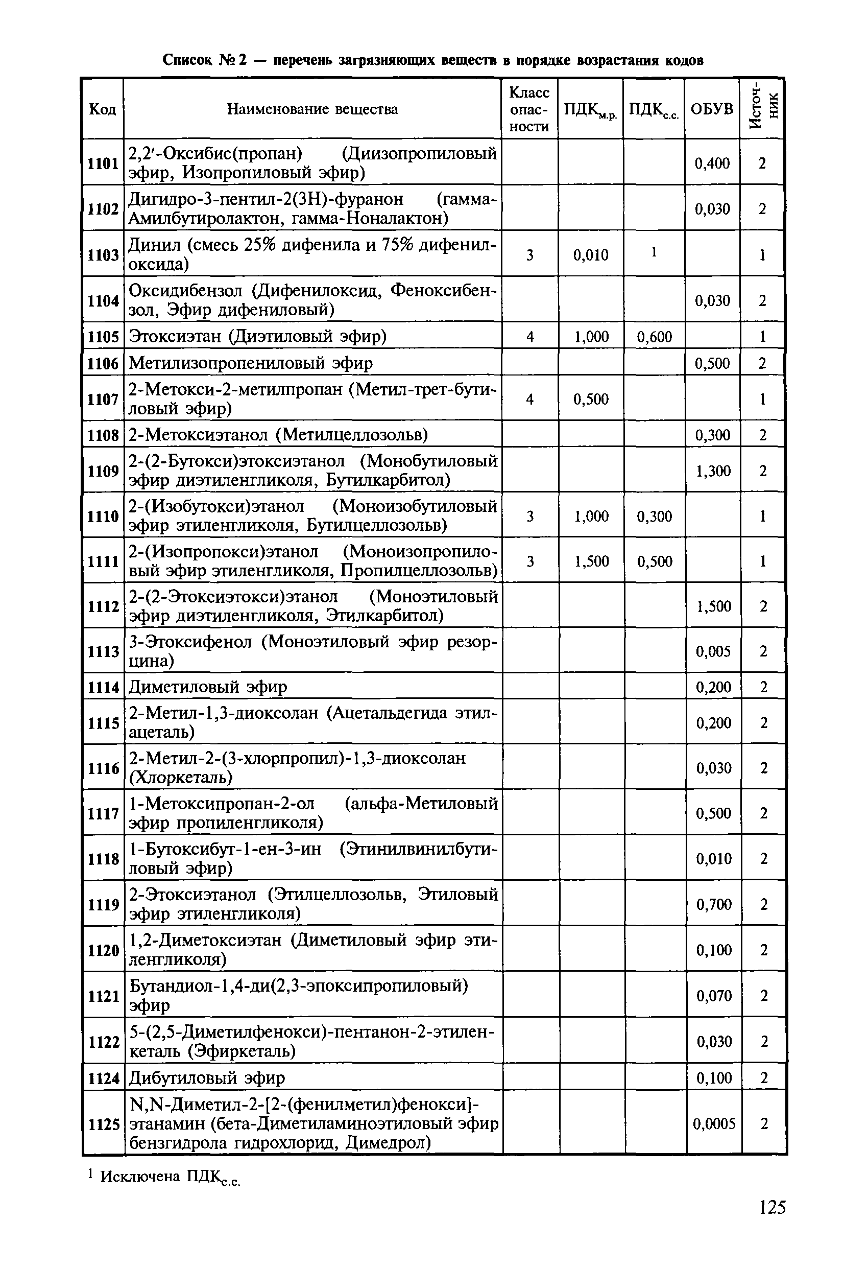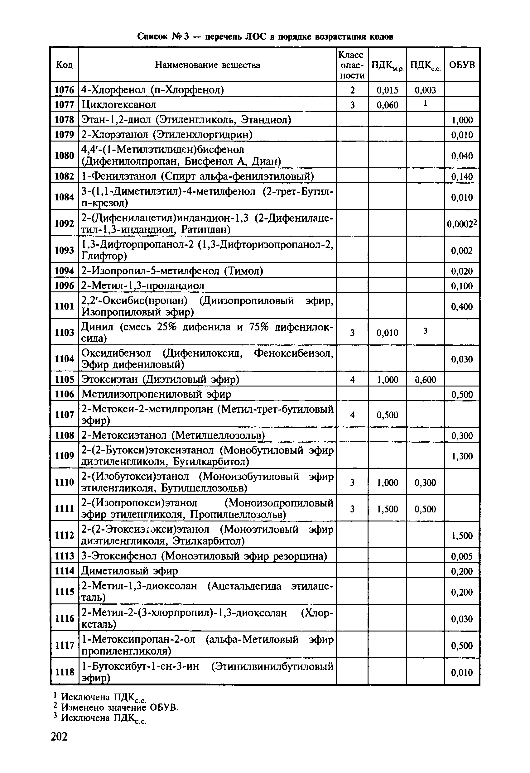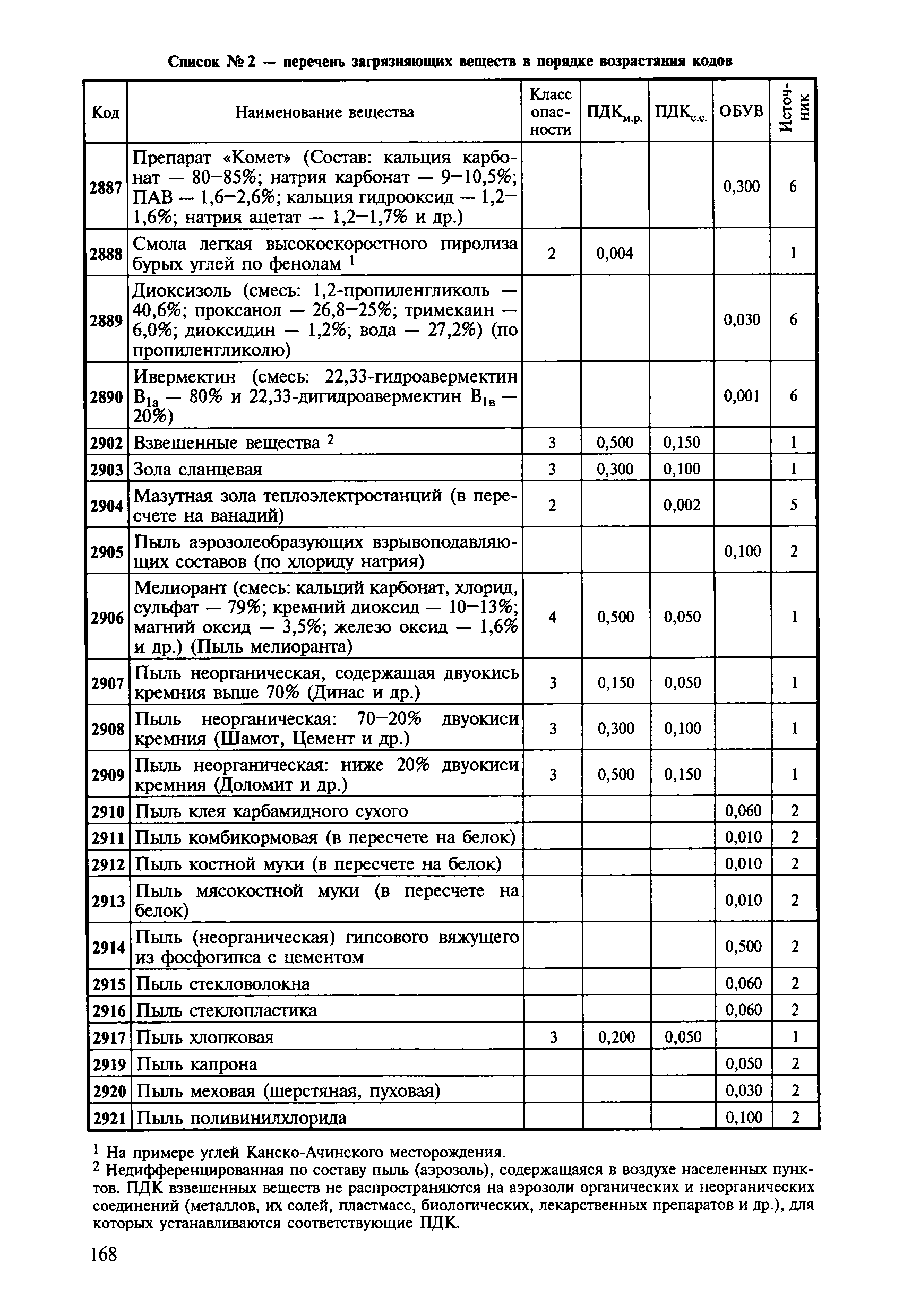 | Оглавление: | Список № 1 Перечень загрязняющих веществ в алфавитном порядке Список № 2 Перечень загрязняющих веществ в порядке возрастания кодов Список № 3 Перечень ЛОС в порядке возрастания кодов Список № 4 Указатель основных синонимов, технических, торговых и фирменных названий веществ в алфавитном порядке А. Для веществ с установленными значениями ПДК Б. Для веществ с установленными значениями ОБУВ Список № 5 Указатель основных синонимов, технических, торговых и фирменных названий веществ в порядке возрастания кодов А. Для веществ с установленными значениями ПДК Б. Для веществ с установленными значениями ОБУВ |