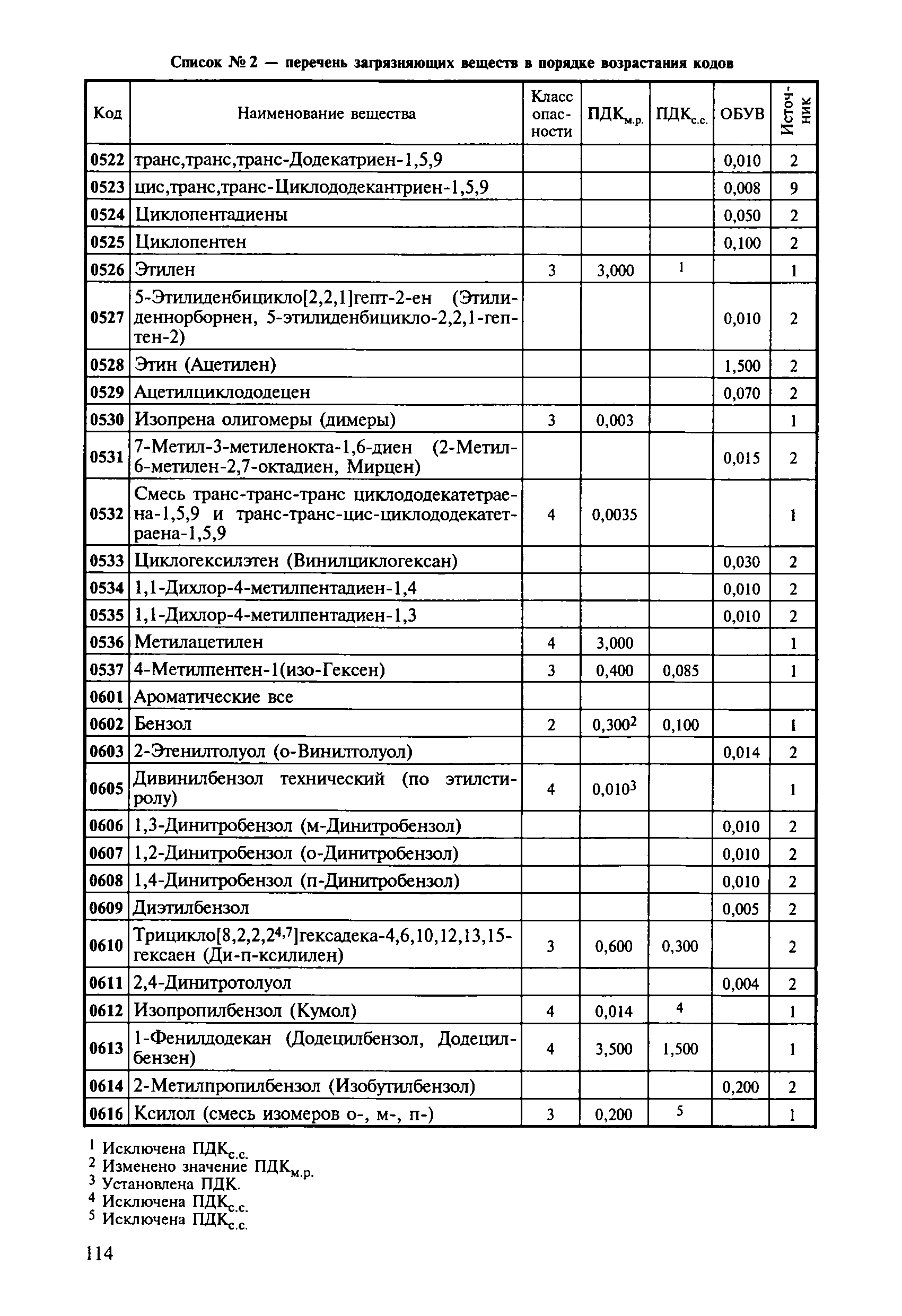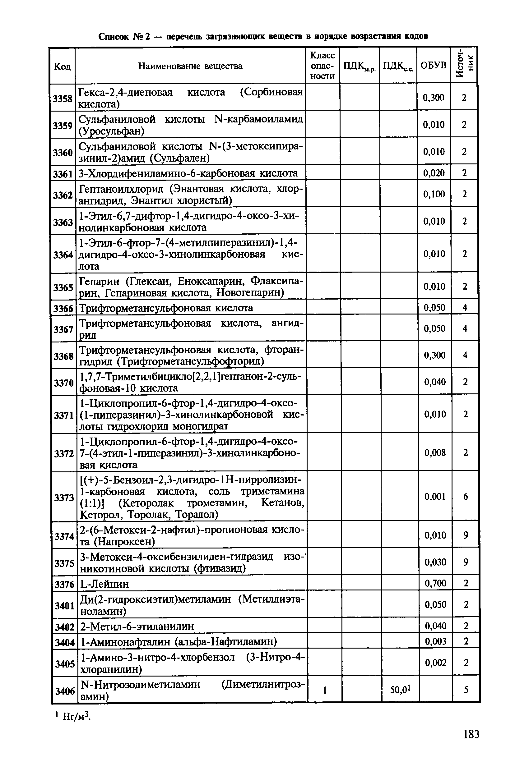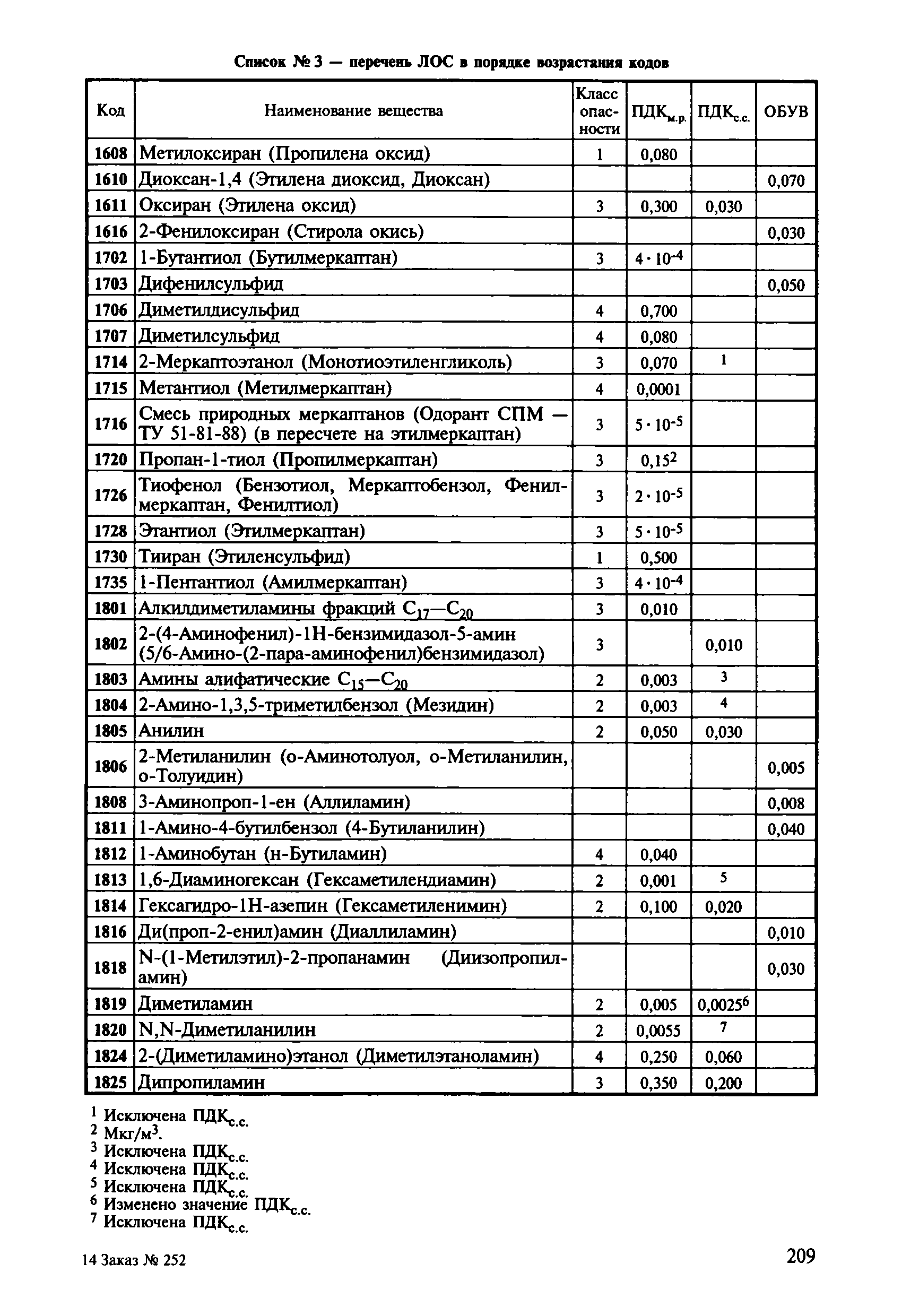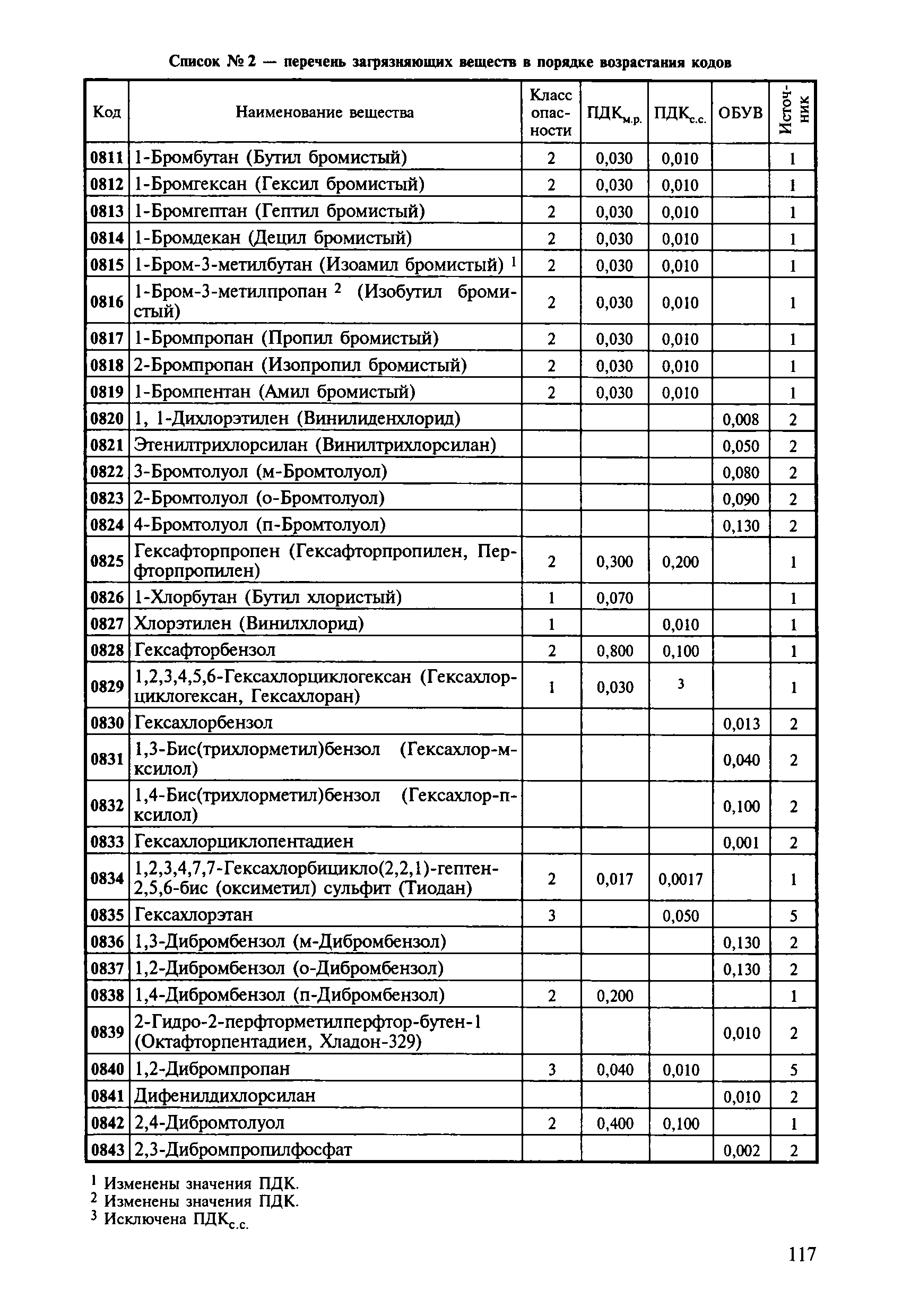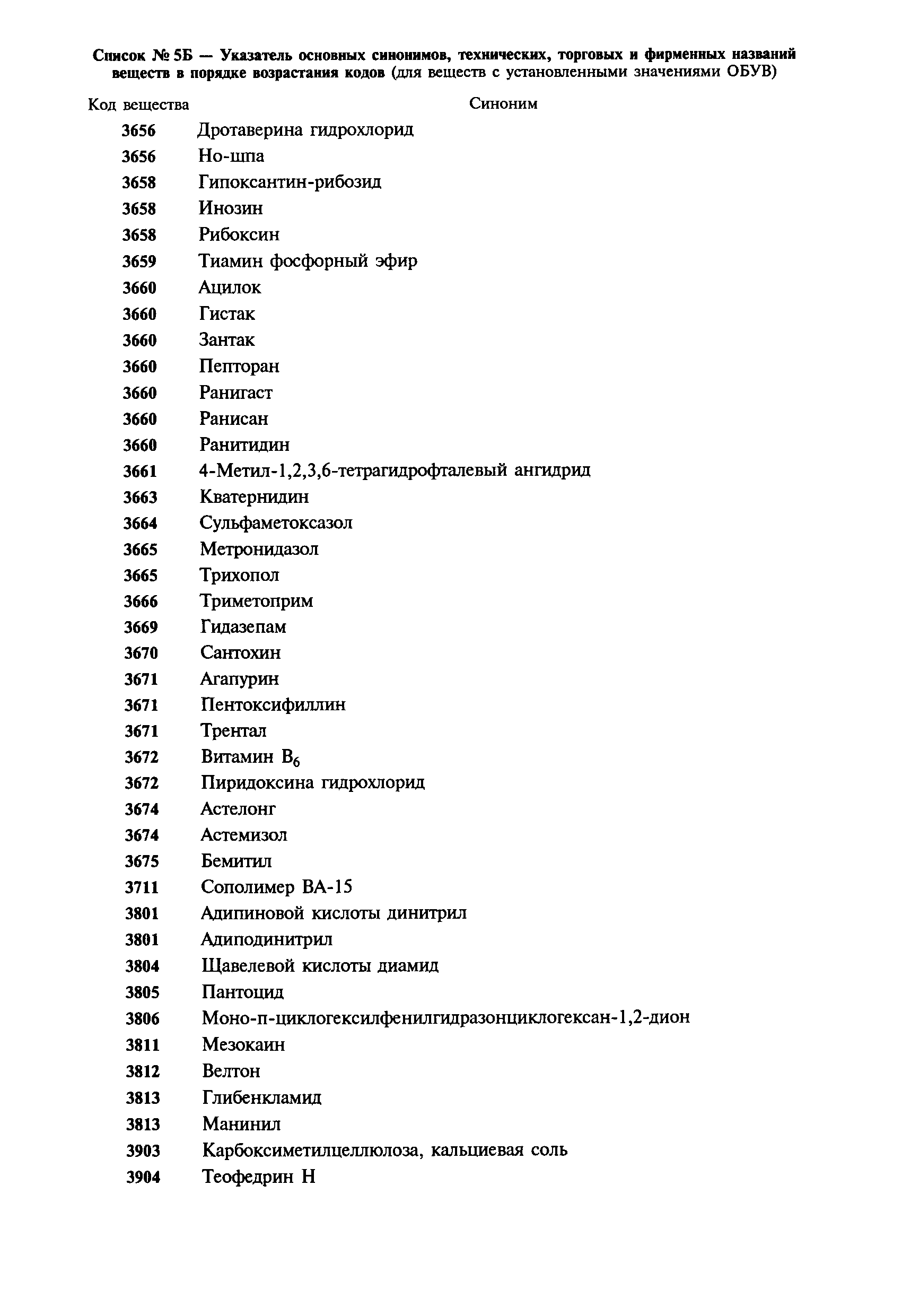 | Оглавление: | Список № 1 Перечень загрязняющих веществ в алфавитном порядке Список № 2 Перечень загрязняющих веществ в порядке возрастания кодов Список № 3 Перечень ЛОС в порядке возрастания кодов Список № 4 Указатель основных синонимов, технических, торговых и фирменных названий веществ в алфавитном порядке А. Для веществ с установленными значениями ПДК Б. Для веществ с установленными значениями ОБУВ Список № 5 Указатель основных синонимов, технических, торговых и фирменных названий веществ в порядке возрастания кодов А. Для веществ с установленными значениями ПДК Б. Для веществ с установленными значениями ОБУВ |
