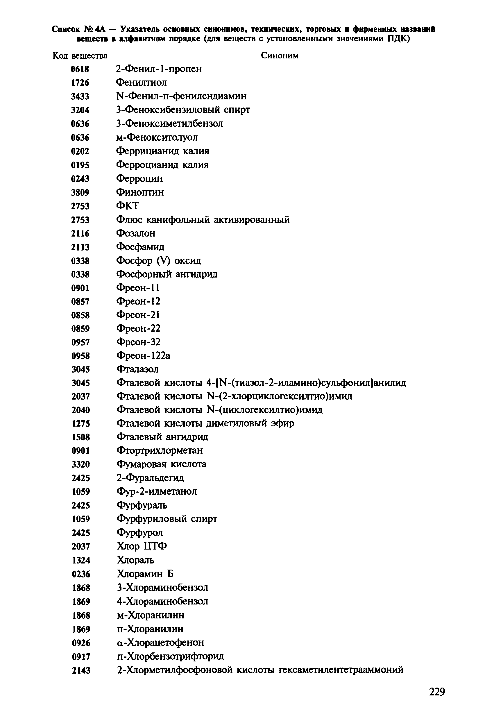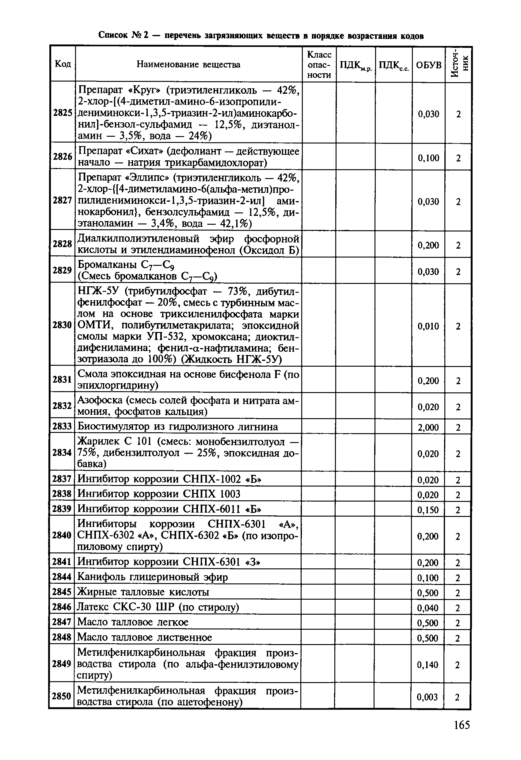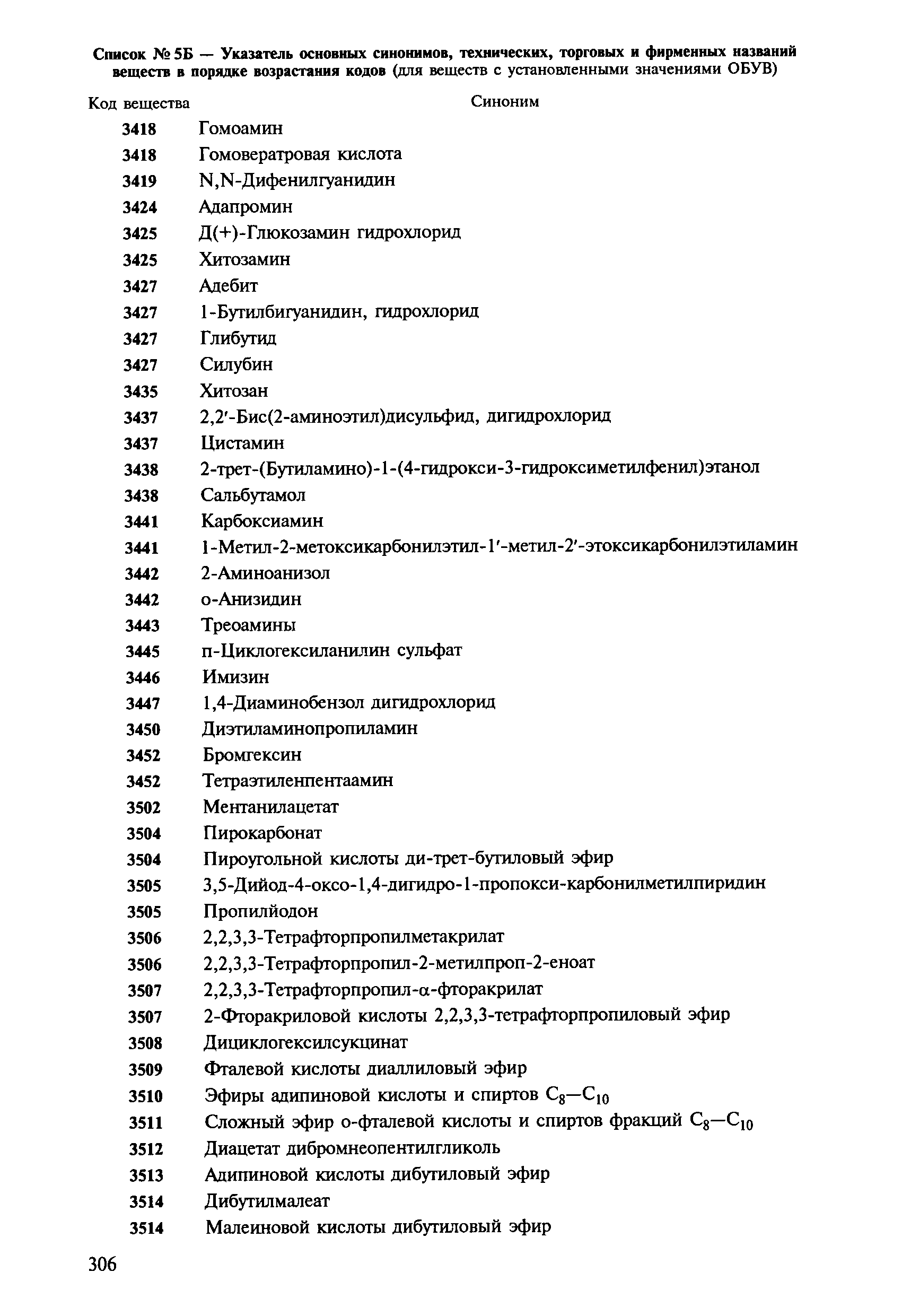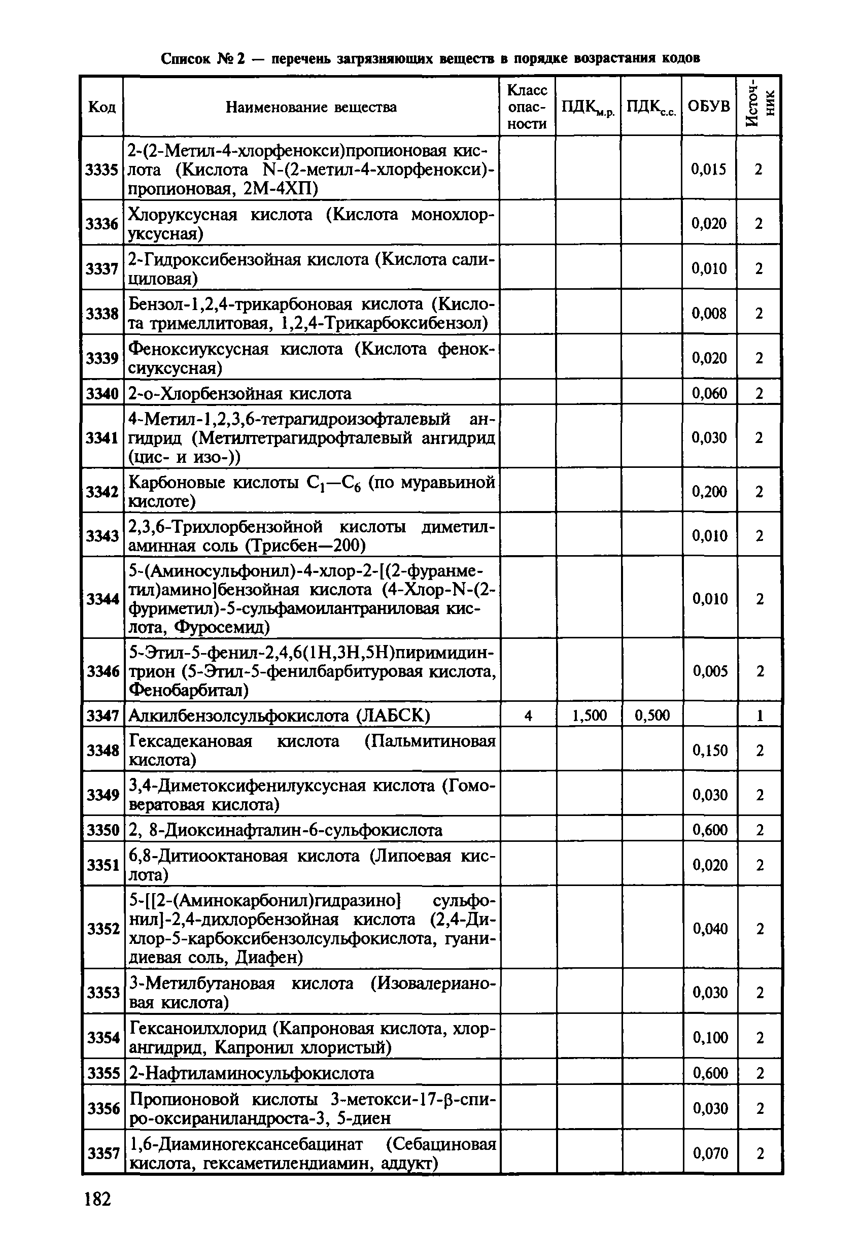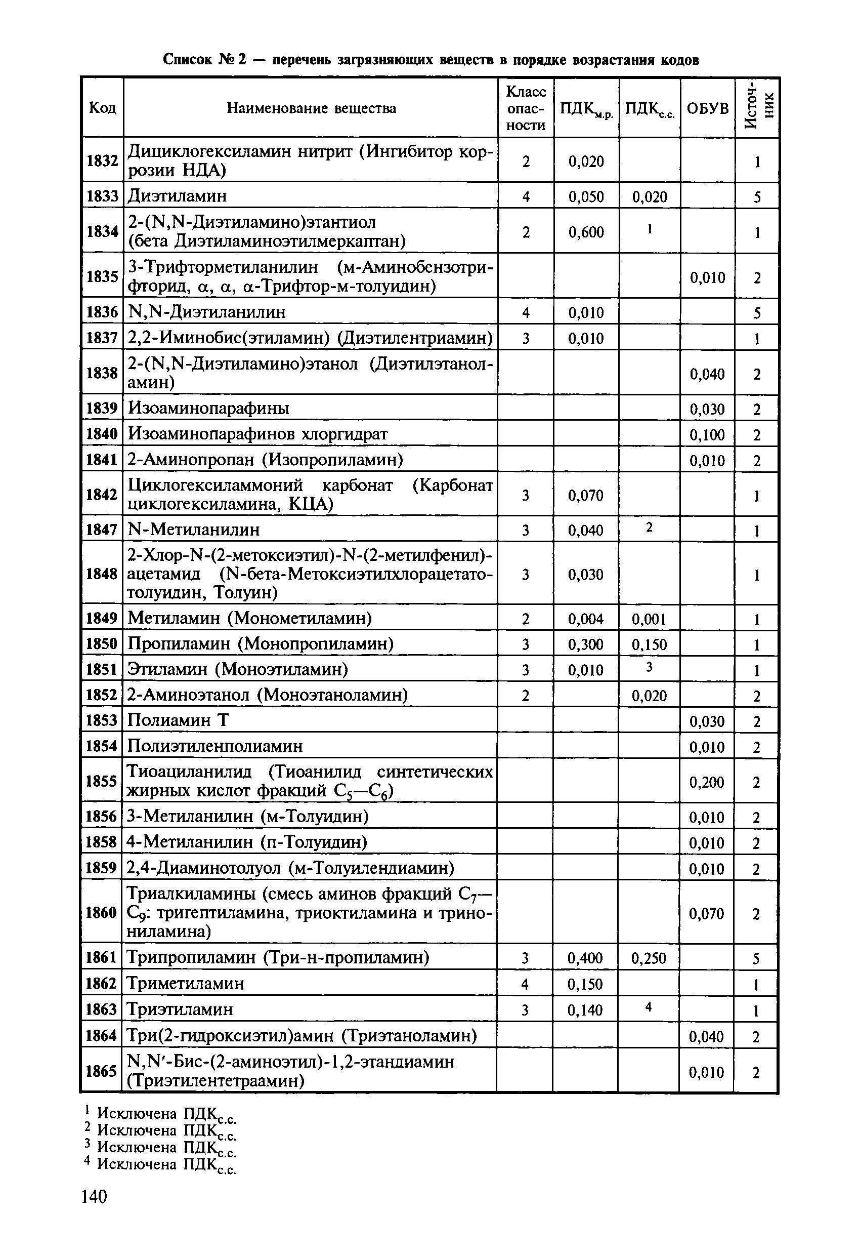 | Оглавление: | Список № 1 Перечень загрязняющих веществ в алфавитном порядке Список № 2 Перечень загрязняющих веществ в порядке возрастания кодов Список № 3 Перечень ЛОС в порядке возрастания кодов Список № 4 Указатель основных синонимов, технических, торговых и фирменных названий веществ в алфавитном порядке А. Для веществ с установленными значениями ПДК Б. Для веществ с установленными значениями ОБУВ Список № 5 Указатель основных синонимов, технических, торговых и фирменных названий веществ в порядке возрастания кодов А. Для веществ с установленными значениями ПДК Б. Для веществ с установленными значениями ОБУВ |