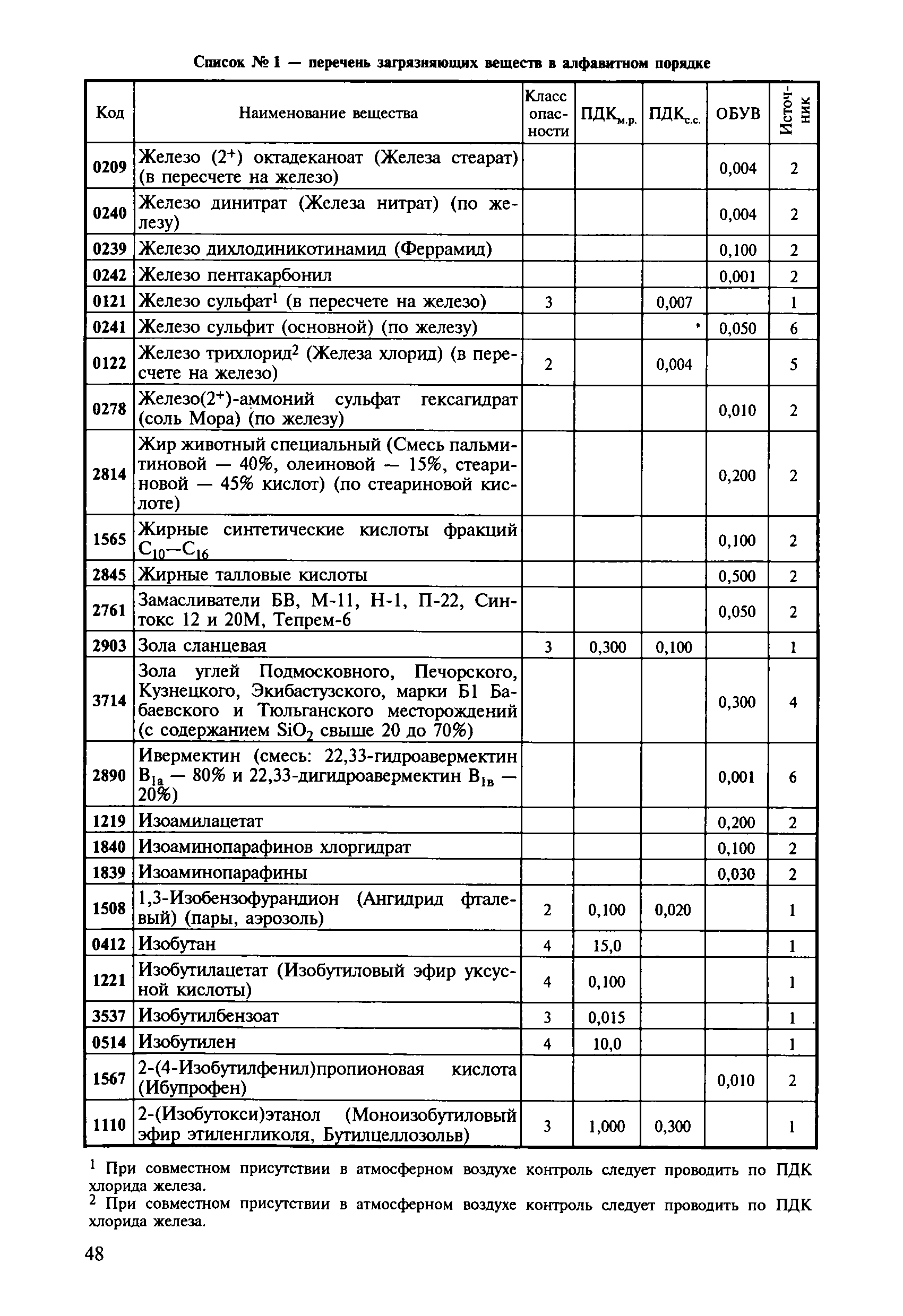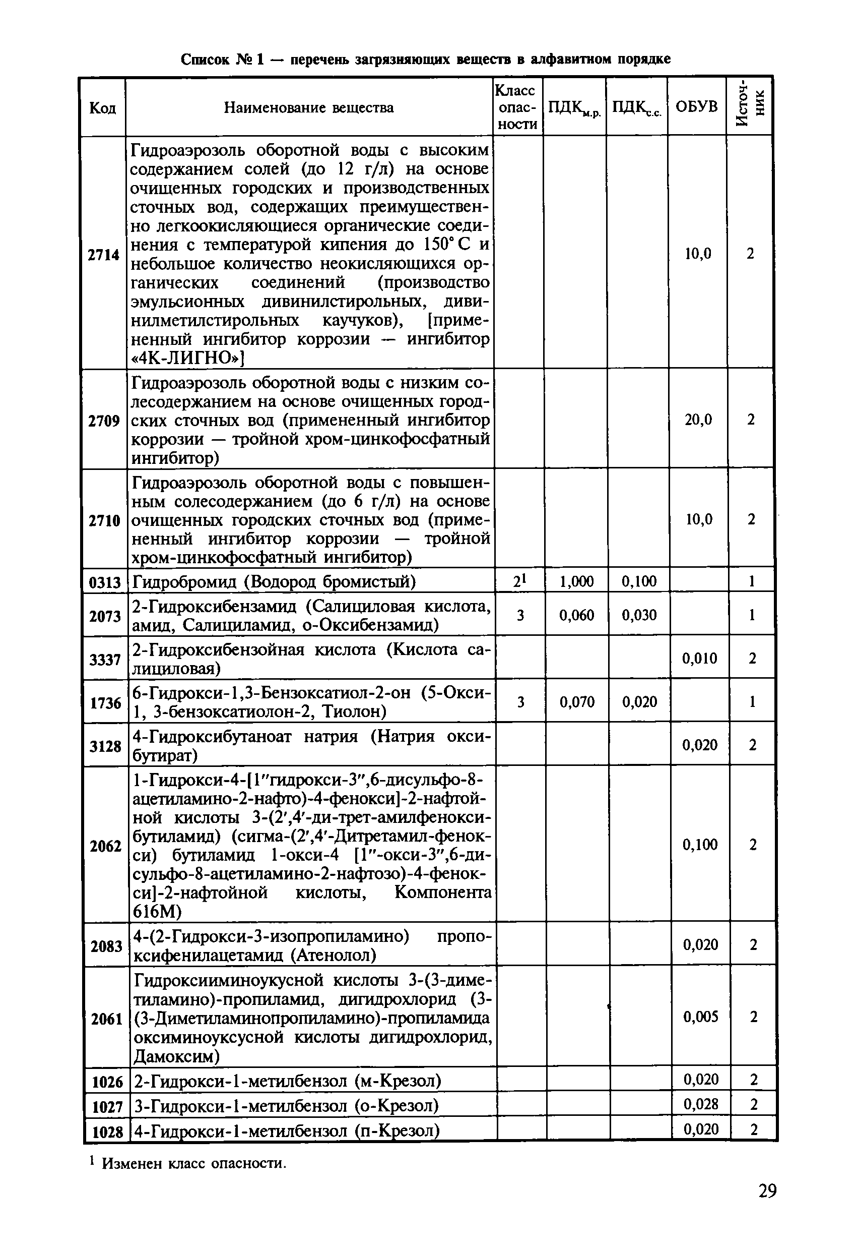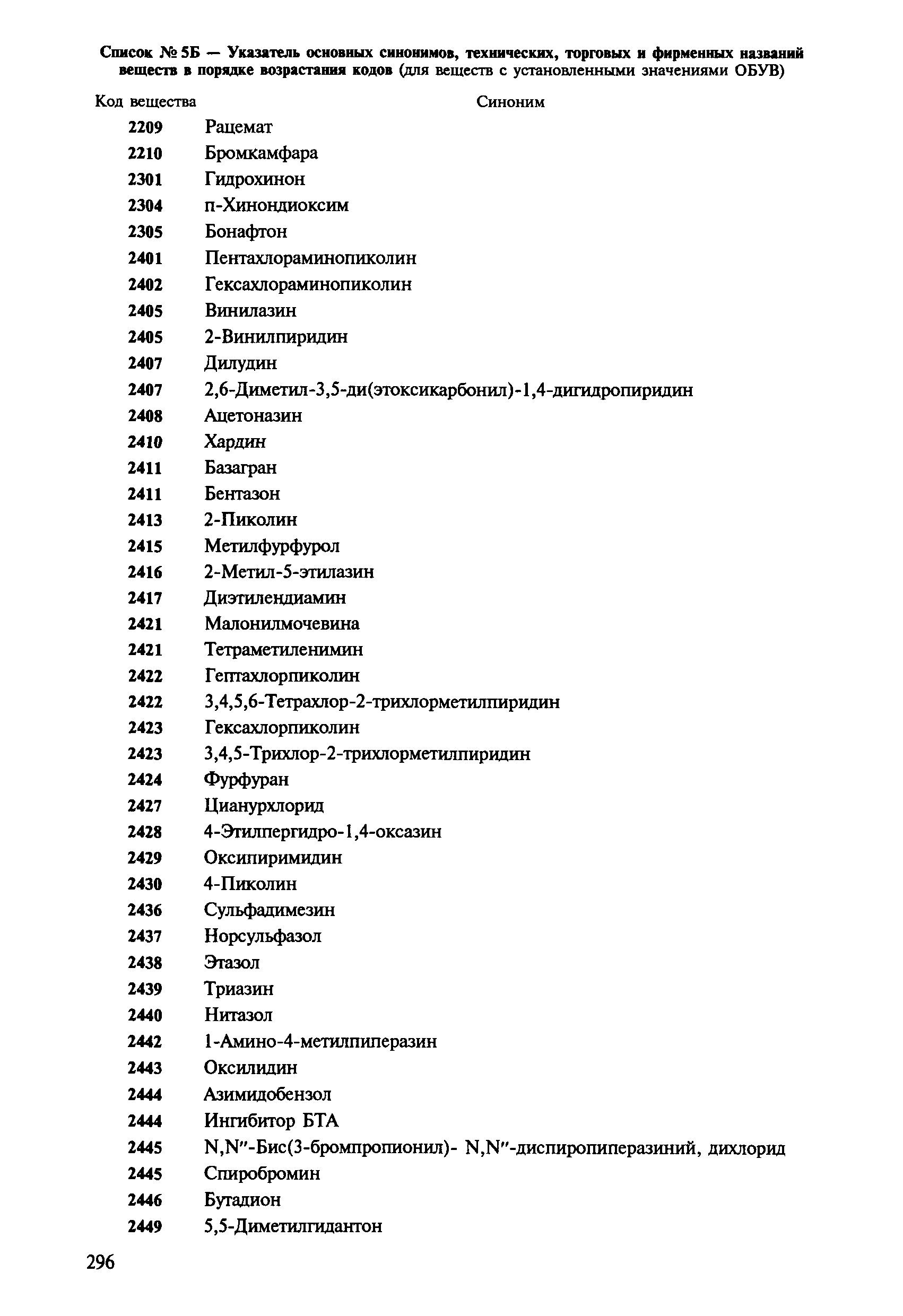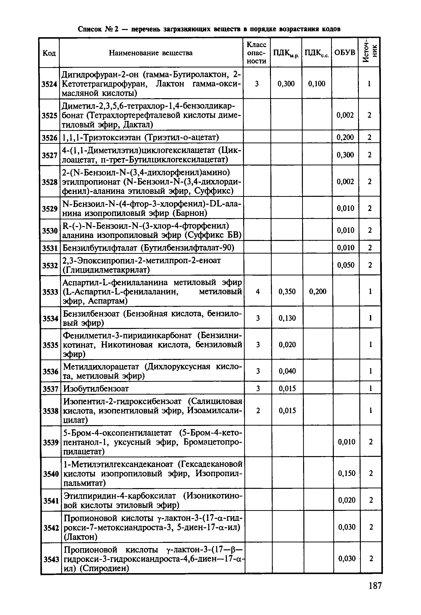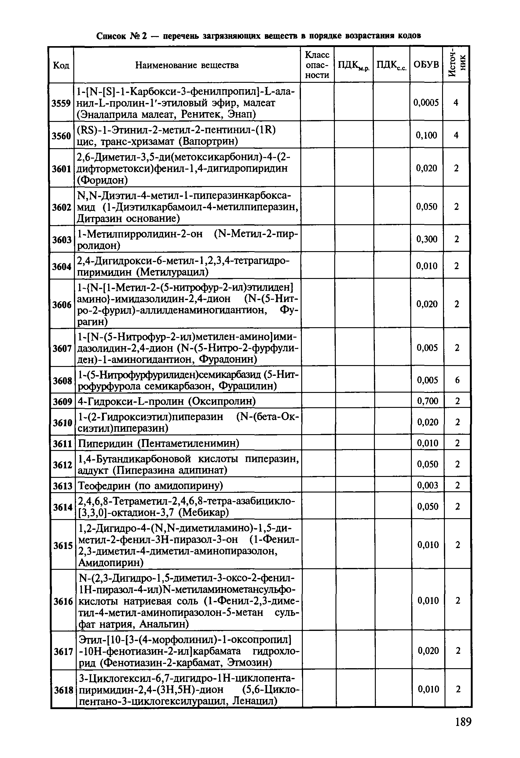 | Оглавление: | Список № 1 Перечень загрязняющих веществ в алфавитном порядке Список № 2 Перечень загрязняющих веществ в порядке возрастания кодов Список № 3 Перечень ЛОС в порядке возрастания кодов Список № 4 Указатель основных синонимов, технических, торговых и фирменных названий веществ в алфавитном порядке А. Для веществ с установленными значениями ПДК Б. Для веществ с установленными значениями ОБУВ Список № 5 Указатель основных синонимов, технических, торговых и фирменных названий веществ в порядке возрастания кодов А. Для веществ с установленными значениями ПДК Б. Для веществ с установленными значениями ОБУВ |
