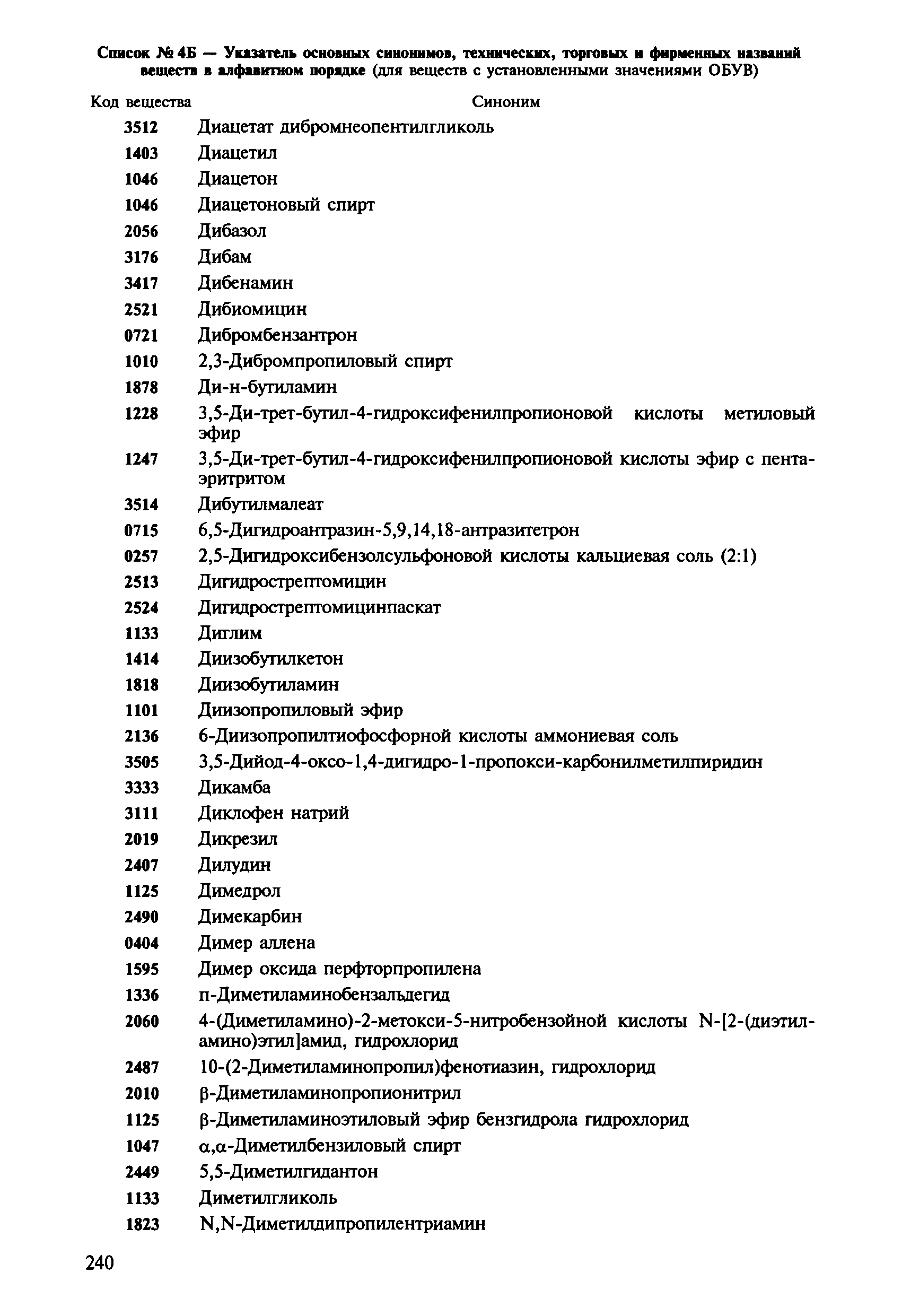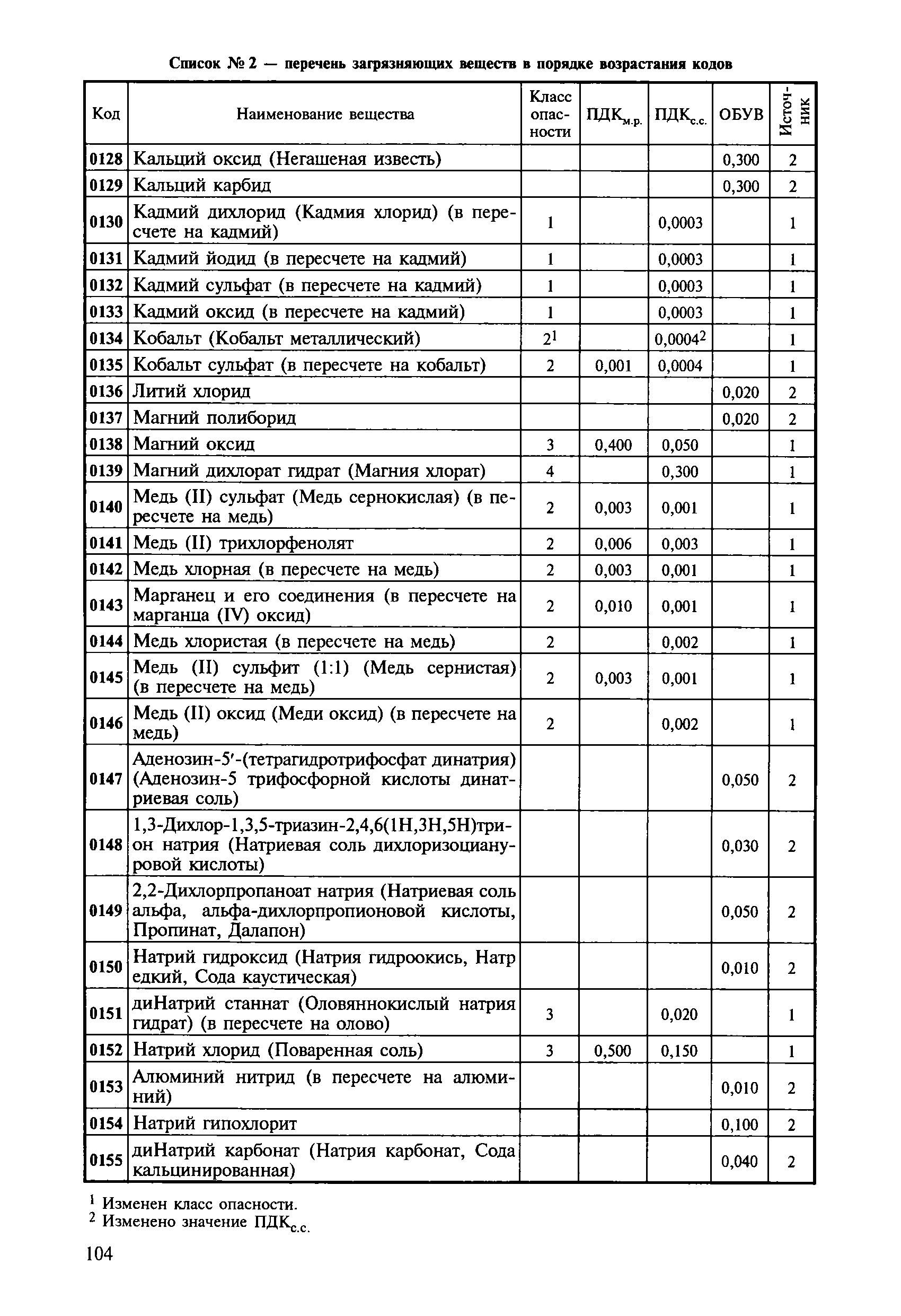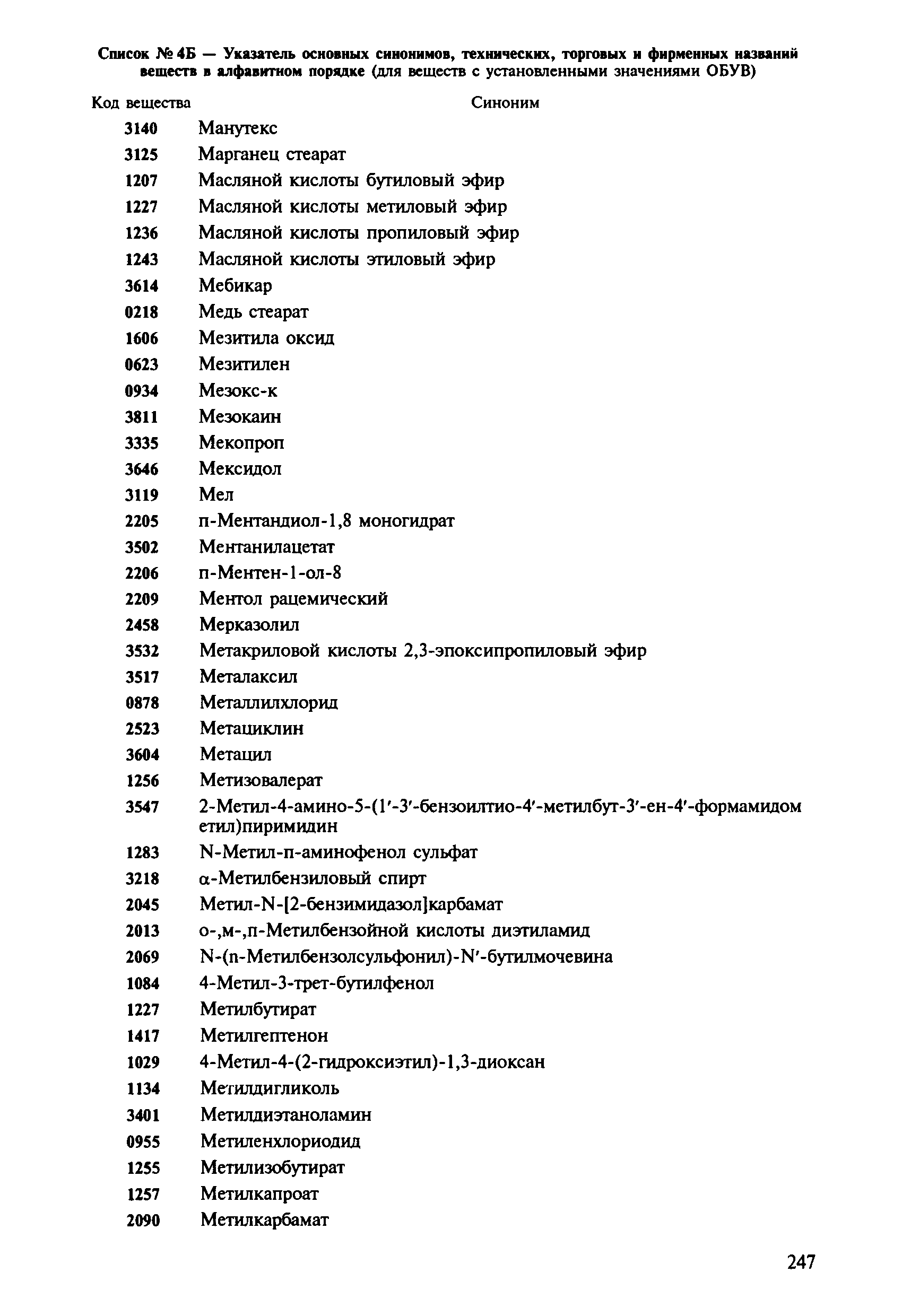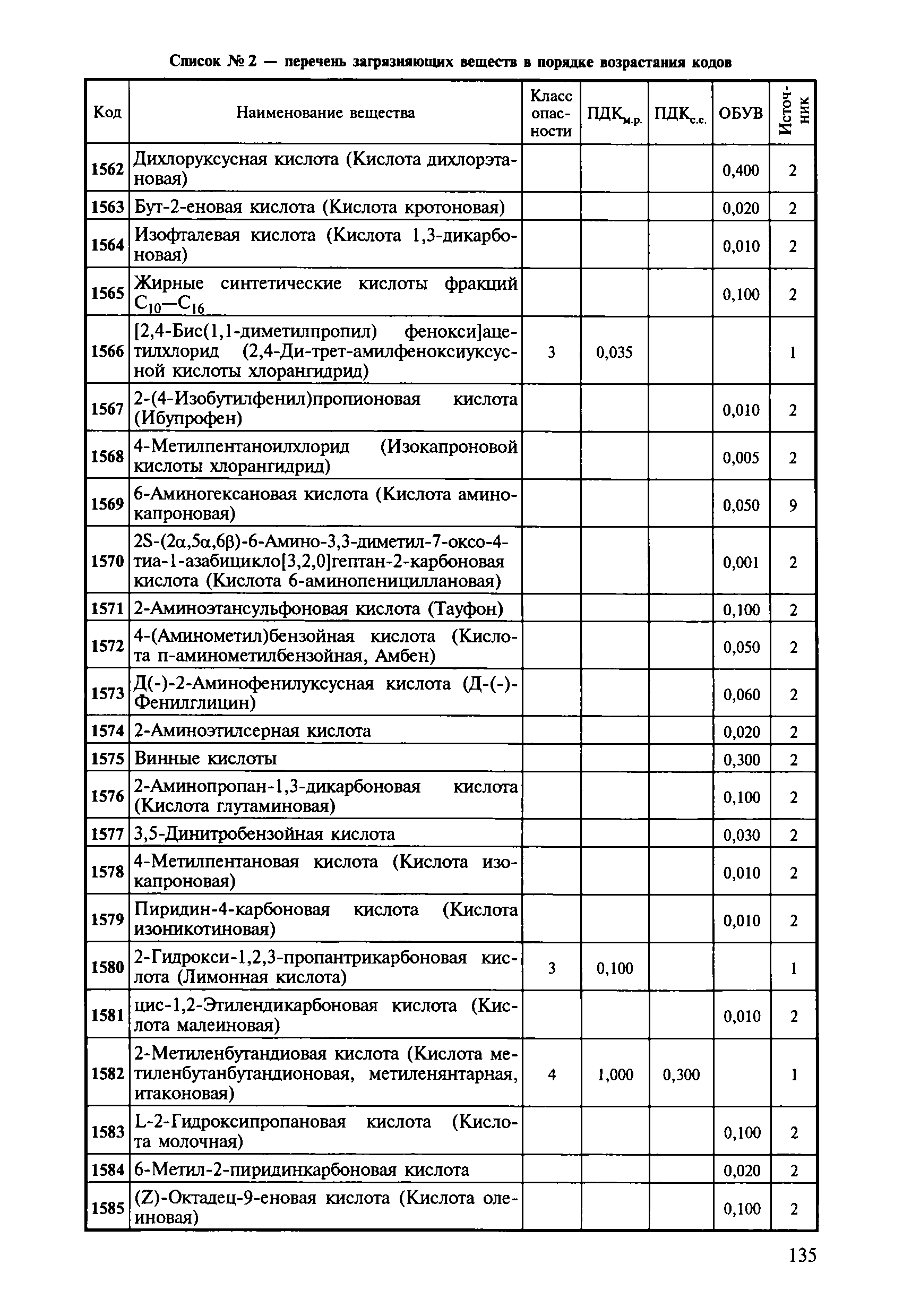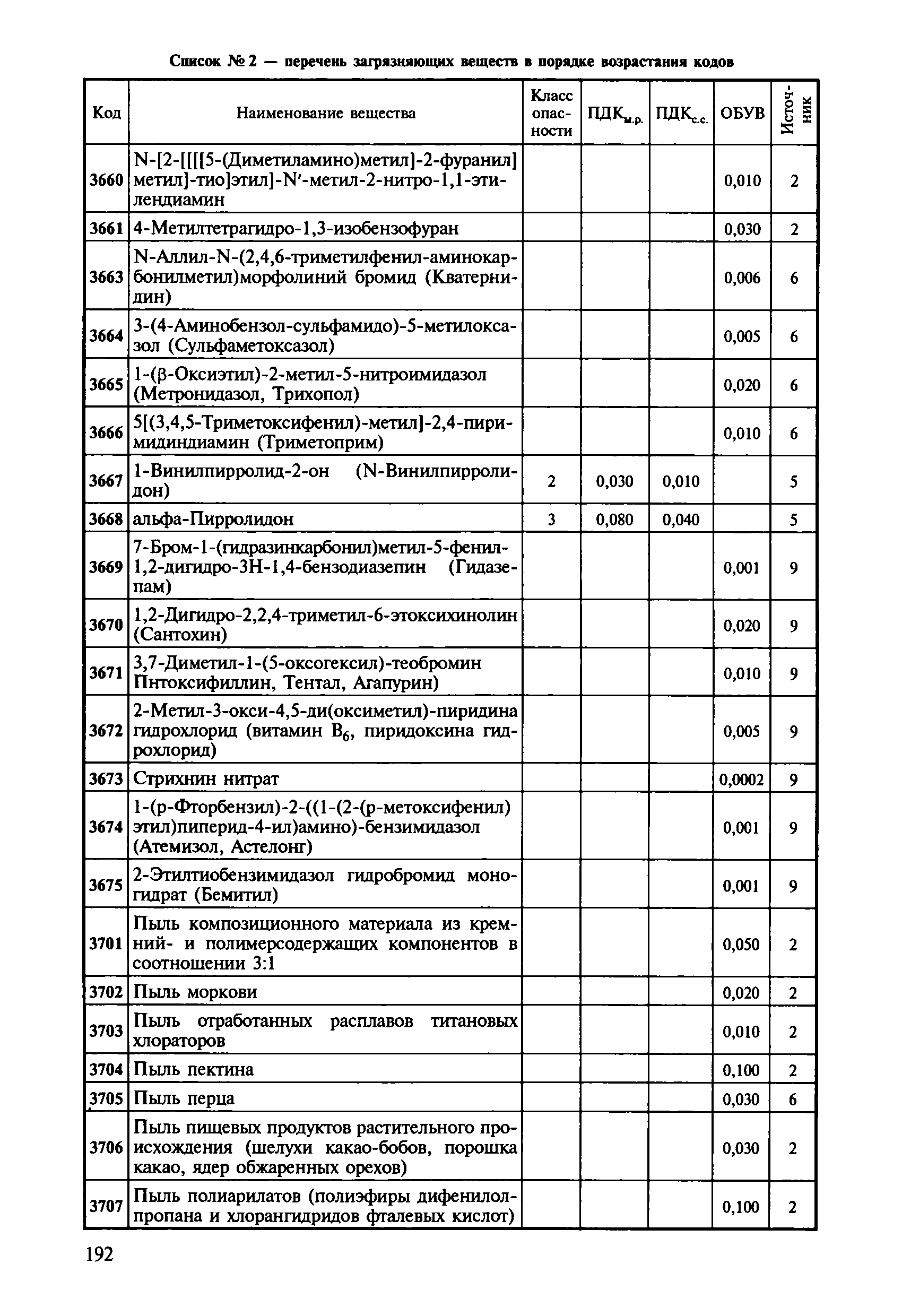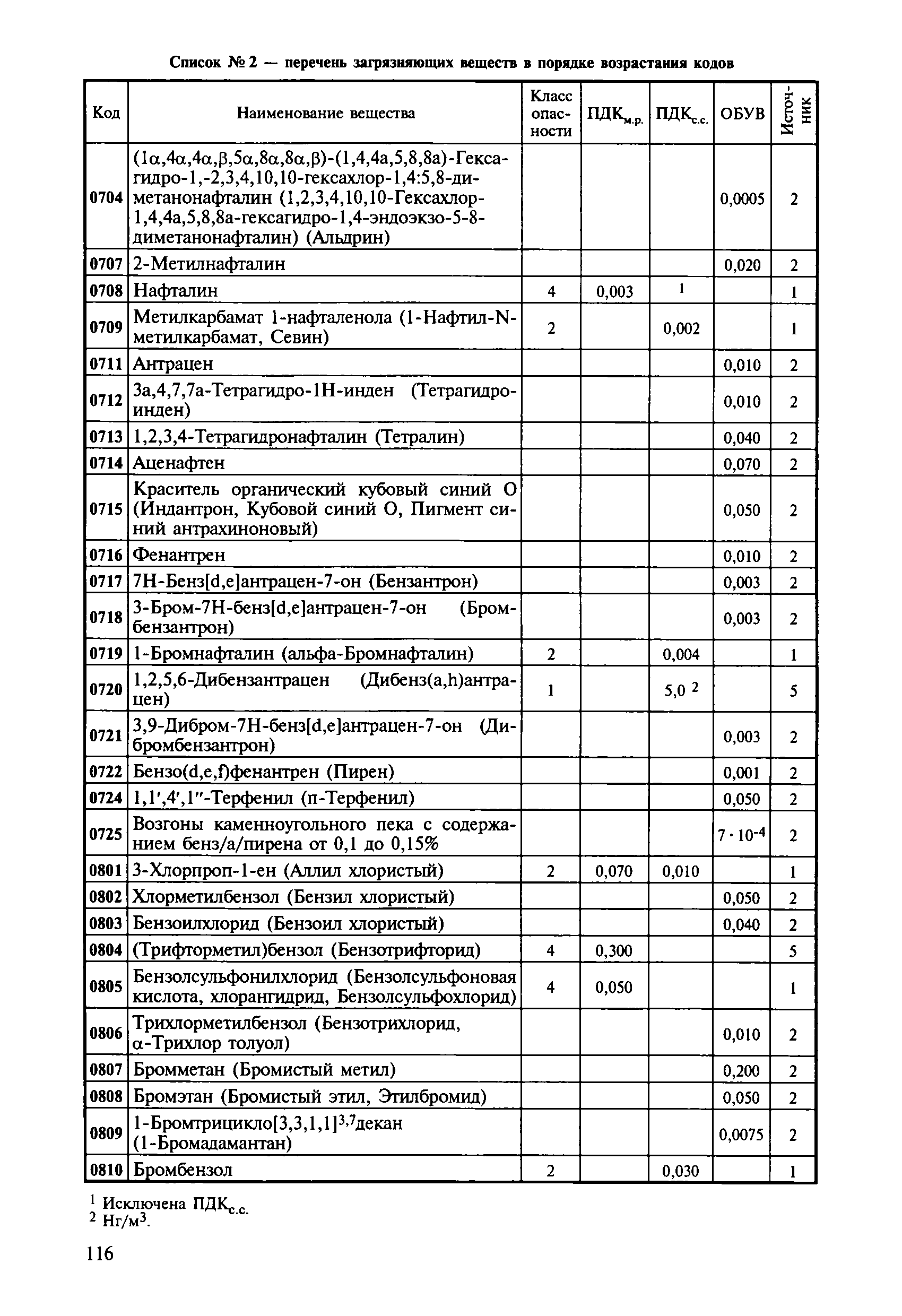 | Оглавление: | Список № 1 Перечень загрязняющих веществ в алфавитном порядке Список № 2 Перечень загрязняющих веществ в порядке возрастания кодов Список № 3 Перечень ЛОС в порядке возрастания кодов Список № 4 Указатель основных синонимов, технических, торговых и фирменных названий веществ в алфавитном порядке А. Для веществ с установленными значениями ПДК Б. Для веществ с установленными значениями ОБУВ Список № 5 Указатель основных синонимов, технических, торговых и фирменных названий веществ в порядке возрастания кодов А. Для веществ с установленными значениями ПДК Б. Для веществ с установленными значениями ОБУВ |