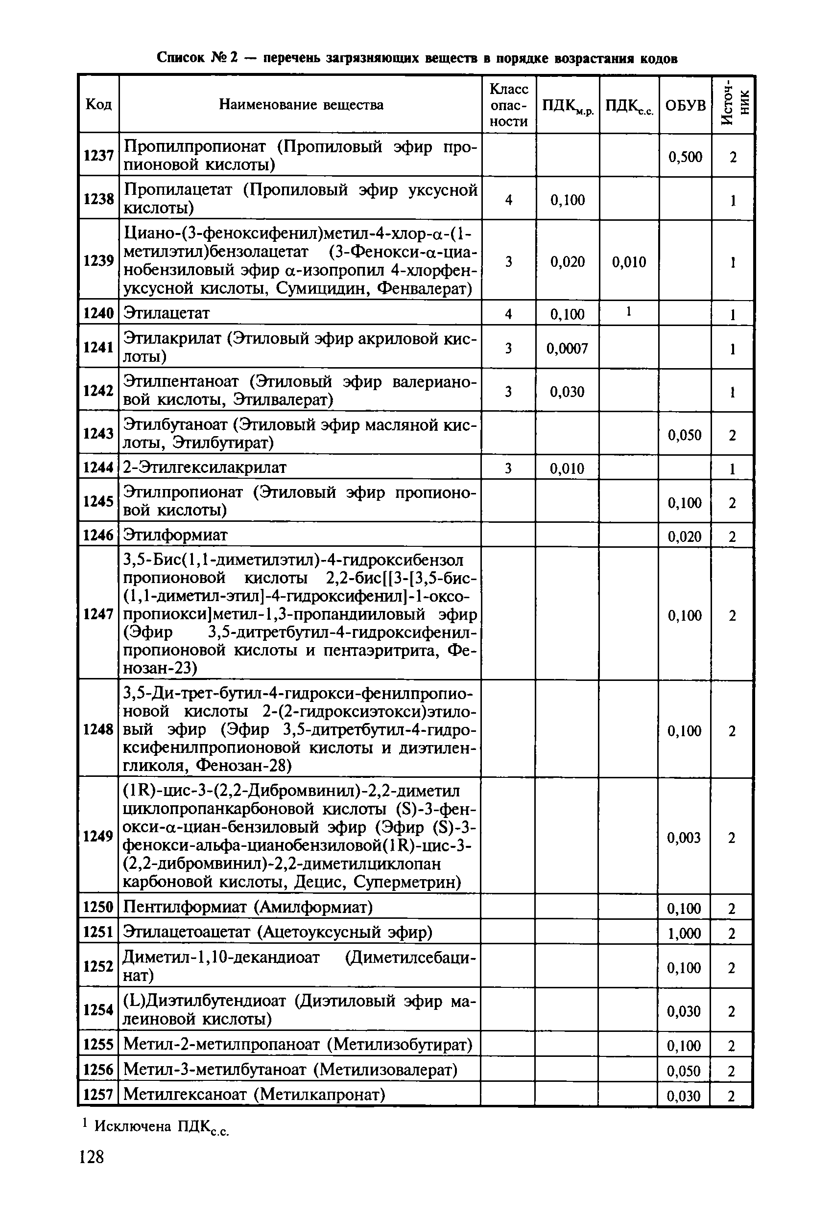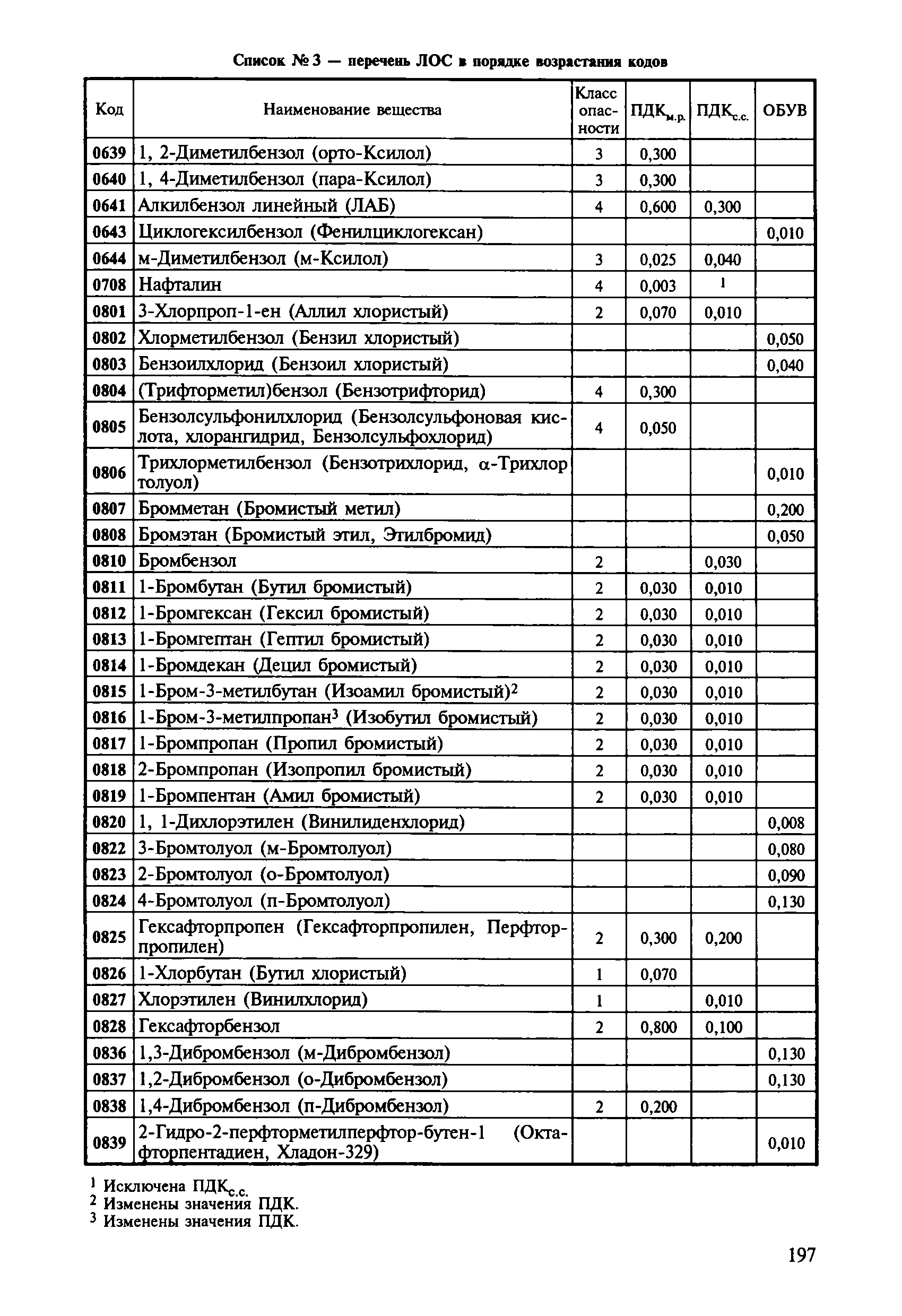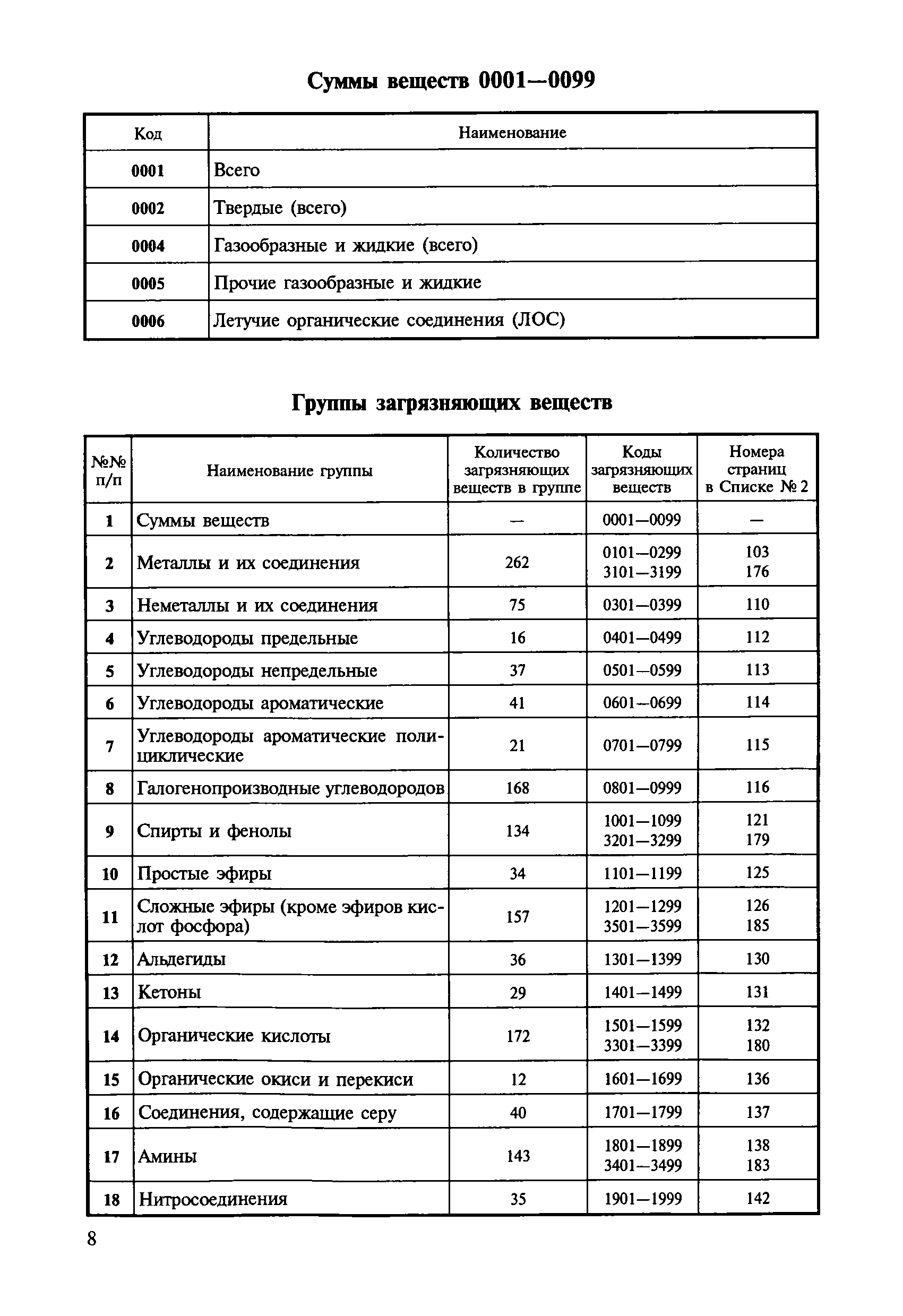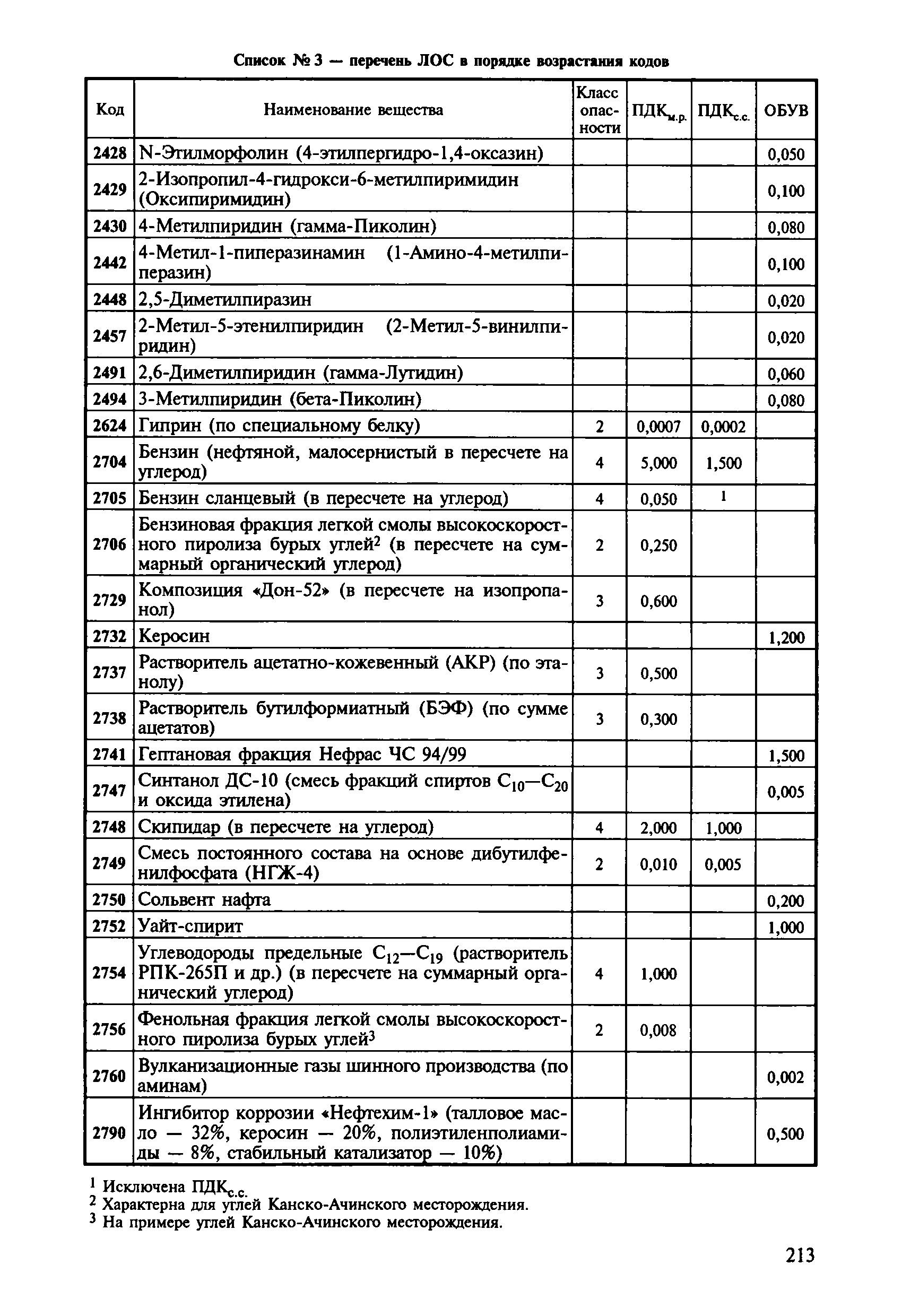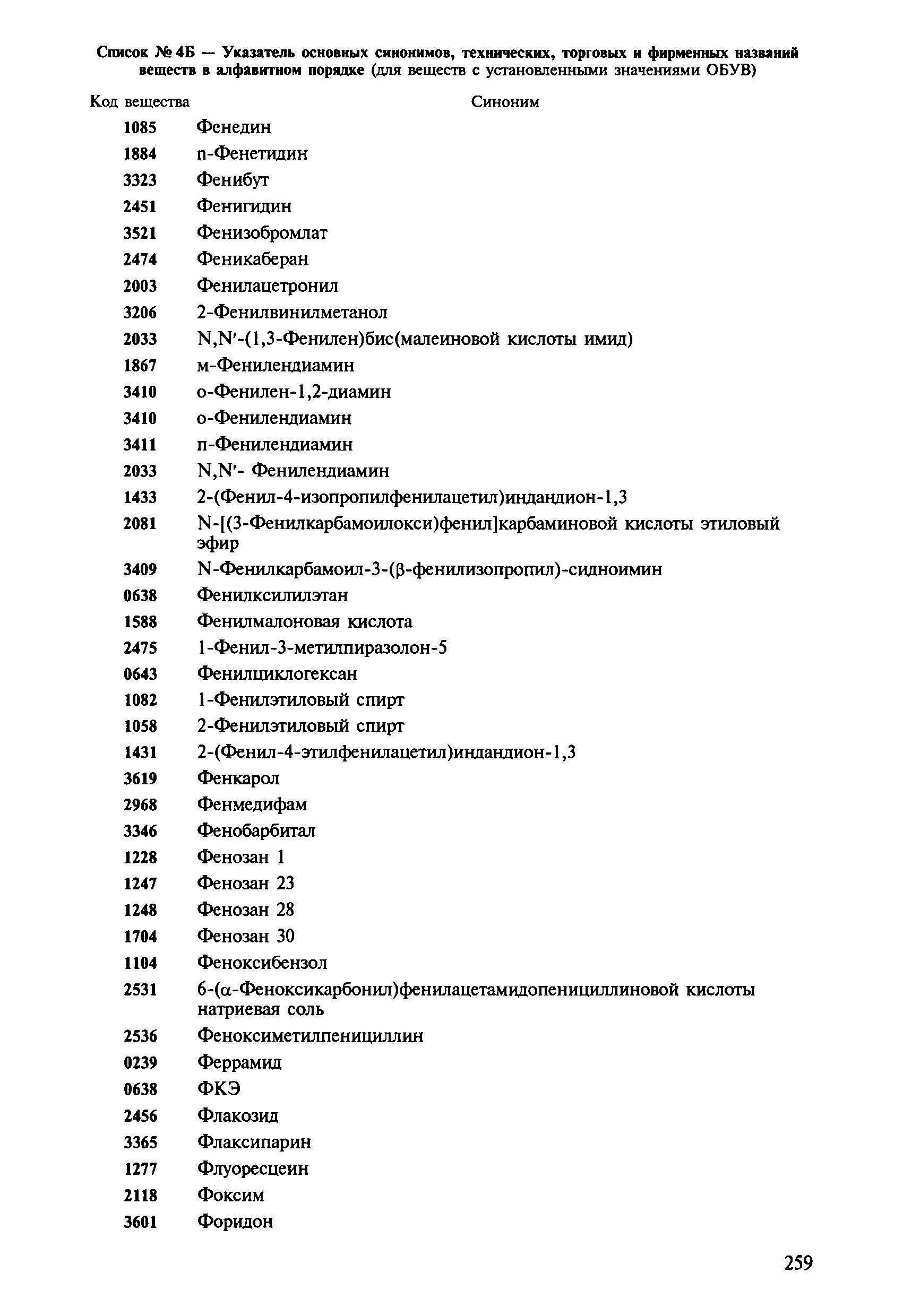 | Оглавление: | Список № 1 Перечень загрязняющих веществ в алфавитном порядке Список № 2 Перечень загрязняющих веществ в порядке возрастания кодов Список № 3 Перечень ЛОС в порядке возрастания кодов Список № 4 Указатель основных синонимов, технических, торговых и фирменных названий веществ в алфавитном порядке А. Для веществ с установленными значениями ПДК Б. Для веществ с установленными значениями ОБУВ Список № 5 Указатель основных синонимов, технических, торговых и фирменных названий веществ в порядке возрастания кодов А. Для веществ с установленными значениями ПДК Б. Для веществ с установленными значениями ОБУВ |