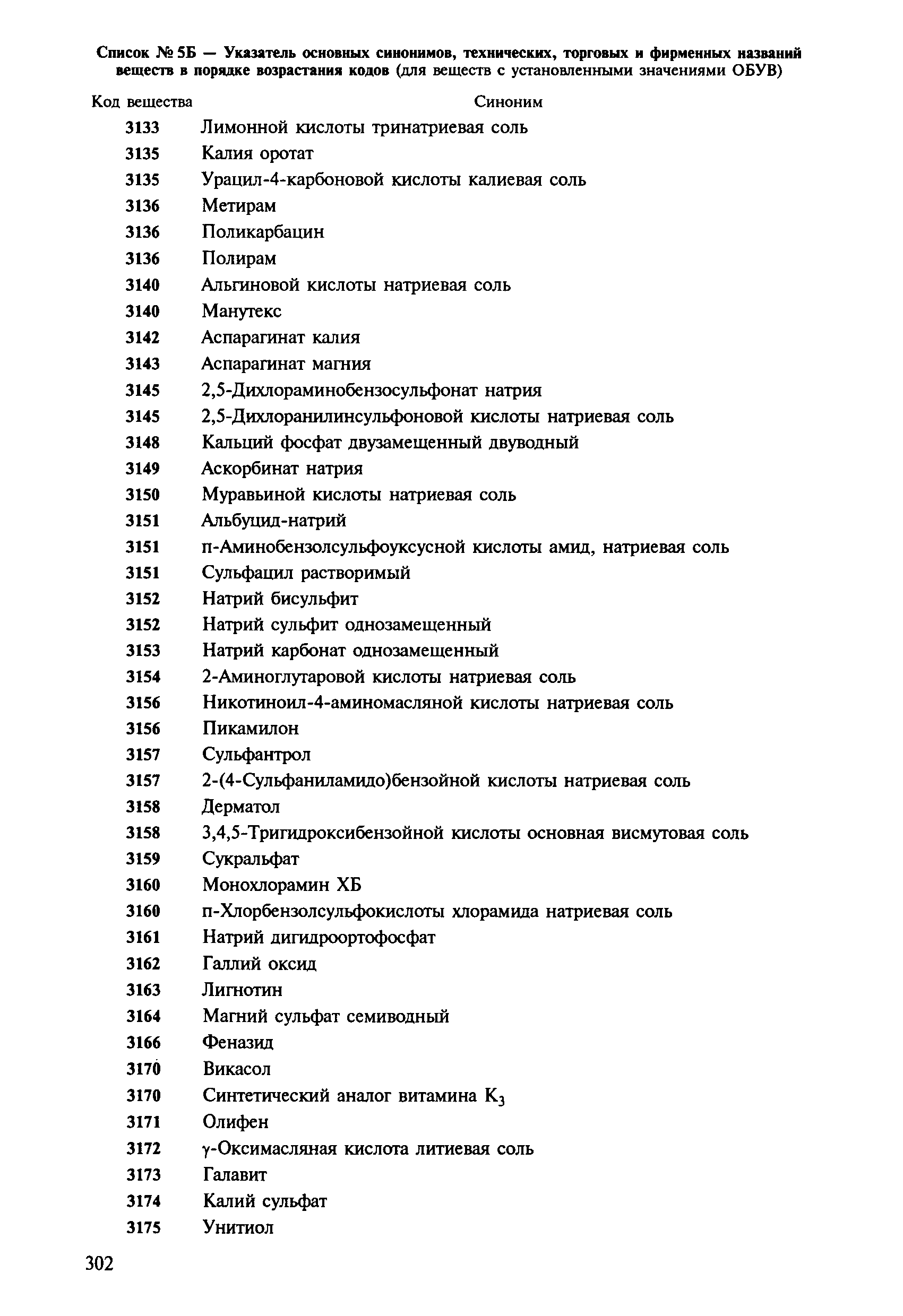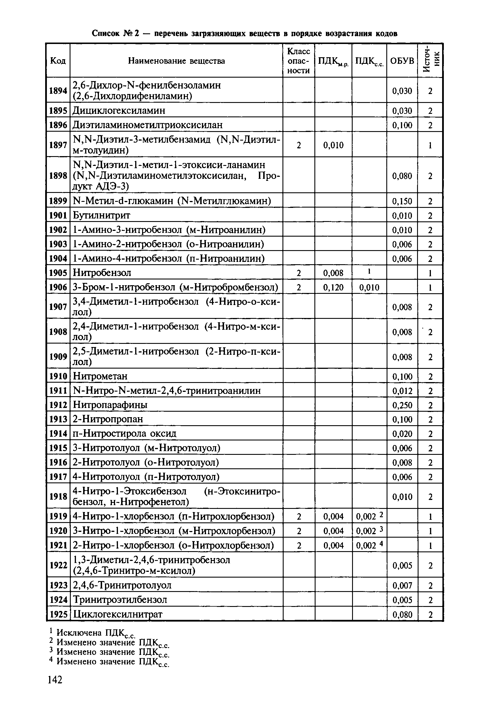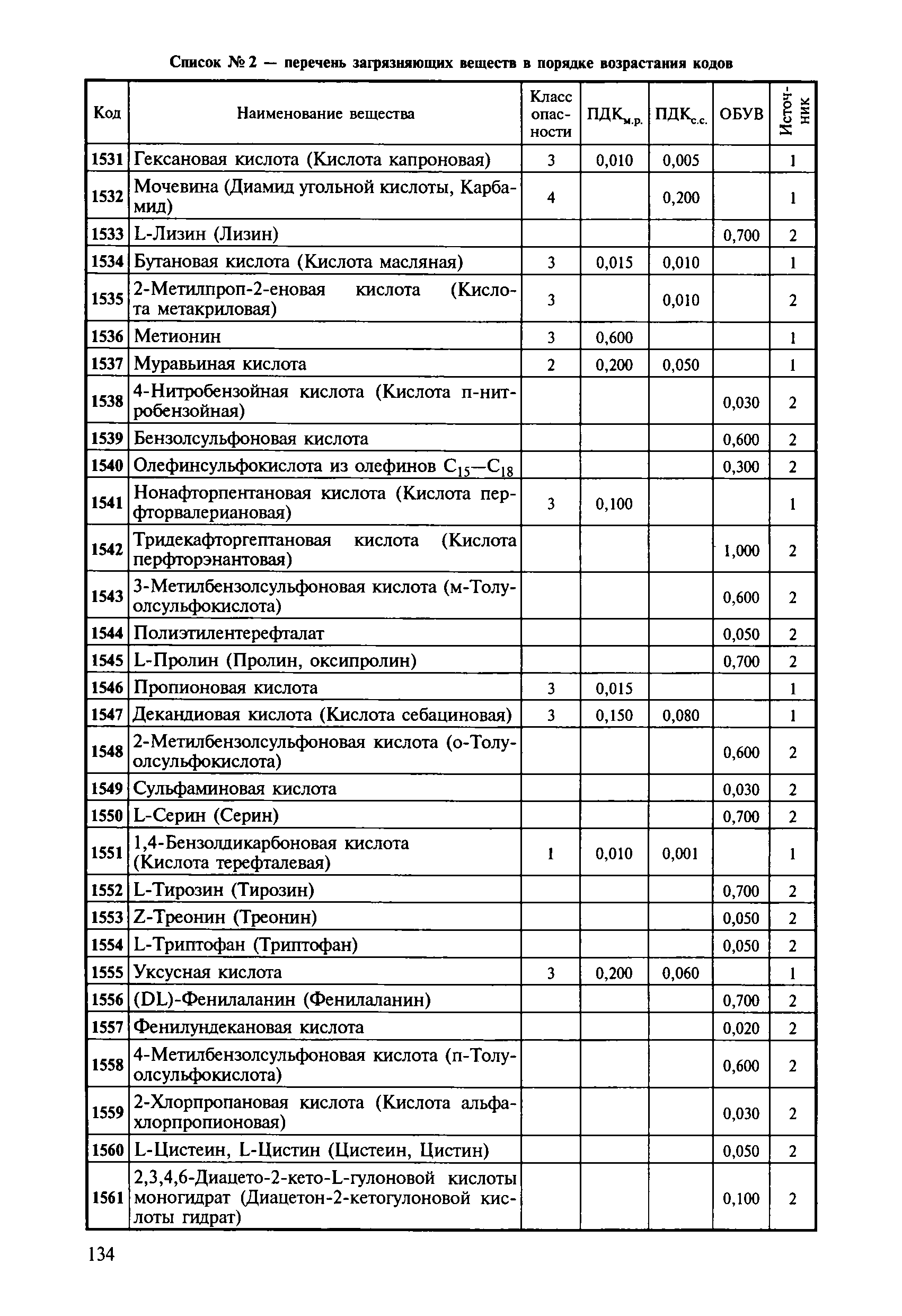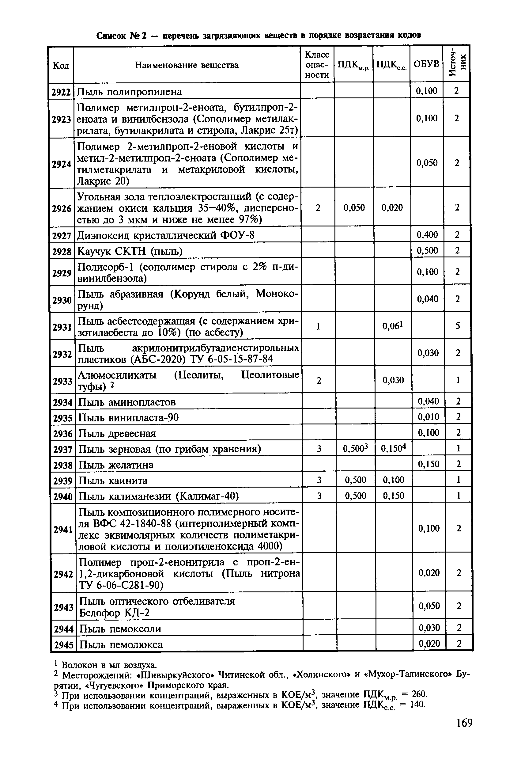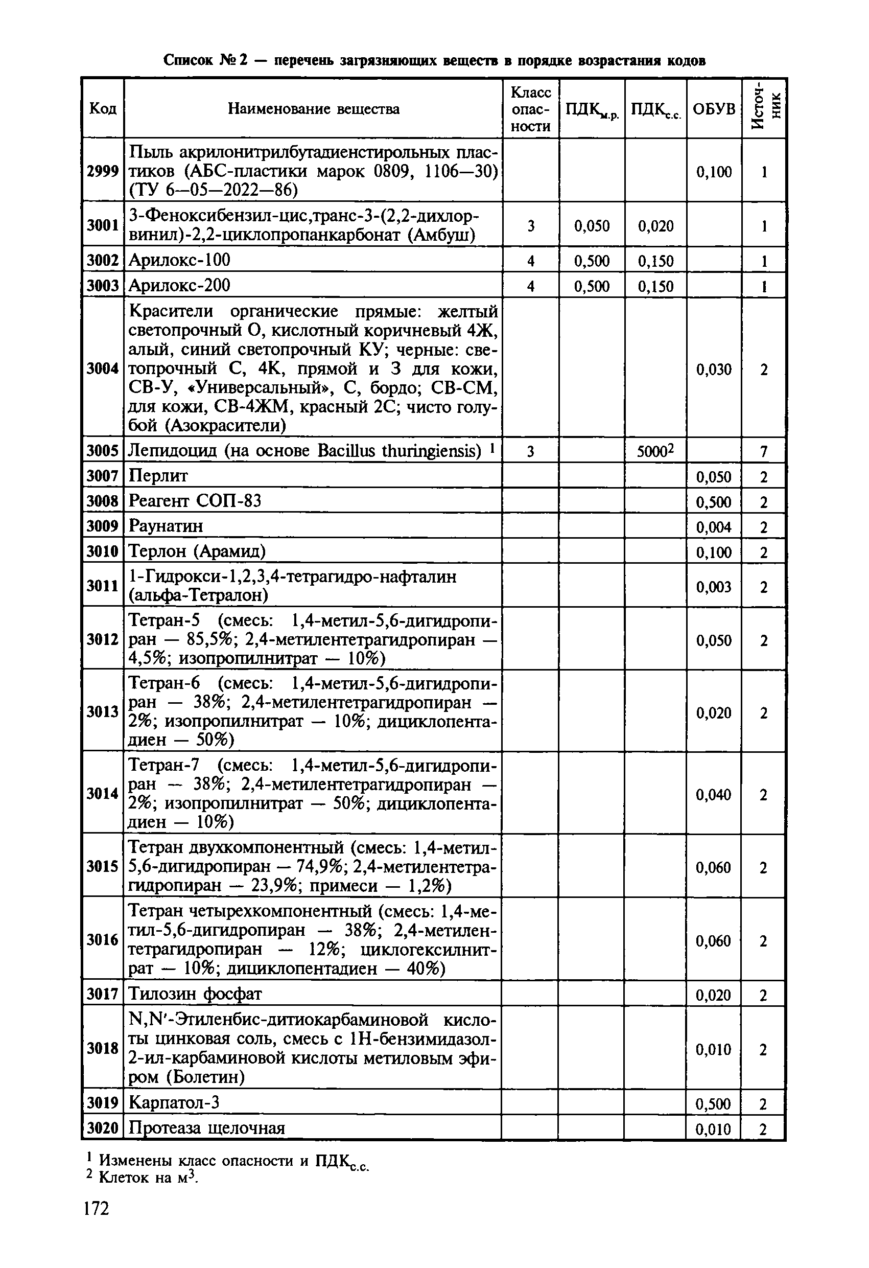 | Оглавление: | Список № 1 Перечень загрязняющих веществ в алфавитном порядке Список № 2 Перечень загрязняющих веществ в порядке возрастания кодов Список № 3 Перечень ЛОС в порядке возрастания кодов Список № 4 Указатель основных синонимов, технических, торговых и фирменных названий веществ в алфавитном порядке А. Для веществ с установленными значениями ПДК Б. Для веществ с установленными значениями ОБУВ Список № 5 Указатель основных синонимов, технических, торговых и фирменных названий веществ в порядке возрастания кодов А. Для веществ с установленными значениями ПДК Б. Для веществ с установленными значениями ОБУВ |