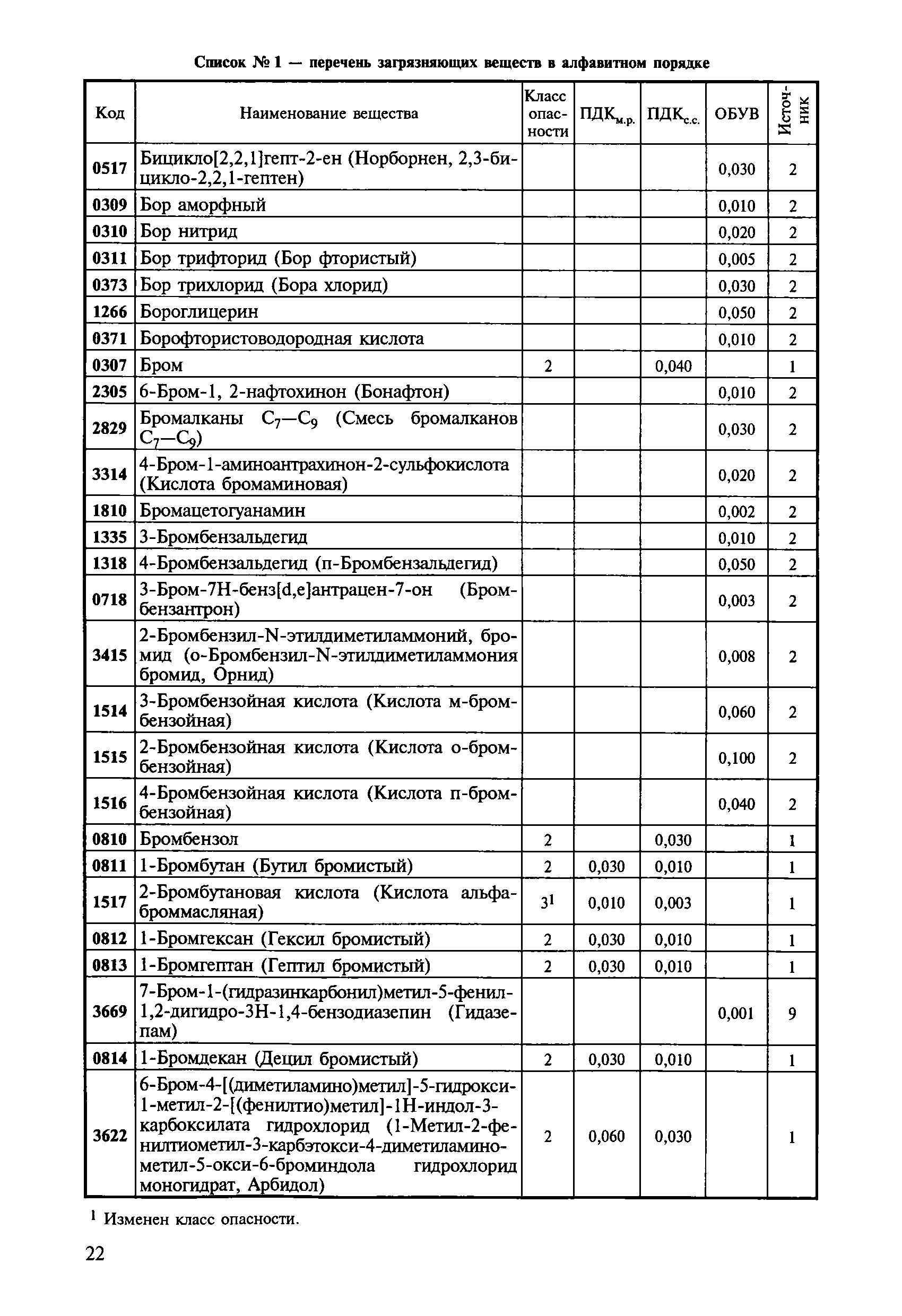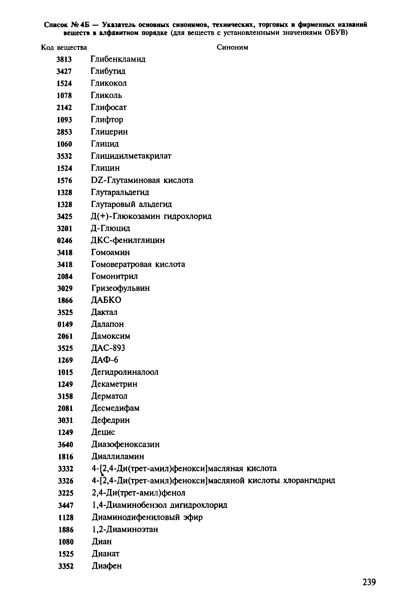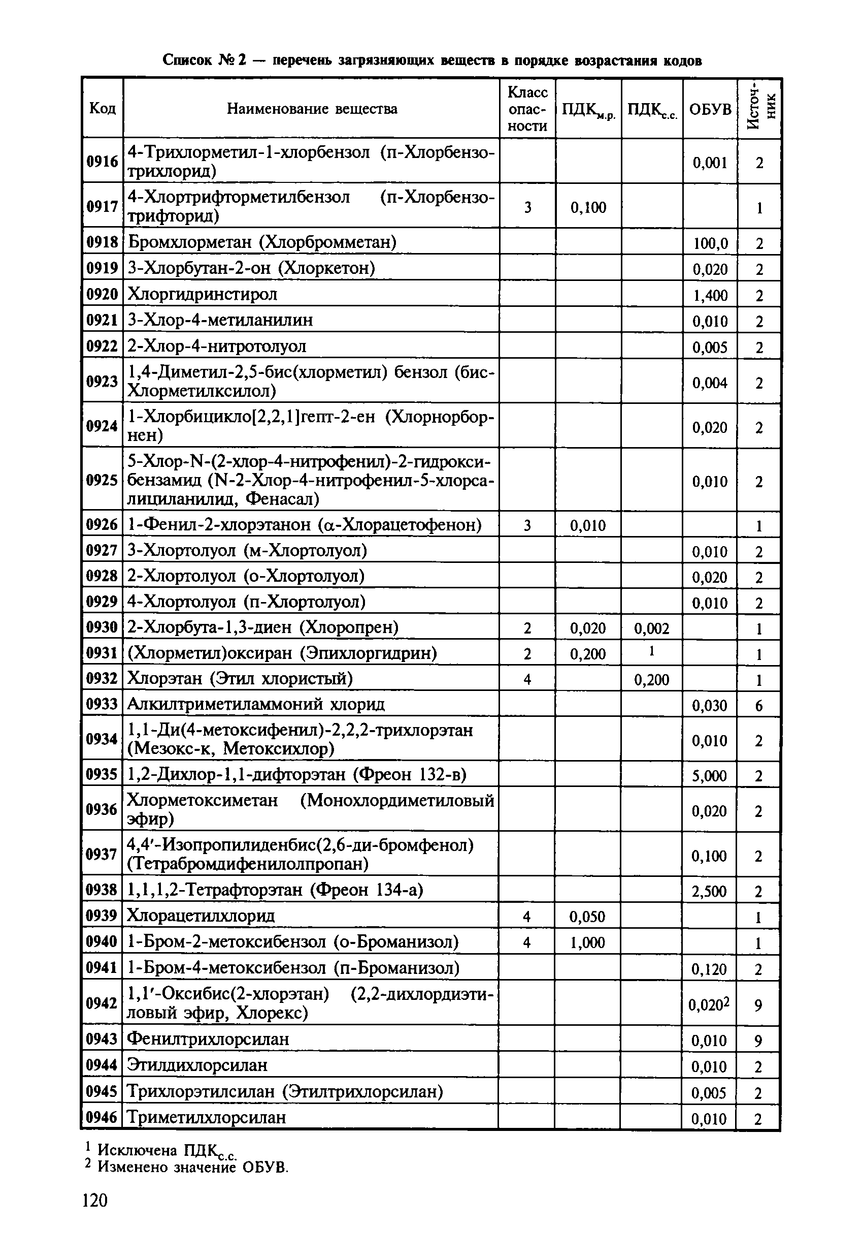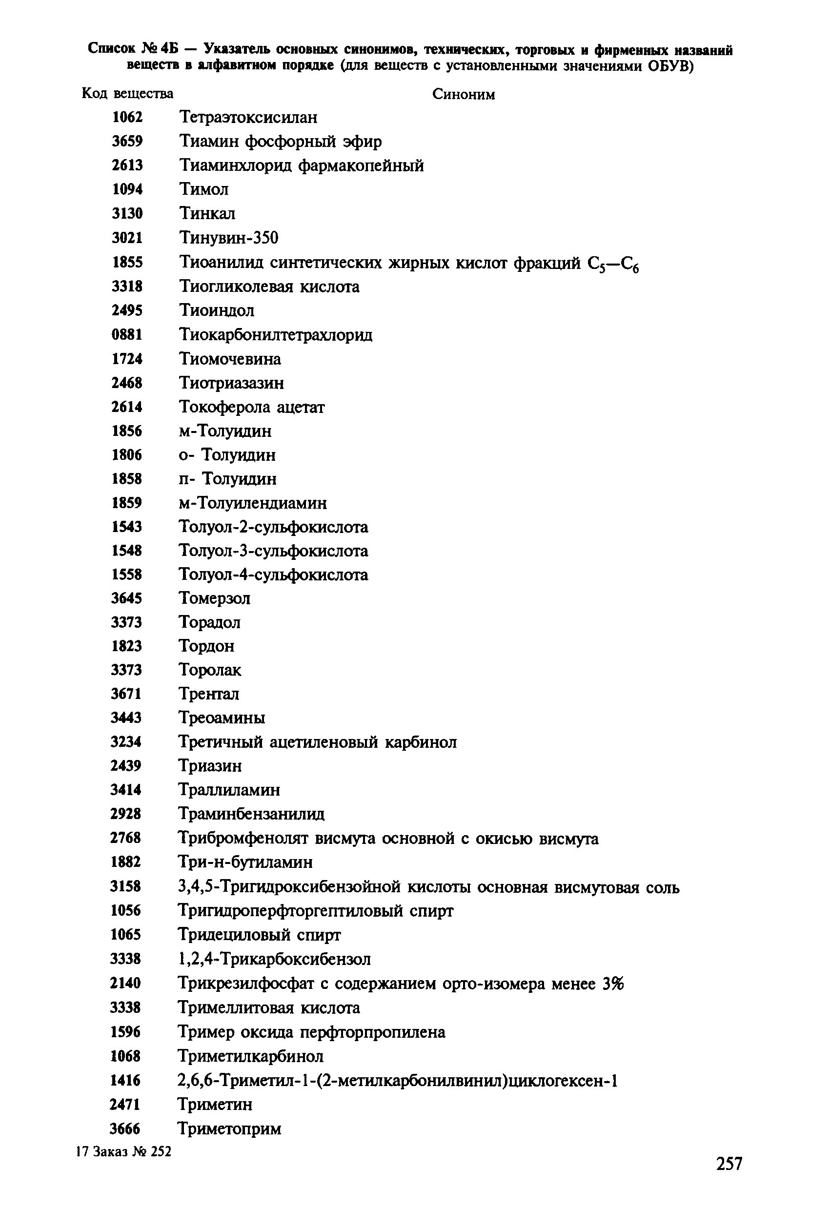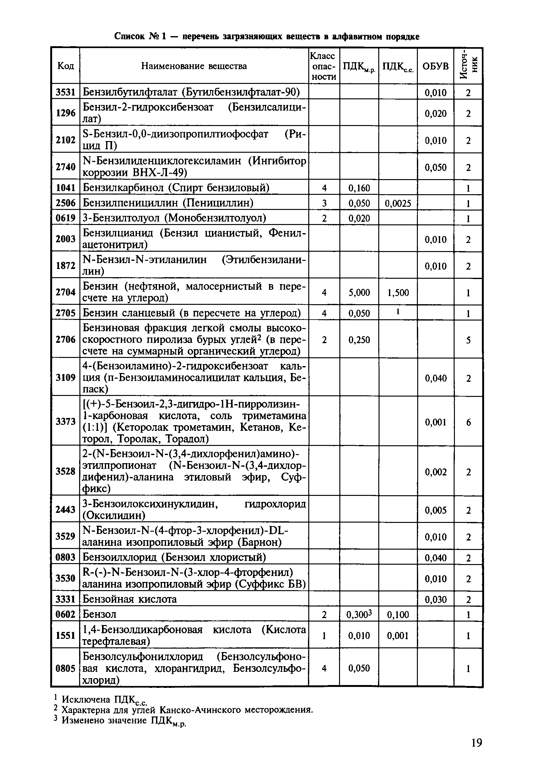 | Оглавление: | Список № 1 Перечень загрязняющих веществ в алфавитном порядке Список № 2 Перечень загрязняющих веществ в порядке возрастания кодов Список № 3 Перечень ЛОС в порядке возрастания кодов Список № 4 Указатель основных синонимов, технических, торговых и фирменных названий веществ в алфавитном порядке А. Для веществ с установленными значениями ПДК Б. Для веществ с установленными значениями ОБУВ Список № 5 Указатель основных синонимов, технических, торговых и фирменных названий веществ в порядке возрастания кодов А. Для веществ с установленными значениями ПДК Б. Для веществ с установленными значениями ОБУВ |