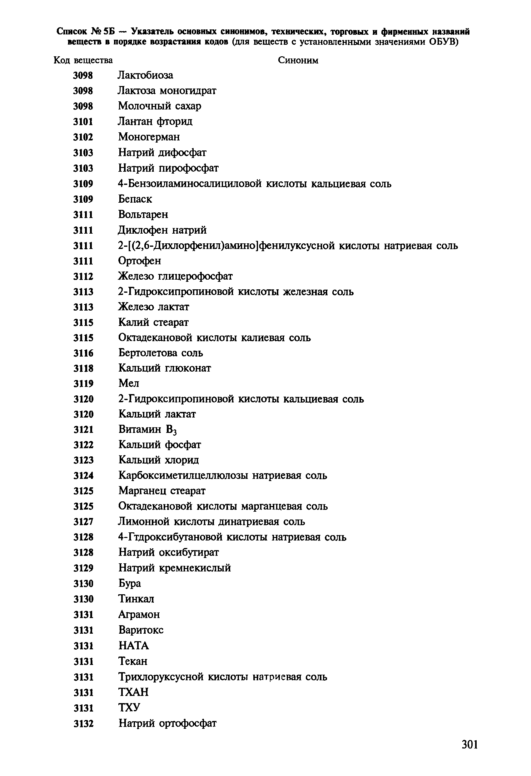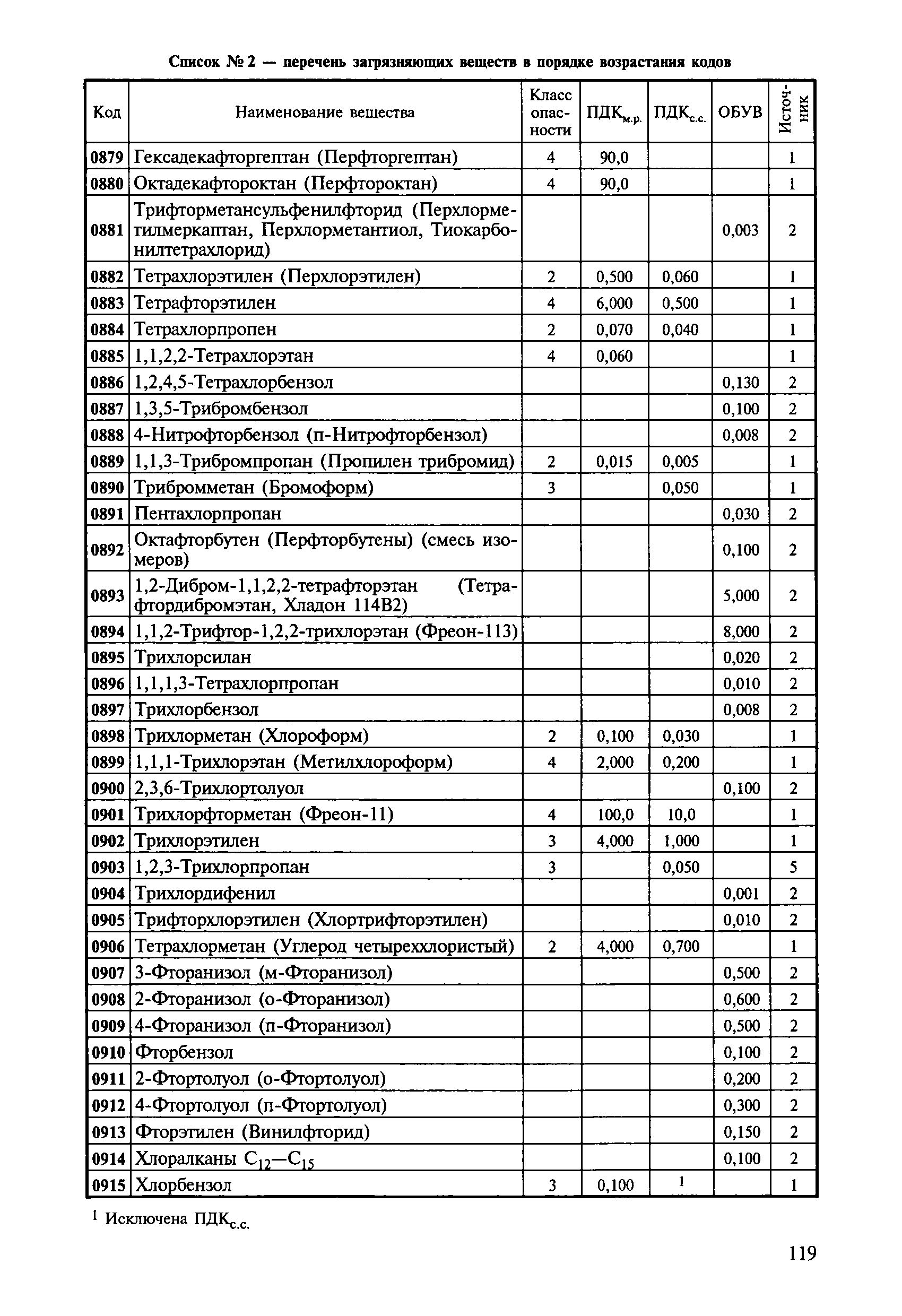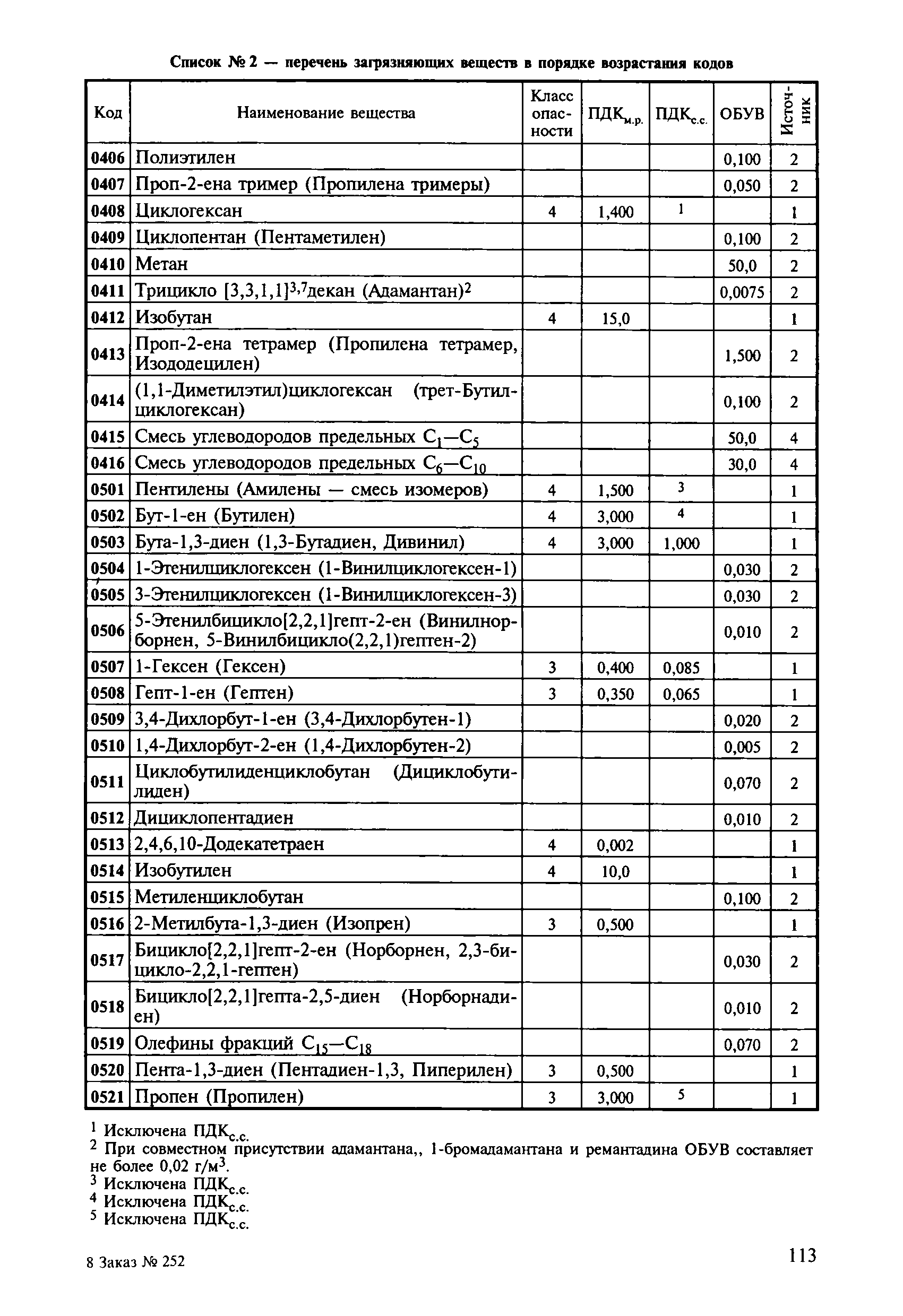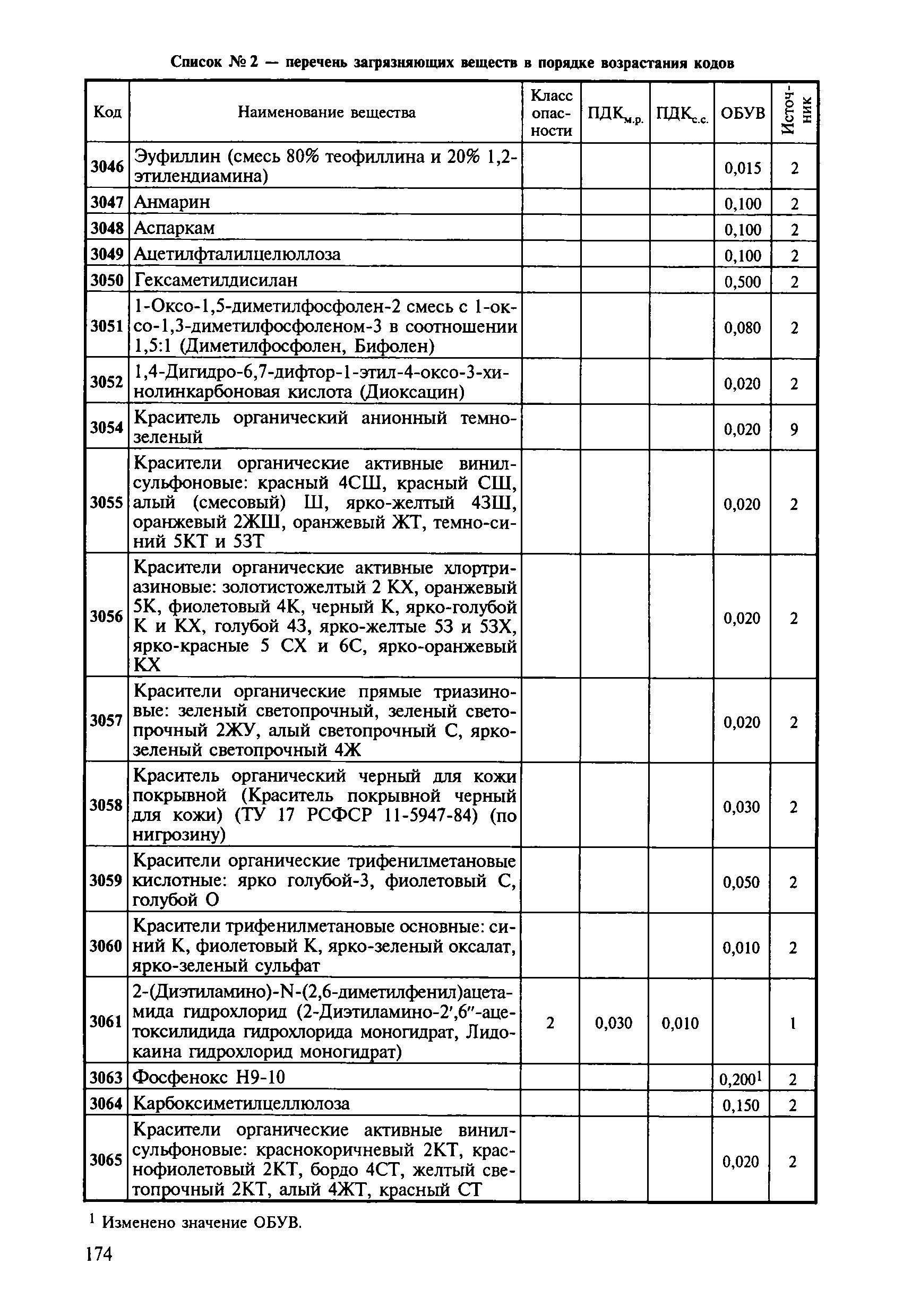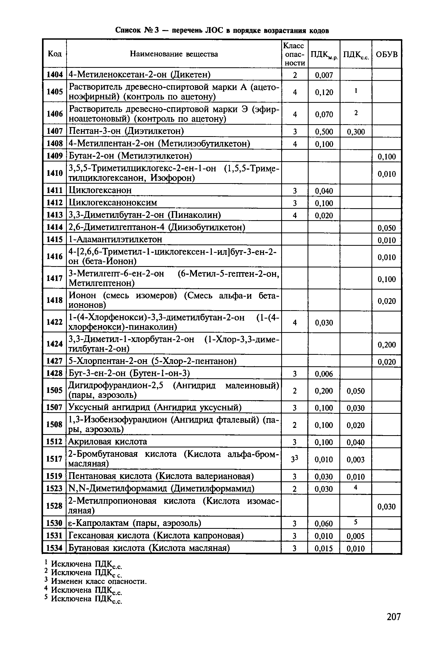 | Оглавление: | Список № 1 Перечень загрязняющих веществ в алфавитном порядке Список № 2 Перечень загрязняющих веществ в порядке возрастания кодов Список № 3 Перечень ЛОС в порядке возрастания кодов Список № 4 Указатель основных синонимов, технических, торговых и фирменных названий веществ в алфавитном порядке А. Для веществ с установленными значениями ПДК Б. Для веществ с установленными значениями ОБУВ Список № 5 Указатель основных синонимов, технических, торговых и фирменных названий веществ в порядке возрастания кодов А. Для веществ с установленными значениями ПДК Б. Для веществ с установленными значениями ОБУВ |