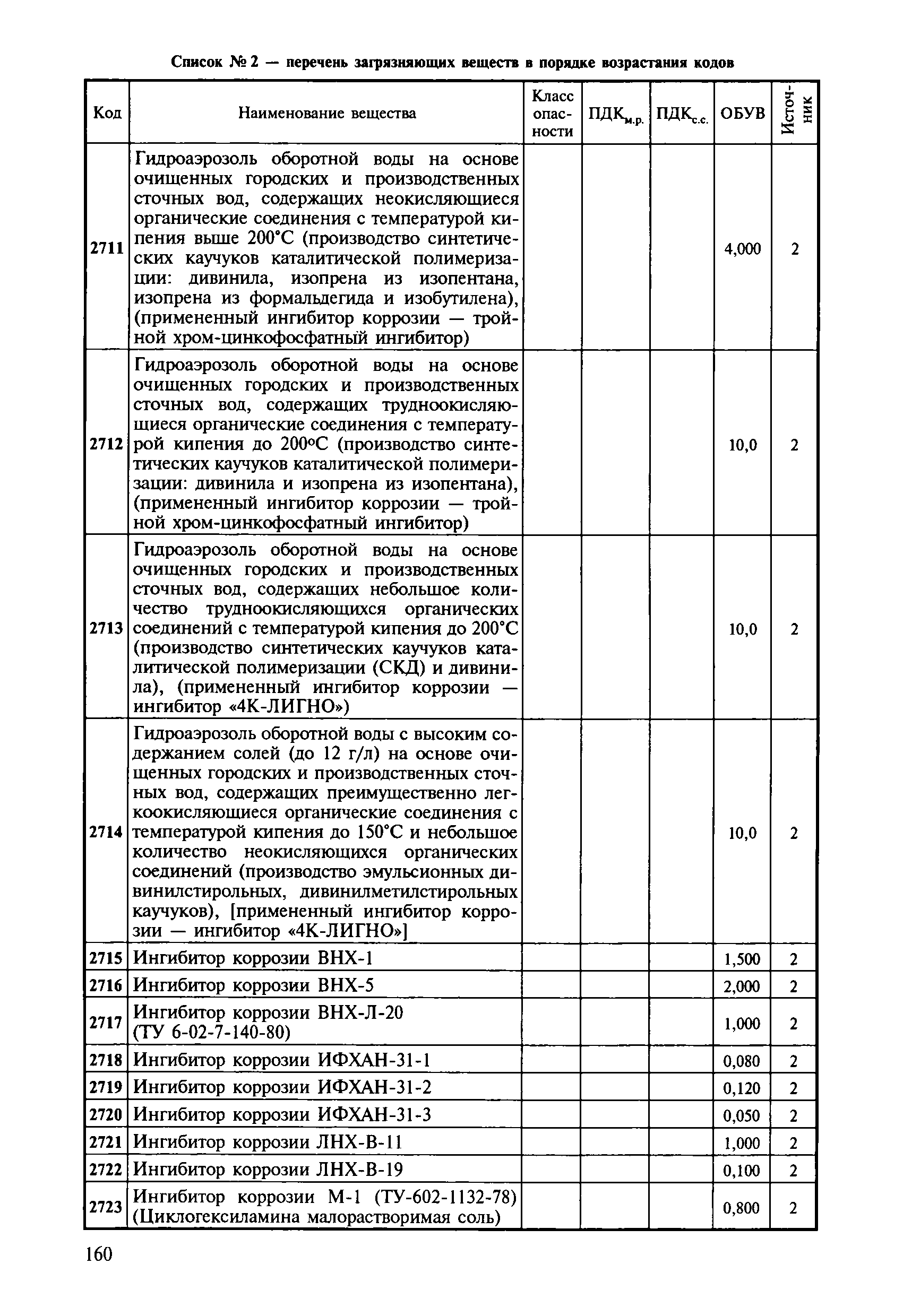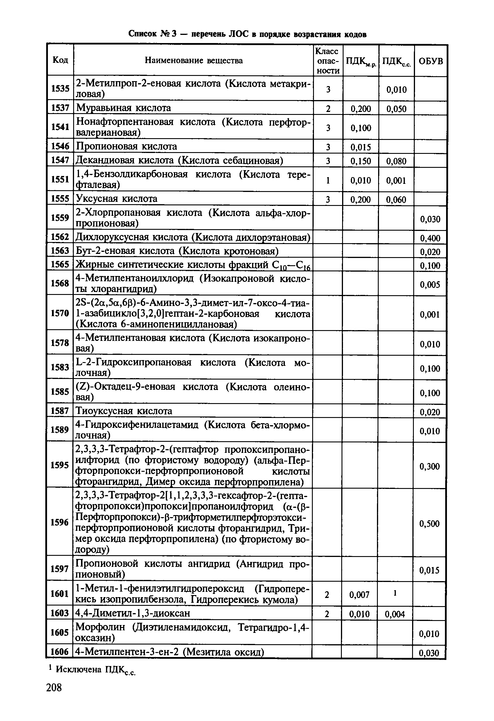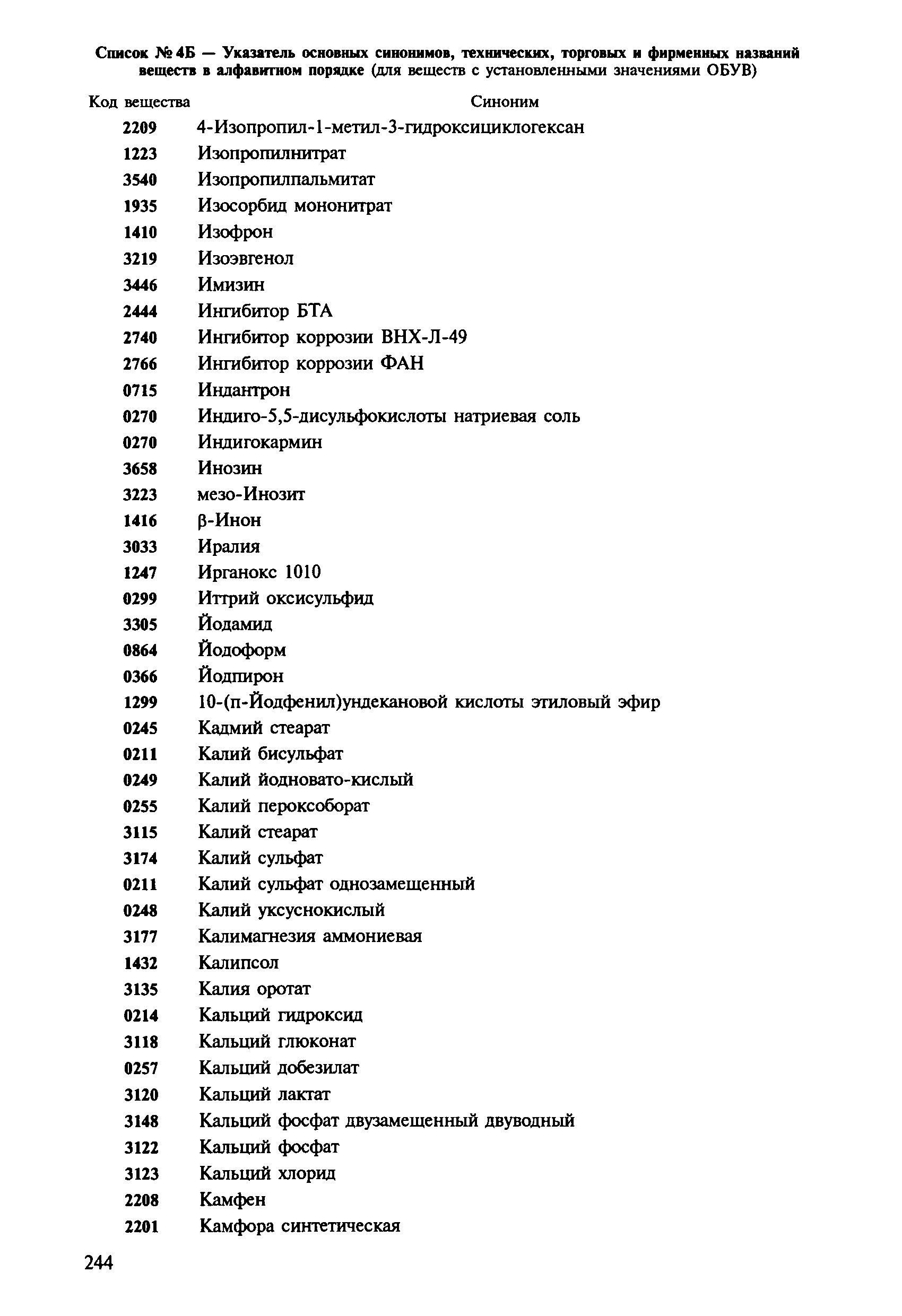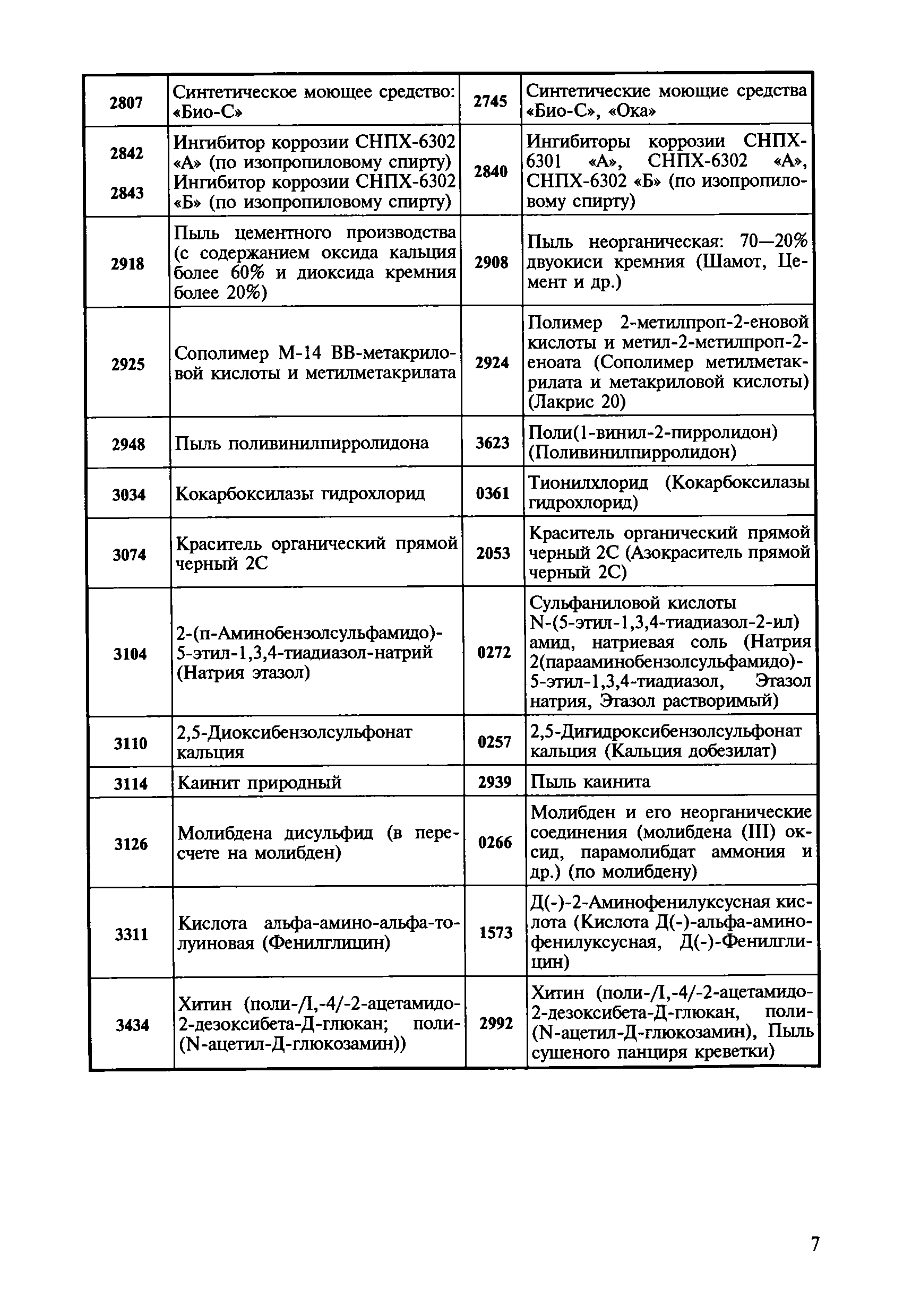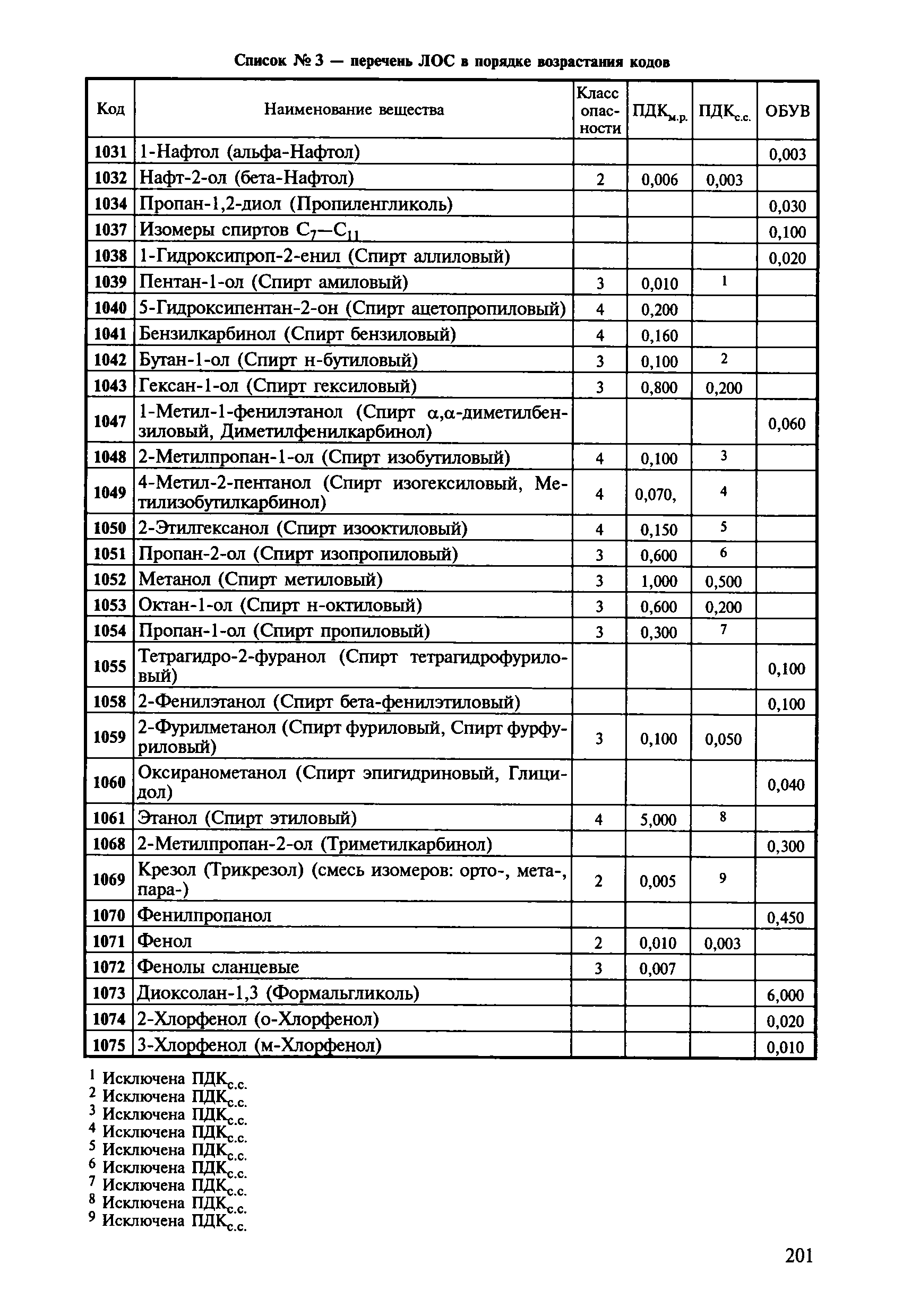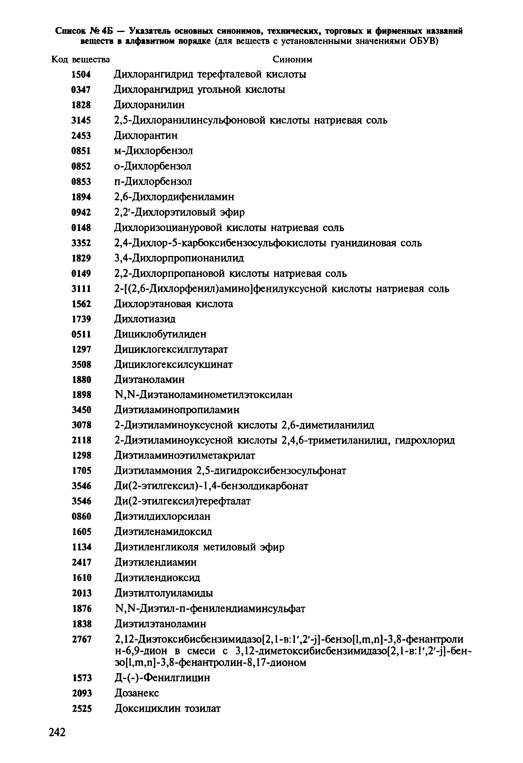 | Оглавление: | Список № 1 Перечень загрязняющих веществ в алфавитном порядке Список № 2 Перечень загрязняющих веществ в порядке возрастания кодов Список № 3 Перечень ЛОС в порядке возрастания кодов Список № 4 Указатель основных синонимов, технических, торговых и фирменных названий веществ в алфавитном порядке А. Для веществ с установленными значениями ПДК Б. Для веществ с установленными значениями ОБУВ Список № 5 Указатель основных синонимов, технических, торговых и фирменных названий веществ в порядке возрастания кодов А. Для веществ с установленными значениями ПДК Б. Для веществ с установленными значениями ОБУВ |