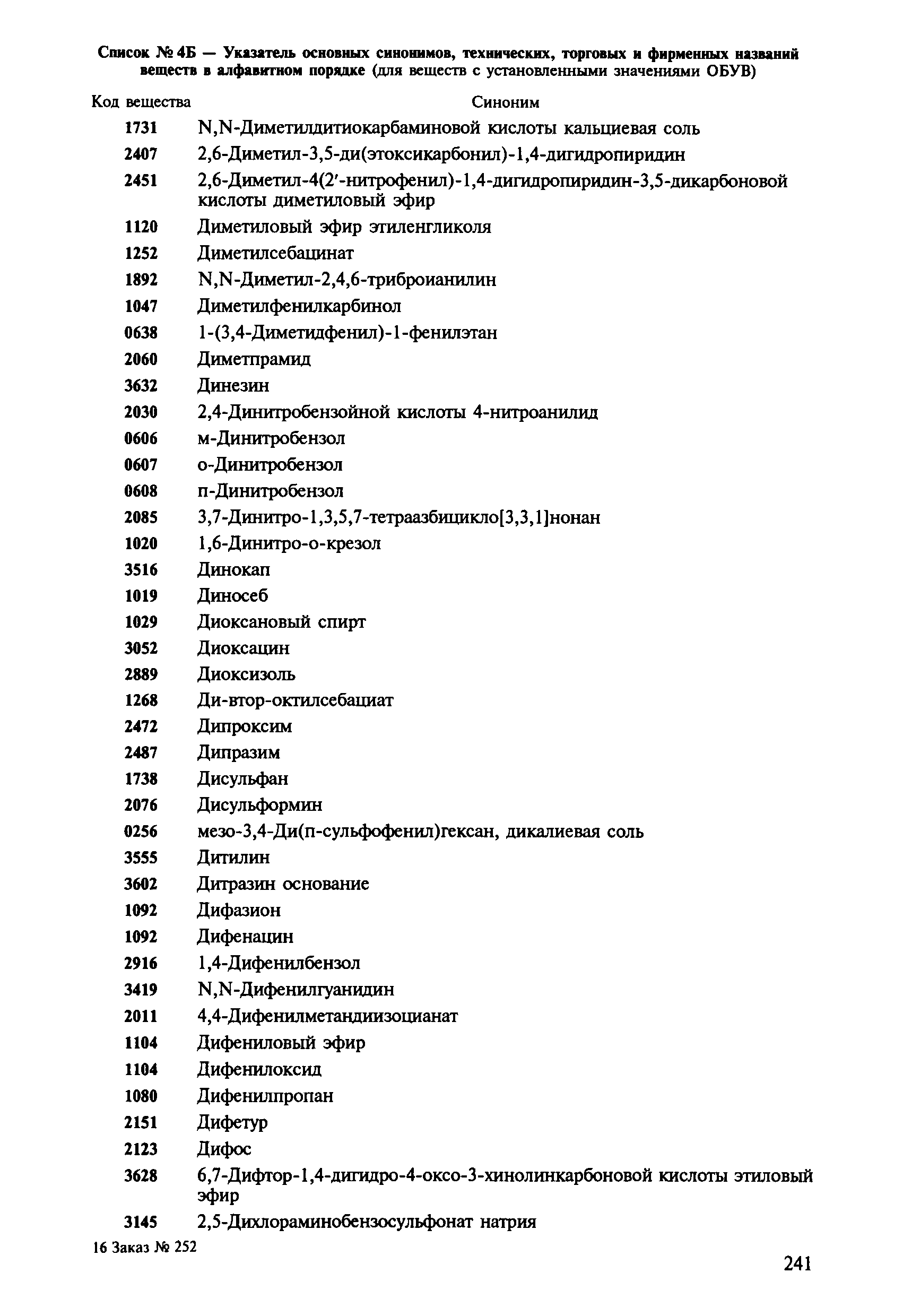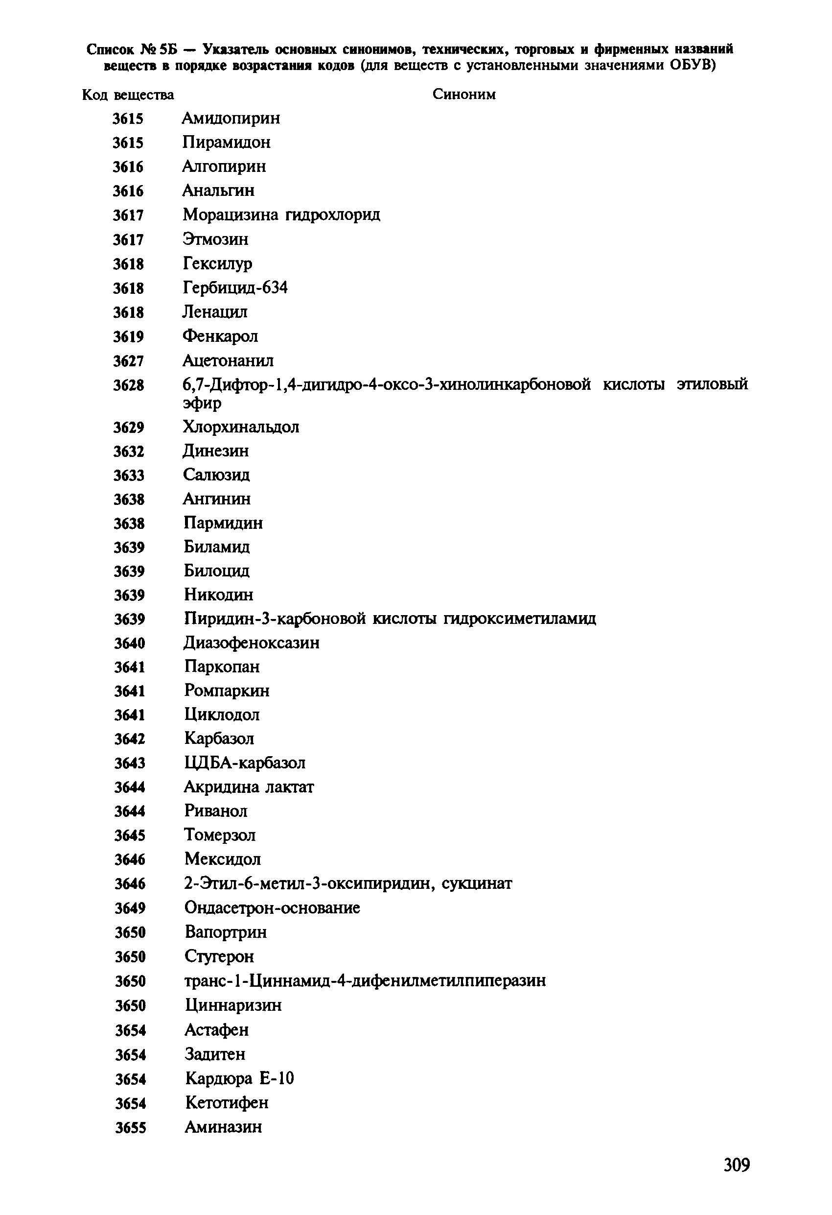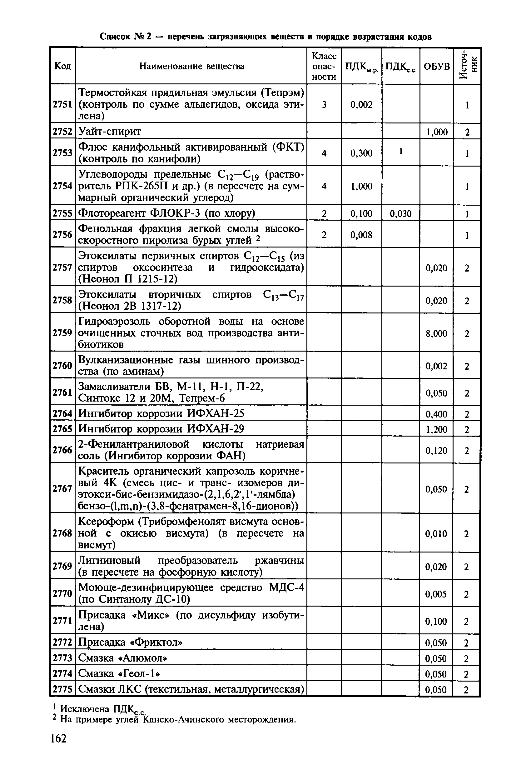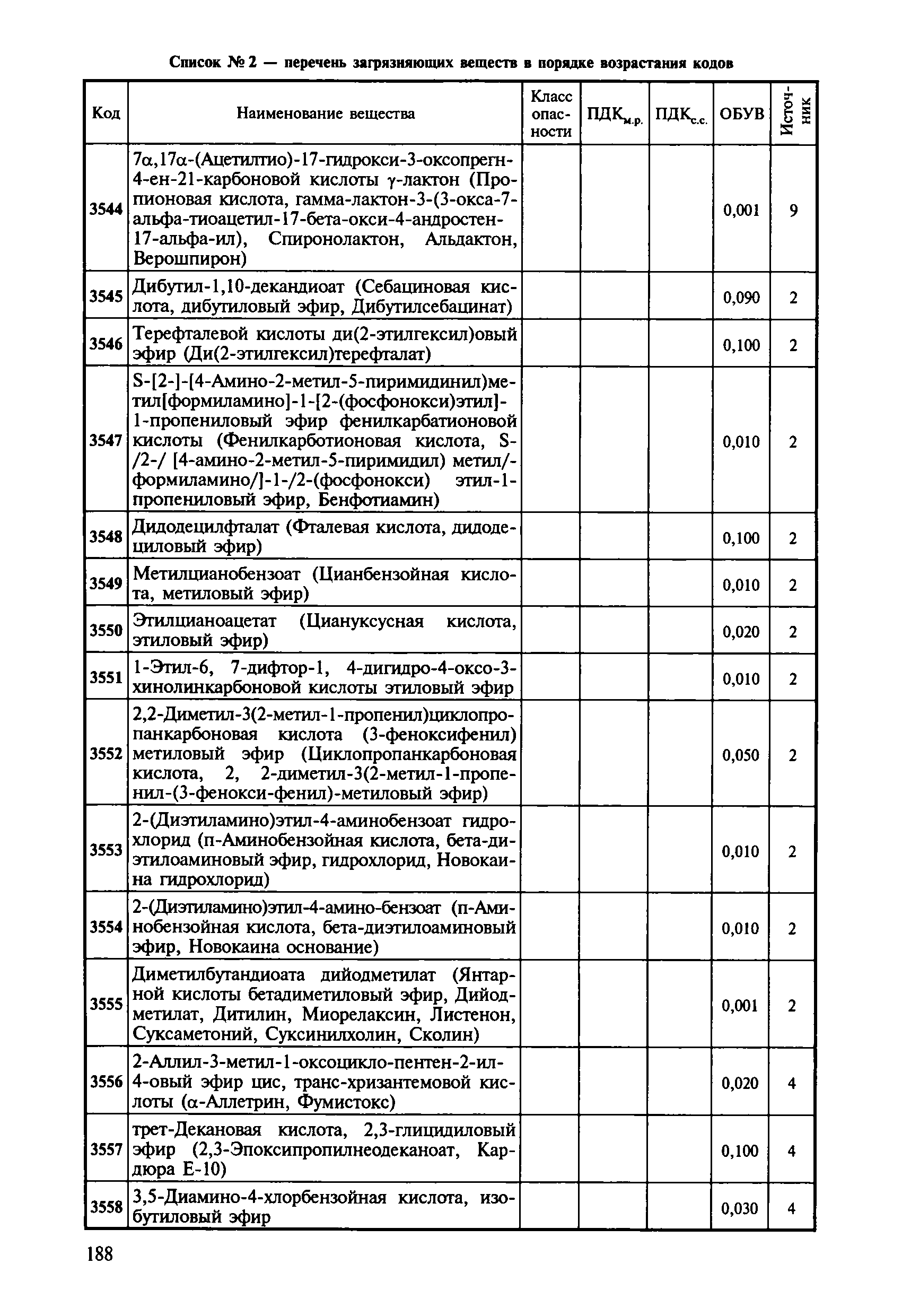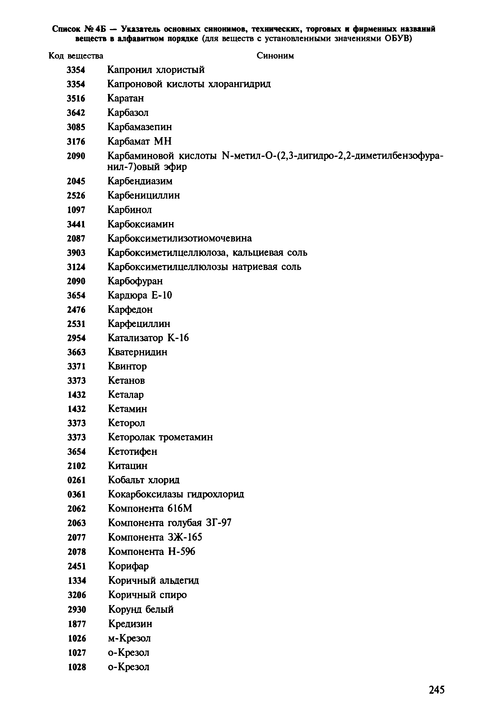 | Оглавление: | Список № 1 Перечень загрязняющих веществ в алфавитном порядке Список № 2 Перечень загрязняющих веществ в порядке возрастания кодов Список № 3 Перечень ЛОС в порядке возрастания кодов Список № 4 Указатель основных синонимов, технических, торговых и фирменных названий веществ в алфавитном порядке А. Для веществ с установленными значениями ПДК Б. Для веществ с установленными значениями ОБУВ Список № 5 Указатель основных синонимов, технических, торговых и фирменных названий веществ в порядке возрастания кодов А. Для веществ с установленными значениями ПДК Б. Для веществ с установленными значениями ОБУВ |