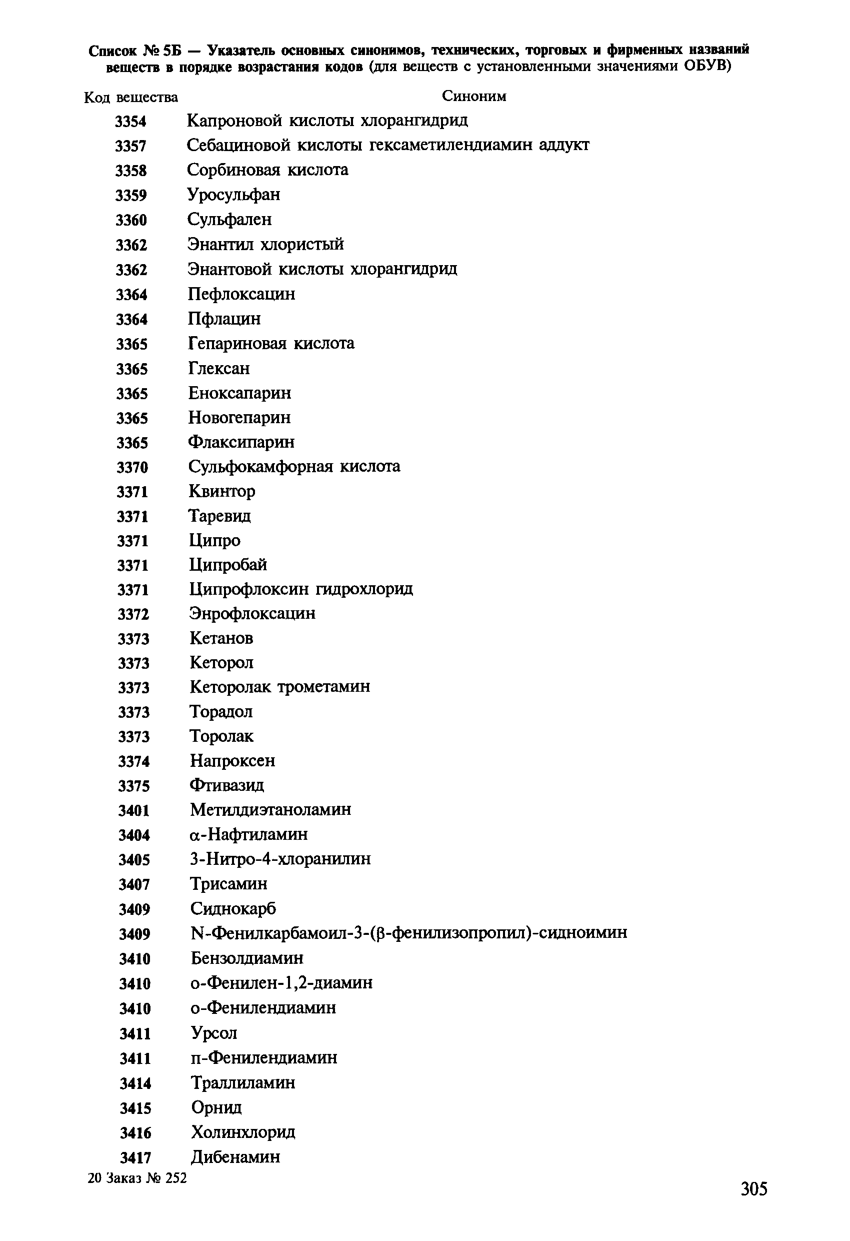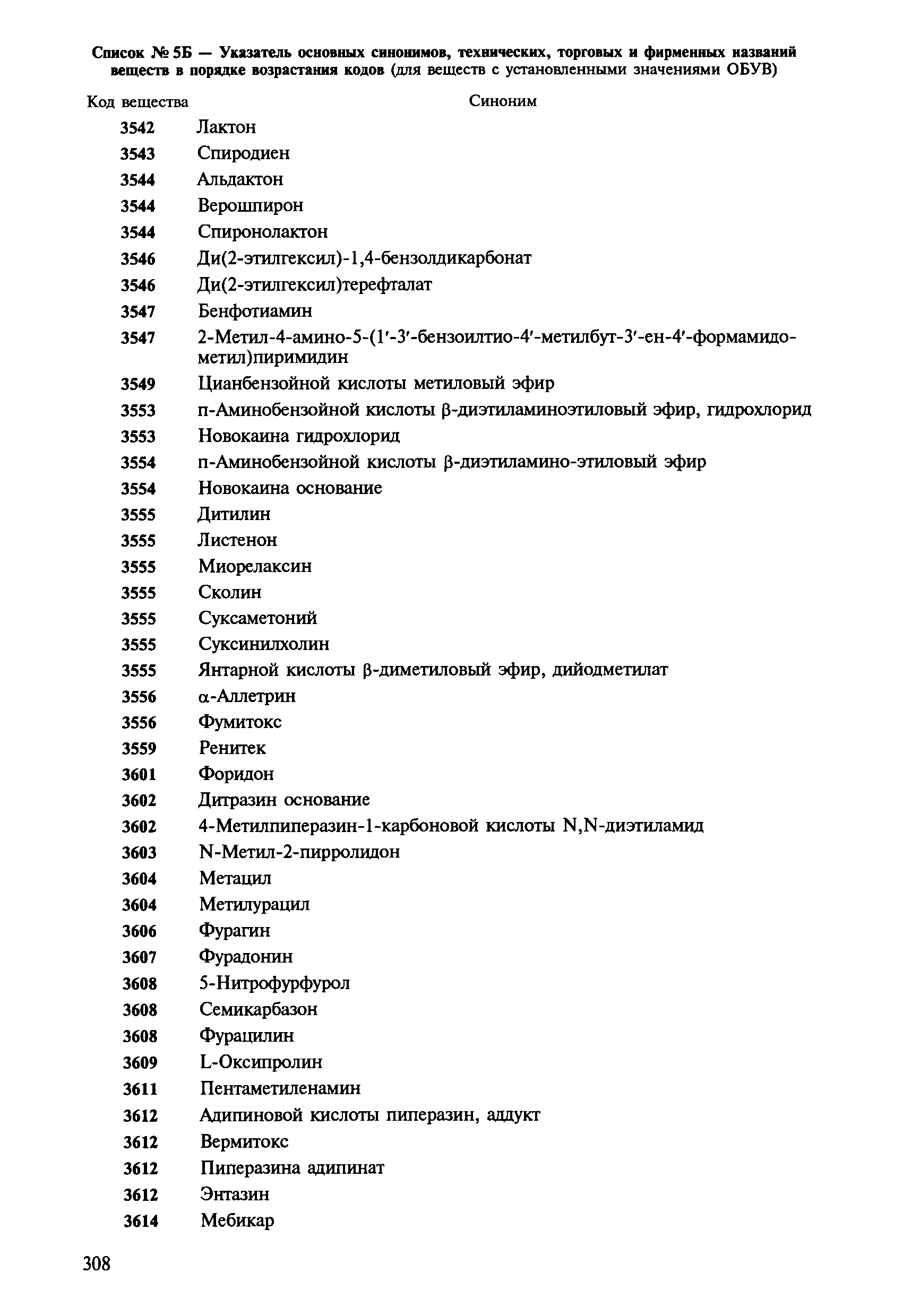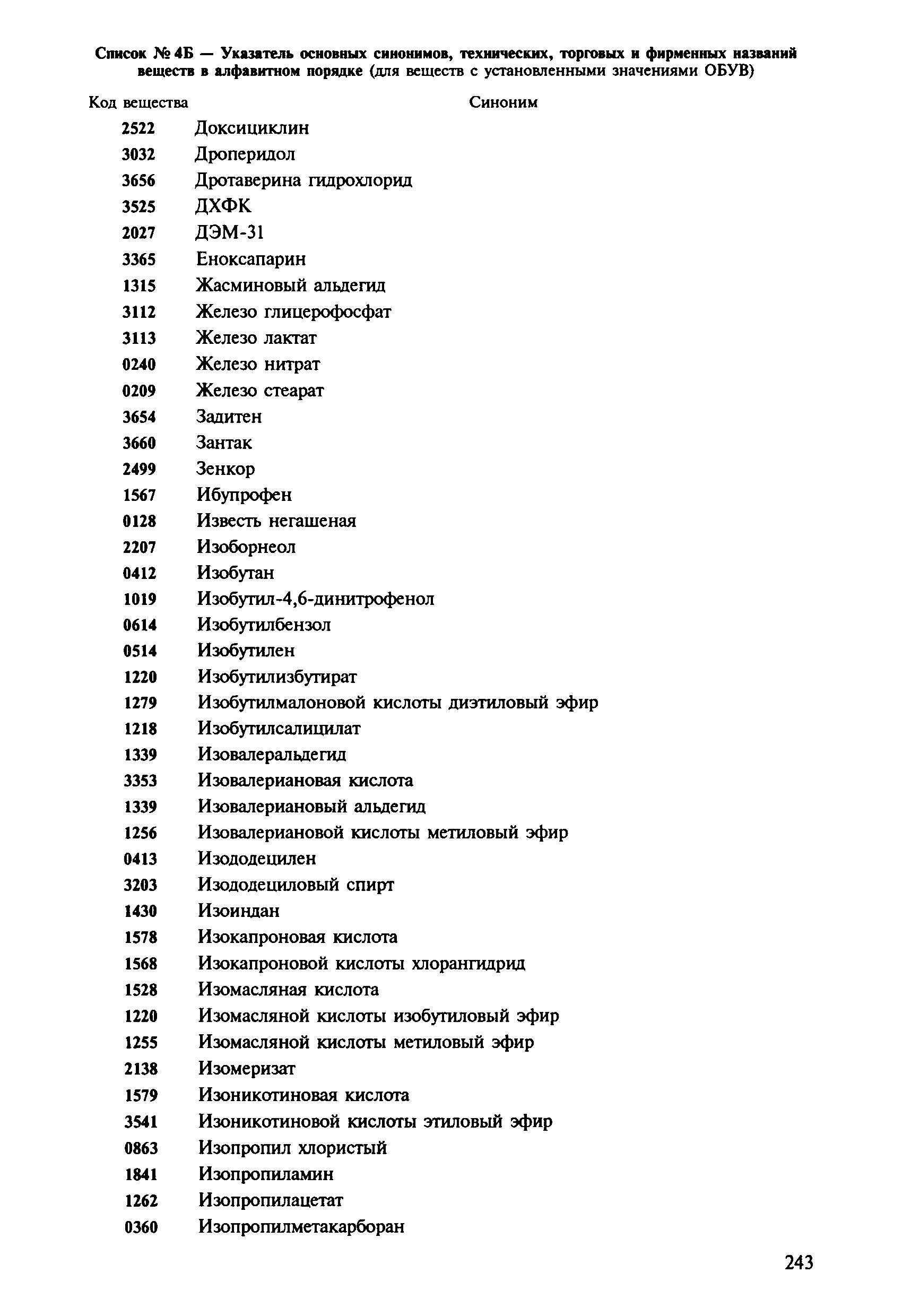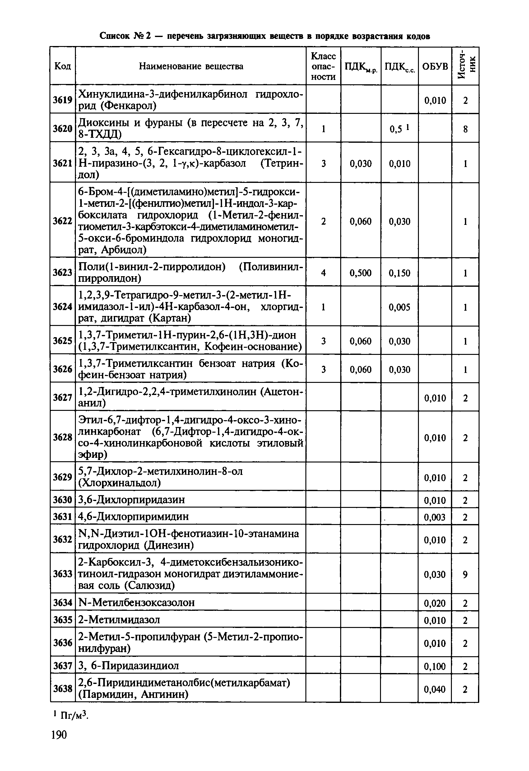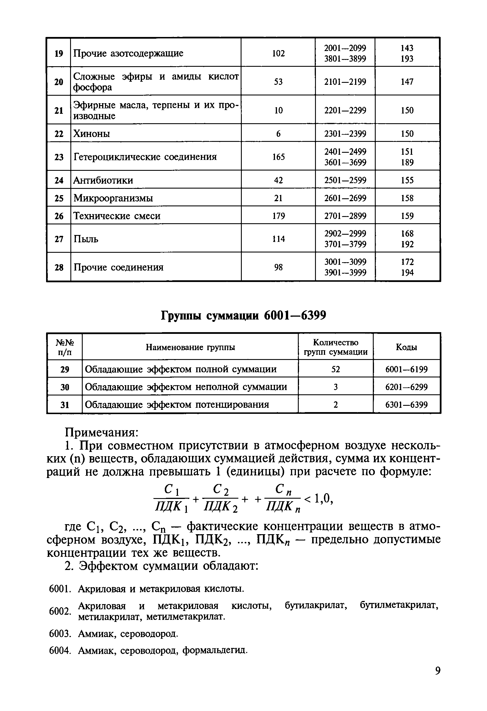 | Оглавление: | Список № 1 Перечень загрязняющих веществ в алфавитном порядке Список № 2 Перечень загрязняющих веществ в порядке возрастания кодов Список № 3 Перечень ЛОС в порядке возрастания кодов Список № 4 Указатель основных синонимов, технических, торговых и фирменных названий веществ в алфавитном порядке А. Для веществ с установленными значениями ПДК Б. Для веществ с установленными значениями ОБУВ Список № 5 Указатель основных синонимов, технических, торговых и фирменных названий веществ в порядке возрастания кодов А. Для веществ с установленными значениями ПДК Б. Для веществ с установленными значениями ОБУВ |
