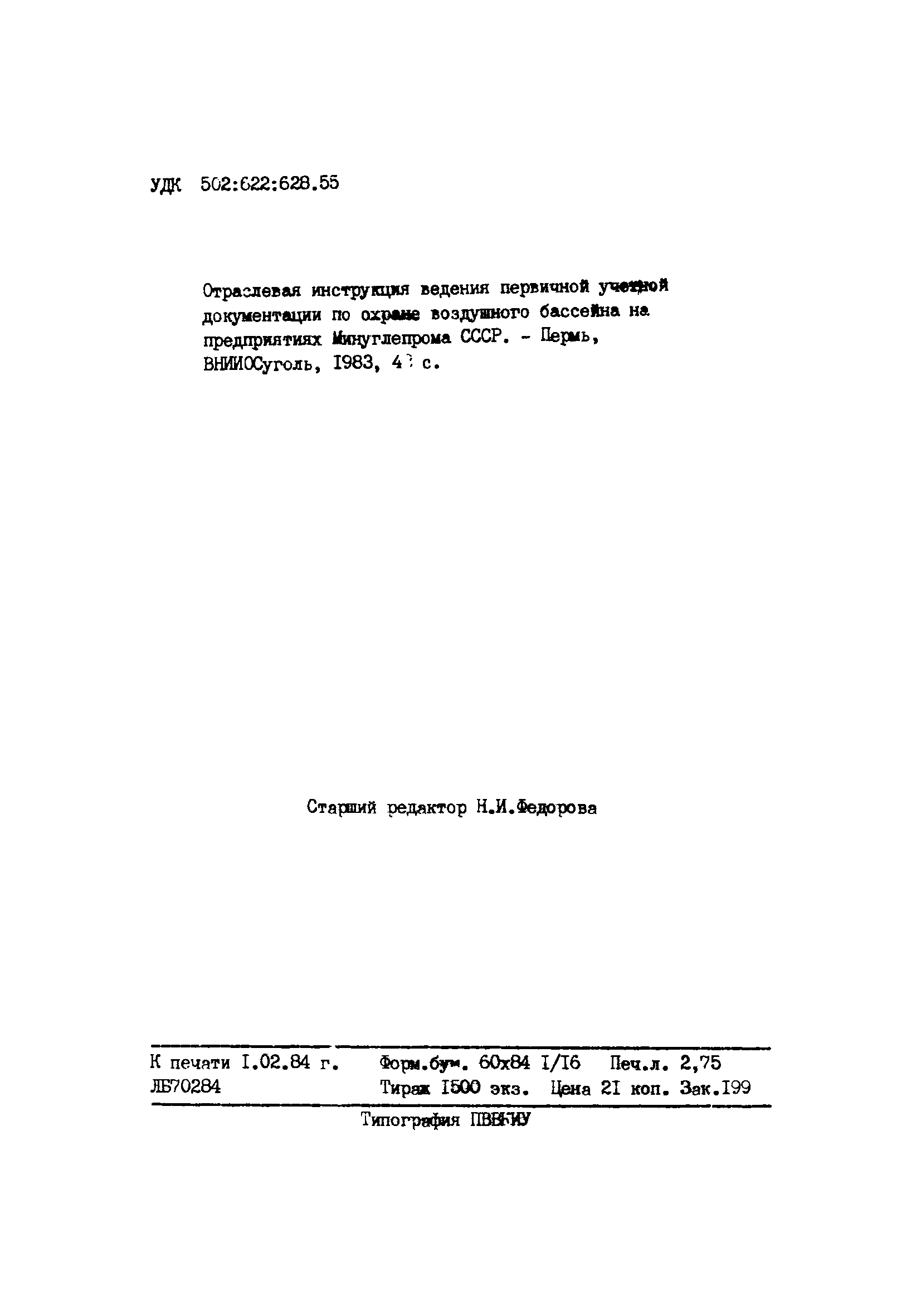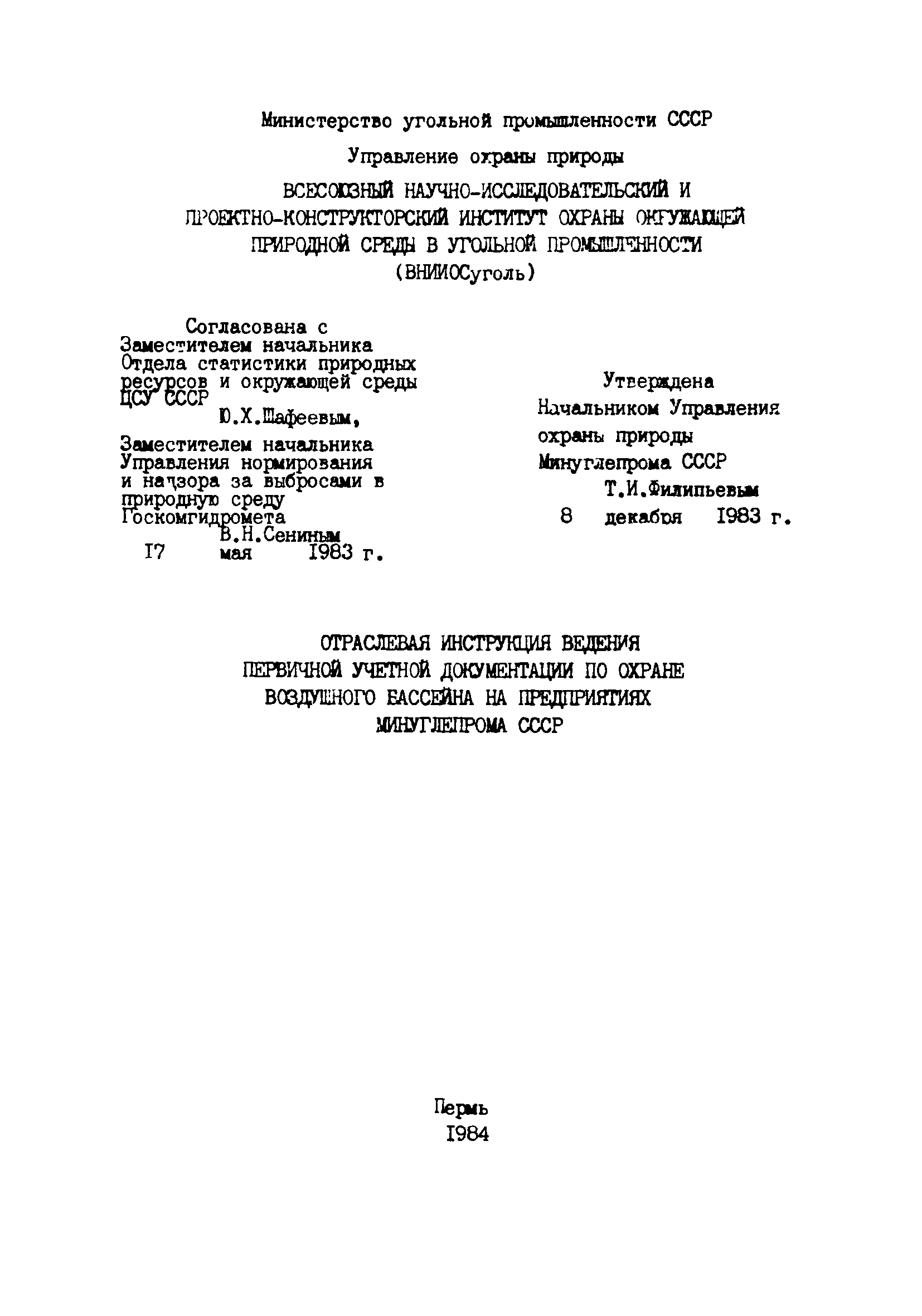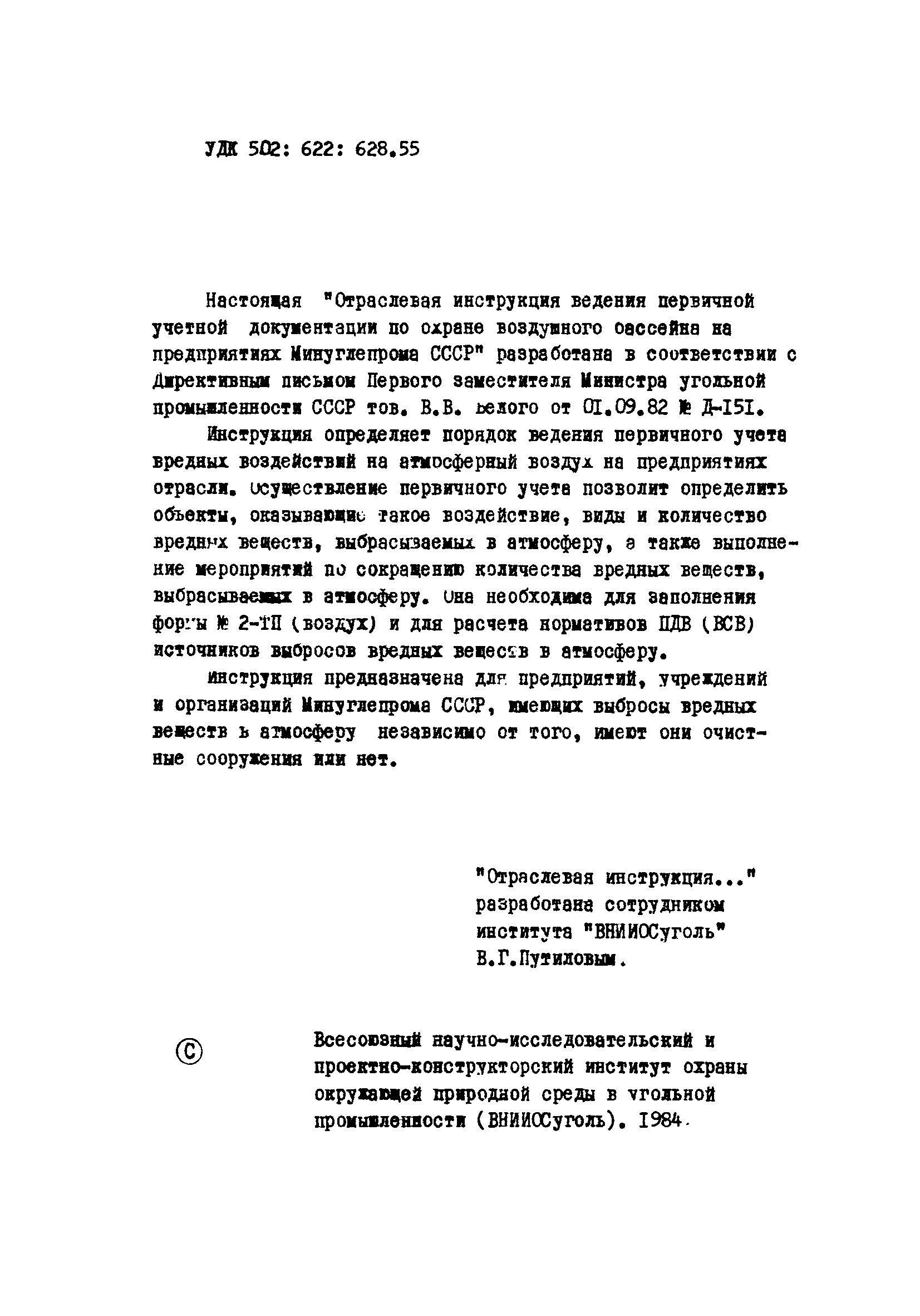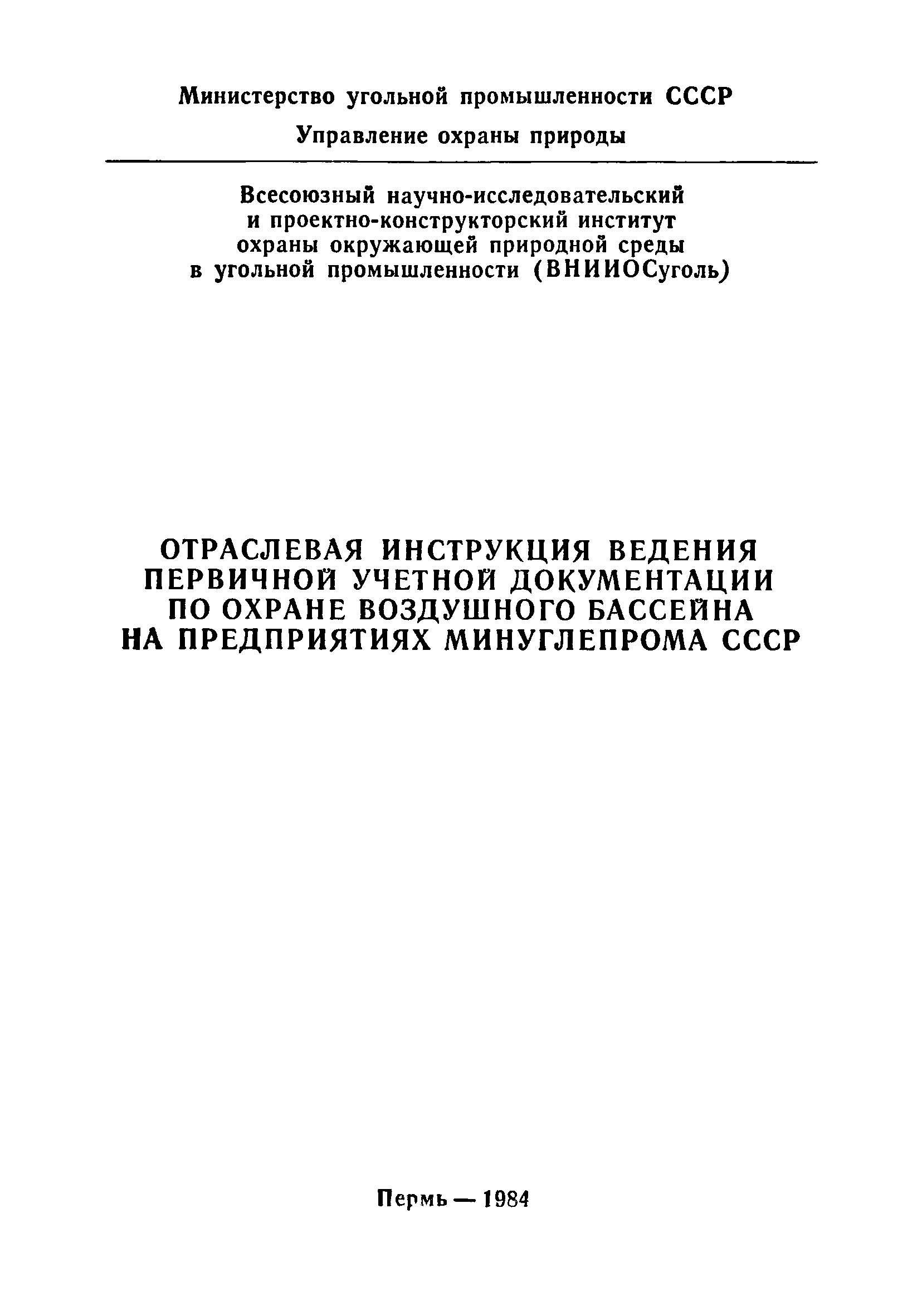 | Название рус.: | Отраслевая инструкция ведения первичной учетной документации по охране воздушного бассейна на предприятиях Минуглепрома СССР |
