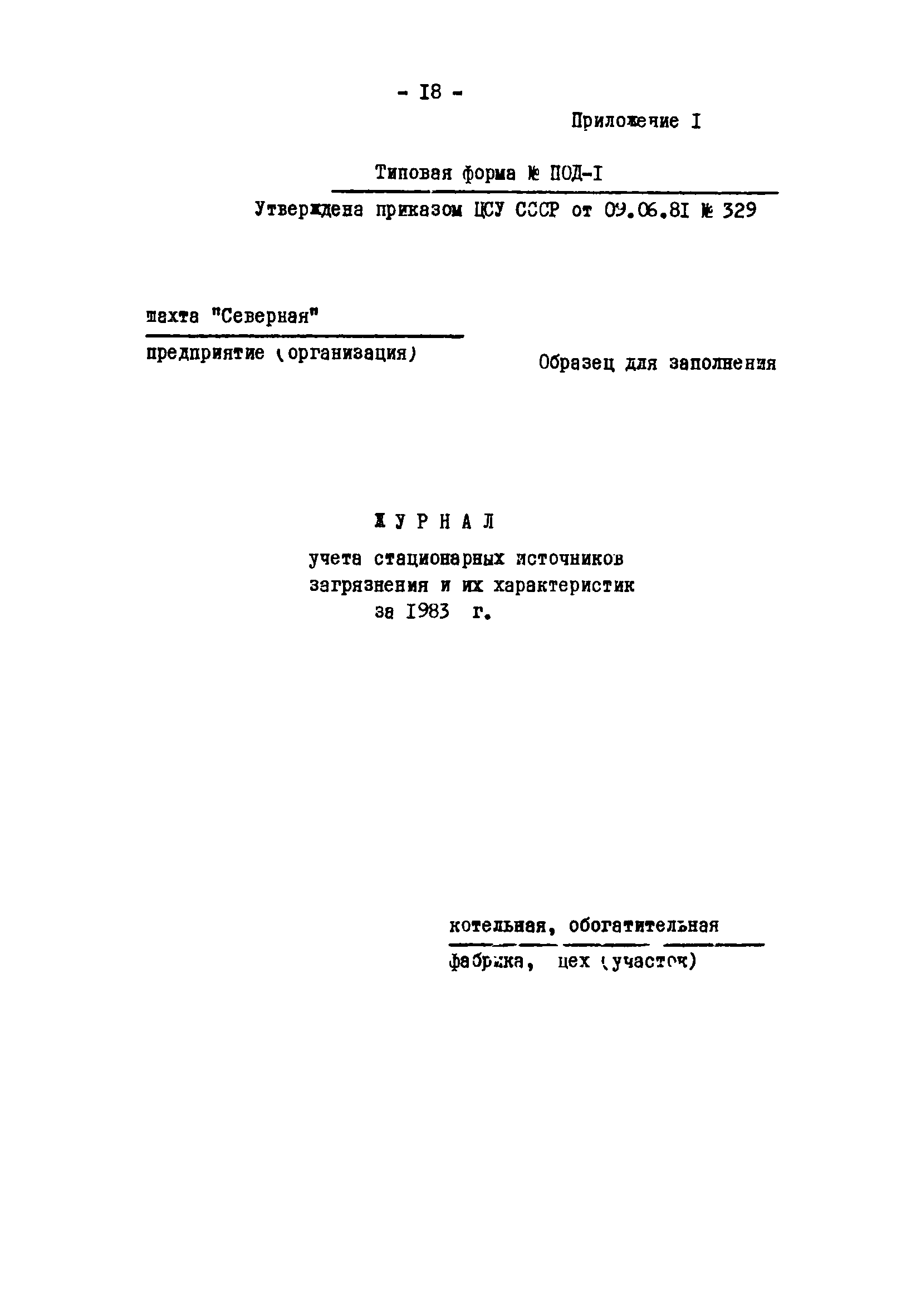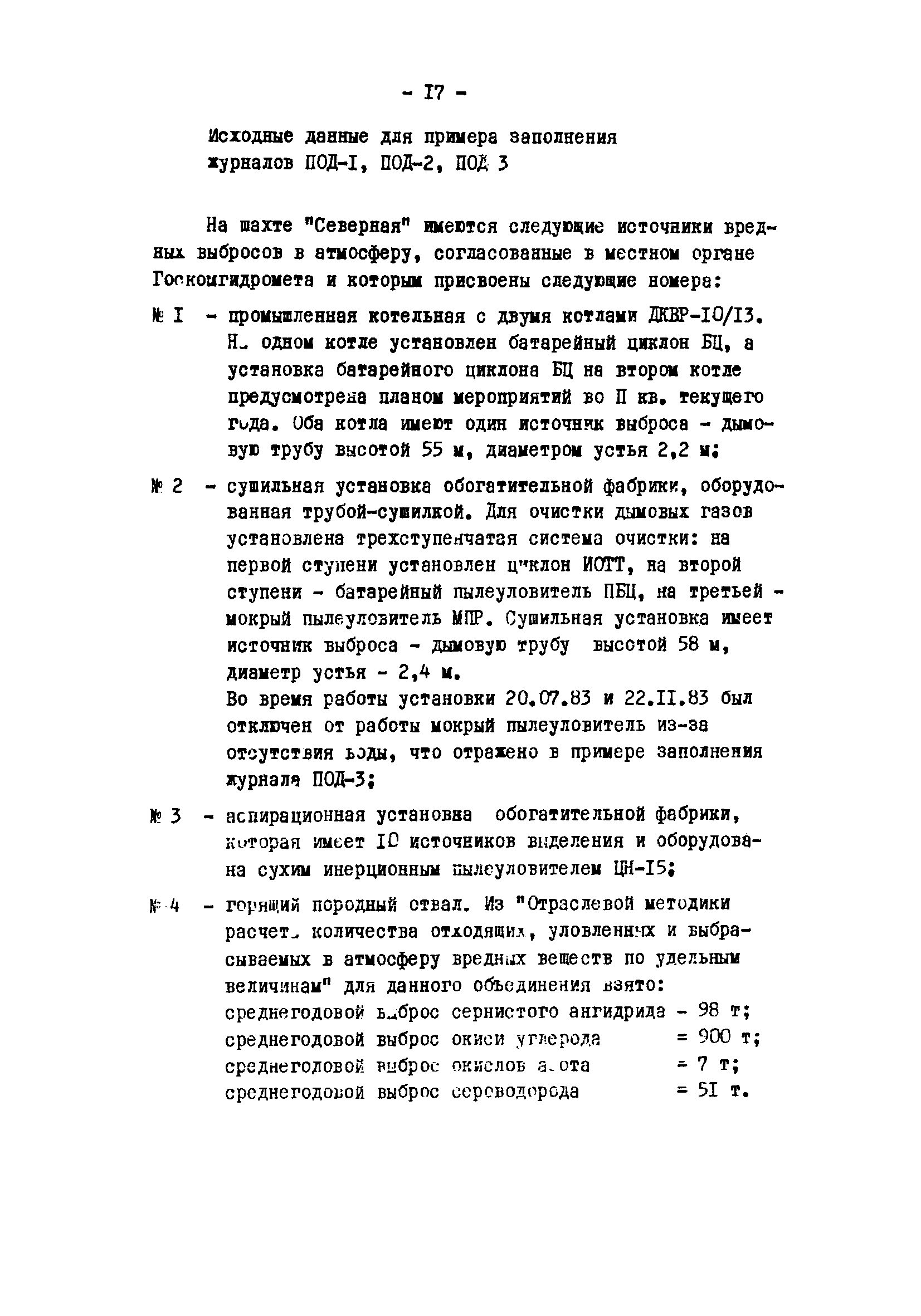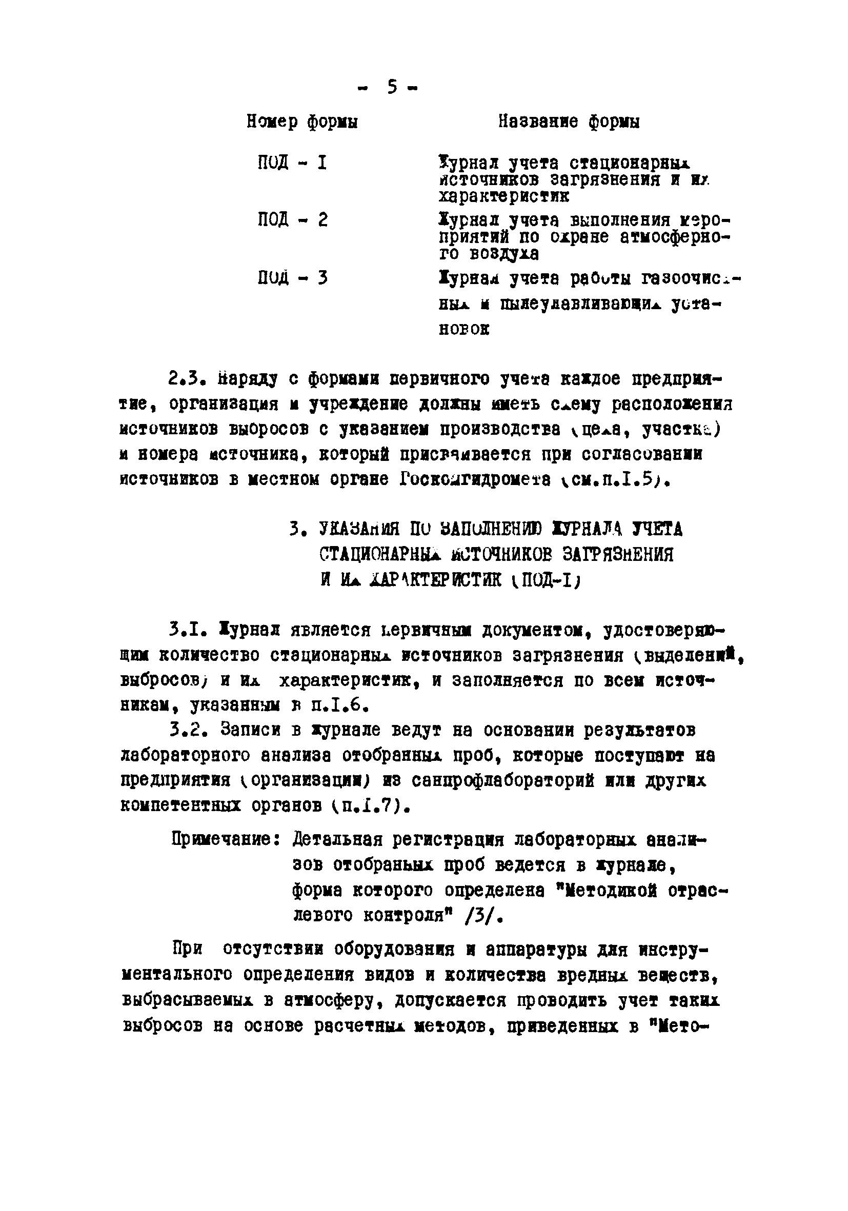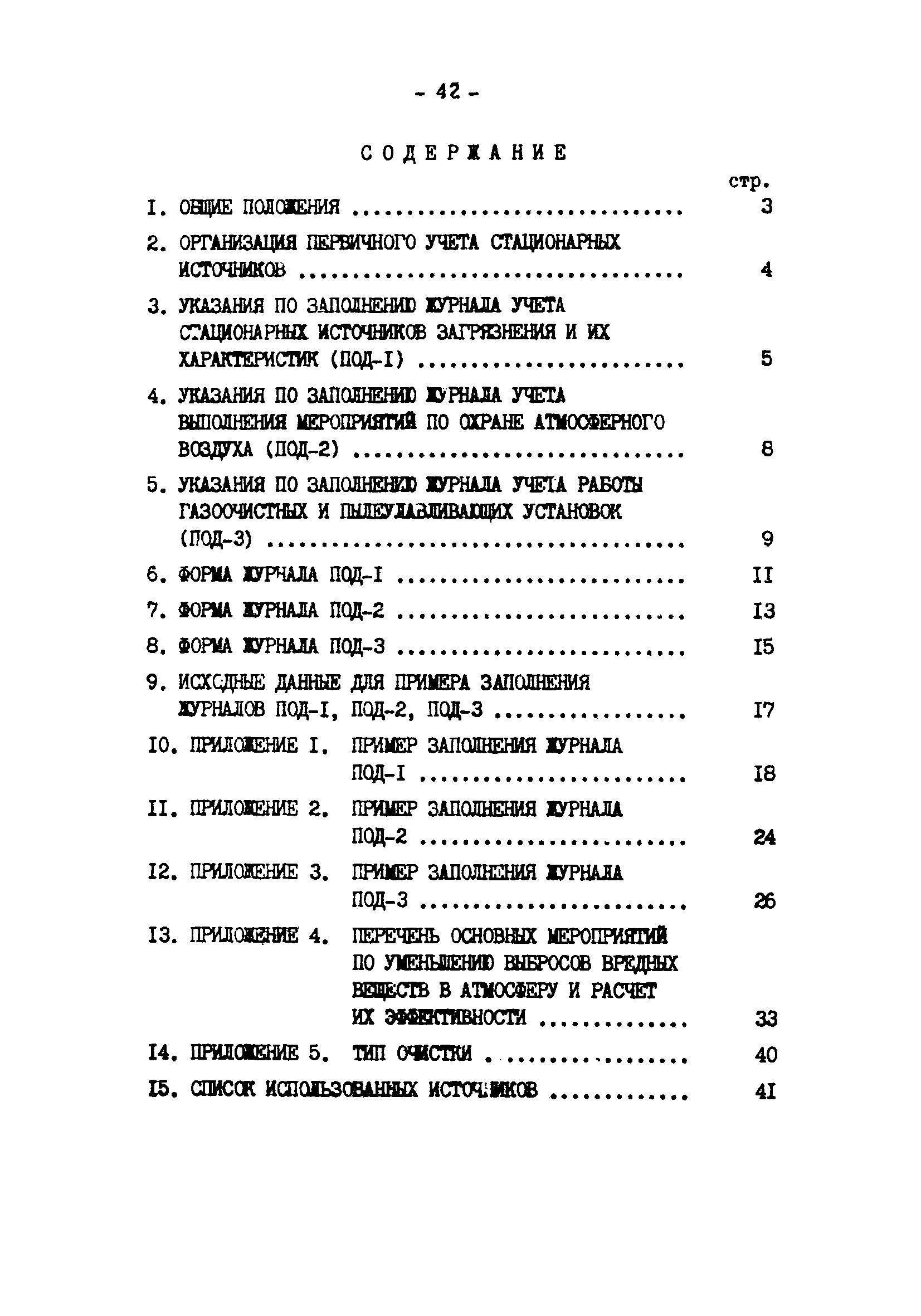 | Оглавление: | 1. Общие положения 2. Организация первичного учета стационарных источников 3. Указания по заполнению журнала учета стационарных источников загрязнения и их характеристик (ПОД-1) 4. Указания по заполнению журнала учета выполнения мероприятий по охране атмосферного воздуха (ПОД-2) 5. Указания по заполнению журнала учета работы газоочистных и пылеулавливающих установок (ПОД-3) 6. Форма журнала ПОД-1 7. Форма журнала ПОД-2 8. Форма журнала ПОД-3 9. Исходные данные для примера заполнения журнала ПОД-1, ПОД-2, ПОД-3 Приложение 1 Пример заполнения журнала ПОД-1 Приложение 2 Пример заполнения журнала ПОД-2 Приложение 3 Пример заполнения журнала ПОД-3 Приложение 4 Перечень основных мероприятий по уменьшению выбросов вредных веществ в атмосферу и расчет их эффективности Приложение 5 Тип очистки Список использованных источников |