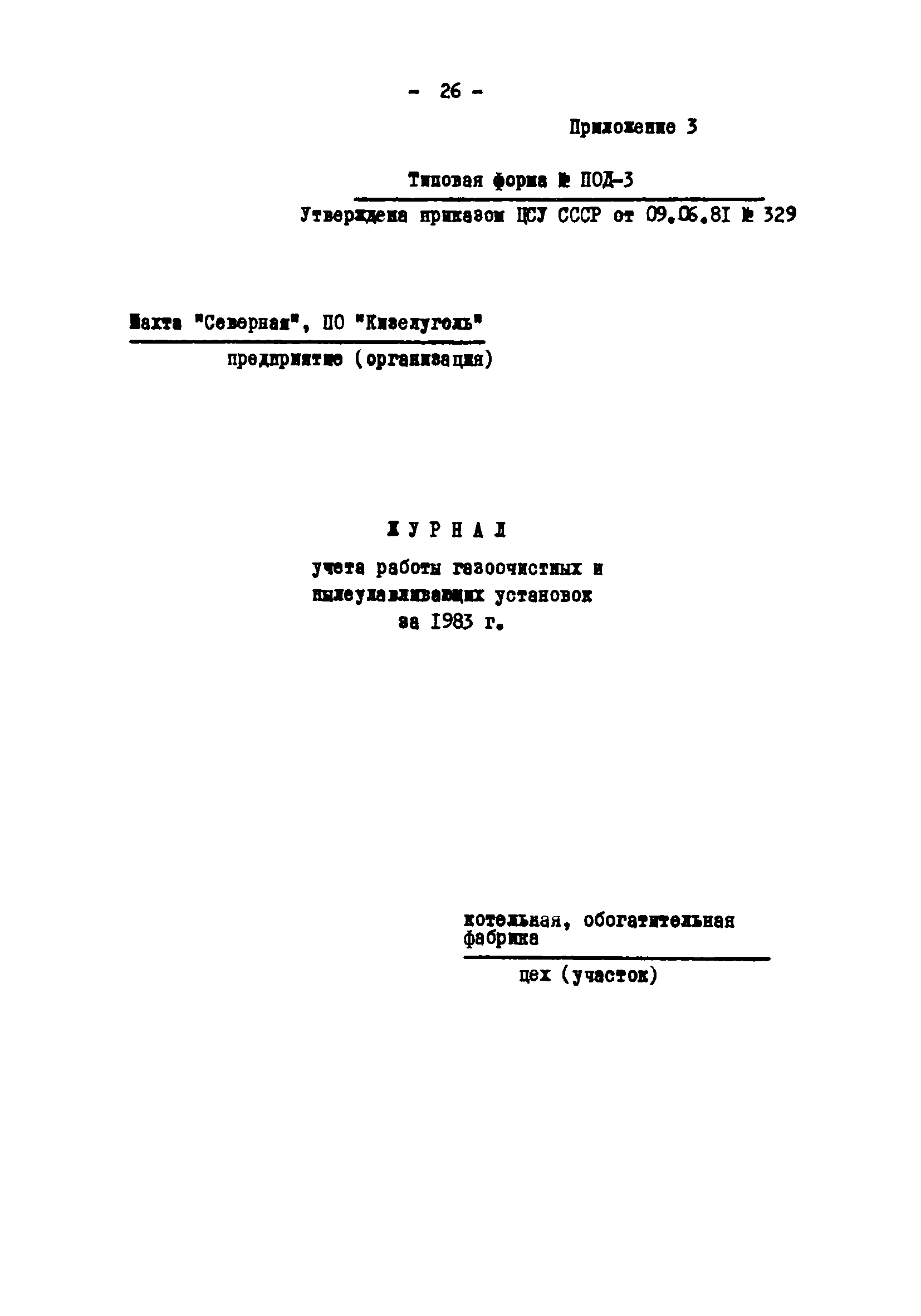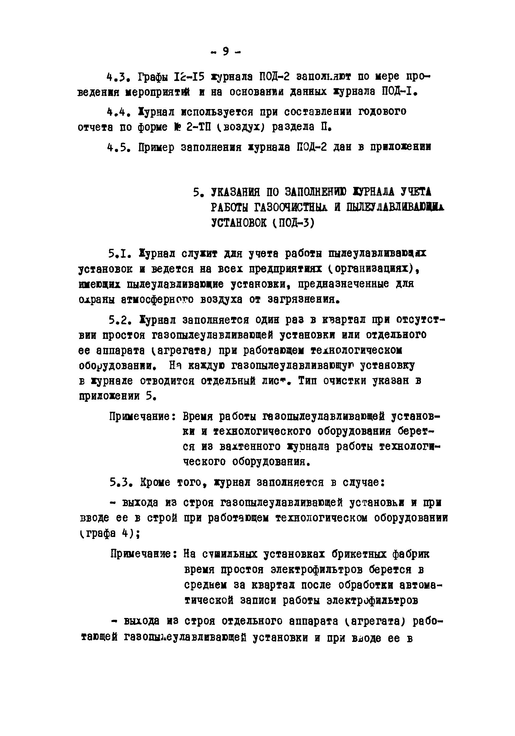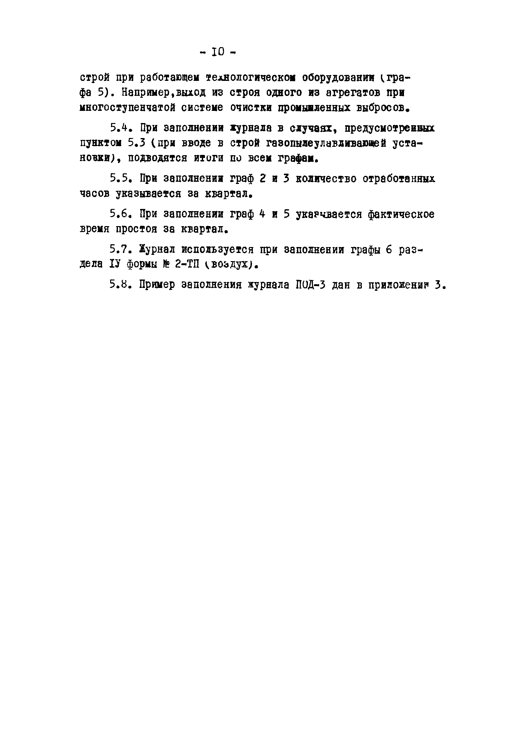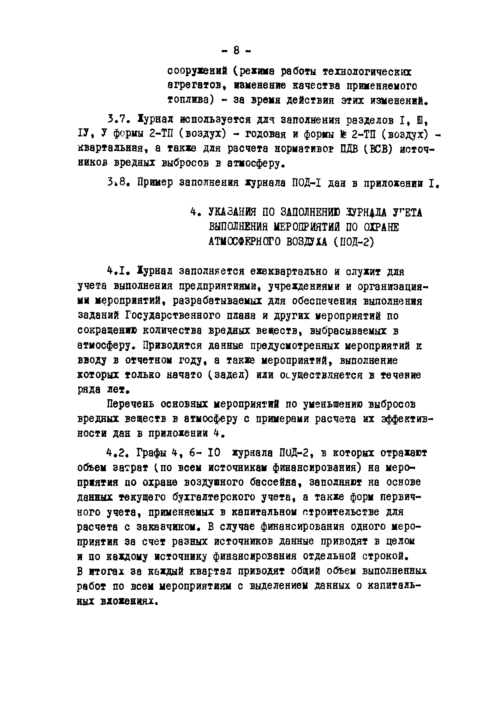 | Оглавление: | 1. Общие положения 2. Организация первичного учета стационарных источников 3. Указания по заполнению журнала учета стационарных источников загрязнения и их характеристик (ПОД-1) 4. Указания по заполнению журнала учета выполнения мероприятий по охране атмосферного воздуха (ПОД-2) 5. Указания по заполнению журнала учета работы газоочистных и пылеулавливающих установок (ПОД-3) 6. Форма журнала ПОД-1 7. Форма журнала ПОД-2 8. Форма журнала ПОД-3 9. Исходные данные для примера заполнения журнала ПОД-1, ПОД-2, ПОД-3 Приложение 1 Пример заполнения журнала ПОД-1 Приложение 2 Пример заполнения журнала ПОД-2 Приложение 3 Пример заполнения журнала ПОД-3 Приложение 4 Перечень основных мероприятий по уменьшению выбросов вредных веществ в атмосферу и расчет их эффективности Приложение 5 Тип очистки Список использованных источников |