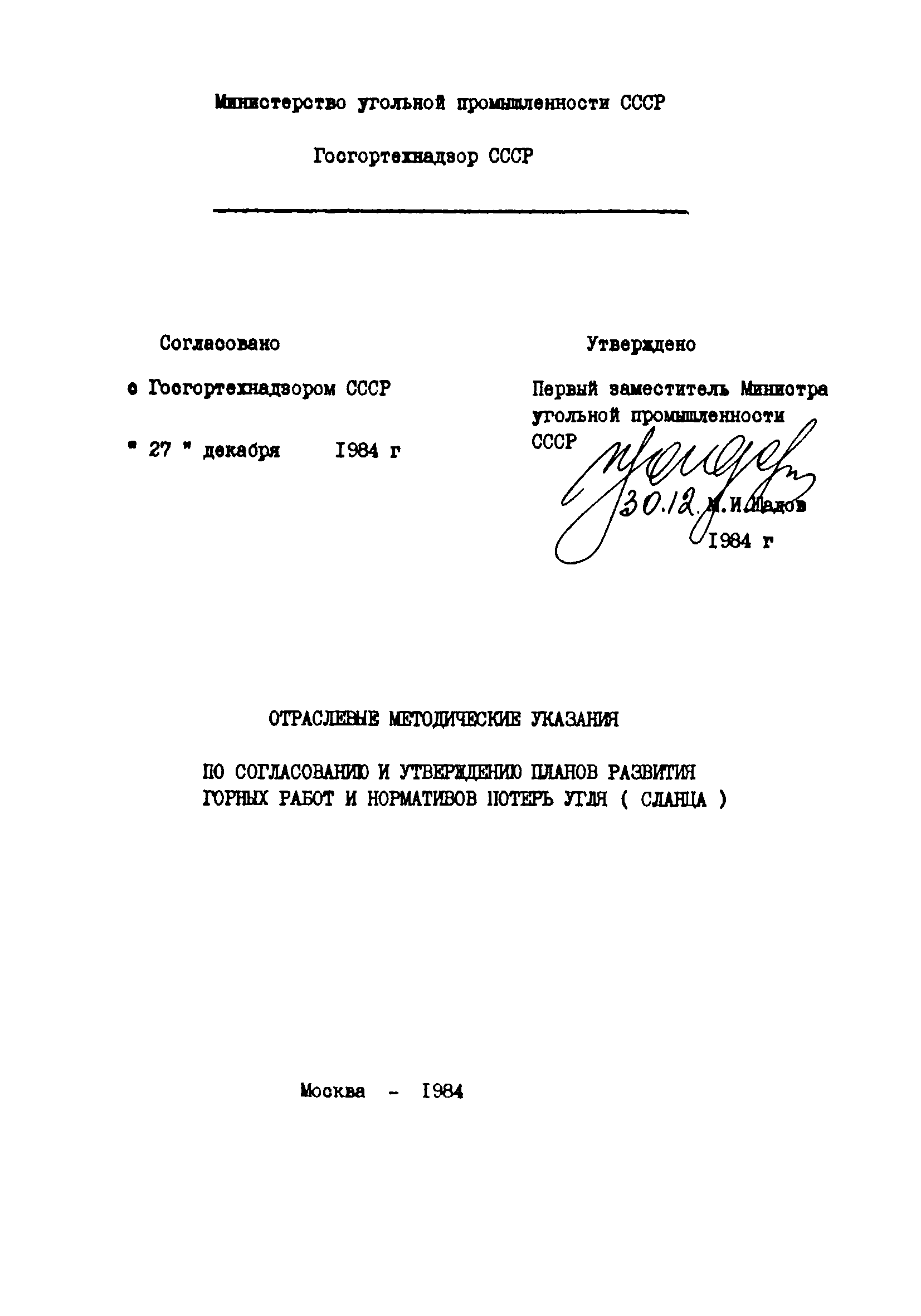 | | Утверждён: | 30.12.1984 Министерство угольной промышленности СССР (USSR Ministry of the Coal Industry )