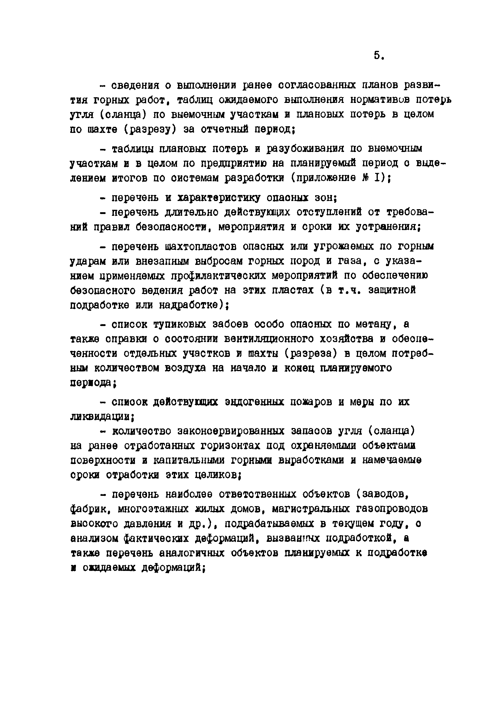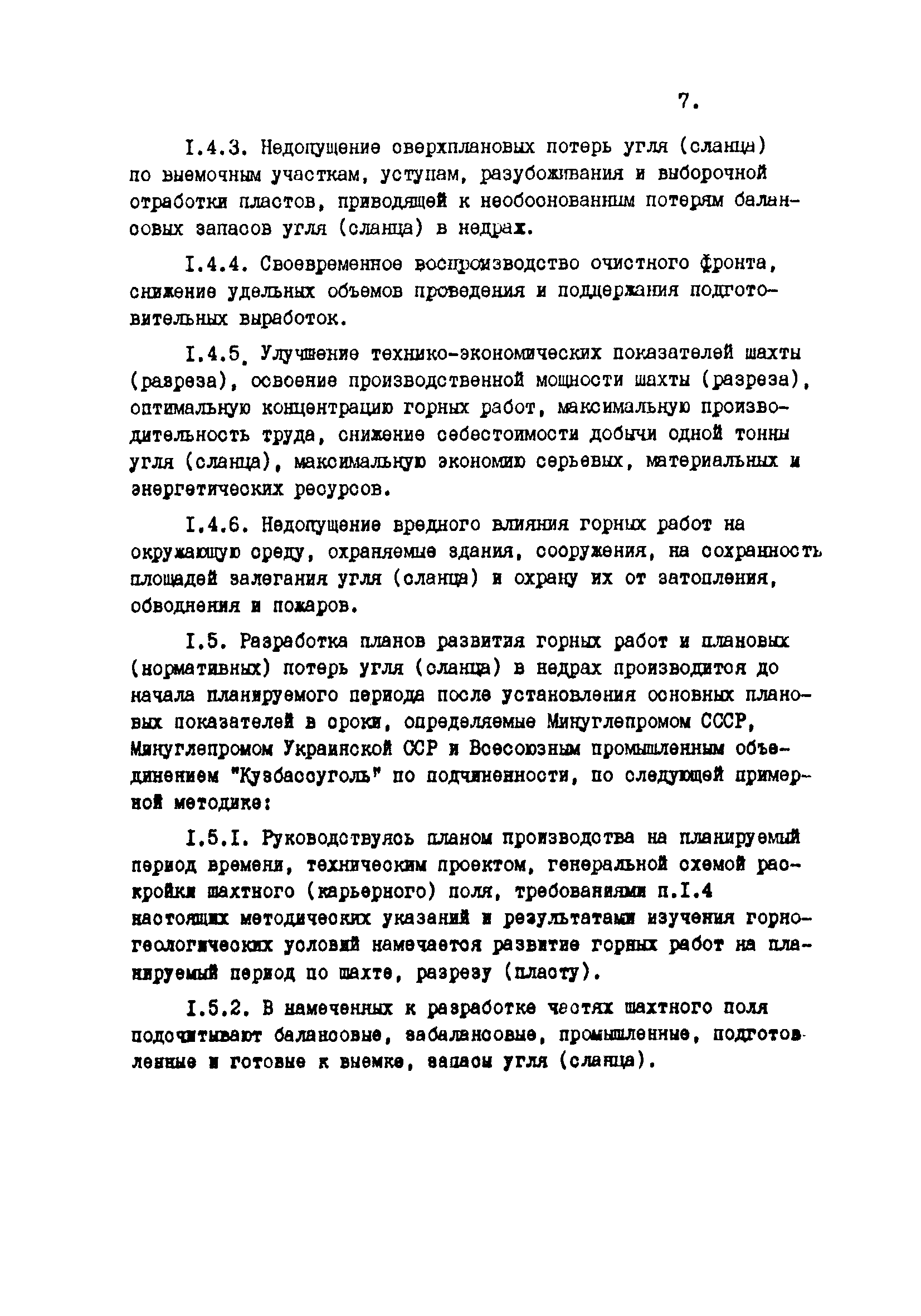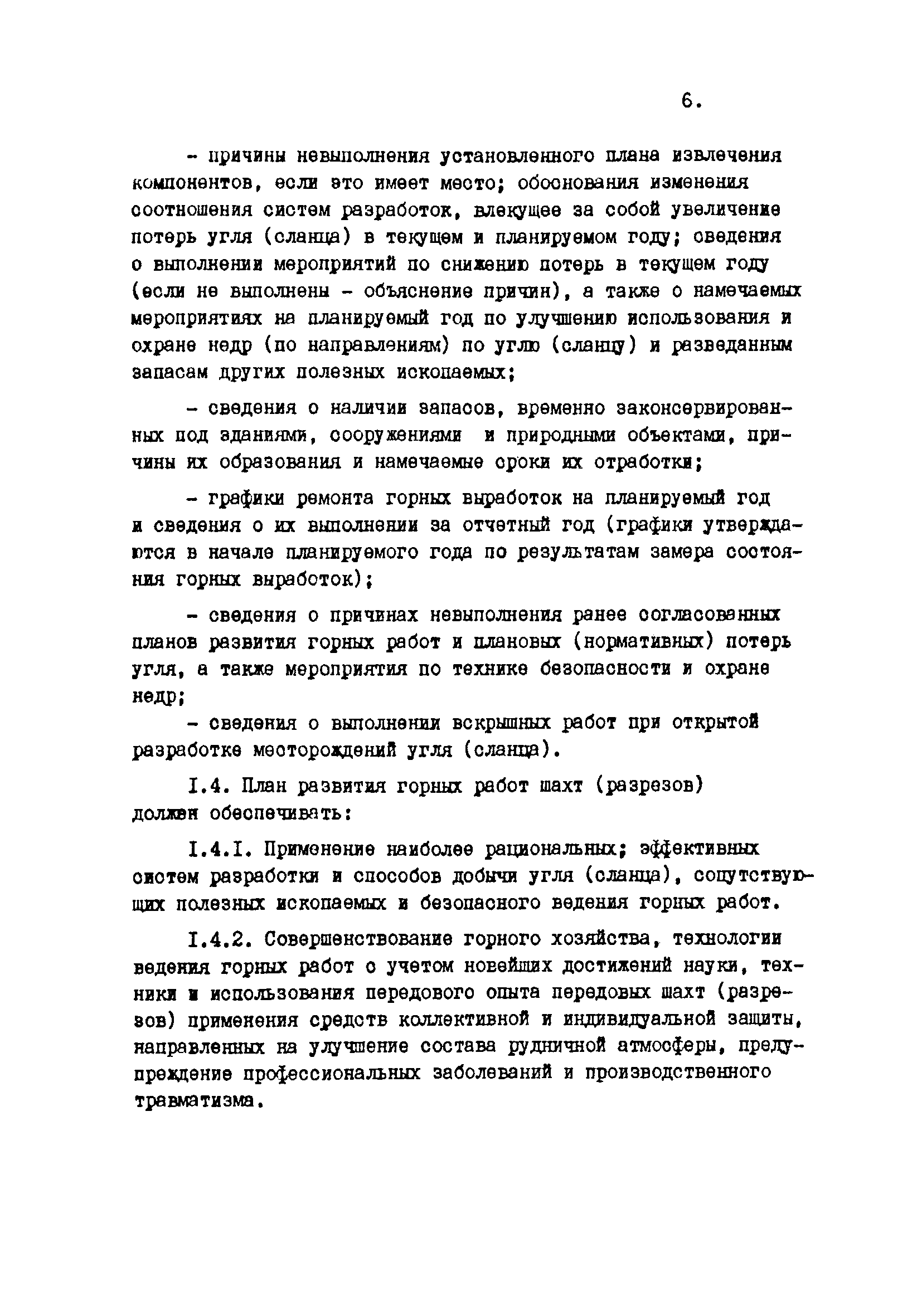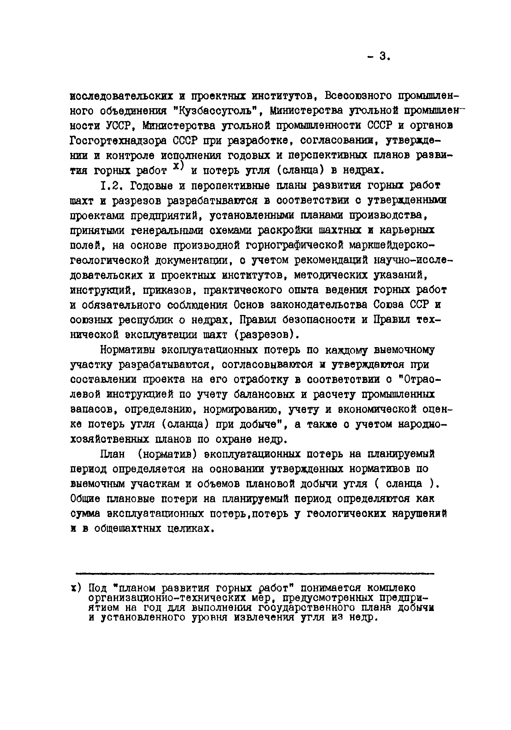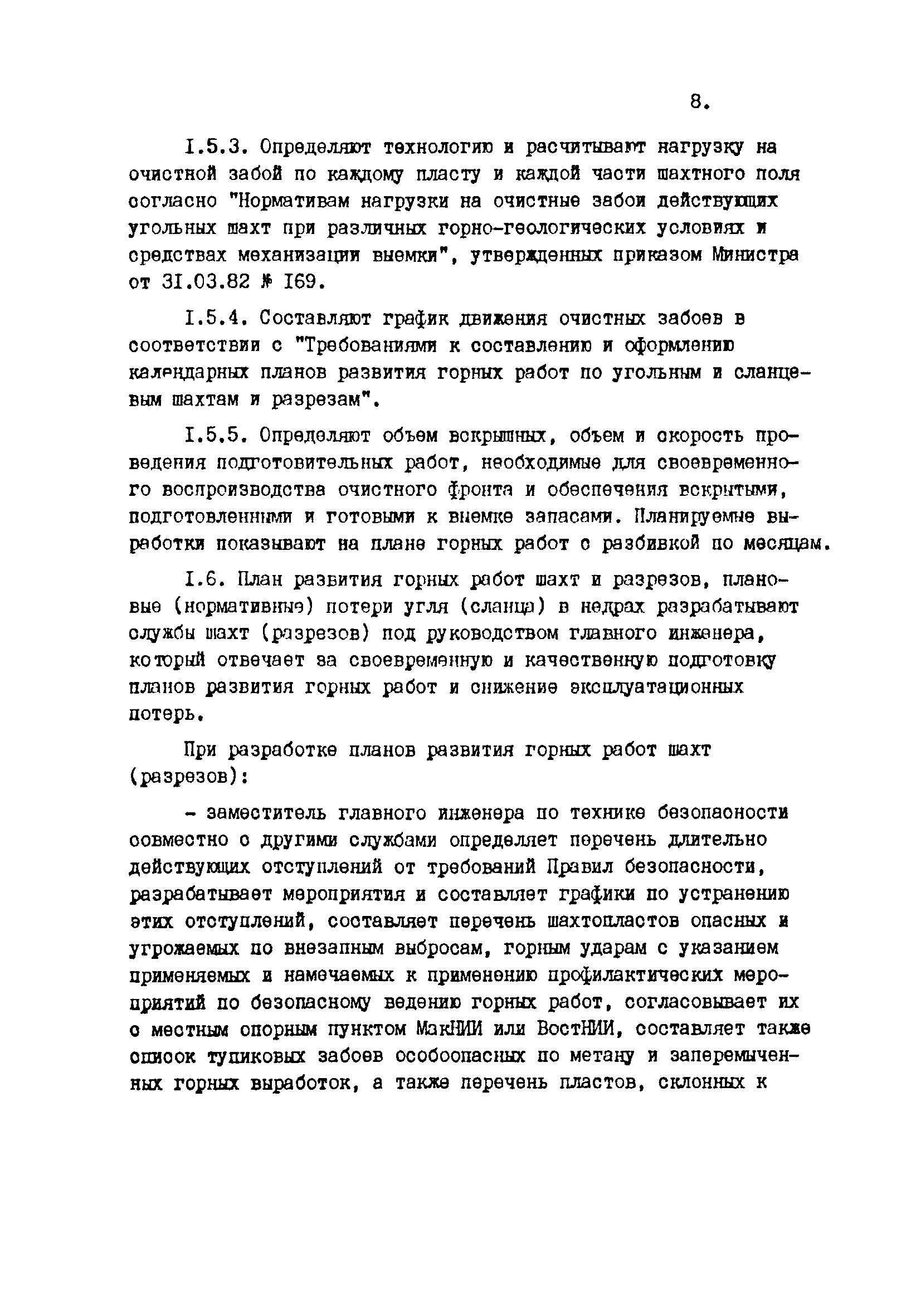Отраслевые методические указания по согласованию и утверждению планов развития горных работ и нормативов потерь угля (сланца)| Статус: | утратил силу | | Название рус.: | Отраслевые методические указания по согласованию и утверждению планов развития горных работ и нормативов потерь угля (сланца) | | Дата добавления в базу: | 01.01.2021 | | Дата актуализации: | 01.01.2021 | | Область применения: | Методические указания являются обязательными для шахт, разрезов, шахтостроительных управлений, производственных и всесоюзных объединений, комбинатов, трестов, научно-исследовательских и проектных институтов, Всесоюзного промышленного объединения "Кузбассуголь", Министерства угольной промышленности УССР, Министерства угольной промышленности УССР, Министерства угольной промышленности СССР и органов Госгортехнадзора СССР при разработке, согласовании, утверждении и контроле исполнения готовых и перспективных планов развития горных работ и потерь угля (сланца) в недрах. | | Оглавление: | 1. Разработка планов развития горных работ и плановых (нормативных) эксплуатационных потерь шахт и разрезов 2. Согласование и утверждение планов развития горных работ и плановых потерь угля (сланца) в недрах 3. Контроль за выполнение планов развития горных работ и полнотой отработки запасов угля (сланца) на шахтах (разрезах) Приложение 1 План эксплуатационных потерь угля (сланца) Приложение 2 Перечень директивных материалов, необходимых для разработки планов развития горных работ на шахтах и разрезах | | Разработан: | ВНИМИ