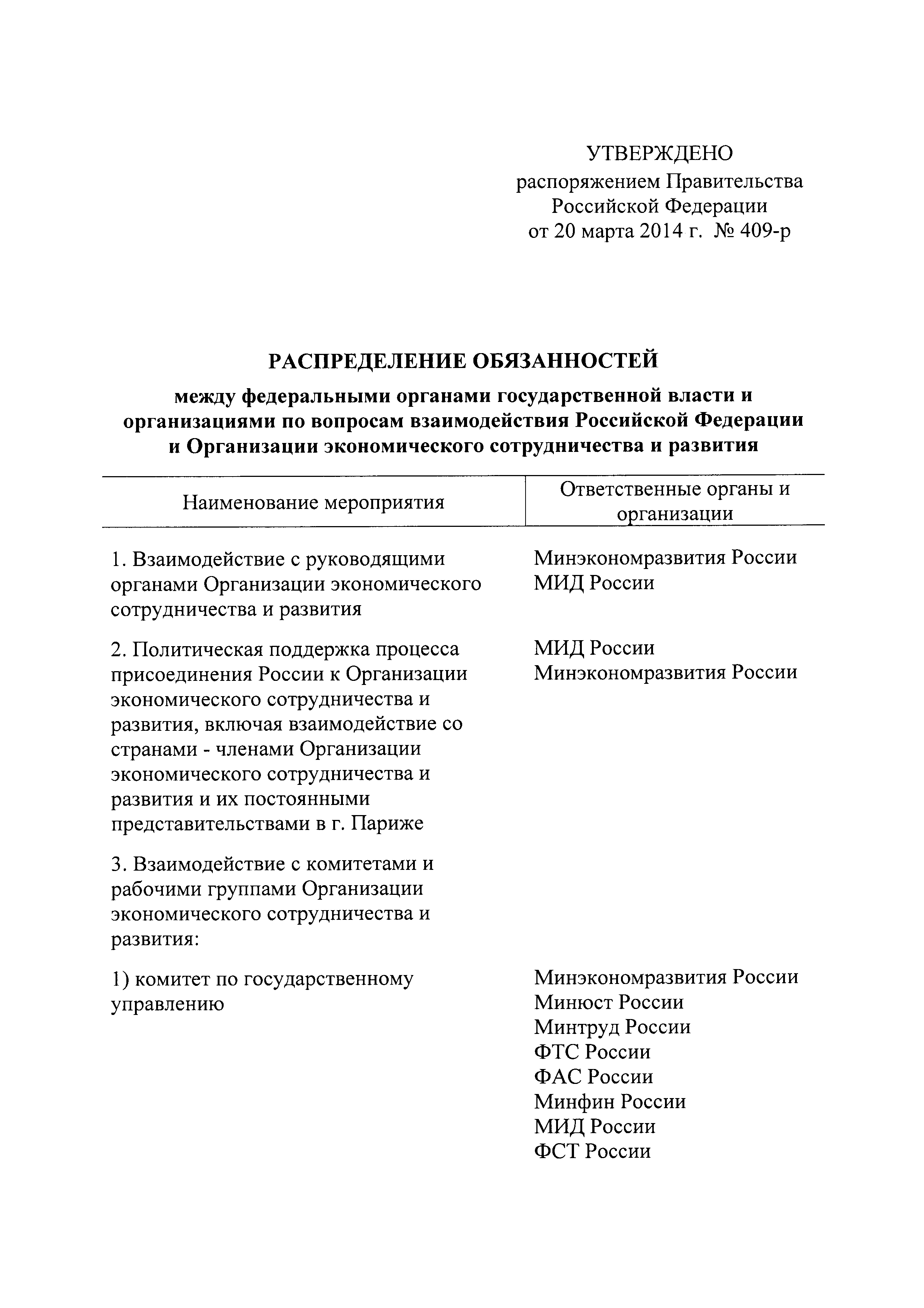 Распределение обязанностей между федеральными органами государственной власти и организациями по вопросам взаимодействия Российской Федерации и Организации экономического сотрудничества и развития| Статус: | действует | | Название рус.: | Распределение обязанностей между федеральными органами государственной власти и организациями по вопросам взаимодействия Российской Федерации и Организации экономического сотрудничества и развития | | Дата добавления в базу: | 01.02.2020 | | Дата актуализации: | 01.01.2021 | | Дата введения: | 20.03.2014 | | Утверждён: | 20.03.2014 Правительство Российской Федерации (409-р)