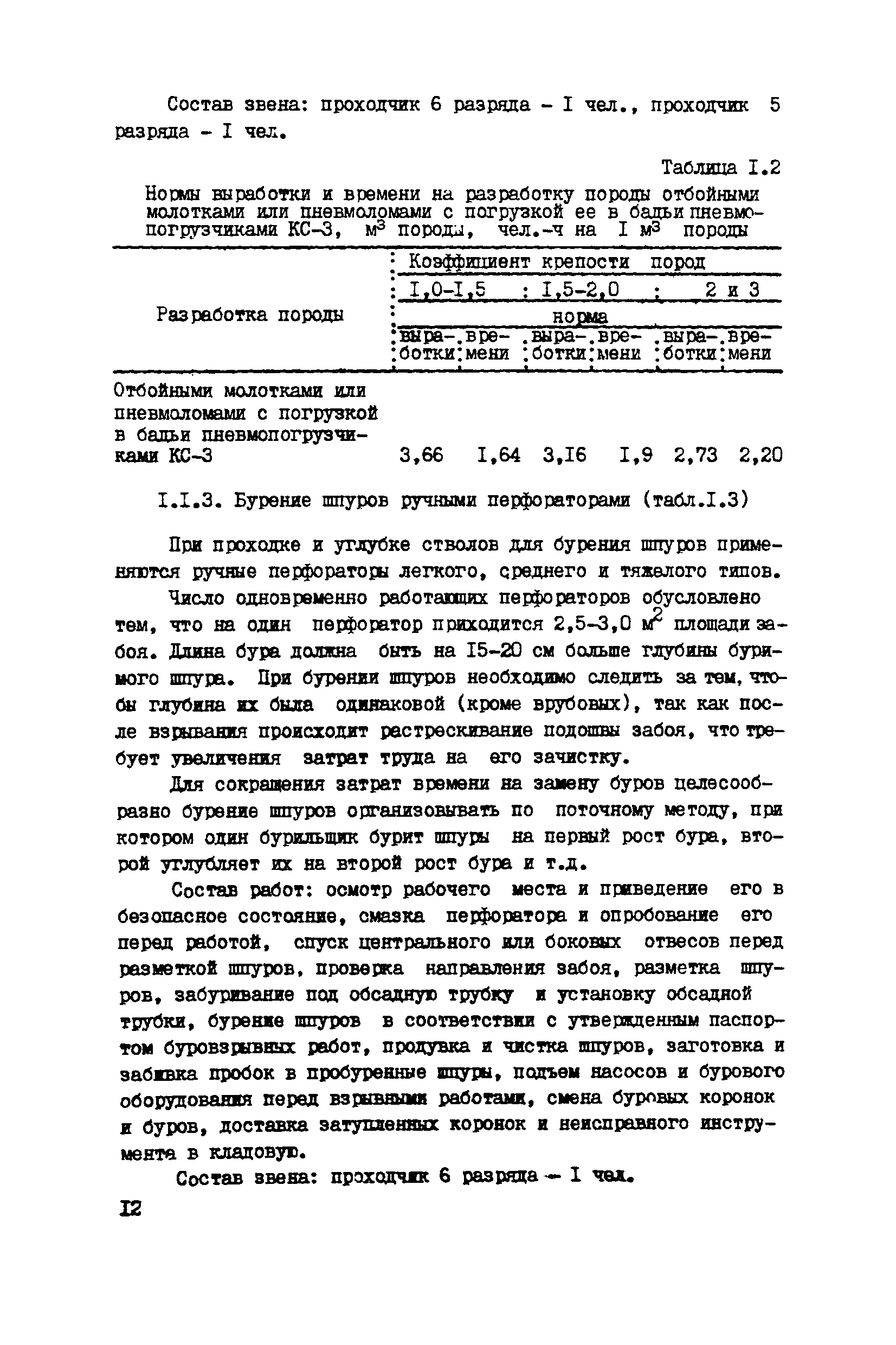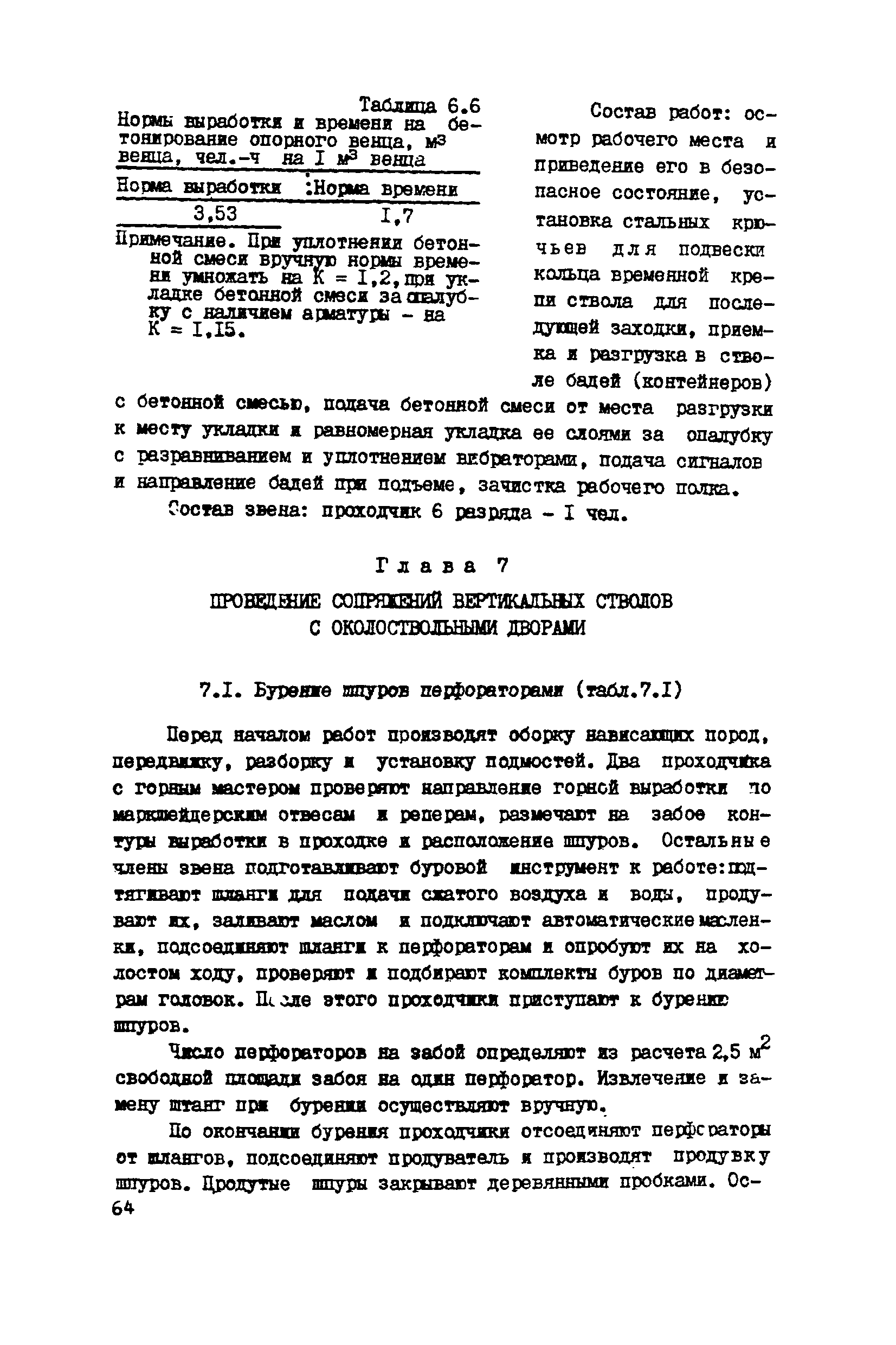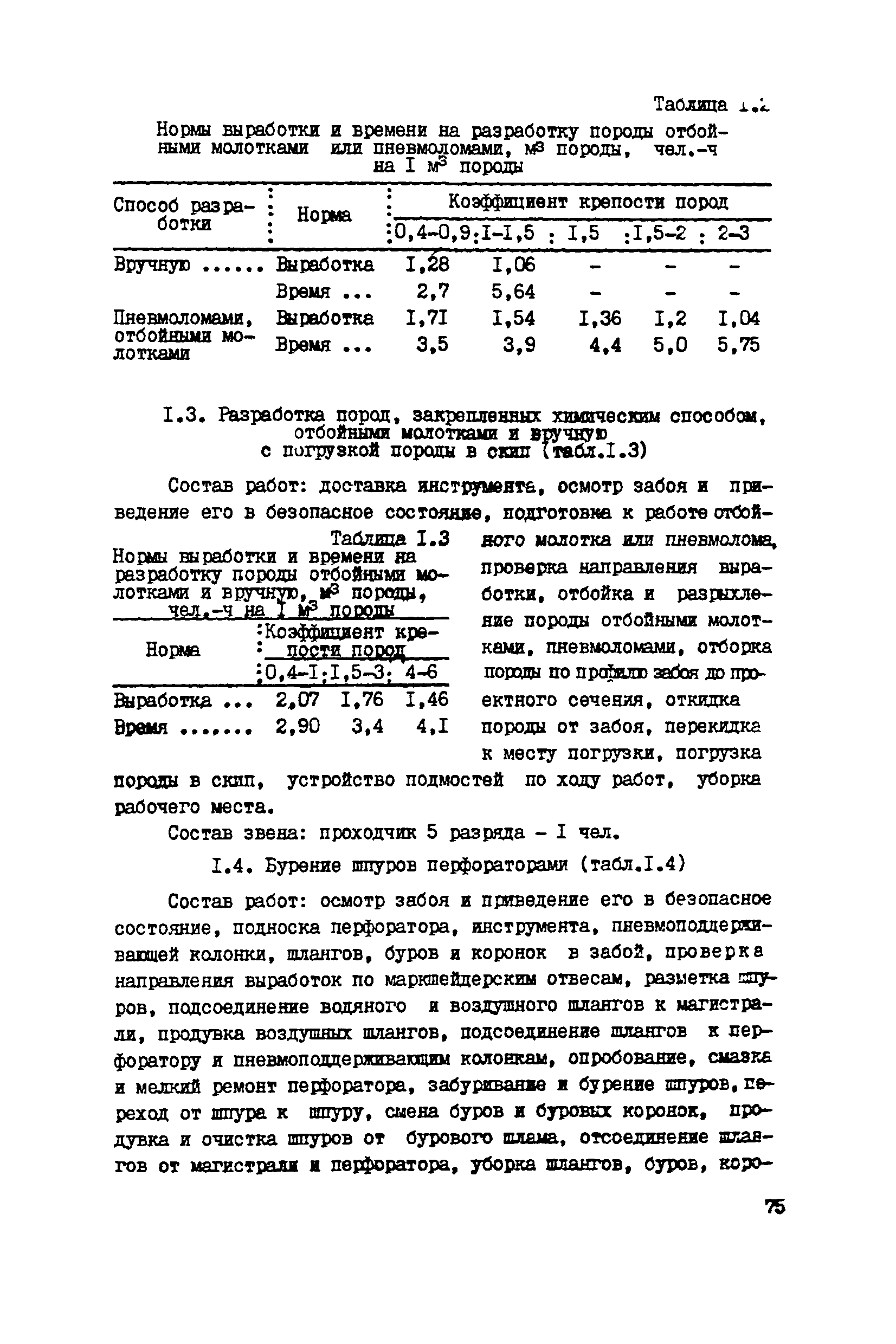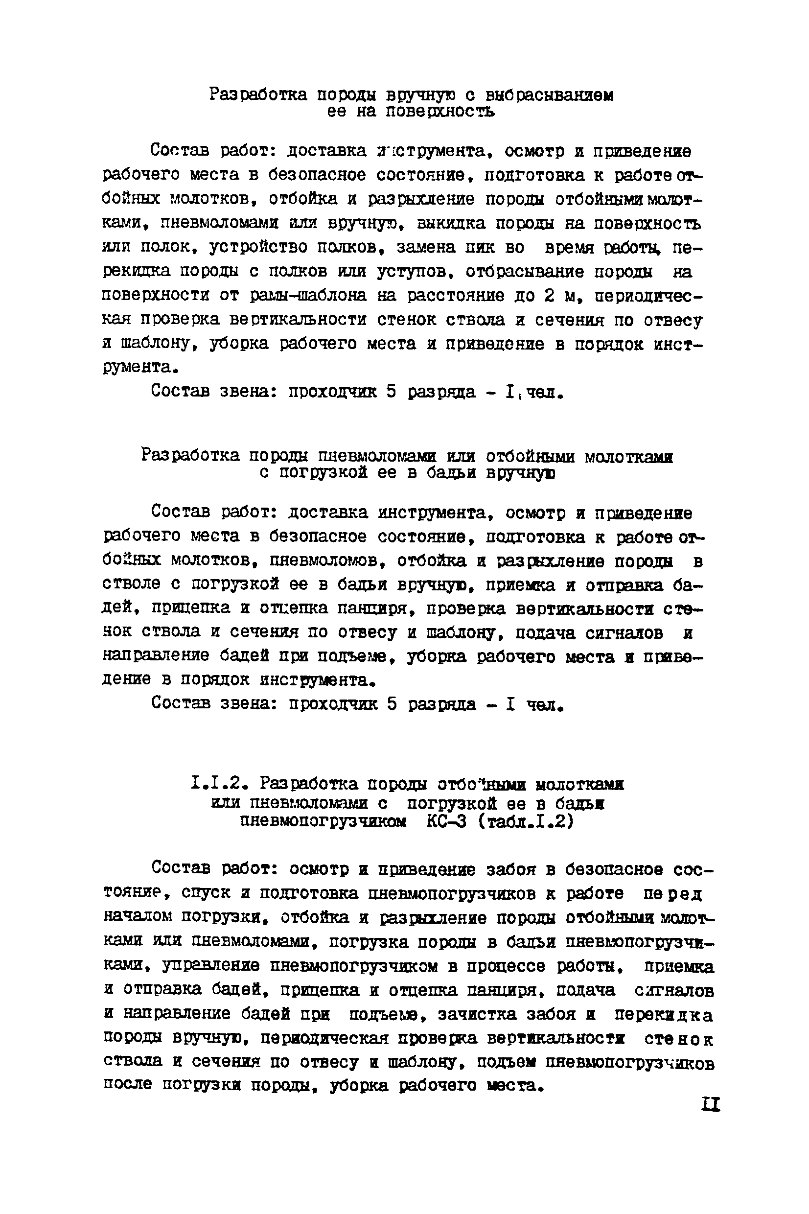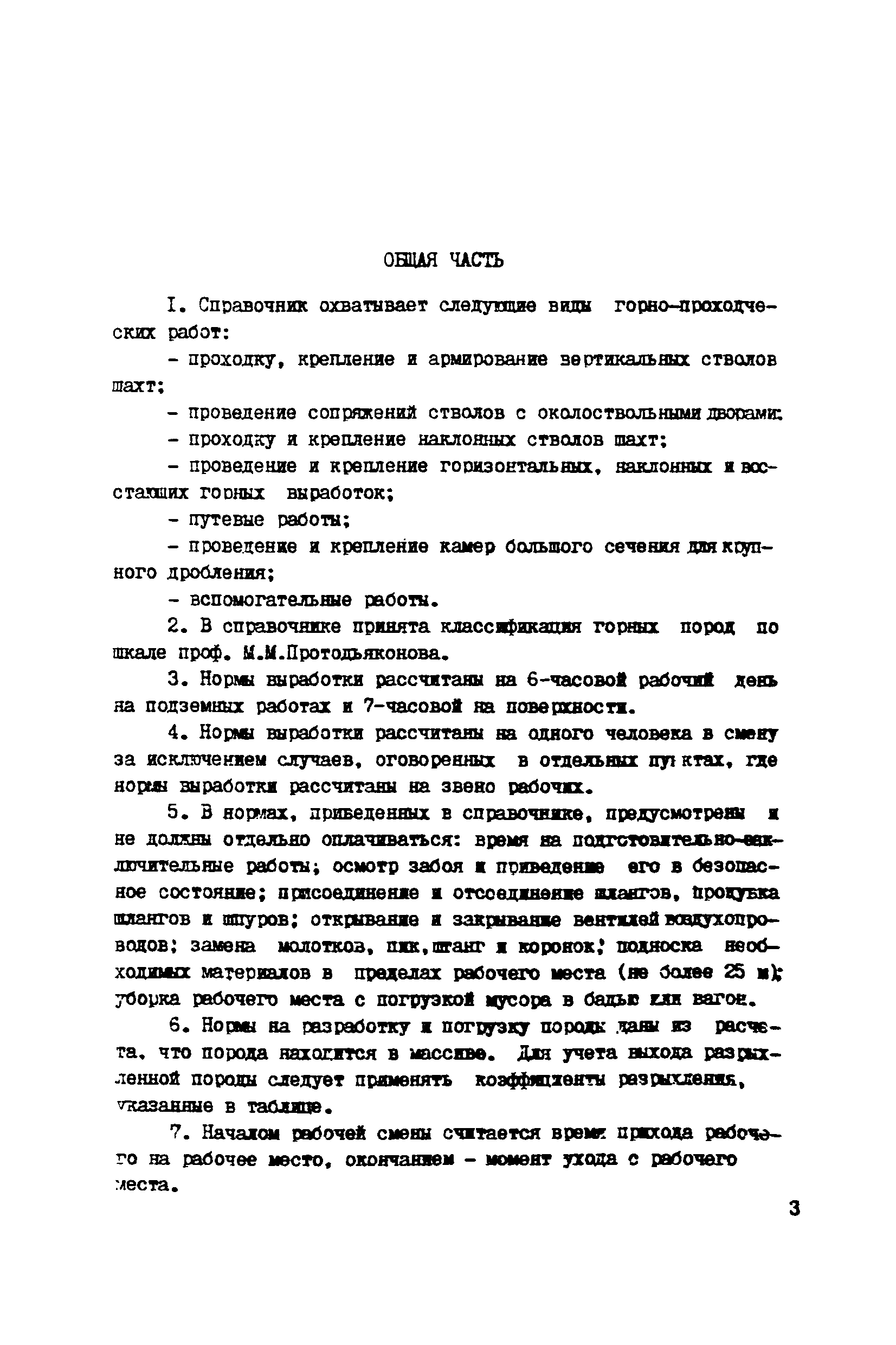 | Оглавление: | Общая часть Раздел 1. Проходка, крепление и армирование вертикальных стволов шахт; проведение сопряжений стволов с околоствольными дворами Глава 1. Проходка вертикальных стволов шахт 1.1 Проходка вертикальных стволов обычном способом 1.2 Проходка вертикальных стволов по замороженным породам 1.3 Проходка вертикальных стволов по породам, предварительно закрепленным химическим способом Глава 2. Крепление вертикальных стволов шахт бетоном 2.1 Временное крепление стволов металлическими кольцами 2.2 Крепление стволов круглого сечения бетоном и железобетоном 2.3 Крепление вертикальных стволов тюбингами 2.4 Крепление вертикальных стволов анкерной крепью 2.5 Установка и снятие деревянной опалубки заводного тюбингового кольца в конце заходки 2.6 Снятие первого тюбингового кольца 2.7 Сбивка кромки бетона на контакте заходки 2.8 Установка опорного венца из чугунных тюбингов 2.9 Укладка холодного бетона за опалубку при спуске его по трубам 2.10 Крепление стволов торкрет—бетоном Глава 3. Гидроизоляционные работы 3.1 Гидроизоляция тюбинговой крепи 3.2 Расчеканка свинцовых прокладок в тюбинговых швах и чеканка тюбинговых швов свинцовым шнуром 3.3 Очистка чугунной тюбинговой крепи после проходки и крепления ствола 3.4 Пикотаж горизонтального шва между двумя звеньями тюбинговой крепи ствола 3.5 Гидроизоляция чугунной тюбинговой крепи тампонажным раствором при поступлении его по трубам самотеком с поверхности 3.6 Первичное нагнетание за крепь шахтного ствола 3.7 Контрольное в нагнетание за крепь шахтного ствола 3.8 Контрольное подтягивание и замена болтов в тюбинговой отделке шахтного ствола 3.9 Установка и замена пробок в отверстиях тюбингов 3.10 Изоляция стыков тюбинговой крепи шахтного ствола 3.11 Штукатурка бетонной поверхности под изоляцию и по изоляции 3.12 Оклеечная изоляция стенок шахтного ствола 3.13 Устройство пикотажных манжет при крепления вертикальных стволов шахт железобетонными тюбингами 3.14 Бурение шпуров в бетоне Глава 4. Армирование стволов 4.1 Долбление лунок под расстрелы 4.2 Установка и заделка металлических расстрелов в готовые лунки 4.3 Сболчивание стальных расстрелов 4.4 Установка проводников 4.5 Оборудование лестничных отделений в стволах шахт 4.6 Устройство и разборка настилов по расстрелам 4.7 Установка рудничных станков на сопряжение с околоствольным двором 4.8 Монтаж компенсационных балок из спец профиля в стволе 4.9 Монтаж и демонтаж постоянных трубопроводов Глава 5. Вспомогательные работы при проходке и креплении стволов шахт 5.1 Устройство, разборка и переноска рабочего полка 5.2 Устройство деревянного временного переносного полка в стволе 5.3 Монтаж одноэтажных и двухэтажных подвесных металлических полков в стволах натяжных рам и предохранительных полков Глава 6. Устройство в стволах круглого сечения бетонного опорного венца (башмака) Глава 7. Проведение сопряжений вертикальных стволов с околоствольными дворами Раздел II. Проходка и крепление наклонных стволов Глава 1. Проходка наклонных стволов Глава 2. Крепление наклонных стволов Глава 3. Гидроизоляционные работы Глава 4. Вспомогательные работы при проходке и креплении вертикальных и наклонных стволов с применением специальных способов Раздел III. Проходка и крепление горизонтальных, наклонных и восстающих горных выработок Глава 1. Буровые работы Глава 2. Д