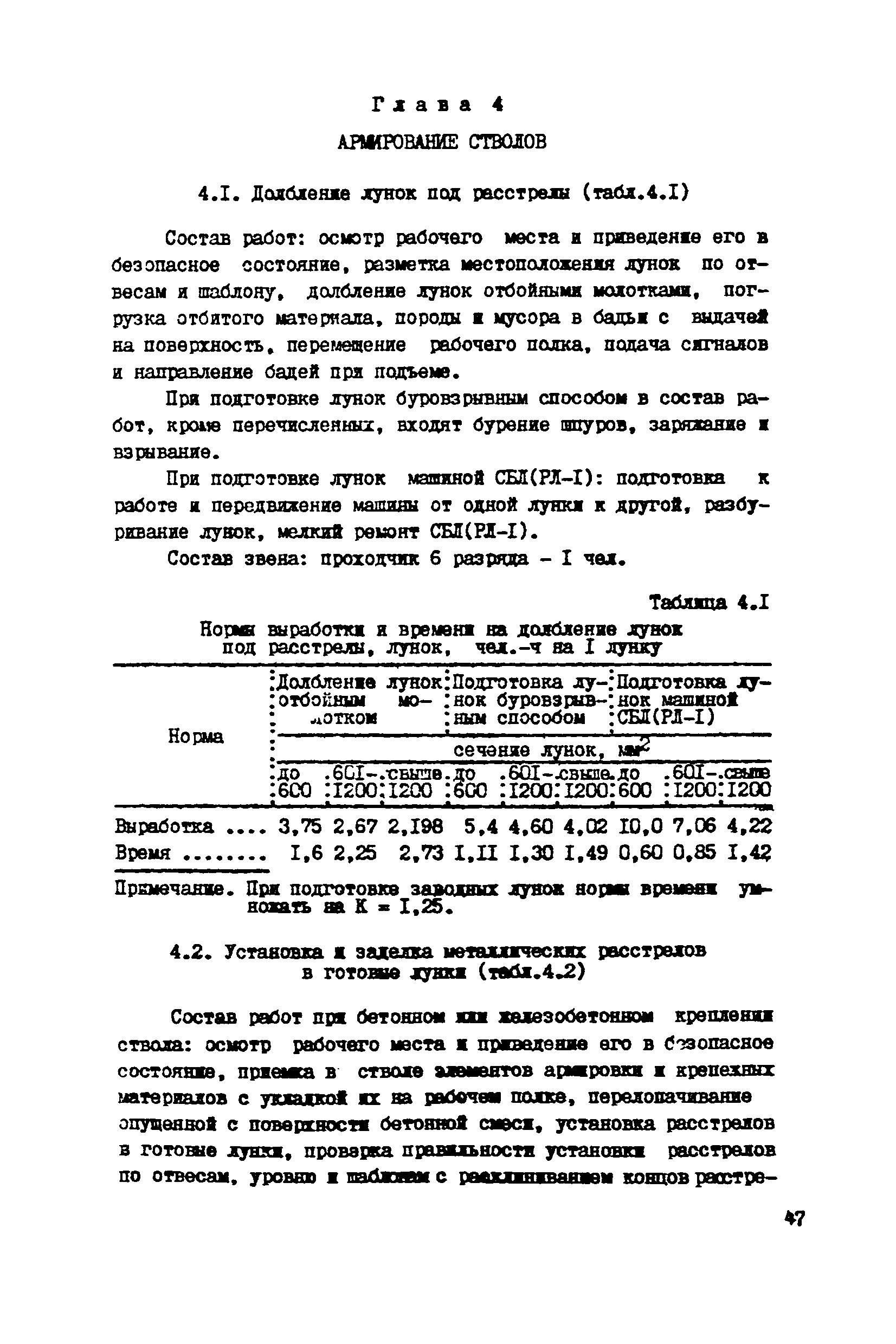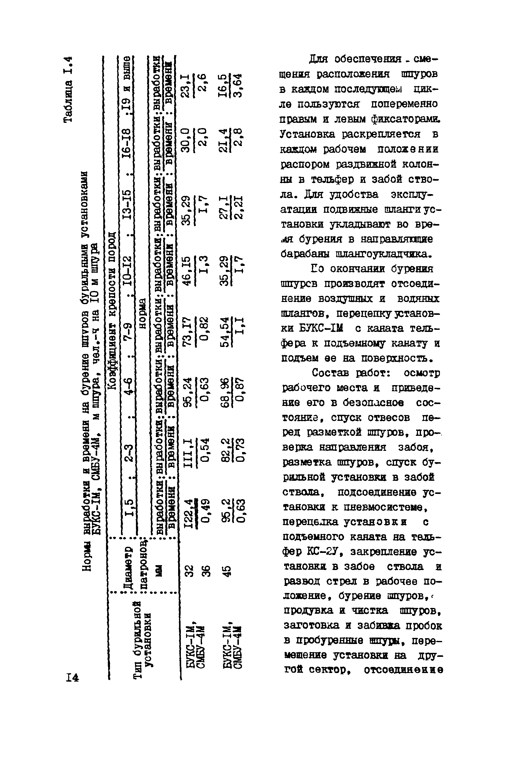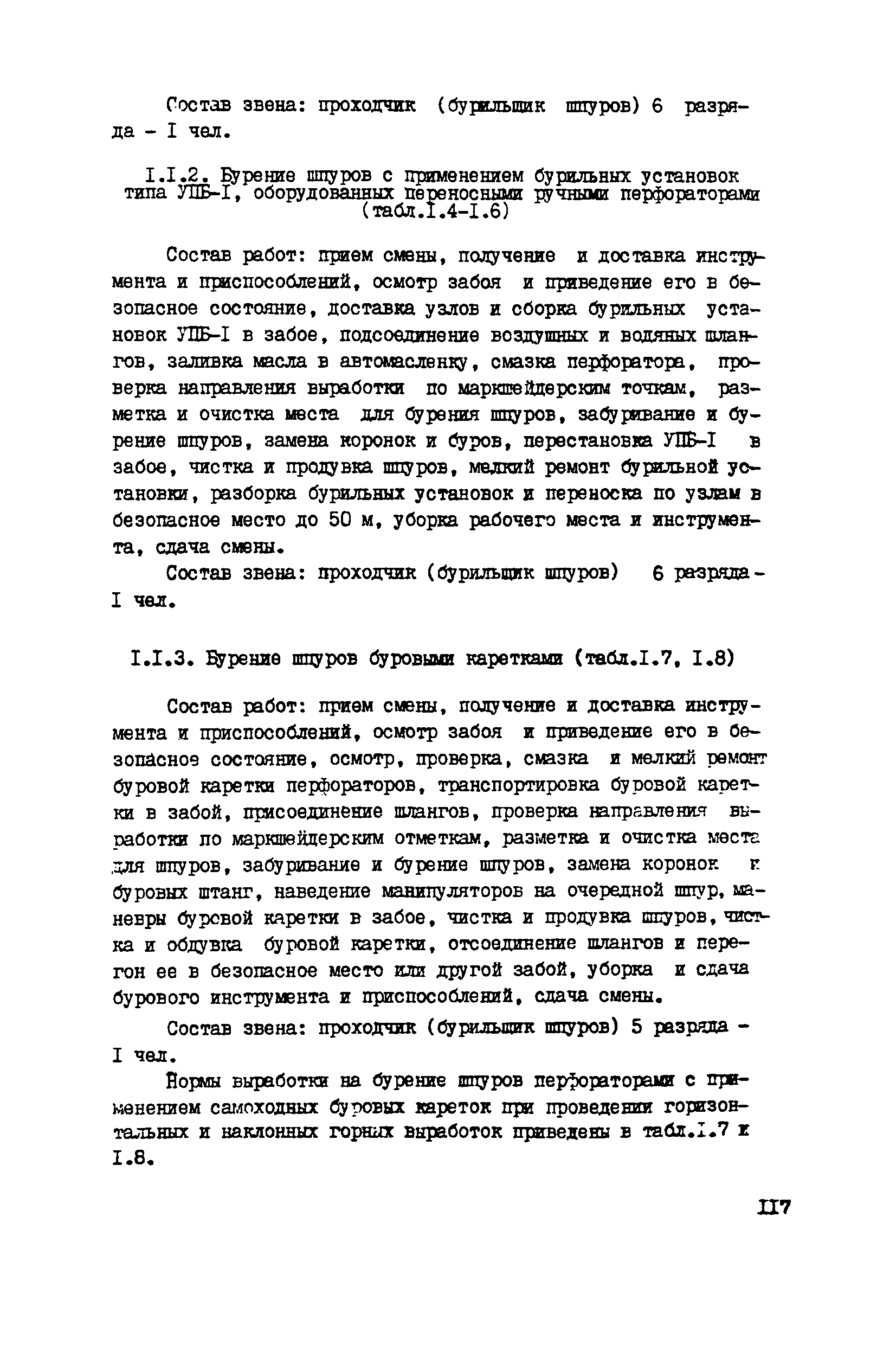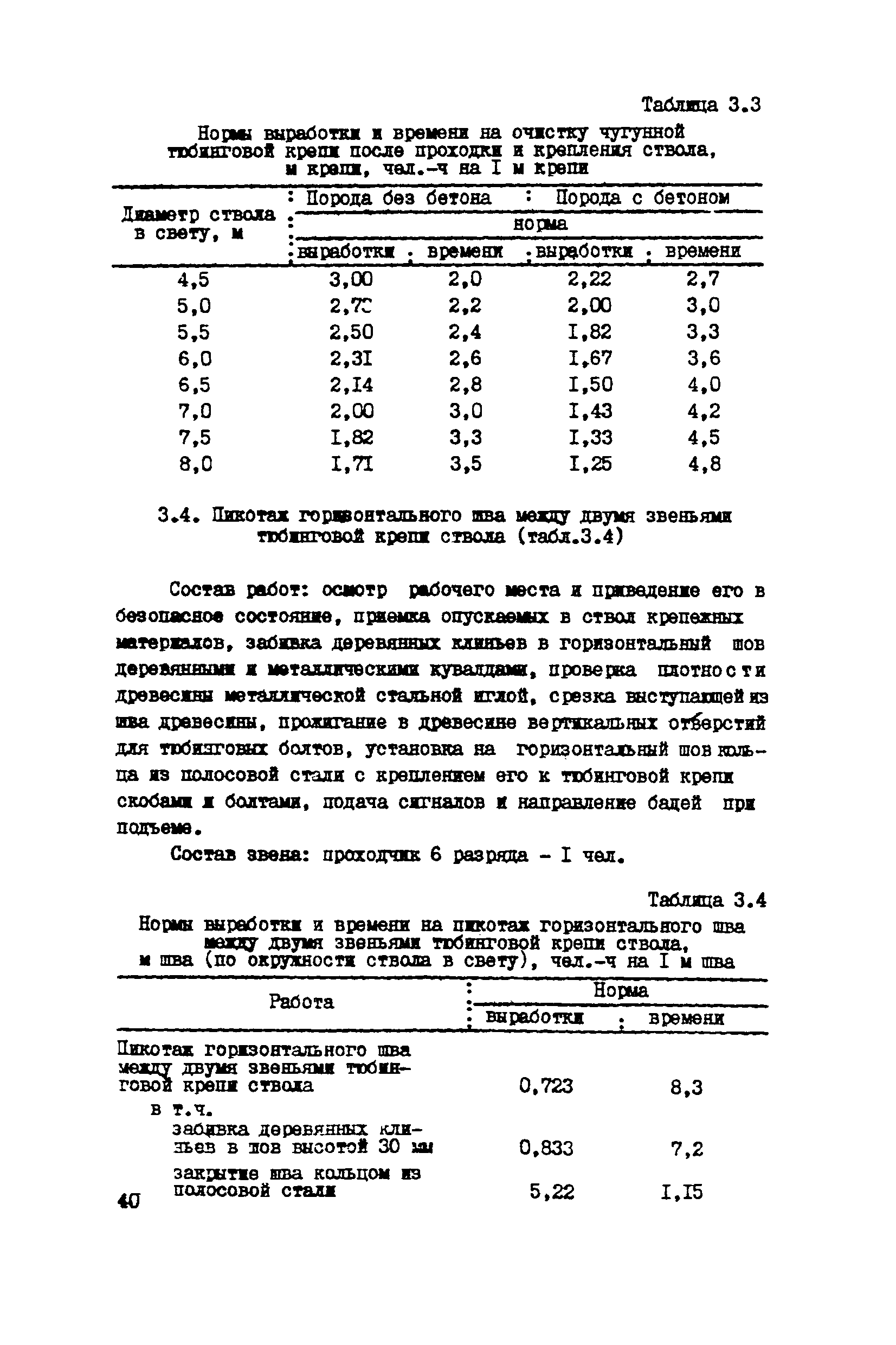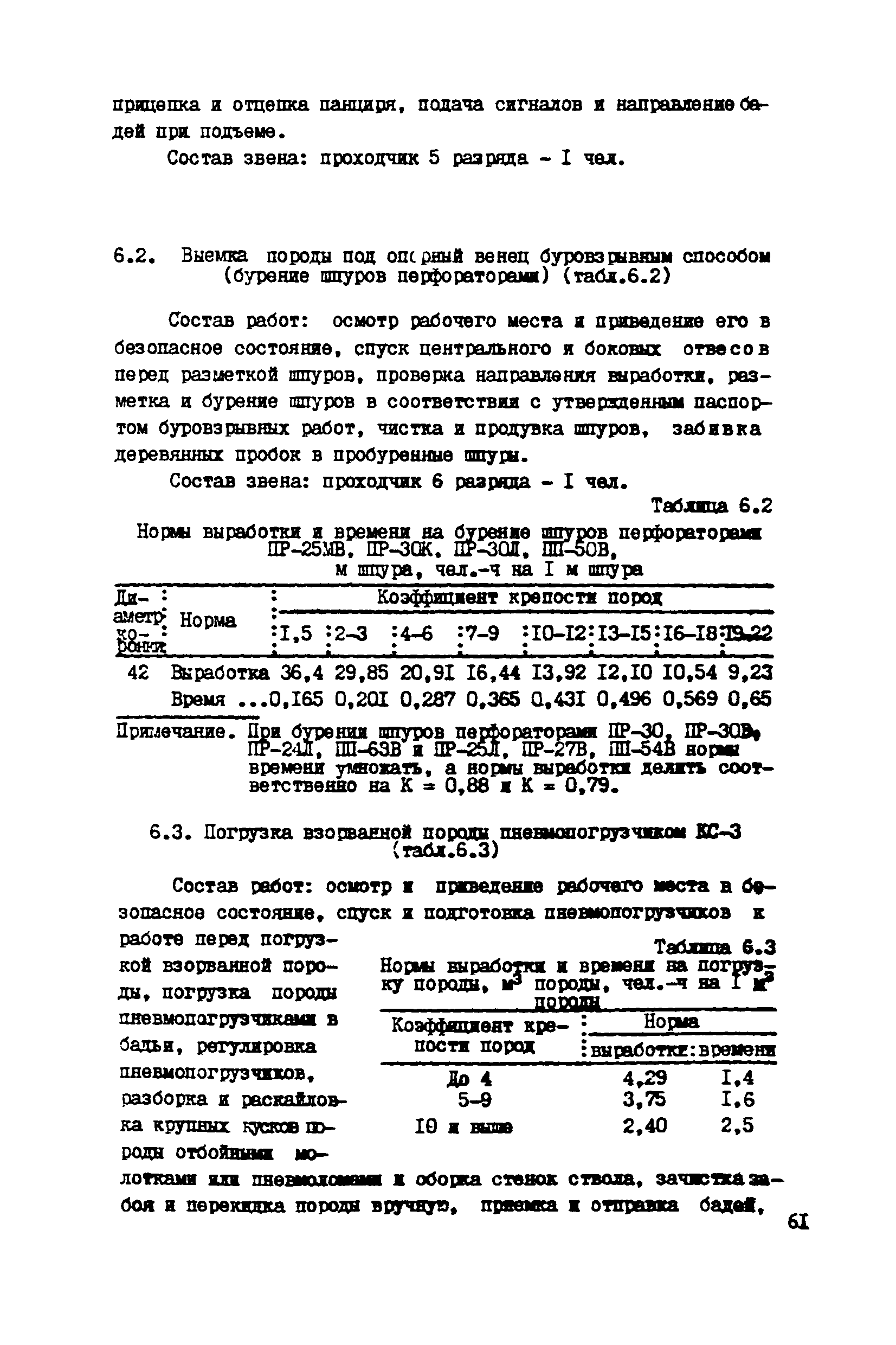 | Оглавление: | Общая часть Раздел 1. Проходка, крепление и армирование вертикальных стволов шахт; проведение сопряжений стволов с околоствольными дворами Глава 1. Проходка вертикальных стволов шахт 1.1 Проходка вертикальных стволов обычном способом 1.2 Проходка вертикальных стволов по замороженным породам 1.3 Проходка вертикальных стволов по породам, предварительно закрепленным химическим способом Глава 2. Крепление вертикальных стволов шахт бетоном 2.1 Временное крепление стволов металлическими кольцами 2.2 Крепление стволов круглого сечения бетоном и железобетоном 2.3 Крепление вертикальных стволов тюбингами 2.4 Крепление вертикальных стволов анкерной крепью 2.5 Установка и снятие деревянной опалубки заводного тюбингового кольца в конце заходки 2.6 Снятие первого тюбингового кольца 2.7 Сбивка кромки бетона на контакте заходки 2.8 Установка опорного венца из чугунных тюбингов 2.9 Укладка холодного бетона за опалубку при спуске его по трубам 2.10 Крепление стволов торкрет—бетоном Глава 3. Гидроизоляционные работы 3.1 Гидроизоляция тюбинговой крепи 3.2 Расчеканка свинцовых прокладок в тюбинговых швах и чеканка тюбинговых швов свинцовым шнуром 3.3 Очистка чугунной тюбинговой крепи после проходки и крепления ствола 3.4 Пикотаж горизонтального шва между двумя звеньями тюбинговой крепи ствола 3.5 Гидроизоляция чугунной тюбинговой крепи тампонажным раствором при поступлении его по трубам самотеком с поверхности 3.6 Первичное нагнетание за крепь шахтного ствола 3.7 Контрольное в нагнетание за крепь шахтного ствола 3.8 Контрольное подтягивание и замена болтов в тюбинговой отделке шахтного ствола 3.9 Установка и замена пробок в отверстиях тюбингов 3.10 Изоляция стыков тюбинговой крепи шахтного ствола 3.11 Штукатурка бетонной поверхности под изоляцию и по изоляции 3.12 Оклеечная изоляция стенок шахтного ствола 3.13 Устройство пикотажных манжет при крепления вертикальных стволов шахт железобетонными тюбингами 3.14 Бурение шпуров в бетоне Глава 4. Армирование стволов 4.1 Долбление лунок под расстрелы 4.2 Установка и заделка металлических расстрелов в готовые лунки 4.3 Сболчивание стальных расстрелов 4.4 Установка проводников 4.5 Оборудование лестничных отделений в стволах шахт 4.6 Устройство и разборка настилов по расстрелам 4.7 Установка рудничных станков на сопряжение с околоствольным двором 4.8 Монтаж компенсационных балок из спец профиля в стволе 4.9 Монтаж и демонтаж постоянных трубопроводов Глава 5. Вспомогательные работы при проходке и креплении стволов шахт 5.1 Устройство, разборка и переноска рабочего полка 5.2 Устройство деревянного временного переносного полка в стволе 5.3 Монтаж одноэтажных и двухэтажных подвесных металлических полков в стволах натяжных рам и предохранительных полков Глава 6. Устройство в стволах круглого сечения бетонного опорного венца (башмака) Глава 7. Проведение сопряжений вертикальных стволов с околоствольными дворами Раздел II. Проходка и крепление наклонных стволов Глава 1. Проходка наклонных стволов Глава 2. Крепление наклонных стволов Глава 3. Гидроизоляционные работы Глава 4. Вспомогательные работы при проходке и креплении вертикальных и наклонных стволов с применением специальных способов Раздел III. Проходка и крепление горизонтальных, наклонных и восстающих горных выработок Глава 1. Буровые работы Глава 2. Д