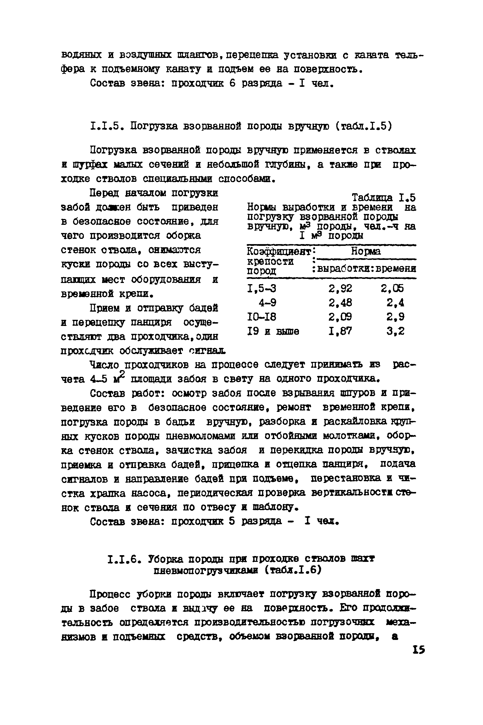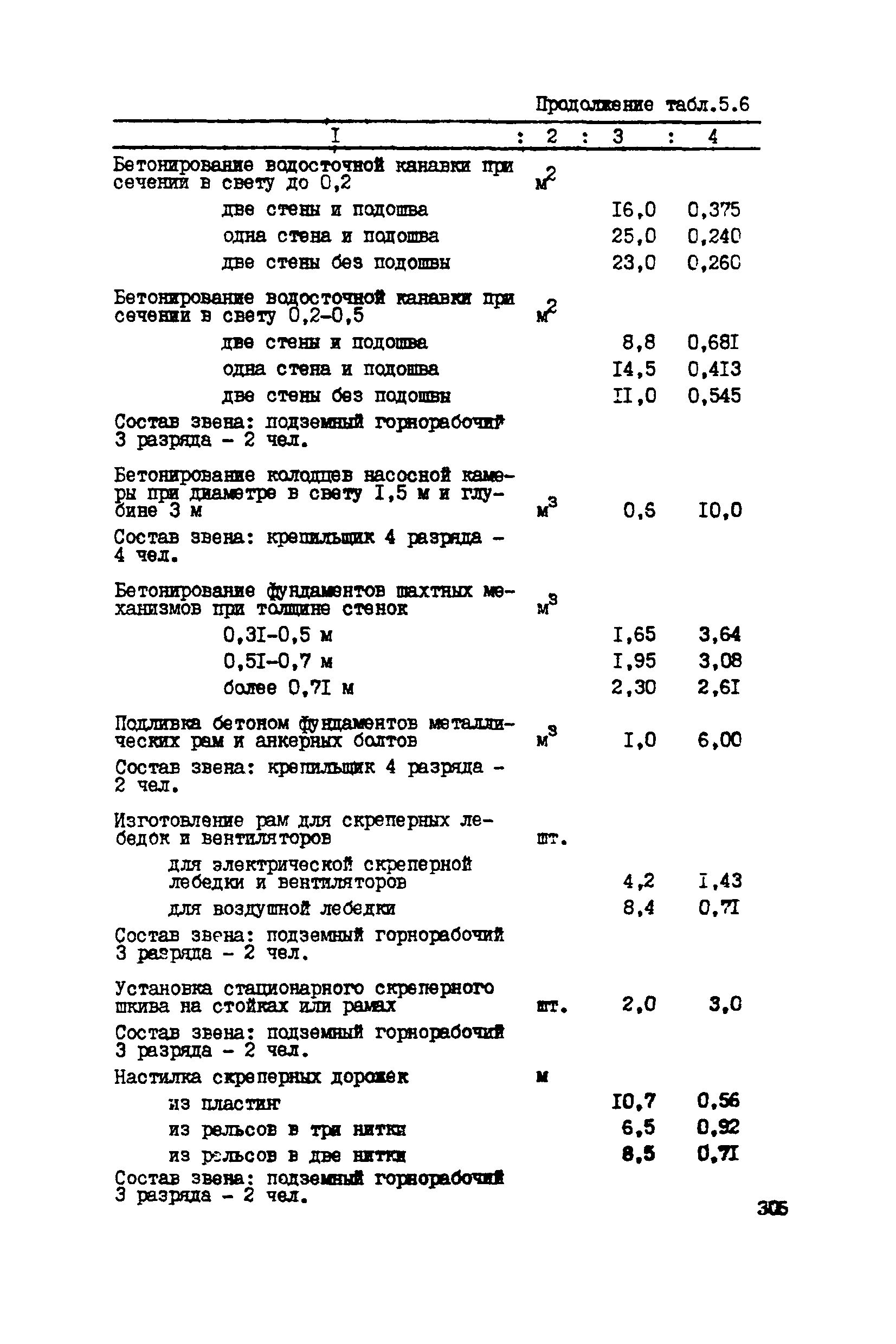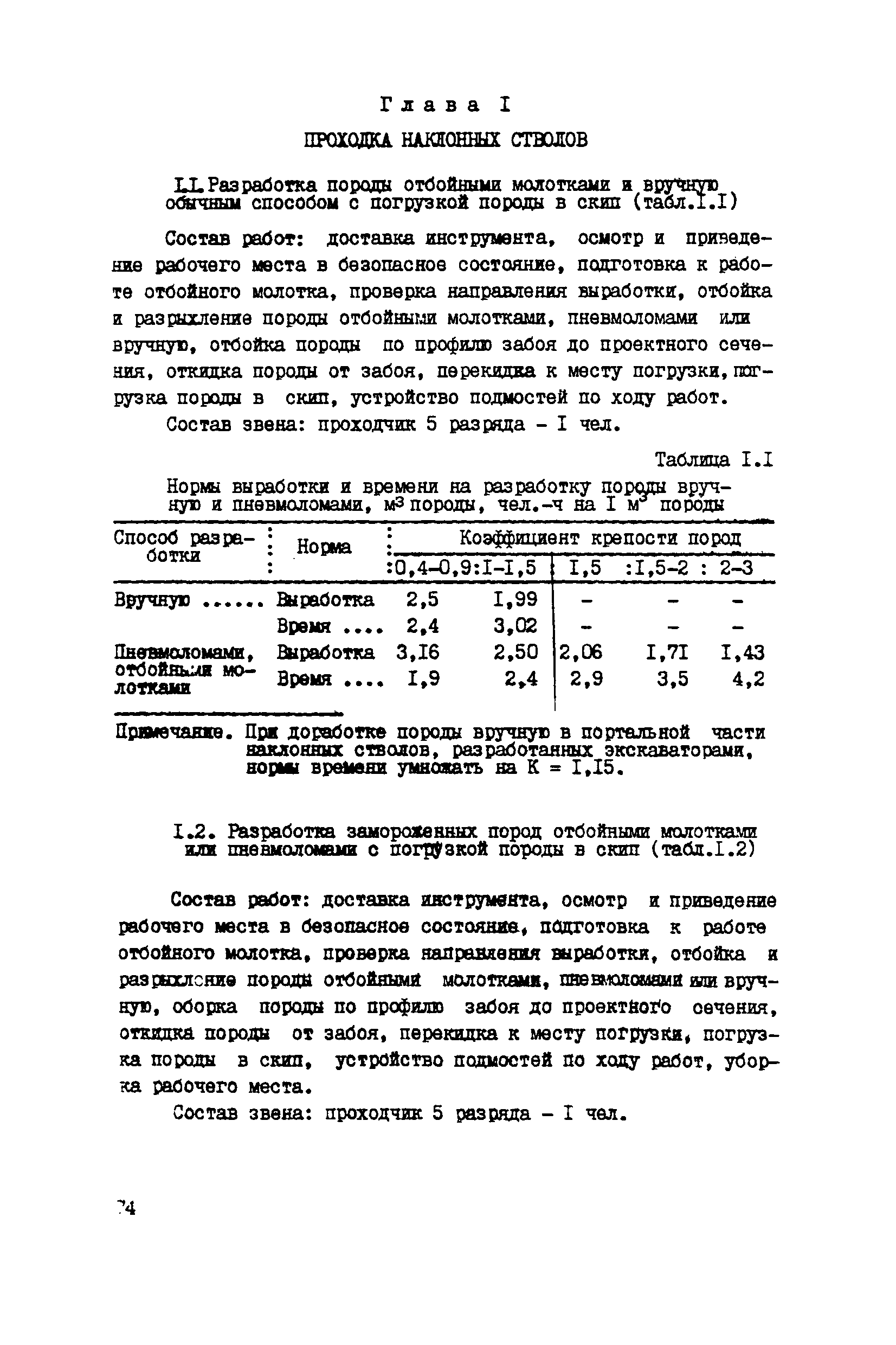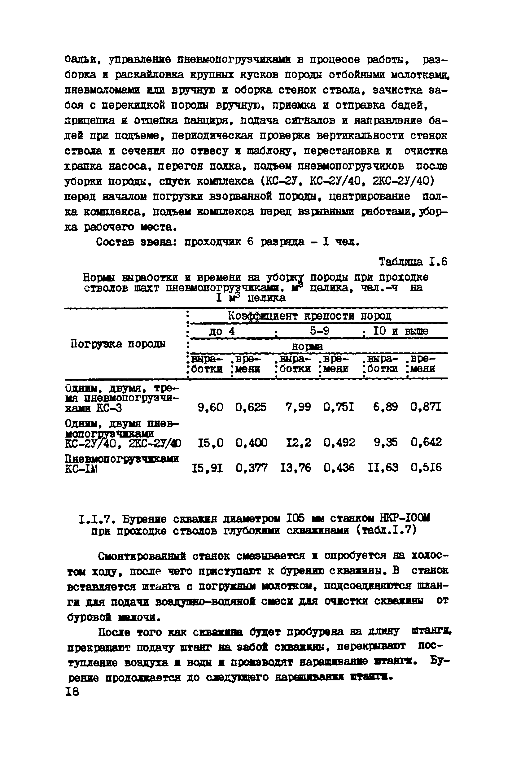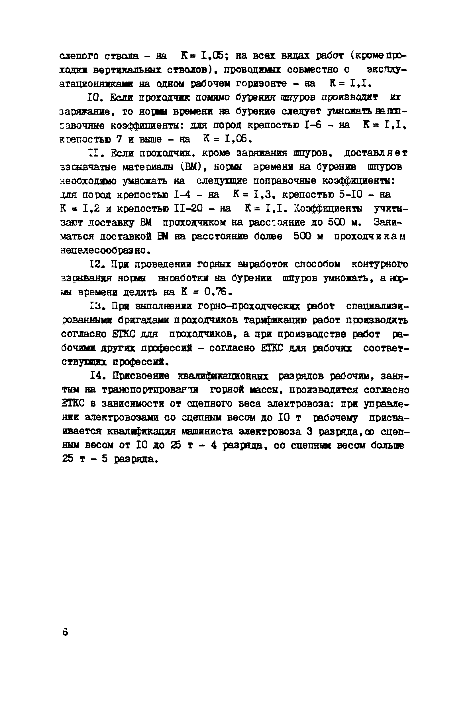 | Оглавление: | Общая часть Раздел 1. Проходка, крепление и армирование вертикальных стволов шахт; проведение сопряжений стволов с околоствольными дворами Глава 1. Проходка вертикальных стволов шахт 1.1 Проходка вертикальных стволов обычном способом 1.2 Проходка вертикальных стволов по замороженным породам 1.3 Проходка вертикальных стволов по породам, предварительно закрепленным химическим способом Глава 2. Крепление вертикальных стволов шахт бетоном 2.1 Временное крепление стволов металлическими кольцами 2.2 Крепление стволов круглого сечения бетоном и железобетоном 2.3 Крепление вертикальных стволов тюбингами 2.4 Крепление вертикальных стволов анкерной крепью 2.5 Установка и снятие деревянной опалубки заводного тюбингового кольца в конце заходки 2.6 Снятие первого тюбингового кольца 2.7 Сбивка кромки бетона на контакте заходки 2.8 Установка опорного венца из чугунных тюбингов 2.9 Укладка холодного бетона за опалубку при спуске его по трубам 2.10 Крепление стволов торкрет—бетоном Глава 3. Гидроизоляционные работы 3.1 Гидроизоляция тюбинговой крепи 3.2 Расчеканка свинцовых прокладок в тюбинговых швах и чеканка тюбинговых швов свинцовым шнуром 3.3 Очистка чугунной тюбинговой крепи после проходки и крепления ствола 3.4 Пикотаж горизонтального шва между двумя звеньями тюбинговой крепи ствола 3.5 Гидроизоляция чугунной тюбинговой крепи тампонажным раствором при поступлении его по трубам самотеком с поверхности 3.6 Первичное нагнетание за крепь шахтного ствола 3.7 Контрольное в нагнетание за крепь шахтного ствола 3.8 Контрольное подтягивание и замена болтов в тюбинговой отделке шахтного ствола 3.9 Установка и замена пробок в отверстиях тюбингов 3.10 Изоляция стыков тюбинговой крепи шахтного ствола 3.11 Штукатурка бетонной поверхности под изоляцию и по изоляции 3.12 Оклеечная изоляция стенок шахтного ствола 3.13 Устройство пикотажных манжет при крепления вертикальных стволов шахт железобетонными тюбингами 3.14 Бурение шпуров в бетоне Глава 4. Армирование стволов 4.1 Долбление лунок под расстрелы 4.2 Установка и заделка металлических расстрелов в готовые лунки 4.3 Сболчивание стальных расстрелов 4.4 Установка проводников 4.5 Оборудование лестничных отделений в стволах шахт 4.6 Устройство и разборка настилов по расстрелам 4.7 Установка рудничных станков на сопряжение с околоствольным двором 4.8 Монтаж компенсационных балок из спец профиля в стволе 4.9 Монтаж и демонтаж постоянных трубопроводов Глава 5. Вспомогательные работы при проходке и креплении стволов шахт 5.1 Устройство, разборка и переноска рабочего полка 5.2 Устройство деревянного временного переносного полка в стволе 5.3 Монтаж одноэтажных и двухэтажных подвесных металлических полков в стволах натяжных рам и предохранительных полков Глава 6. Устройство в стволах круглого сечения бетонного опорного венца (башмака) Глава 7. Проведение сопряжений вертикальных стволов с околоствольными дворами Раздел II. Проходка и крепление наклонных стволов Глава 1. Проходка наклонных стволов Глава 2. Крепление наклонных стволов Глава 3. Гидроизоляционные работы Глава 4. Вспомогательные работы при проходке и креплении вертикальных и наклонных стволов с применением специальных способов Раздел III. Проходка и крепление горизонтальных, наклонных и восстающих горных выработок Глава 1. Буровые работы Глава 2. Д