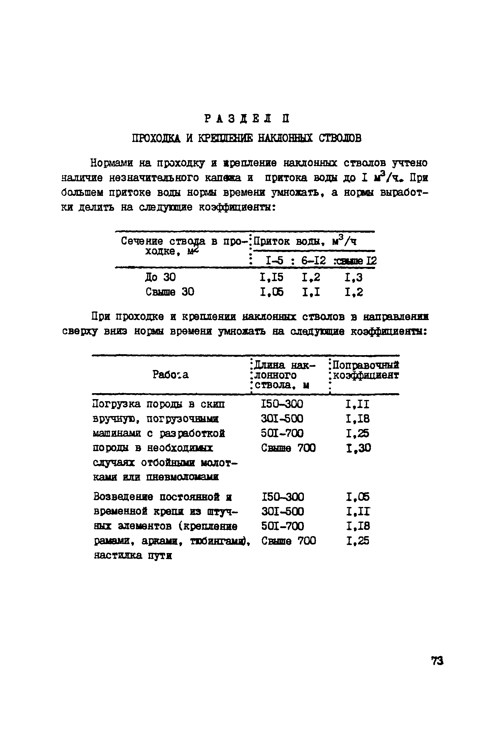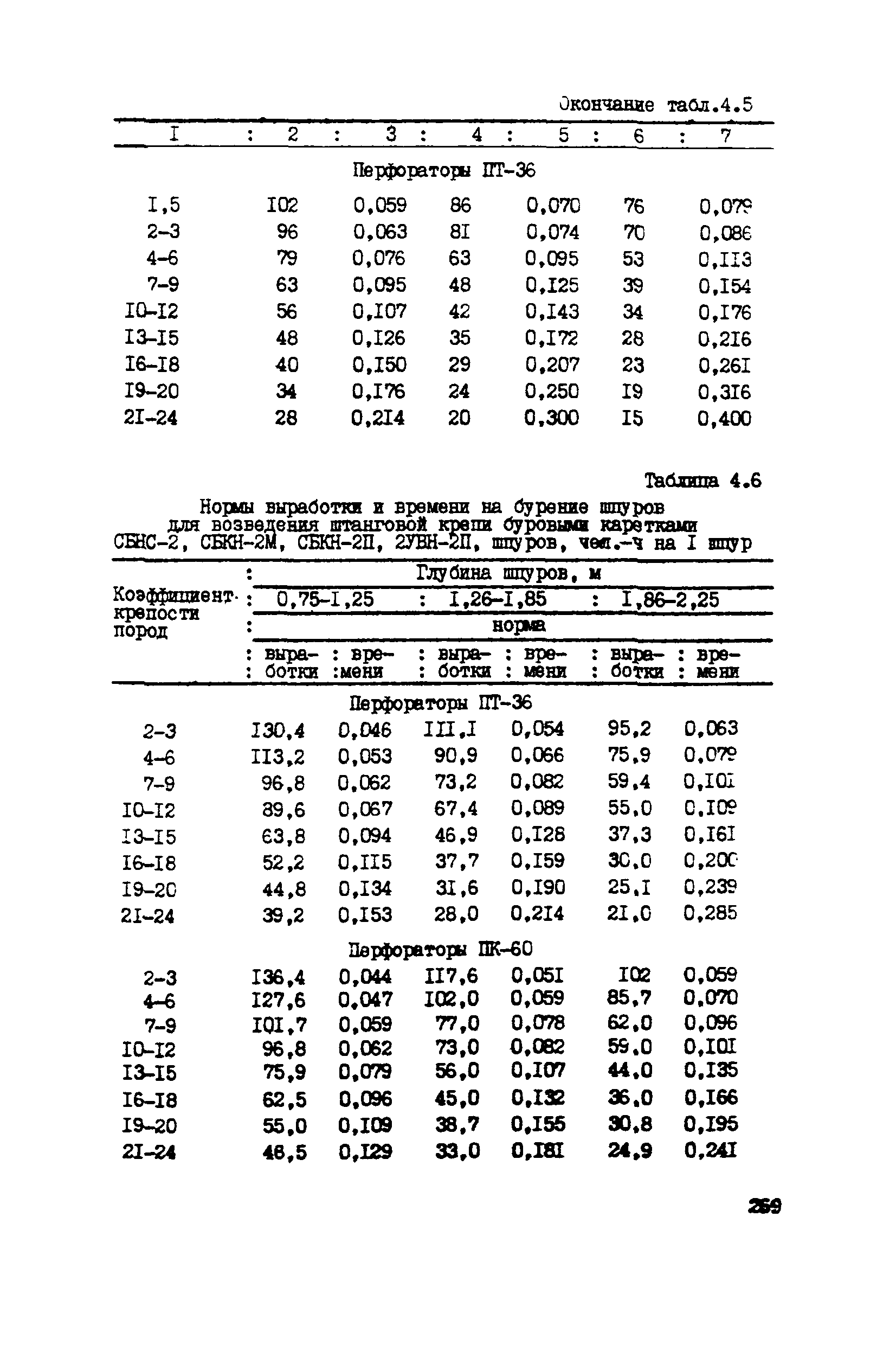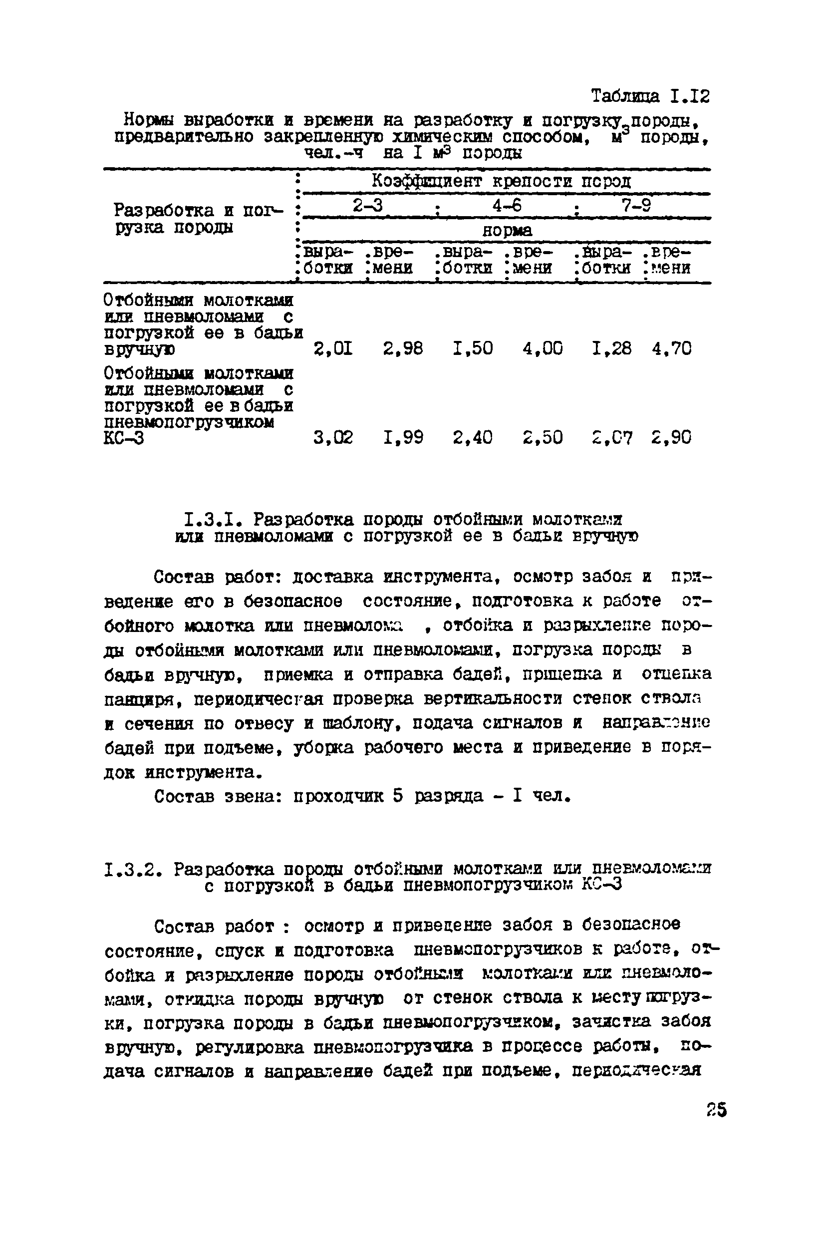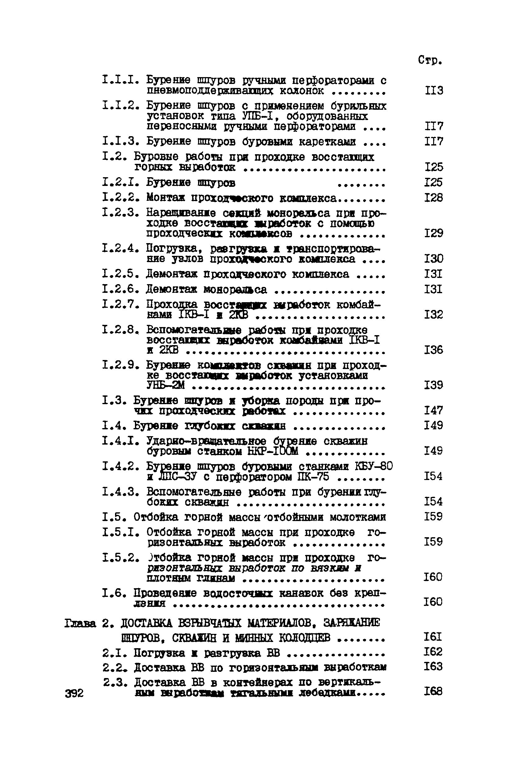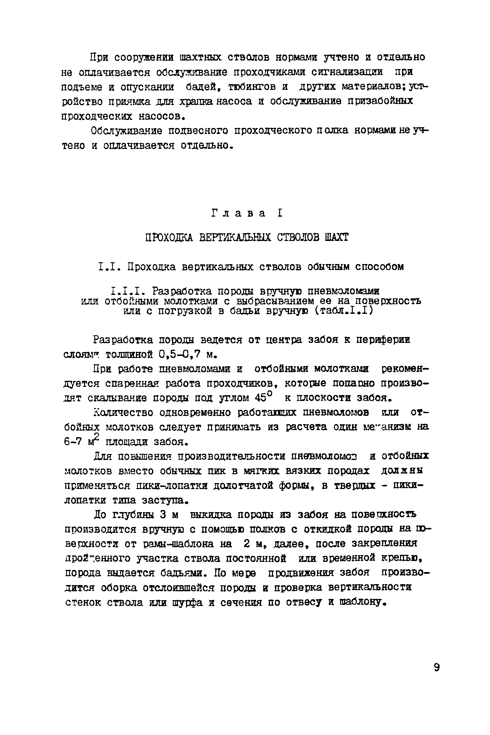 | Оглавление: | Общая часть Раздел 1. Проходка, крепление и армирование вертикальных стволов шахт; проведение сопряжений стволов с околоствольными дворами Глава 1. Проходка вертикальных стволов шахт 1.1 Проходка вертикальных стволов обычном способом 1.2 Проходка вертикальных стволов по замороженным породам 1.3 Проходка вертикальных стволов по породам, предварительно закрепленным химическим способом Глава 2. Крепление вертикальных стволов шахт бетоном 2.1 Временное крепление стволов металлическими кольцами 2.2 Крепление стволов круглого сечения бетоном и железобетоном 2.3 Крепление вертикальных стволов тюбингами 2.4 Крепление вертикальных стволов анкерной крепью 2.5 Установка и снятие деревянной опалубки заводного тюбингового кольца в конце заходки 2.6 Снятие первого тюбингового кольца 2.7 Сбивка кромки бетона на контакте заходки 2.8 Установка опорного венца из чугунных тюбингов 2.9 Укладка холодного бетона за опалубку при спуске его по трубам 2.10 Крепление стволов торкрет—бетоном Глава 3. Гидроизоляционные работы 3.1 Гидроизоляция тюбинговой крепи 3.2 Расчеканка свинцовых прокладок в тюбинговых швах и чеканка тюбинговых швов свинцовым шнуром 3.3 Очистка чугунной тюбинговой крепи после проходки и крепления ствола 3.4 Пикотаж горизонтального шва между двумя звеньями тюбинговой крепи ствола 3.5 Гидроизоляция чугунной тюбинговой крепи тампонажным раствором при поступлении его по трубам самотеком с поверхности 3.6 Первичное нагнетание за крепь шахтного ствола 3.7 Контрольное в нагнетание за крепь шахтного ствола 3.8 Контрольное подтягивание и замена болтов в тюбинговой отделке шахтного ствола 3.9 Установка и замена пробок в отверстиях тюбингов 3.10 Изоляция стыков тюбинговой крепи шахтного ствола 3.11 Штукатурка бетонной поверхности под изоляцию и по изоляции 3.12 Оклеечная изоляция стенок шахтного ствола 3.13 Устройство пикотажных манжет при крепления вертикальных стволов шахт железобетонными тюбингами 3.14 Бурение шпуров в бетоне Глава 4. Армирование стволов 4.1 Долбление лунок под расстрелы 4.2 Установка и заделка металлических расстрелов в готовые лунки 4.3 Сболчивание стальных расстрелов 4.4 Установка проводников 4.5 Оборудование лестничных отделений в стволах шахт 4.6 Устройство и разборка настилов по расстрелам 4.7 Установка рудничных станков на сопряжение с околоствольным двором 4.8 Монтаж компенсационных балок из спец профиля в стволе 4.9 Монтаж и демонтаж постоянных трубопроводов Глава 5. Вспомогательные работы при проходке и креплении стволов шахт 5.1 Устройство, разборка и переноска рабочего полка 5.2 Устройство деревянного временного переносного полка в стволе 5.3 Монтаж одноэтажных и двухэтажных подвесных металлических полков в стволах натяжных рам и предохранительных полков Глава 6. Устройство в стволах круглого сечения бетонного опорного венца (башмака) Глава 7. Проведение сопряжений вертикальных стволов с околоствольными дворами Раздел II. Проходка и крепление наклонных стволов Глава 1. Проходка наклонных стволов Глава 2. Крепление наклонных стволов Глава 3. Гидроизоляционные работы Глава 4. Вспомогательные работы при проходке и креплении вертикальных и наклонных стволов с применением специальных способов Раздел III. Проходка и крепление горизонтальных, наклонных и восстающих горных выработок Глава 1. Буровые работы Глава 2. Д