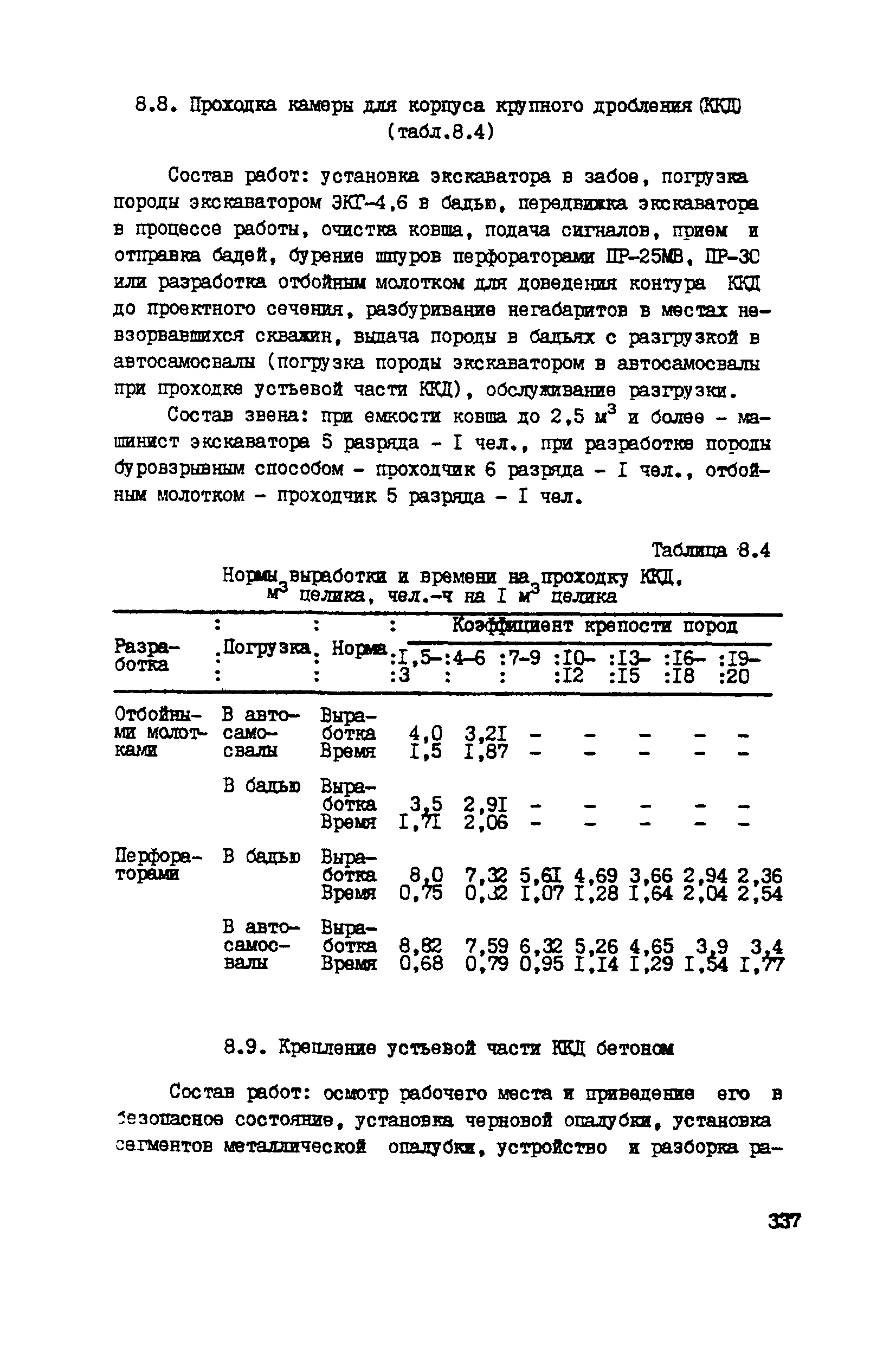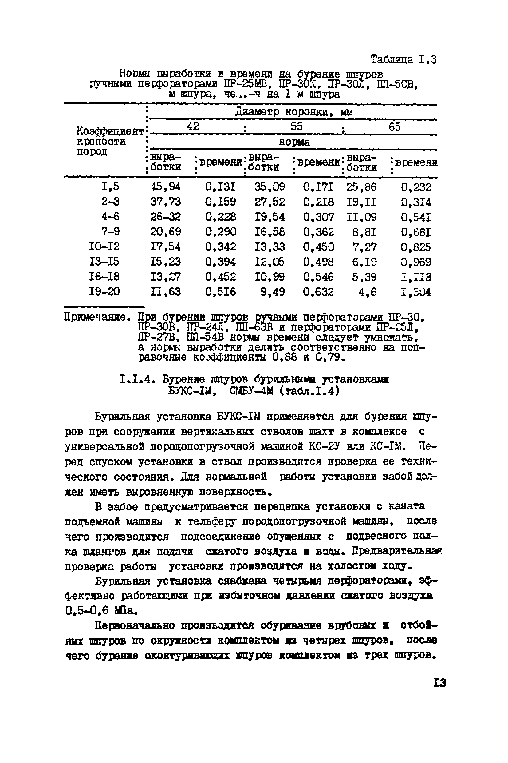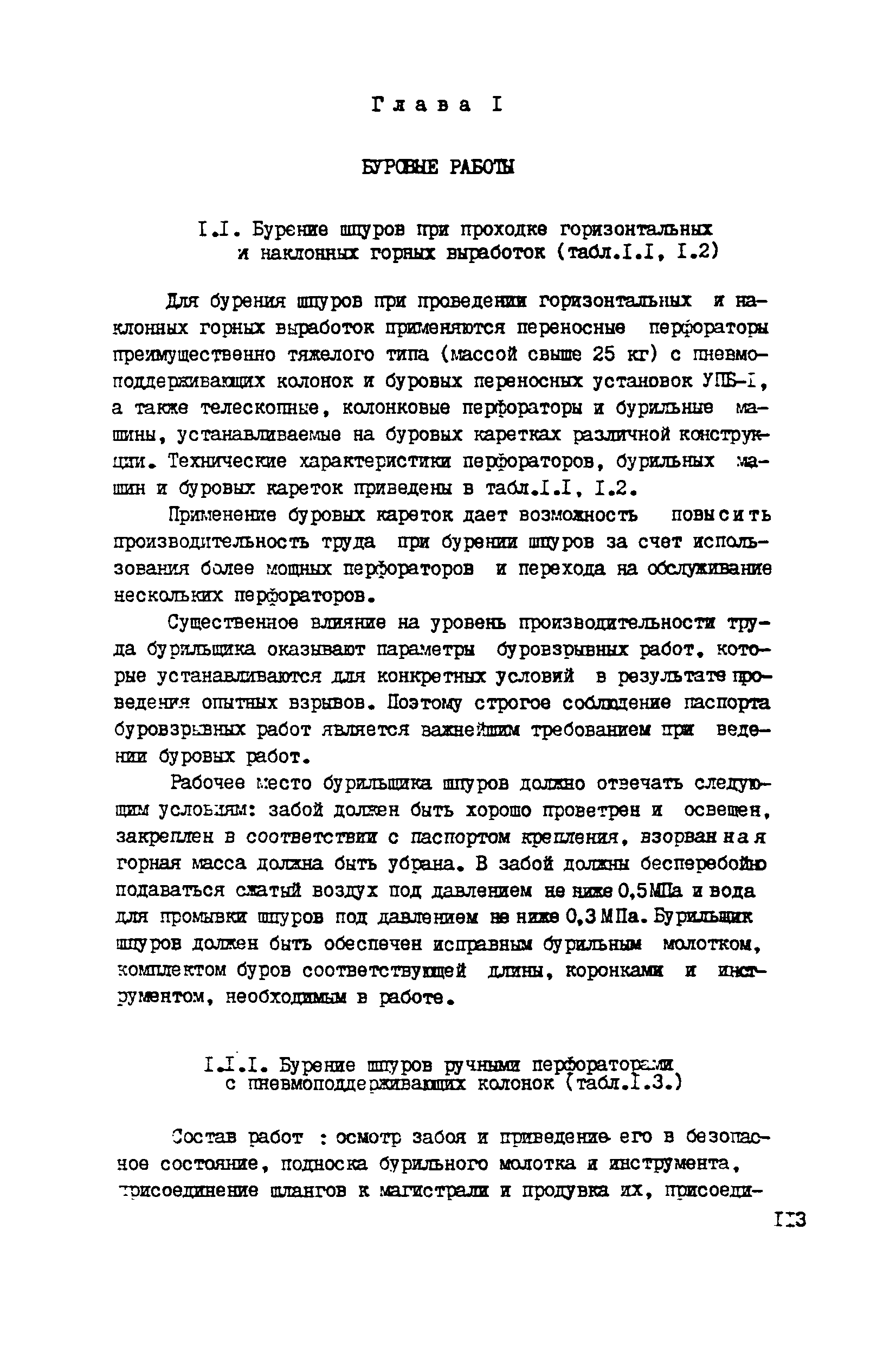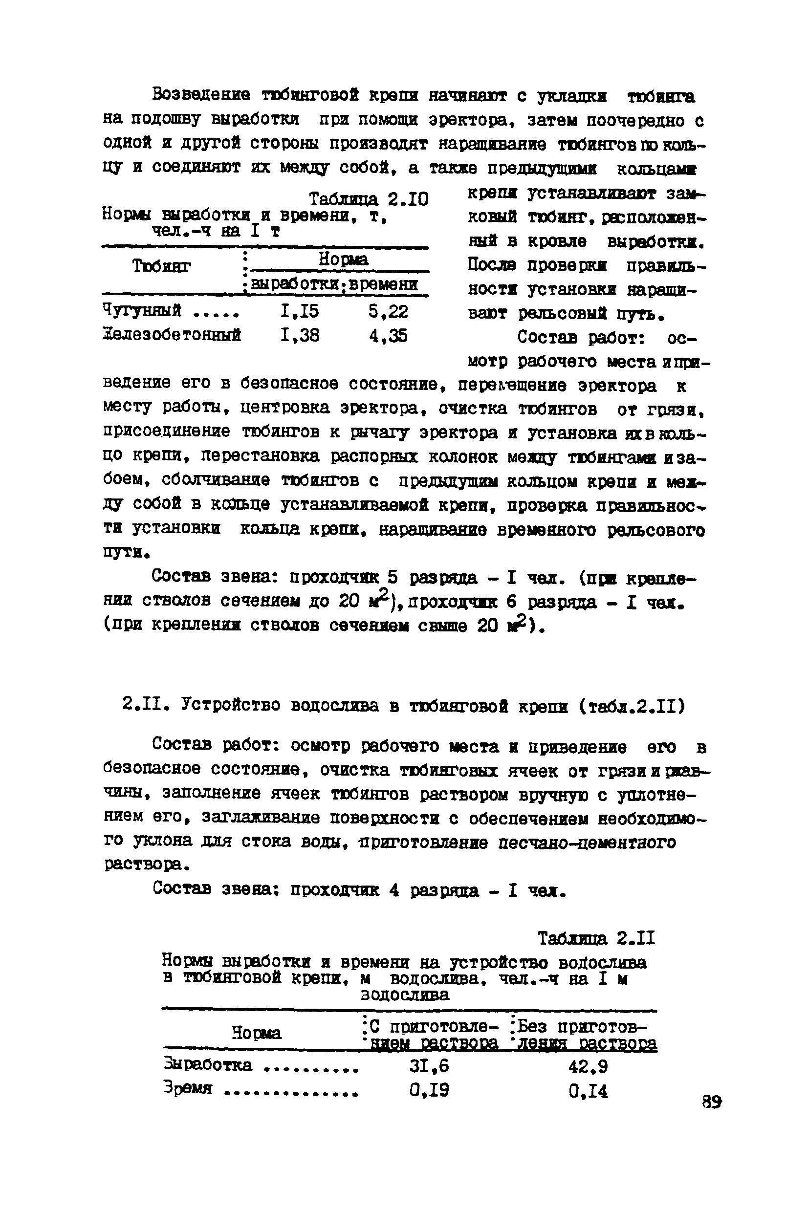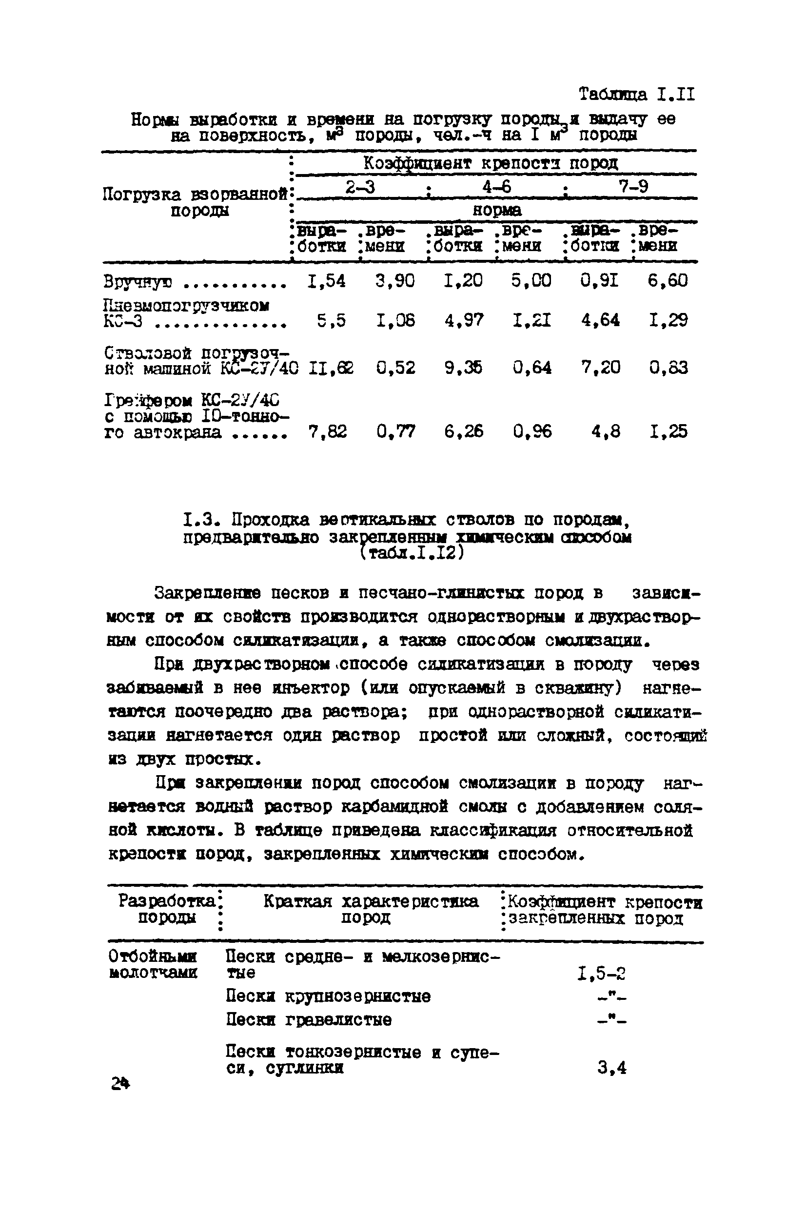 | Оглавление: | Общая часть Раздел 1. Проходка, крепление и армирование вертикальных стволов шахт; проведение сопряжений стволов с околоствольными дворами Глава 1. Проходка вертикальных стволов шахт 1.1 Проходка вертикальных стволов обычном способом 1.2 Проходка вертикальных стволов по замороженным породам 1.3 Проходка вертикальных стволов по породам, предварительно закрепленным химическим способом Глава 2. Крепление вертикальных стволов шахт бетоном 2.1 Временное крепление стволов металлическими кольцами 2.2 Крепление стволов круглого сечения бетоном и железобетоном 2.3 Крепление вертикальных стволов тюбингами 2.4 Крепление вертикальных стволов анкерной крепью 2.5 Установка и снятие деревянной опалубки заводного тюбингового кольца в конце заходки 2.6 Снятие первого тюбингового кольца 2.7 Сбивка кромки бетона на контакте заходки 2.8 Установка опорного венца из чугунных тюбингов 2.9 Укладка холодного бетона за опалубку при спуске его по трубам 2.10 Крепление стволов торкрет—бетоном Глава 3. Гидроизоляционные работы 3.1 Гидроизоляция тюбинговой крепи 3.2 Расчеканка свинцовых прокладок в тюбинговых швах и чеканка тюбинговых швов свинцовым шнуром 3.3 Очистка чугунной тюбинговой крепи после проходки и крепления ствола 3.4 Пикотаж горизонтального шва между двумя звеньями тюбинговой крепи ствола 3.5 Гидроизоляция чугунной тюбинговой крепи тампонажным раствором при поступлении его по трубам самотеком с поверхности 3.6 Первичное нагнетание за крепь шахтного ствола 3.7 Контрольное в нагнетание за крепь шахтного ствола 3.8 Контрольное подтягивание и замена болтов в тюбинговой отделке шахтного ствола 3.9 Установка и замена пробок в отверстиях тюбингов 3.10 Изоляция стыков тюбинговой крепи шахтного ствола 3.11 Штукатурка бетонной поверхности под изоляцию и по изоляции 3.12 Оклеечная изоляция стенок шахтного ствола 3.13 Устройство пикотажных манжет при крепления вертикальных стволов шахт железобетонными тюбингами 3.14 Бурение шпуров в бетоне Глава 4. Армирование стволов 4.1 Долбление лунок под расстрелы 4.2 Установка и заделка металлических расстрелов в готовые лунки 4.3 Сболчивание стальных расстрелов 4.4 Установка проводников 4.5 Оборудование лестничных отделений в стволах шахт 4.6 Устройство и разборка настилов по расстрелам 4.7 Установка рудничных станков на сопряжение с околоствольным двором 4.8 Монтаж компенсационных балок из спец профиля в стволе 4.9 Монтаж и демонтаж постоянных трубопроводов Глава 5. Вспомогательные работы при проходке и креплении стволов шахт 5.1 Устройство, разборка и переноска рабочего полка 5.2 Устройство деревянного временного переносного полка в стволе 5.3 Монтаж одноэтажных и двухэтажных подвесных металлических полков в стволах натяжных рам и предохранительных полков Глава 6. Устройство в стволах круглого сечения бетонного опорного венца (башмака) Глава 7. Проведение сопряжений вертикальных стволов с околоствольными дворами Раздел II. Проходка и крепление наклонных стволов Глава 1. Проходка наклонных стволов Глава 2. Крепление наклонных стволов Глава 3. Гидроизоляционные работы Глава 4. Вспомогательные работы при проходке и креплении вертикальных и наклонных стволов с применением специальных способов Раздел III. Проходка и крепление горизонтальных, наклонных и восстающих горных выработок Глава 1. Буровые работы Глава 2. Д