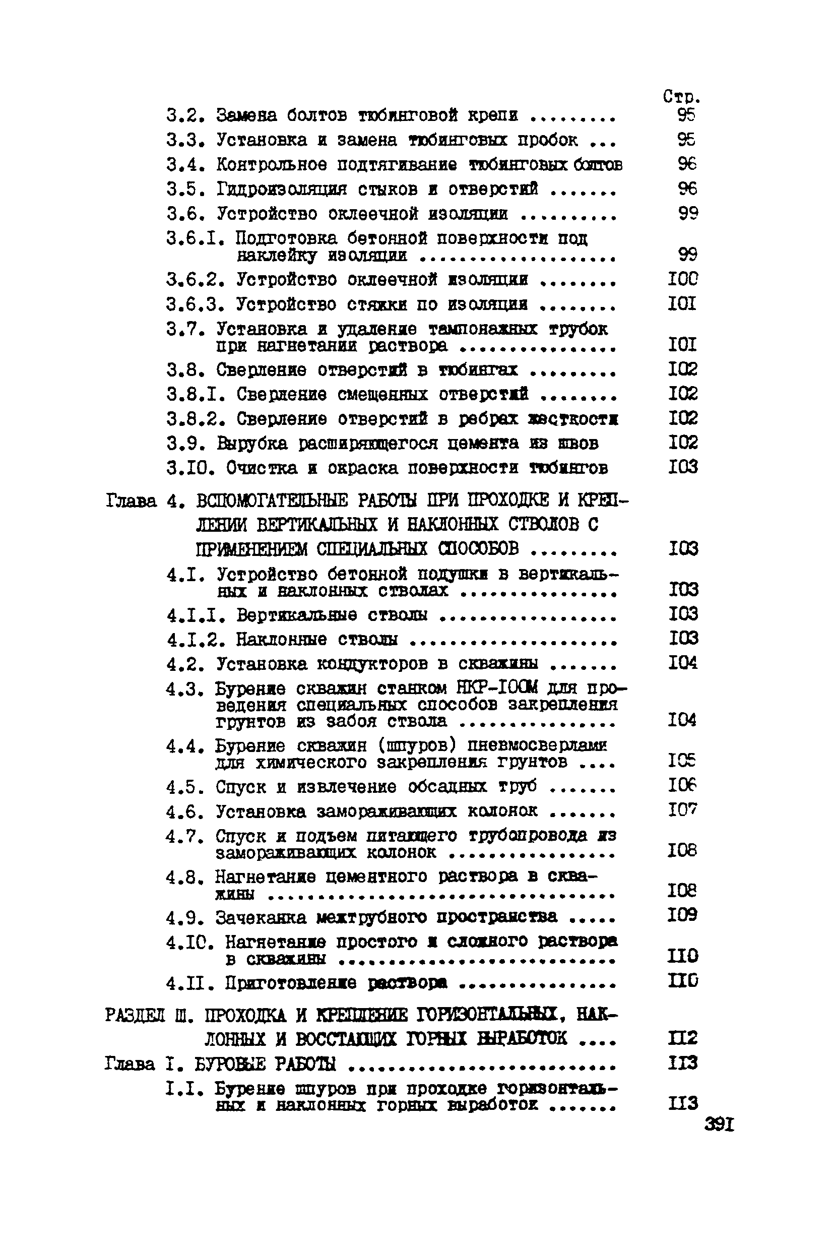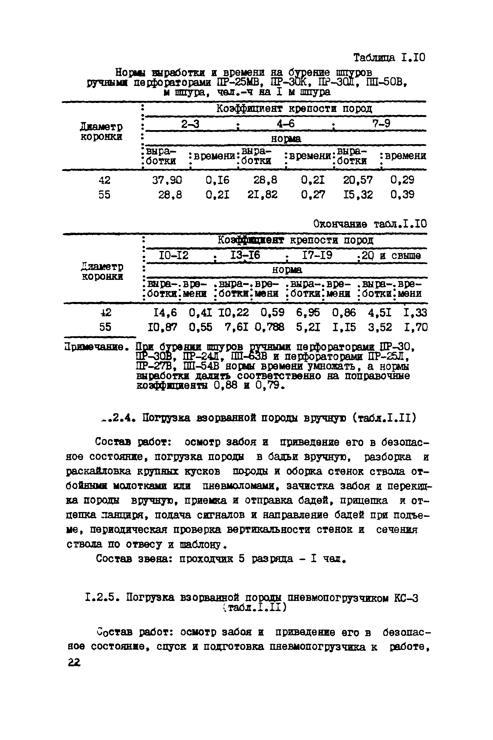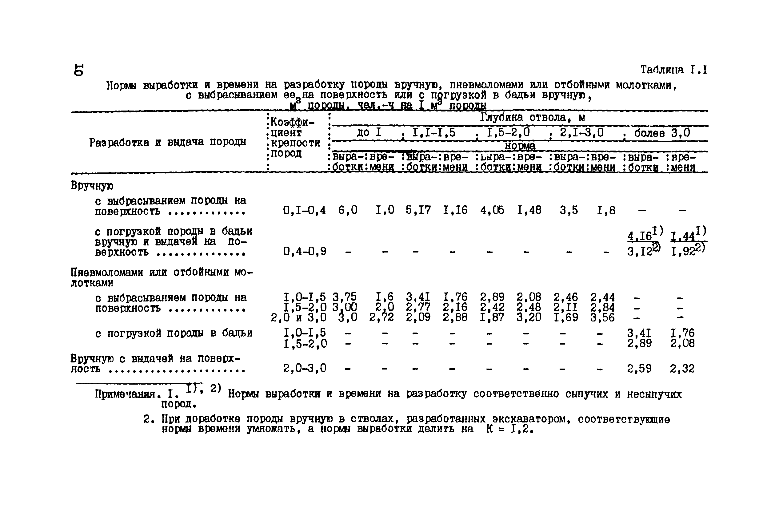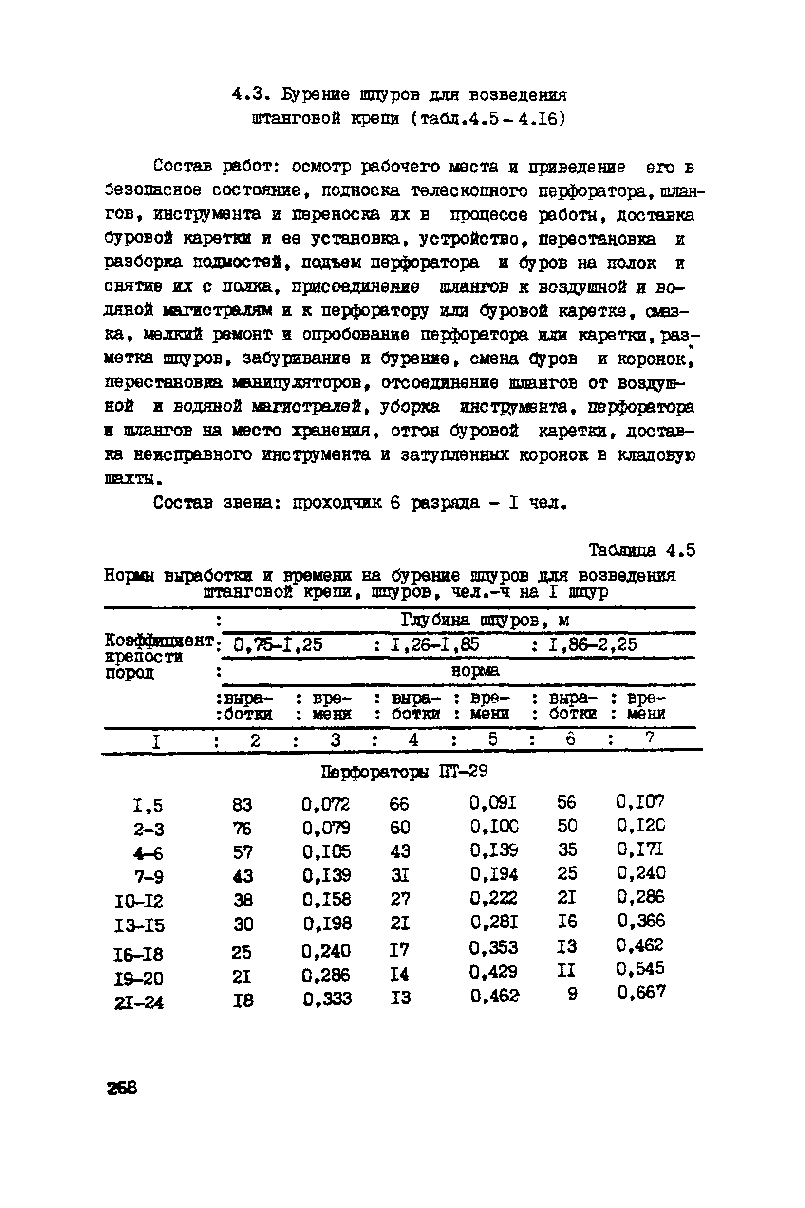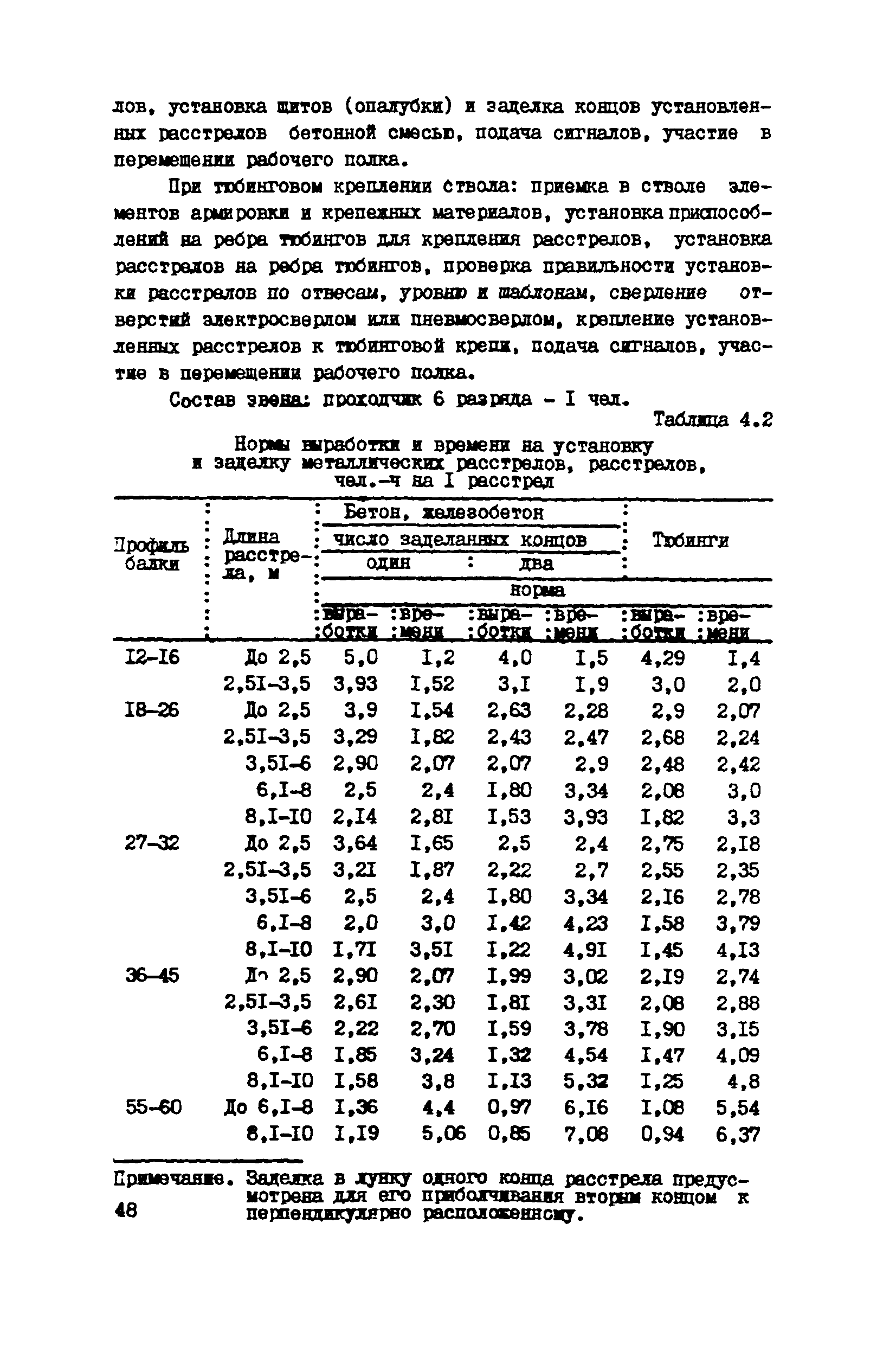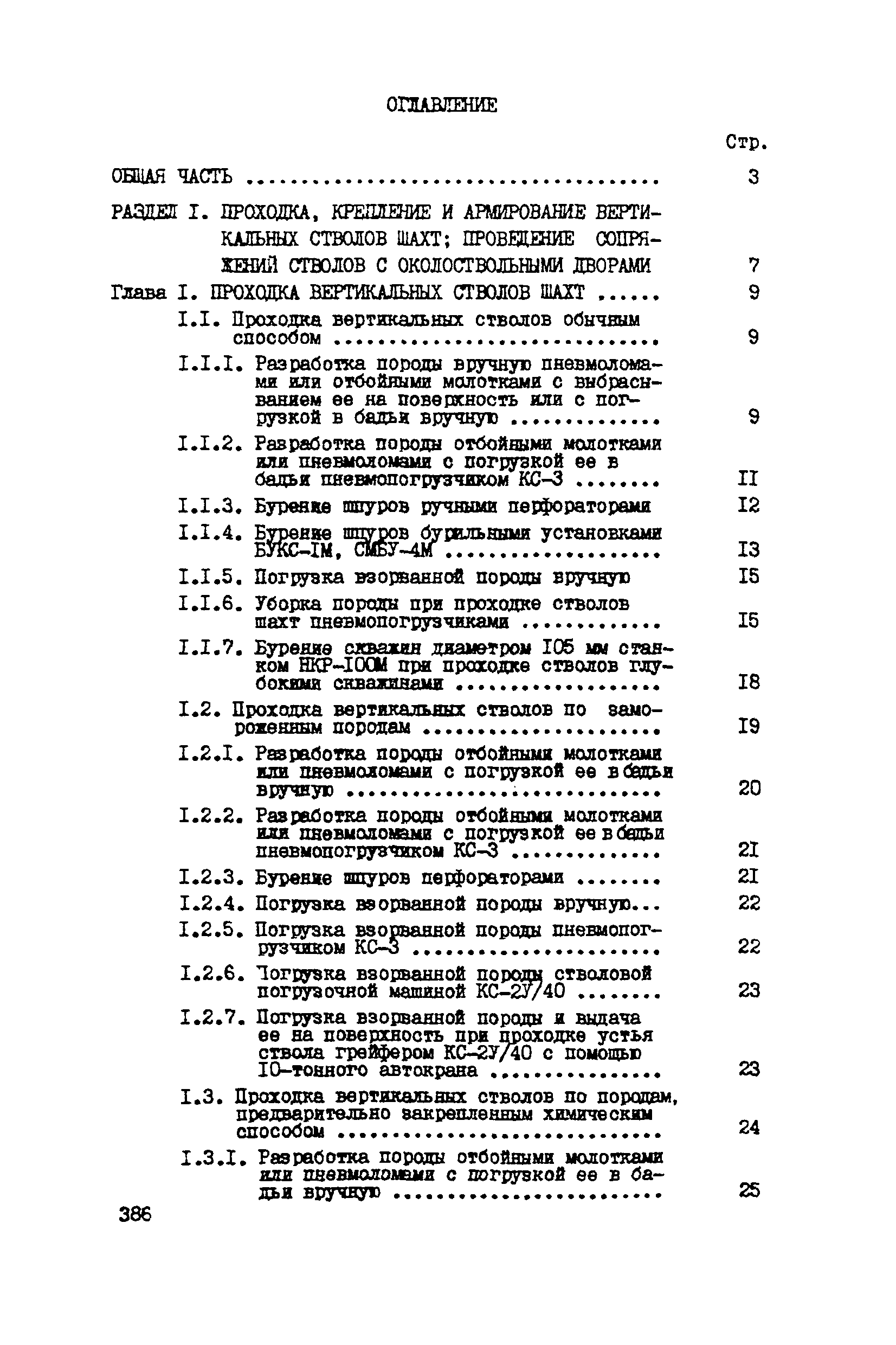 | Оглавление: | Общая часть Раздел 1. Проходка, крепление и армирование вертикальных стволов шахт; проведение сопряжений стволов с околоствольными дворами Глава 1. Проходка вертикальных стволов шахт 1.1 Проходка вертикальных стволов обычном способом 1.2 Проходка вертикальных стволов по замороженным породам 1.3 Проходка вертикальных стволов по породам, предварительно закрепленным химическим способом Глава 2. Крепление вертикальных стволов шахт бетоном 2.1 Временное крепление стволов металлическими кольцами 2.2 Крепление стволов круглого сечения бетоном и железобетоном 2.3 Крепление вертикальных стволов тюбингами 2.4 Крепление вертикальных стволов анкерной крепью 2.5 Установка и снятие деревянной опалубки заводного тюбингового кольца в конце заходки 2.6 Снятие первого тюбингового кольца 2.7 Сбивка кромки бетона на контакте заходки 2.8 Установка опорного венца из чугунных тюбингов 2.9 Укладка холодного бетона за опалубку при спуске его по трубам 2.10 Крепление стволов торкрет—бетоном Глава 3. Гидроизоляционные работы 3.1 Гидроизоляция тюбинговой крепи 3.2 Расчеканка свинцовых прокладок в тюбинговых швах и чеканка тюбинговых швов свинцовым шнуром 3.3 Очистка чугунной тюбинговой крепи после проходки и крепления ствола 3.4 Пикотаж горизонтального шва между двумя звеньями тюбинговой крепи ствола 3.5 Гидроизоляция чугунной тюбинговой крепи тампонажным раствором при поступлении его по трубам самотеком с поверхности 3.6 Первичное нагнетание за крепь шахтного ствола 3.7 Контрольное в нагнетание за крепь шахтного ствола 3.8 Контрольное подтягивание и замена болтов в тюбинговой отделке шахтного ствола 3.9 Установка и замена пробок в отверстиях тюбингов 3.10 Изоляция стыков тюбинговой крепи шахтного ствола 3.11 Штукатурка бетонной поверхности под изоляцию и по изоляции 3.12 Оклеечная изоляция стенок шахтного ствола 3.13 Устройство пикотажных манжет при крепления вертикальных стволов шахт железобетонными тюбингами 3.14 Бурение шпуров в бетоне Глава 4. Армирование стволов 4.1 Долбление лунок под расстрелы 4.2 Установка и заделка металлических расстрелов в готовые лунки 4.3 Сболчивание стальных расстрелов 4.4 Установка проводников 4.5 Оборудование лестничных отделений в стволах шахт 4.6 Устройство и разборка настилов по расстрелам 4.7 Установка рудничных станков на сопряжение с околоствольным двором 4.8 Монтаж компенсационных балок из спец профиля в стволе 4.9 Монтаж и демонтаж постоянных трубопроводов Глава 5. Вспомогательные работы при проходке и креплении стволов шахт 5.1 Устройство, разборка и переноска рабочего полка 5.2 Устройство деревянного временного переносного полка в стволе 5.3 Монтаж одноэтажных и двухэтажных подвесных металлических полков в стволах натяжных рам и предохранительных полков Глава 6. Устройство в стволах круглого сечения бетонного опорного венца (башмака) Глава 7. Проведение сопряжений вертикальных стволов с околоствольными дворами Раздел II. Проходка и крепление наклонных стволов Глава 1. Проходка наклонных стволов Глава 2. Крепление наклонных стволов Глава 3. Гидроизоляционные работы Глава 4. Вспомогательные работы при проходке и креплении вертикальных и наклонных стволов с применением специальных способов Раздел III. Проходка и крепление горизонтальных, наклонных и восстающих горных выработок Глава 1. Буровые работы Глава 2. Д