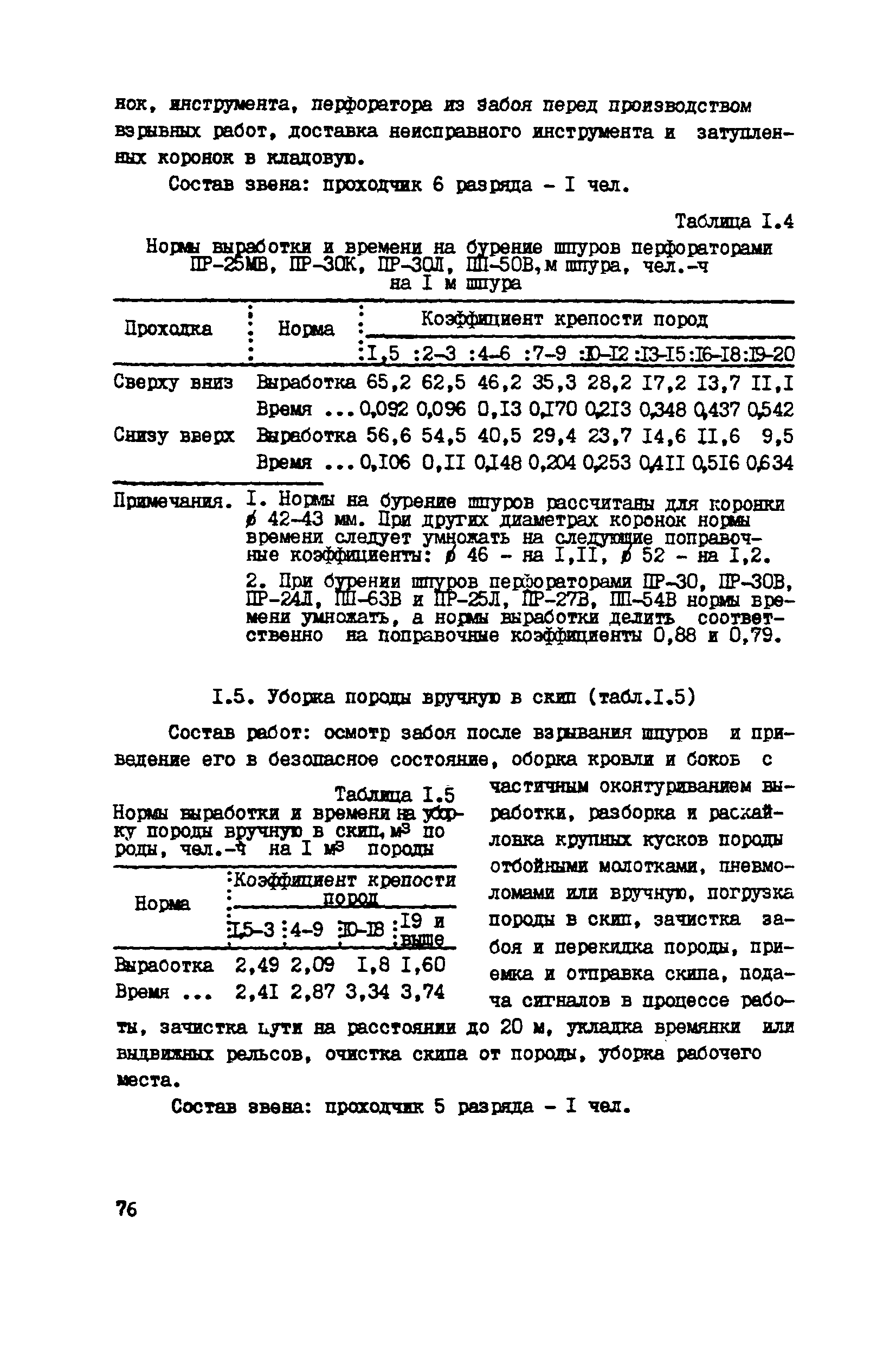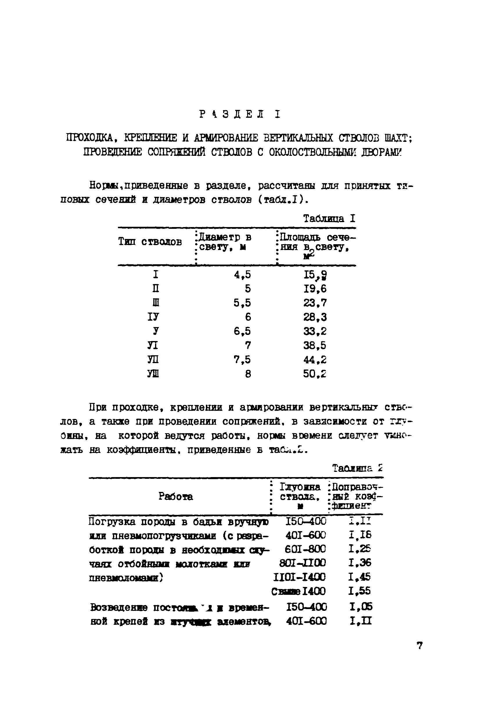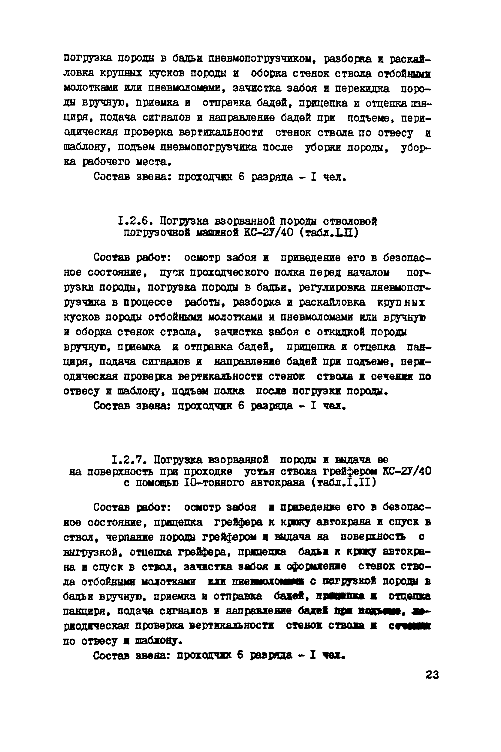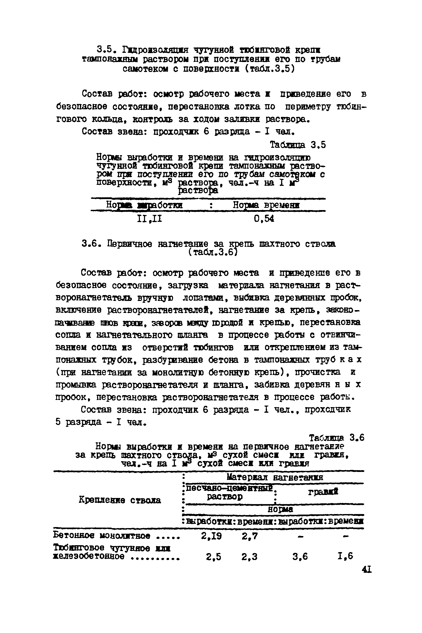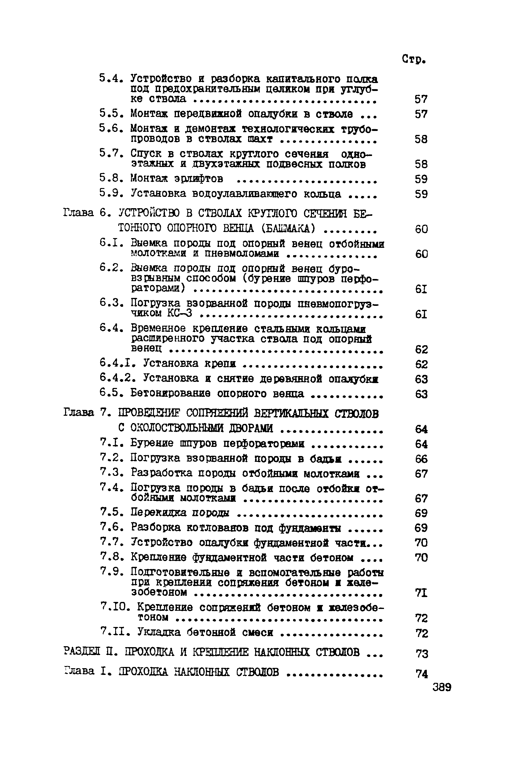 | Оглавление: | Общая часть Раздел 1. Проходка, крепление и армирование вертикальных стволов шахт; проведение сопряжений стволов с околоствольными дворами Глава 1. Проходка вертикальных стволов шахт 1.1 Проходка вертикальных стволов обычном способом 1.2 Проходка вертикальных стволов по замороженным породам 1.3 Проходка вертикальных стволов по породам, предварительно закрепленным химическим способом Глава 2. Крепление вертикальных стволов шахт бетоном 2.1 Временное крепление стволов металлическими кольцами 2.2 Крепление стволов круглого сечения бетоном и железобетоном 2.3 Крепление вертикальных стволов тюбингами 2.4 Крепление вертикальных стволов анкерной крепью 2.5 Установка и снятие деревянной опалубки заводного тюбингового кольца в конце заходки 2.6 Снятие первого тюбингового кольца 2.7 Сбивка кромки бетона на контакте заходки 2.8 Установка опорного венца из чугунных тюбингов 2.9 Укладка холодного бетона за опалубку при спуске его по трубам 2.10 Крепление стволов торкрет—бетоном Глава 3. Гидроизоляционные работы 3.1 Гидроизоляция тюбинговой крепи 3.2 Расчеканка свинцовых прокладок в тюбинговых швах и чеканка тюбинговых швов свинцовым шнуром 3.3 Очистка чугунной тюбинговой крепи после проходки и крепления ствола 3.4 Пикотаж горизонтального шва между двумя звеньями тюбинговой крепи ствола 3.5 Гидроизоляция чугунной тюбинговой крепи тампонажным раствором при поступлении его по трубам самотеком с поверхности 3.6 Первичное нагнетание за крепь шахтного ствола 3.7 Контрольное в нагнетание за крепь шахтного ствола 3.8 Контрольное подтягивание и замена болтов в тюбинговой отделке шахтного ствола 3.9 Установка и замена пробок в отверстиях тюбингов 3.10 Изоляция стыков тюбинговой крепи шахтного ствола 3.11 Штукатурка бетонной поверхности под изоляцию и по изоляции 3.12 Оклеечная изоляция стенок шахтного ствола 3.13 Устройство пикотажных манжет при крепления вертикальных стволов шахт железобетонными тюбингами 3.14 Бурение шпуров в бетоне Глава 4. Армирование стволов 4.1 Долбление лунок под расстрелы 4.2 Установка и заделка металлических расстрелов в готовые лунки 4.3 Сболчивание стальных расстрелов 4.4 Установка проводников 4.5 Оборудование лестничных отделений в стволах шахт 4.6 Устройство и разборка настилов по расстрелам 4.7 Установка рудничных станков на сопряжение с околоствольным двором 4.8 Монтаж компенсационных балок из спец профиля в стволе 4.9 Монтаж и демонтаж постоянных трубопроводов Глава 5. Вспомогательные работы при проходке и креплении стволов шахт 5.1 Устройство, разборка и переноска рабочего полка 5.2 Устройство деревянного временного переносного полка в стволе 5.3 Монтаж одноэтажных и двухэтажных подвесных металлических полков в стволах натяжных рам и предохранительных полков Глава 6. Устройство в стволах круглого сечения бетонного опорного венца (башмака) Глава 7. Проведение сопряжений вертикальных стволов с околоствольными дворами Раздел II. Проходка и крепление наклонных стволов Глава 1. Проходка наклонных стволов Глава 2. Крепление наклонных стволов Глава 3. Гидроизоляционные работы Глава 4. Вспомогательные работы при проходке и креплении вертикальных и наклонных стволов с применением специальных способов Раздел III. Проходка и крепление горизонтальных, наклонных и восстающих горных выработок Глава 1. Буровые работы Глава 2. Д