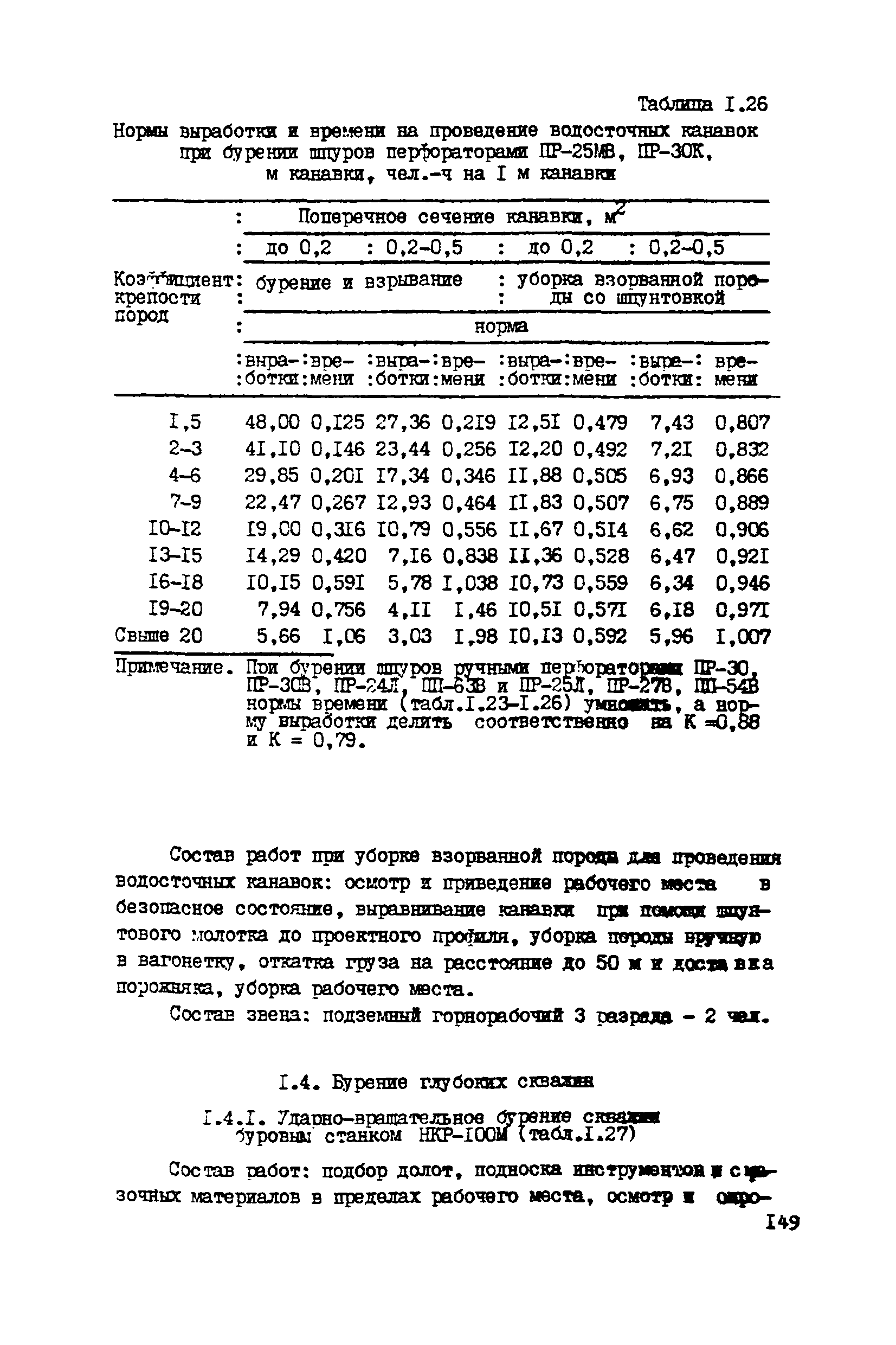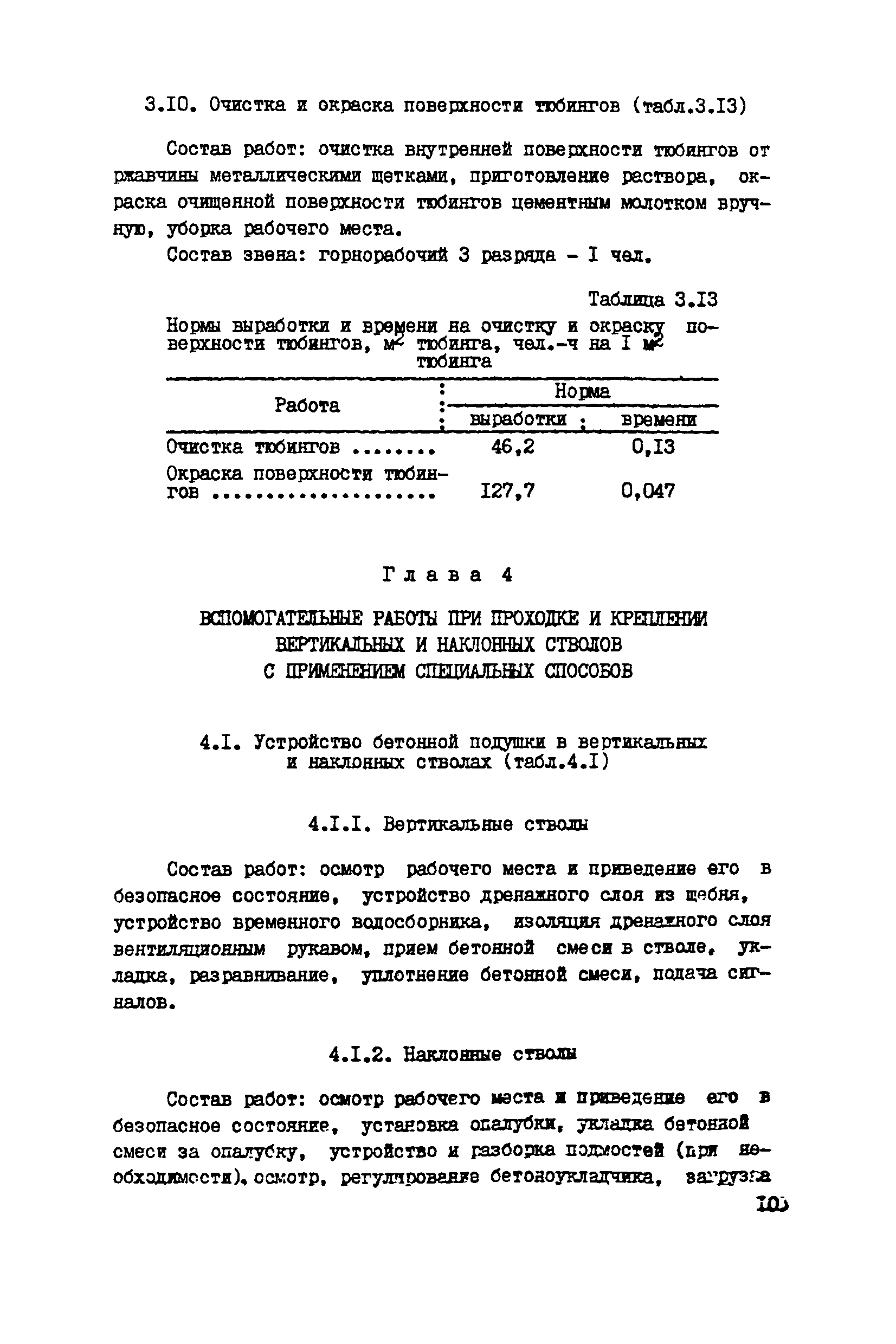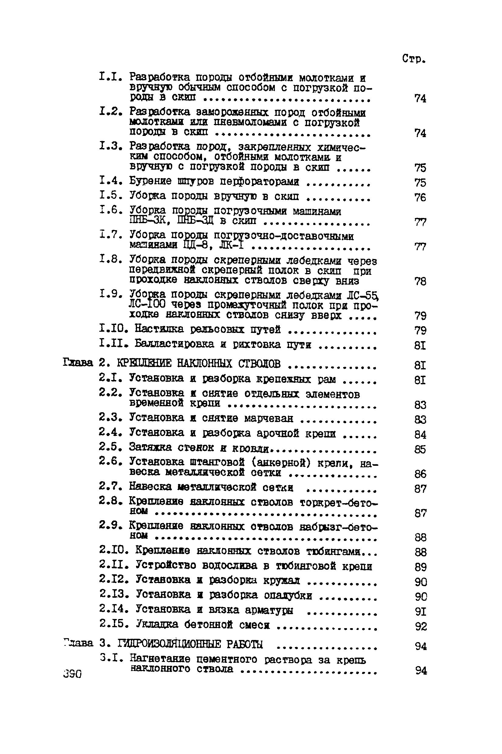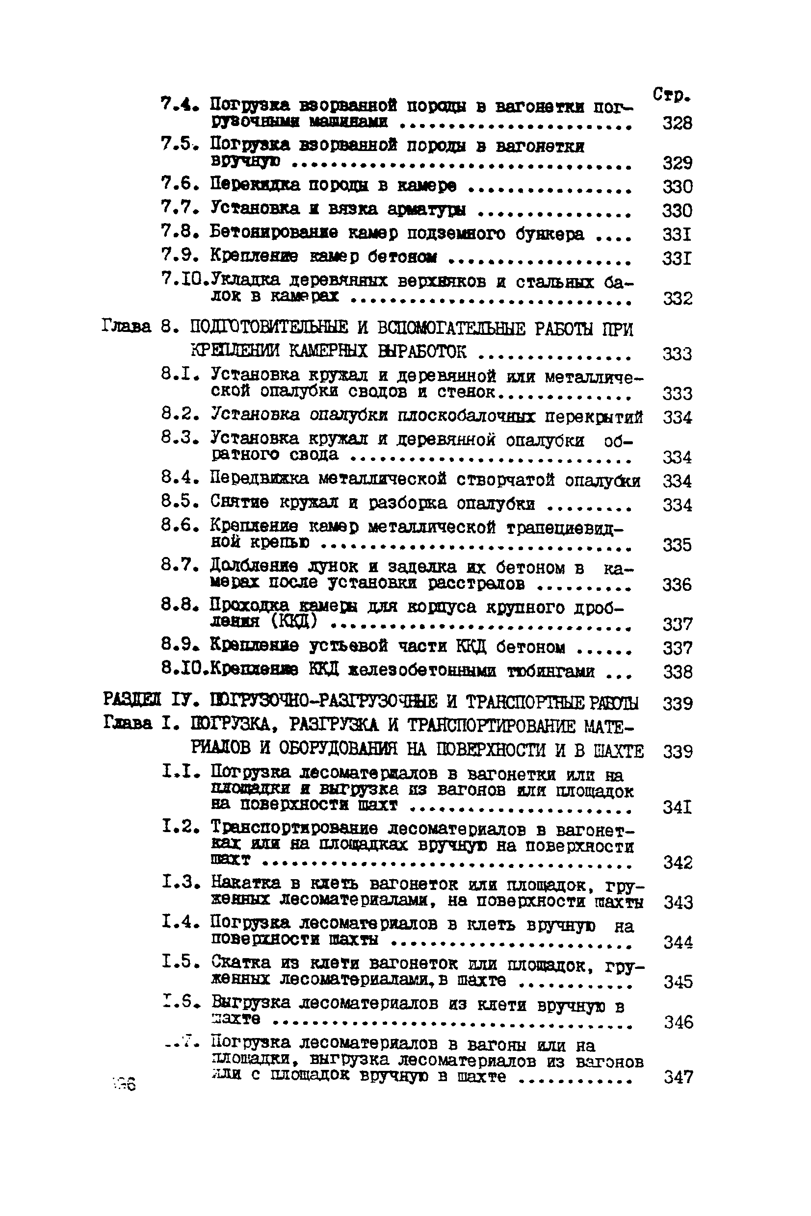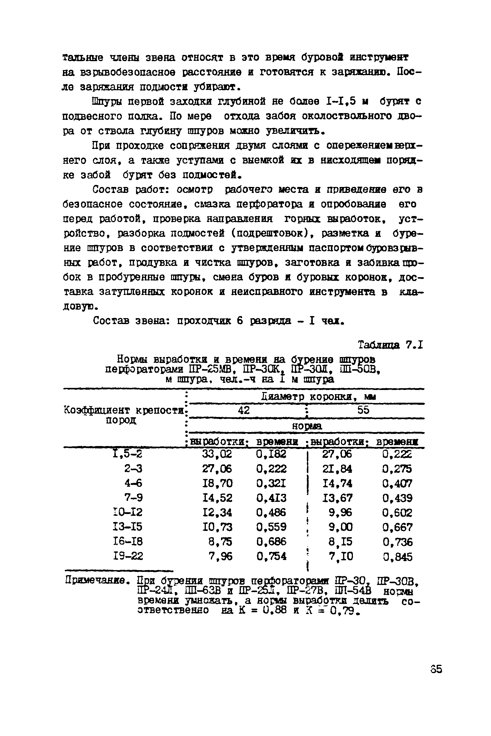 | Оглавление: | Общая часть Раздел 1. Проходка, крепление и армирование вертикальных стволов шахт; проведение сопряжений стволов с околоствольными дворами Глава 1. Проходка вертикальных стволов шахт 1.1 Проходка вертикальных стволов обычном способом 1.2 Проходка вертикальных стволов по замороженным породам 1.3 Проходка вертикальных стволов по породам, предварительно закрепленным химическим способом Глава 2. Крепление вертикальных стволов шахт бетоном 2.1 Временное крепление стволов металлическими кольцами 2.2 Крепление стволов круглого сечения бетоном и железобетоном 2.3 Крепление вертикальных стволов тюбингами 2.4 Крепление вертикальных стволов анкерной крепью 2.5 Установка и снятие деревянной опалубки заводного тюбингового кольца в конце заходки 2.6 Снятие первого тюбингового кольца 2.7 Сбивка кромки бетона на контакте заходки 2.8 Установка опорного венца из чугунных тюбингов 2.9 Укладка холодного бетона за опалубку при спуске его по трубам 2.10 Крепление стволов торкрет—бетоном Глава 3. Гидроизоляционные работы 3.1 Гидроизоляция тюбинговой крепи 3.2 Расчеканка свинцовых прокладок в тюбинговых швах и чеканка тюбинговых швов свинцовым шнуром 3.3 Очистка чугунной тюбинговой крепи после проходки и крепления ствола 3.4 Пикотаж горизонтального шва между двумя звеньями тюбинговой крепи ствола 3.5 Гидроизоляция чугунной тюбинговой крепи тампонажным раствором при поступлении его по трубам самотеком с поверхности 3.6 Первичное нагнетание за крепь шахтного ствола 3.7 Контрольное в нагнетание за крепь шахтного ствола 3.8 Контрольное подтягивание и замена болтов в тюбинговой отделке шахтного ствола 3.9 Установка и замена пробок в отверстиях тюбингов 3.10 Изоляция стыков тюбинговой крепи шахтного ствола 3.11 Штукатурка бетонной поверхности под изоляцию и по изоляции 3.12 Оклеечная изоляция стенок шахтного ствола 3.13 Устройство пикотажных манжет при крепления вертикальных стволов шахт железобетонными тюбингами 3.14 Бурение шпуров в бетоне Глава 4. Армирование стволов 4.1 Долбление лунок под расстрелы 4.2 Установка и заделка металлических расстрелов в готовые лунки 4.3 Сболчивание стальных расстрелов 4.4 Установка проводников 4.5 Оборудование лестничных отделений в стволах шахт 4.6 Устройство и разборка настилов по расстрелам 4.7 Установка рудничных станков на сопряжение с околоствольным двором 4.8 Монтаж компенсационных балок из спец профиля в стволе 4.9 Монтаж и демонтаж постоянных трубопроводов Глава 5. Вспомогательные работы при проходке и креплении стволов шахт 5.1 Устройство, разборка и переноска рабочего полка 5.2 Устройство деревянного временного переносного полка в стволе 5.3 Монтаж одноэтажных и двухэтажных подвесных металлических полков в стволах натяжных рам и предохранительных полков Глава 6. Устройство в стволах круглого сечения бетонного опорного венца (башмака) Глава 7. Проведение сопряжений вертикальных стволов с околоствольными дворами Раздел II. Проходка и крепление наклонных стволов Глава 1. Проходка наклонных стволов Глава 2. Крепление наклонных стволов Глава 3. Гидроизоляционные работы Глава 4. Вспомогательные работы при проходке и креплении вертикальных и наклонных стволов с применением специальных способов Раздел III. Проходка и крепление горизонтальных, наклонных и восстающих горных выработок Глава 1. Буровые работы Глава 2. Д