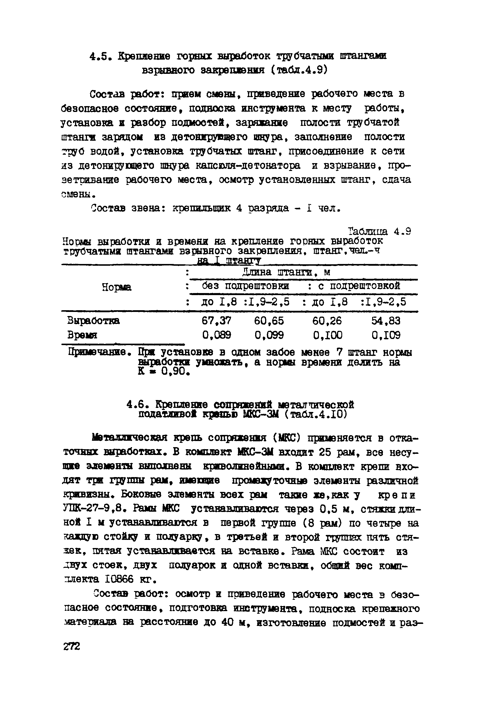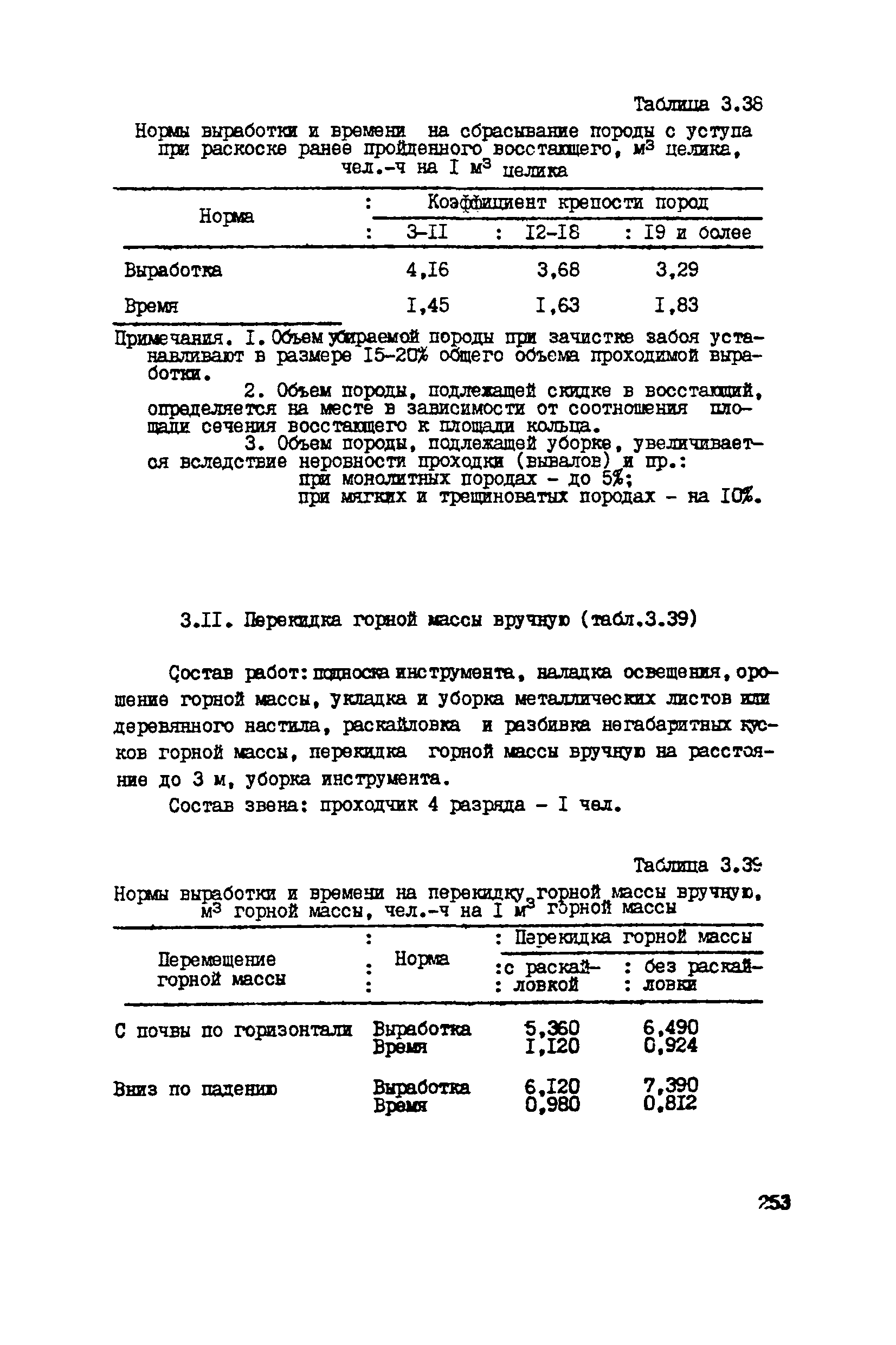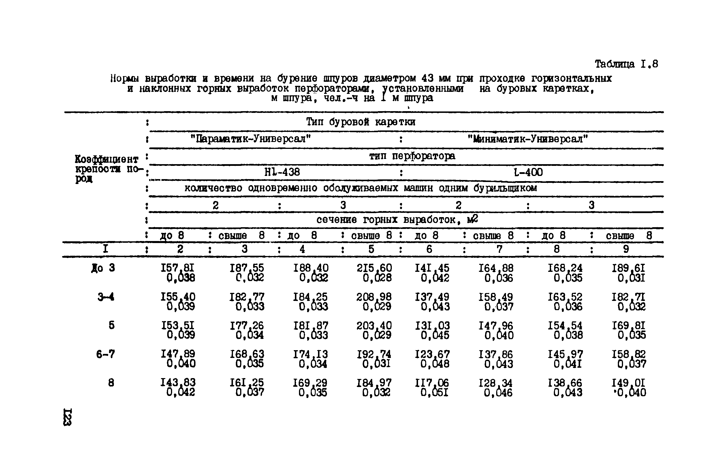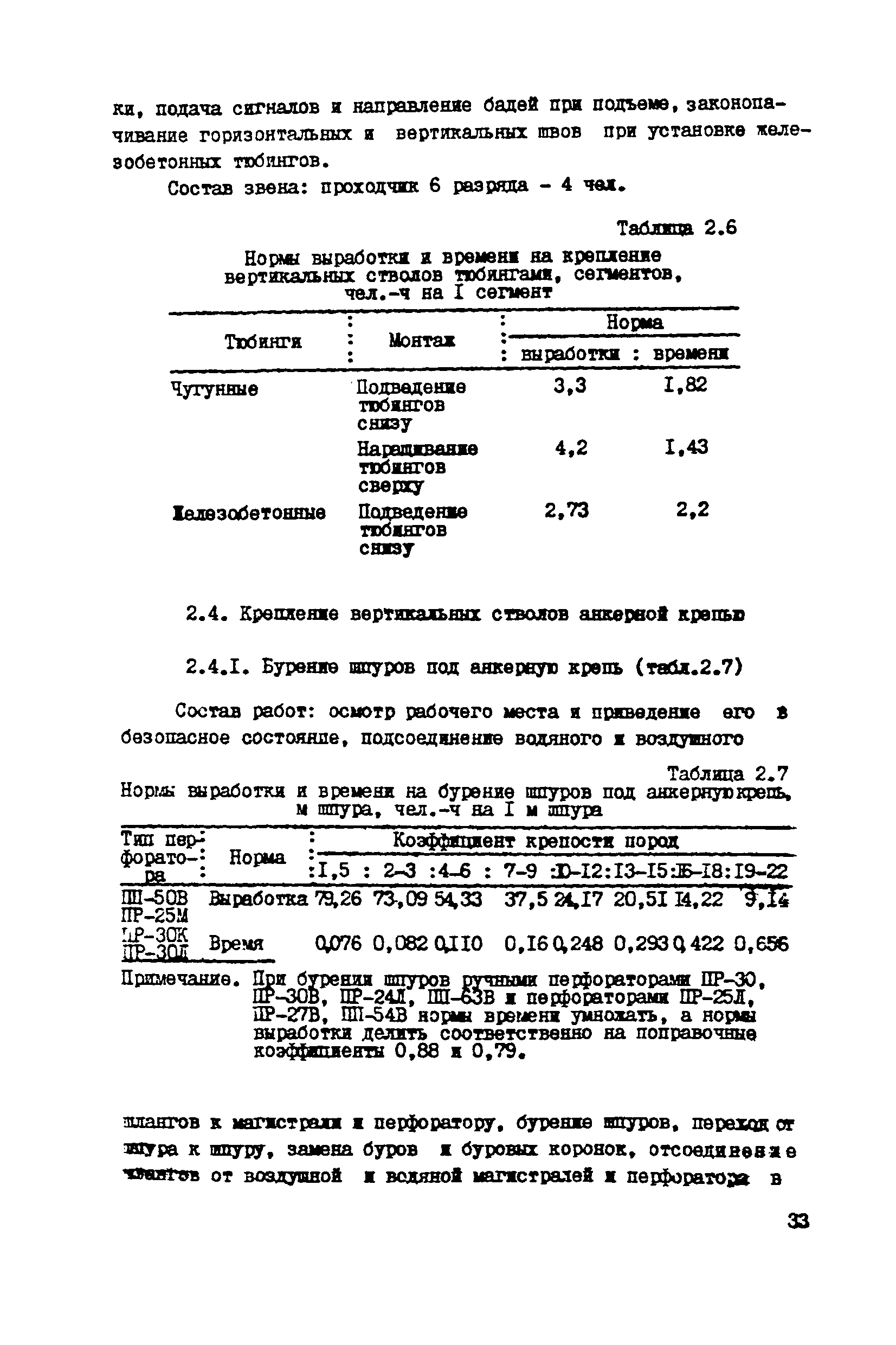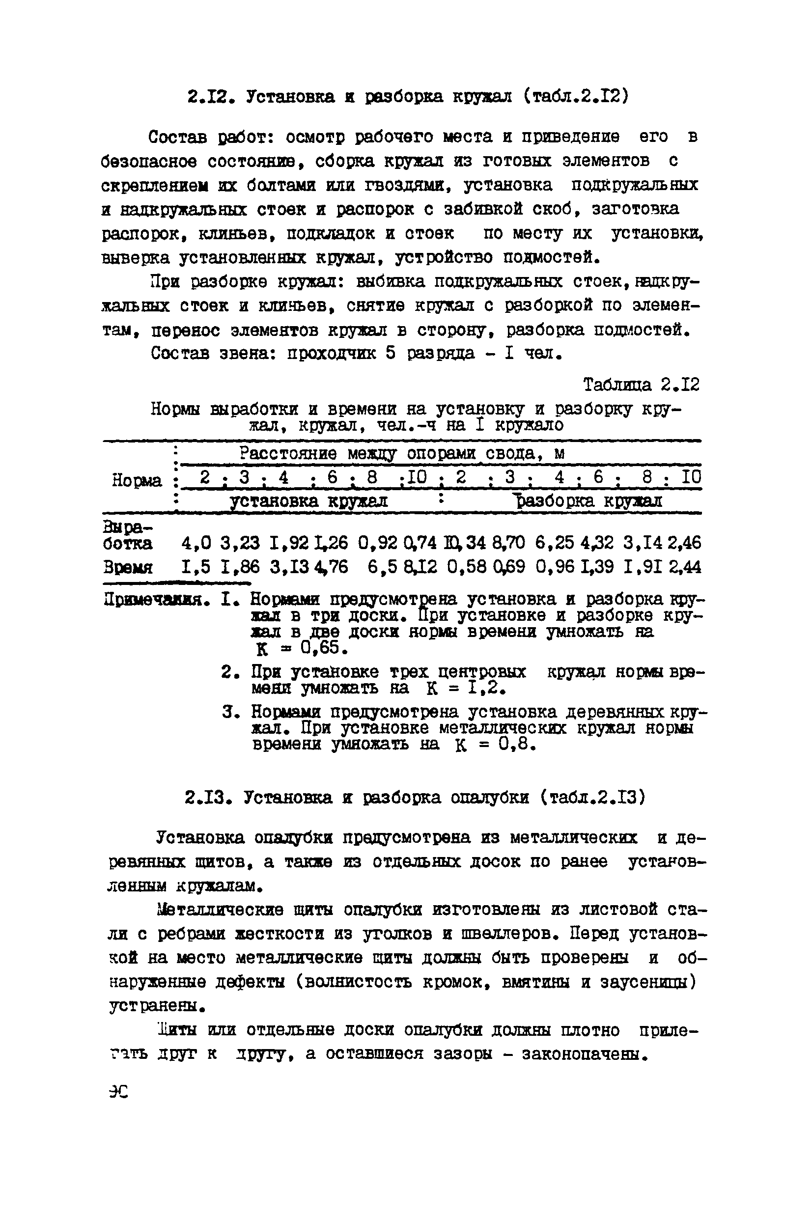 | Оглавление: | Общая часть Раздел 1. Проходка, крепление и армирование вертикальных стволов шахт; проведение сопряжений стволов с околоствольными дворами Глава 1. Проходка вертикальных стволов шахт 1.1 Проходка вертикальных стволов обычном способом 1.2 Проходка вертикальных стволов по замороженным породам 1.3 Проходка вертикальных стволов по породам, предварительно закрепленным химическим способом Глава 2. Крепление вертикальных стволов шахт бетоном 2.1 Временное крепление стволов металлическими кольцами 2.2 Крепление стволов круглого сечения бетоном и железобетоном 2.3 Крепление вертикальных стволов тюбингами 2.4 Крепление вертикальных стволов анкерной крепью 2.5 Установка и снятие деревянной опалубки заводного тюбингового кольца в конце заходки 2.6 Снятие первого тюбингового кольца 2.7 Сбивка кромки бетона на контакте заходки 2.8 Установка опорного венца из чугунных тюбингов 2.9 Укладка холодного бетона за опалубку при спуске его по трубам 2.10 Крепление стволов торкрет—бетоном Глава 3. Гидроизоляционные работы 3.1 Гидроизоляция тюбинговой крепи 3.2 Расчеканка свинцовых прокладок в тюбинговых швах и чеканка тюбинговых швов свинцовым шнуром 3.3 Очистка чугунной тюбинговой крепи после проходки и крепления ствола 3.4 Пикотаж горизонтального шва между двумя звеньями тюбинговой крепи ствола 3.5 Гидроизоляция чугунной тюбинговой крепи тампонажным раствором при поступлении его по трубам самотеком с поверхности 3.6 Первичное нагнетание за крепь шахтного ствола 3.7 Контрольное в нагнетание за крепь шахтного ствола 3.8 Контрольное подтягивание и замена болтов в тюбинговой отделке шахтного ствола 3.9 Установка и замена пробок в отверстиях тюбингов 3.10 Изоляция стыков тюбинговой крепи шахтного ствола 3.11 Штукатурка бетонной поверхности под изоляцию и по изоляции 3.12 Оклеечная изоляция стенок шахтного ствола 3.13 Устройство пикотажных манжет при крепления вертикальных стволов шахт железобетонными тюбингами 3.14 Бурение шпуров в бетоне Глава 4. Армирование стволов 4.1 Долбление лунок под расстрелы 4.2 Установка и заделка металлических расстрелов в готовые лунки 4.3 Сболчивание стальных расстрелов 4.4 Установка проводников 4.5 Оборудование лестничных отделений в стволах шахт 4.6 Устройство и разборка настилов по расстрелам 4.7 Установка рудничных станков на сопряжение с околоствольным двором 4.8 Монтаж компенсационных балок из спец профиля в стволе 4.9 Монтаж и демонтаж постоянных трубопроводов Глава 5. Вспомогательные работы при проходке и креплении стволов шахт 5.1 Устройство, разборка и переноска рабочего полка 5.2 Устройство деревянного временного переносного полка в стволе 5.3 Монтаж одноэтажных и двухэтажных подвесных металлических полков в стволах натяжных рам и предохранительных полков Глава 6. Устройство в стволах круглого сечения бетонного опорного венца (башмака) Глава 7. Проведение сопряжений вертикальных стволов с околоствольными дворами Раздел II. Проходка и крепление наклонных стволов Глава 1. Проходка наклонных стволов Глава 2. Крепление наклонных стволов Глава 3. Гидроизоляционные работы Глава 4. Вспомогательные работы при проходке и креплении вертикальных и наклонных стволов с применением специальных способов Раздел III. Проходка и крепление горизонтальных, наклонных и восстающих горных выработок Глава 1. Буровые работы Глава 2. Д